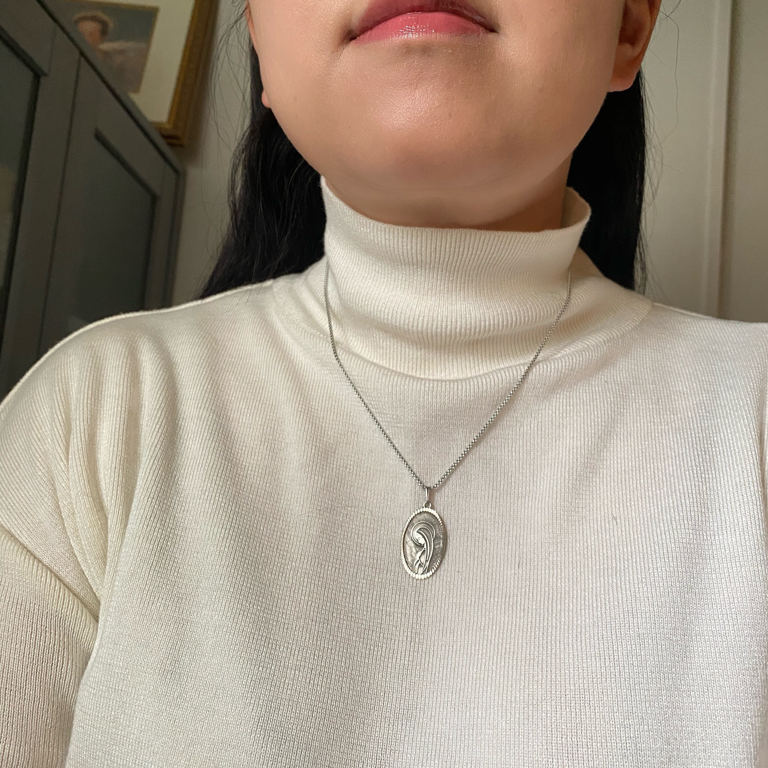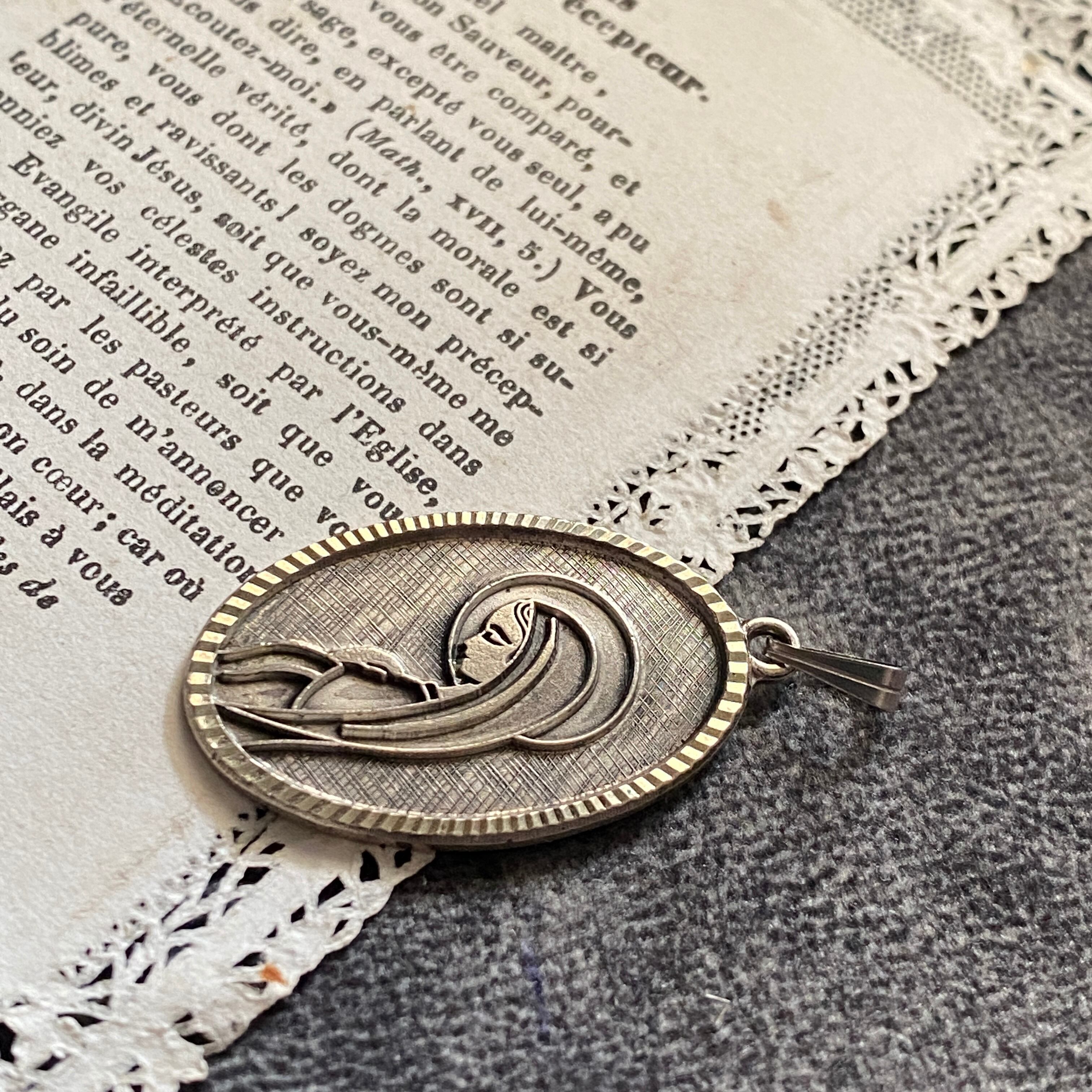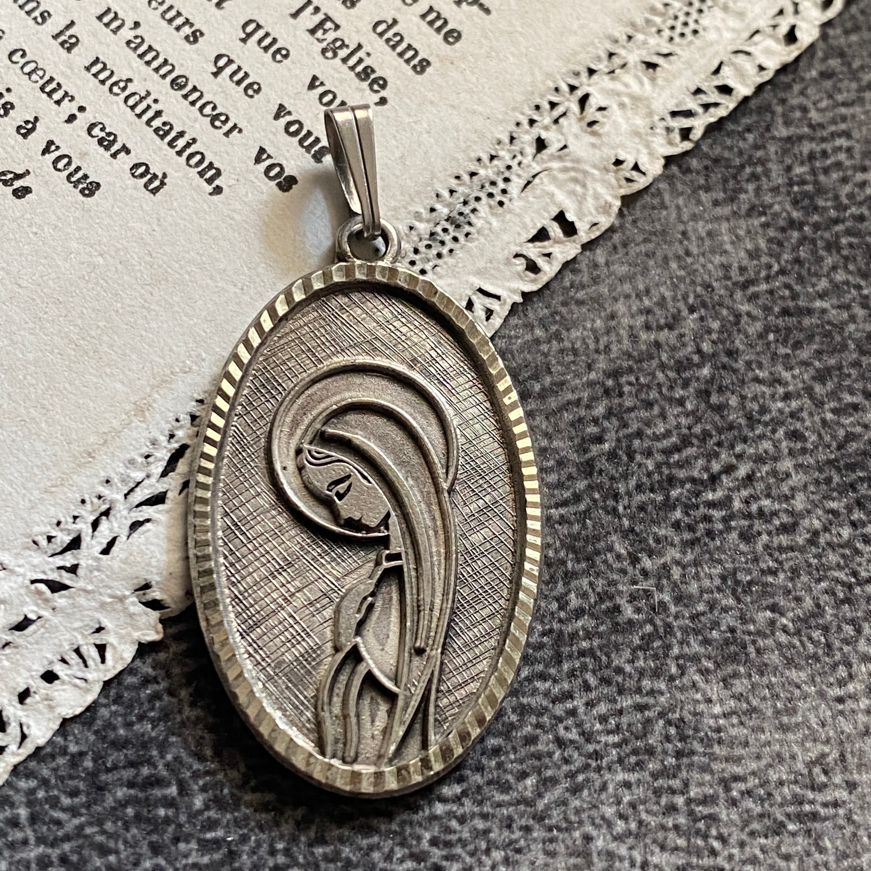 大きめのオーバル型のフレームは、エッジ加工による光を反射し、対して聖母の背景は光を抑えた加工により、神聖な静かさが際立つ美しいデザインです。