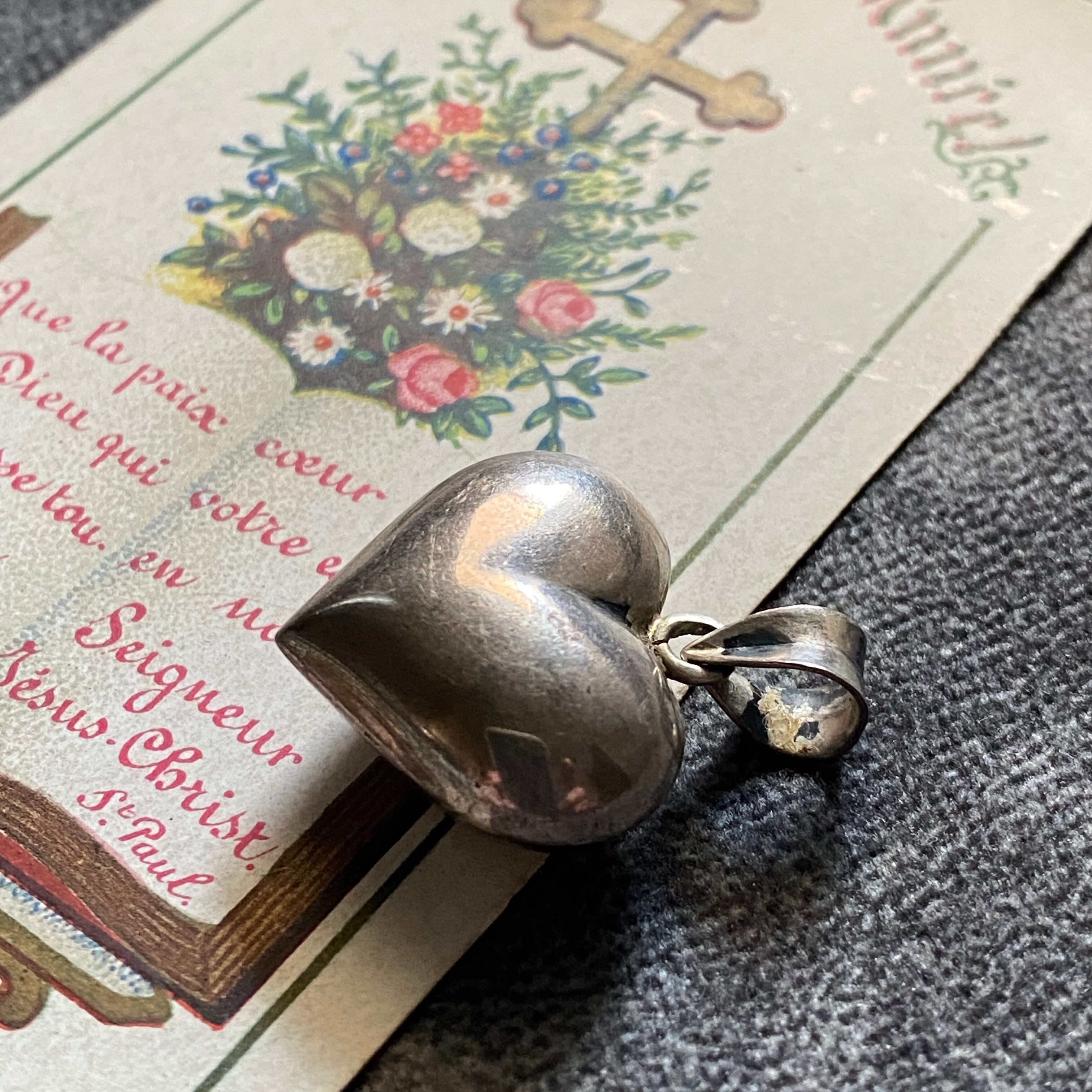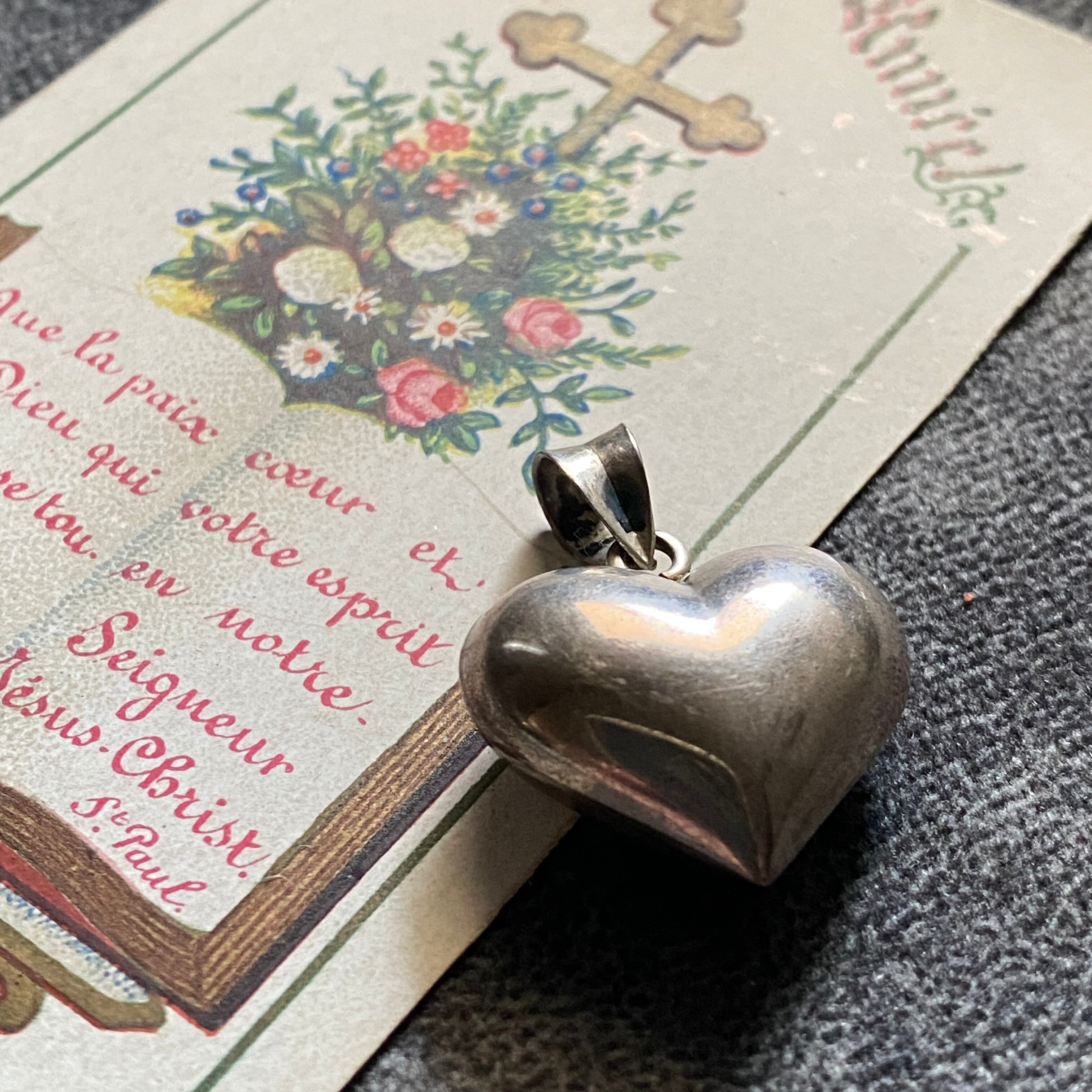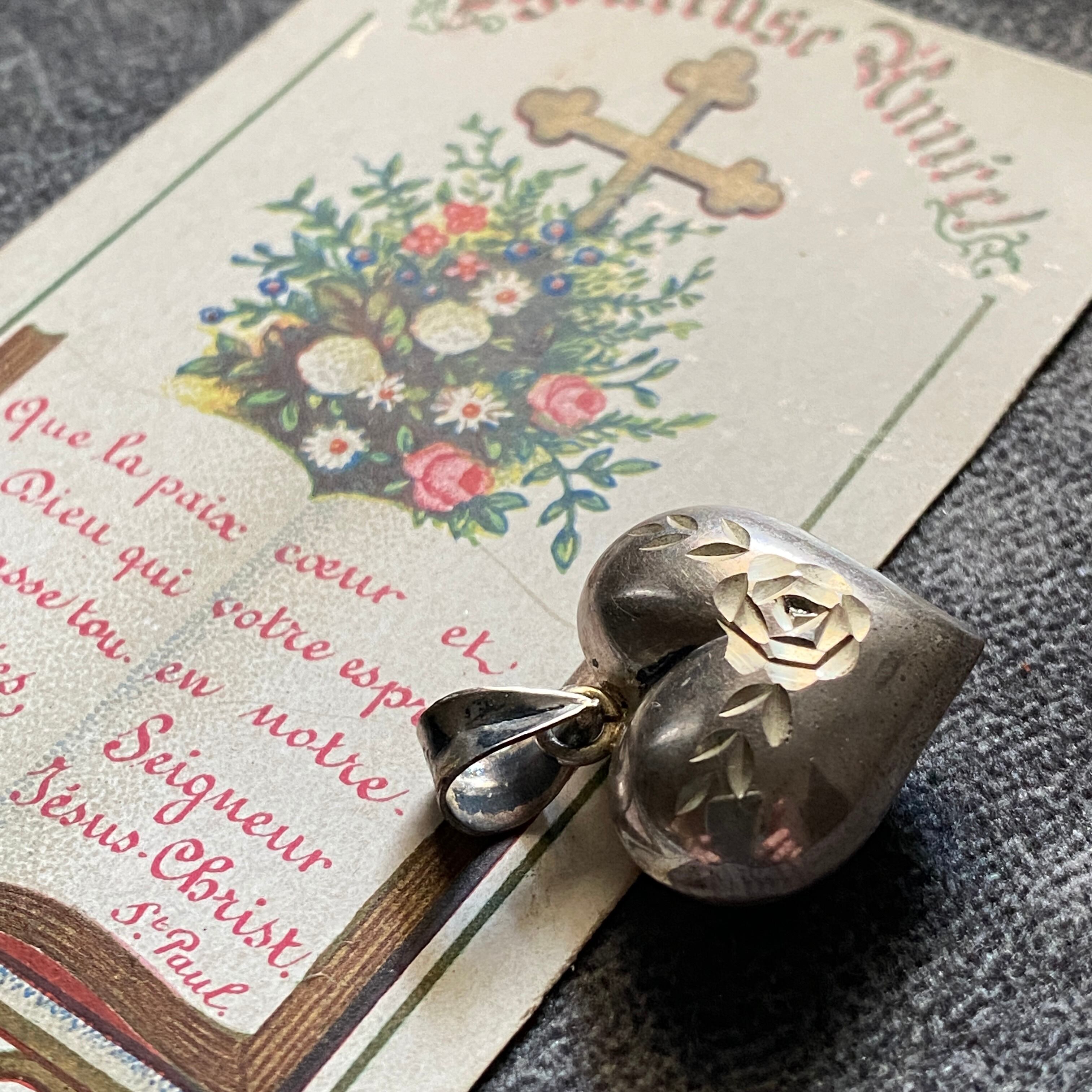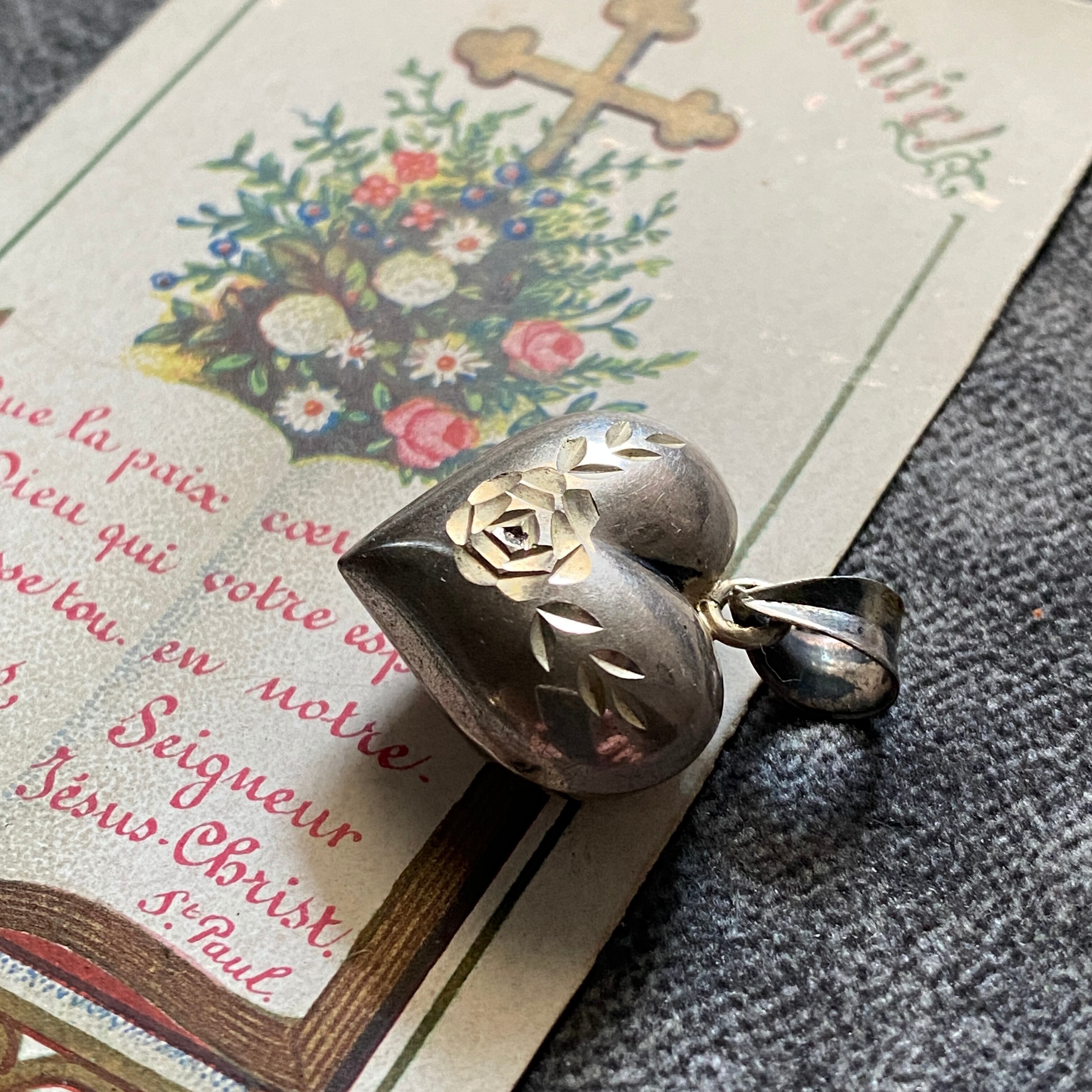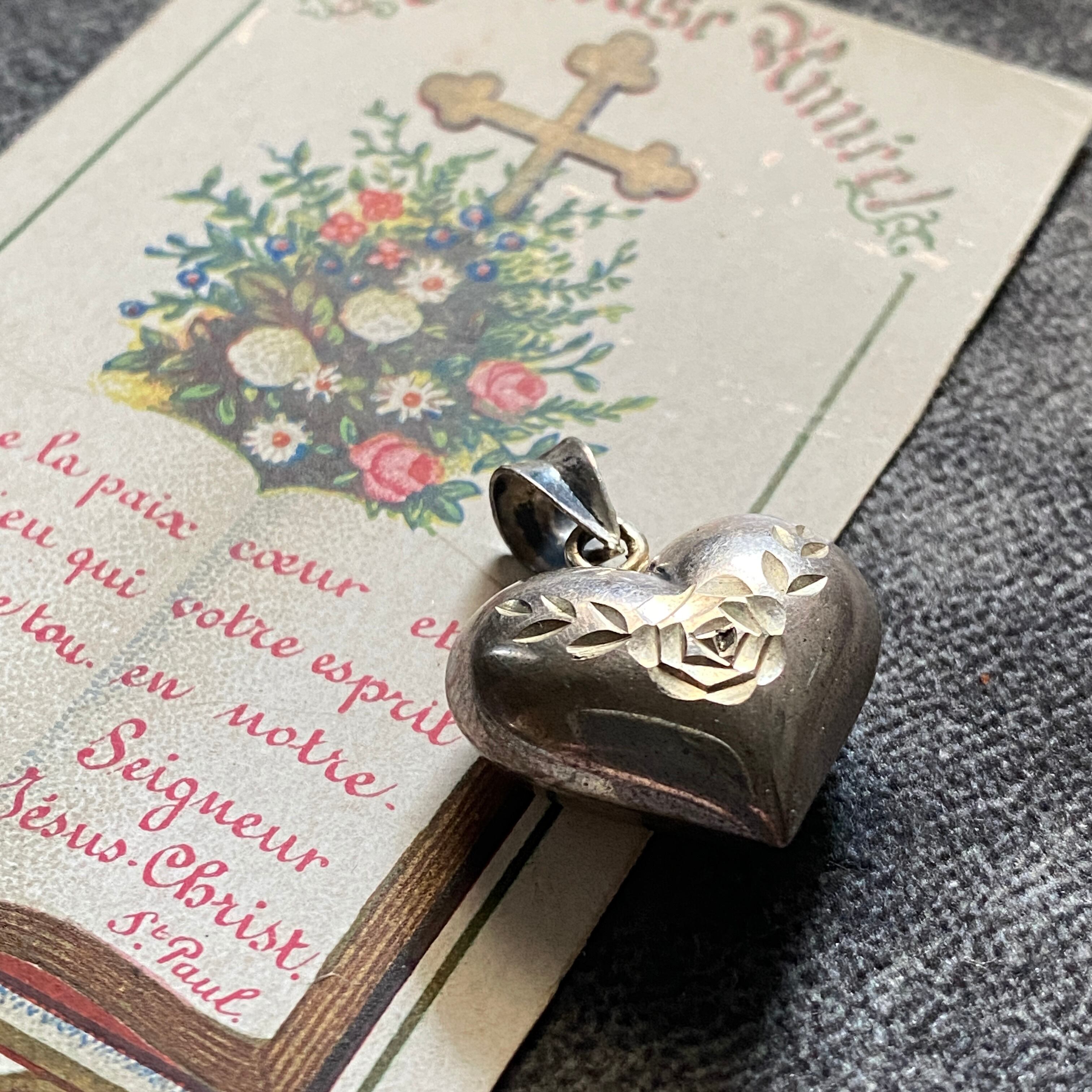 ぷっくりと立体的に形取られた存在感のあるハートの中心には、聖母マリアの象徴である薔薇が刻されています。