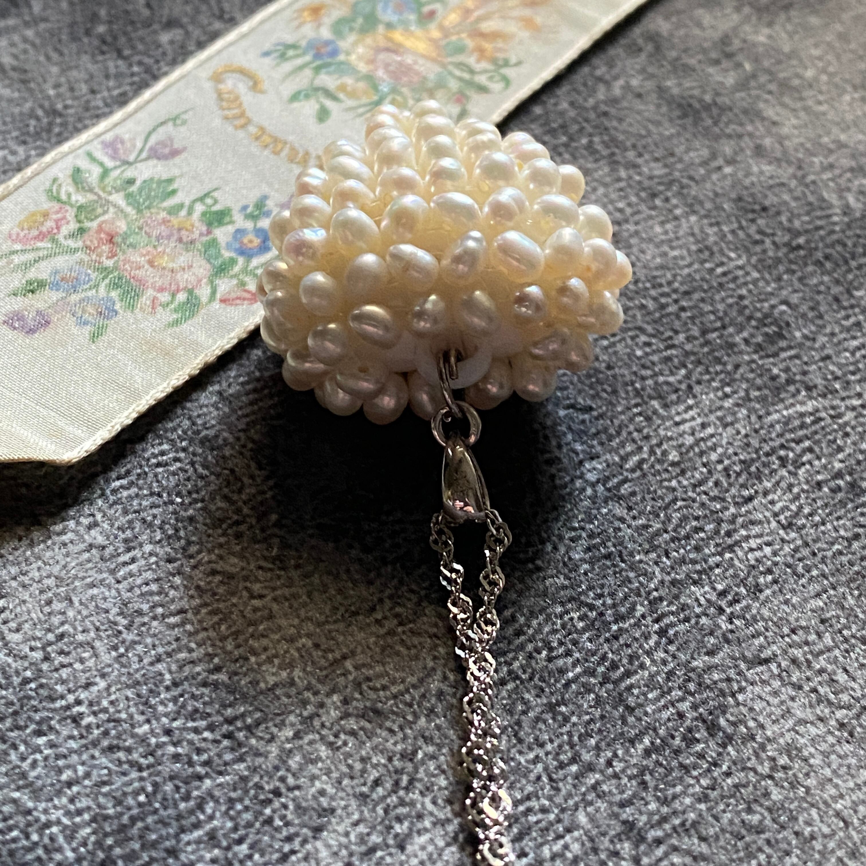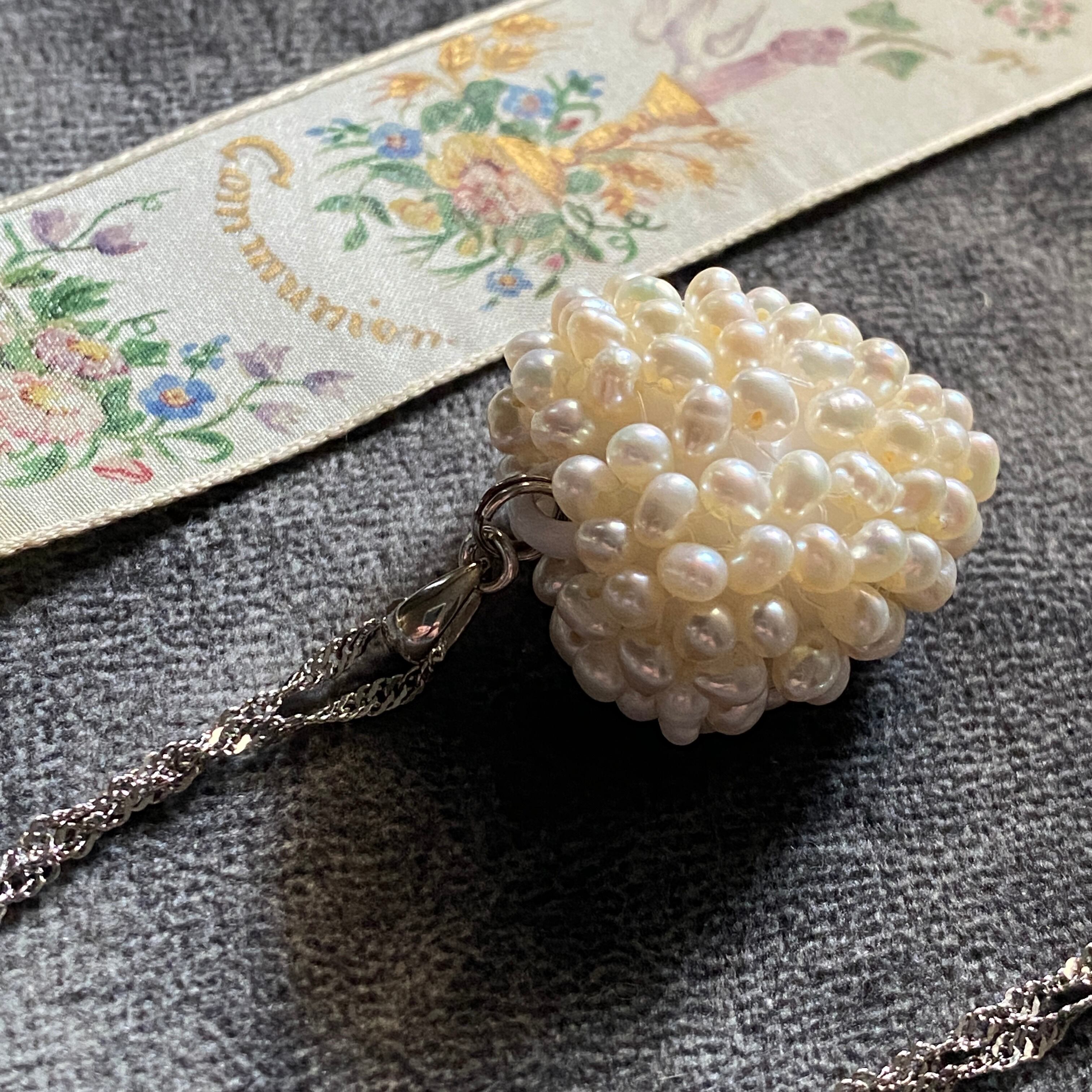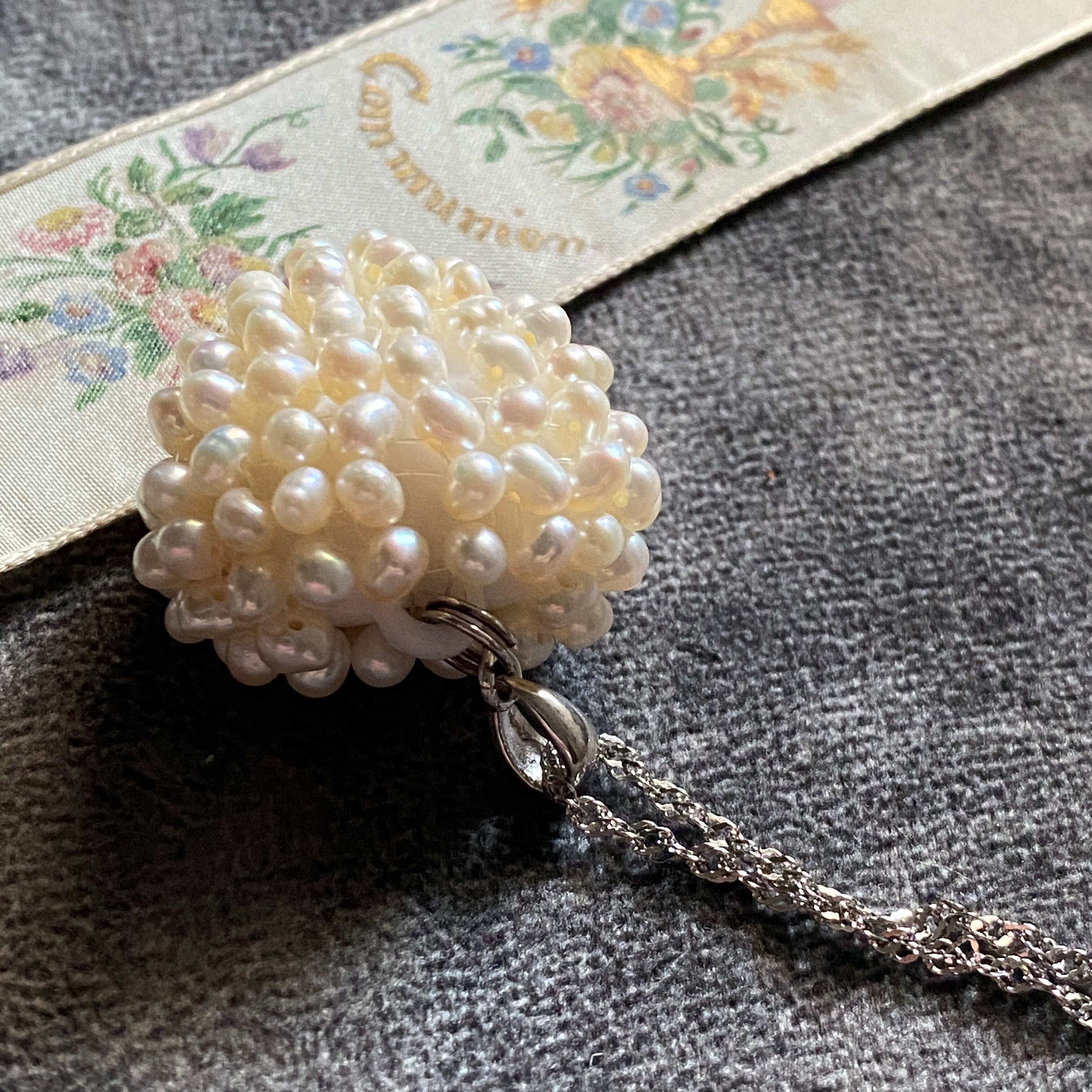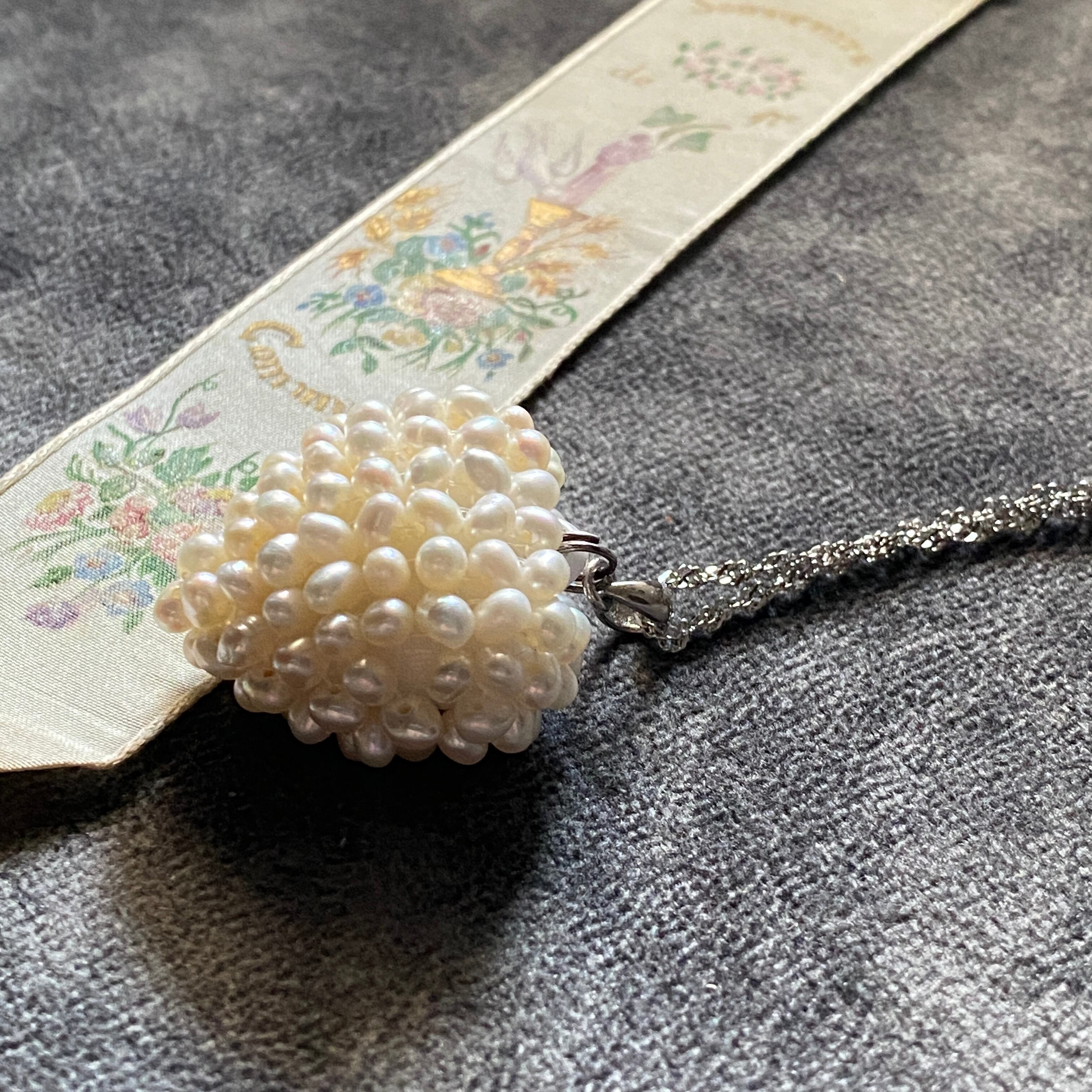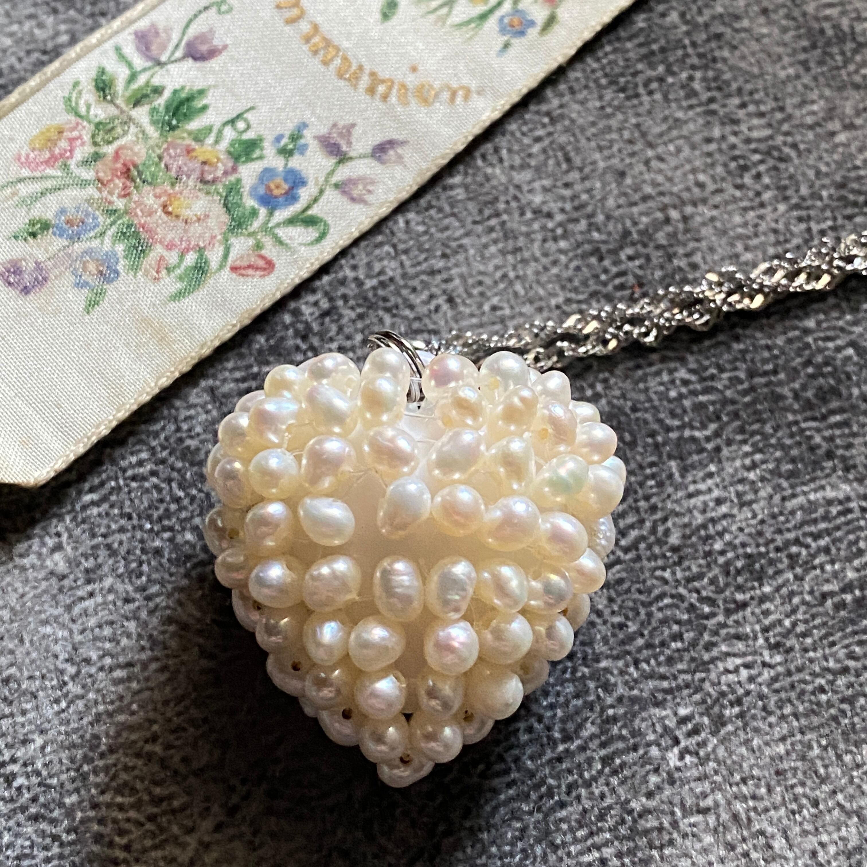 淡水パールのビーズで丁寧に編まれたハート型チャームのネックレス。