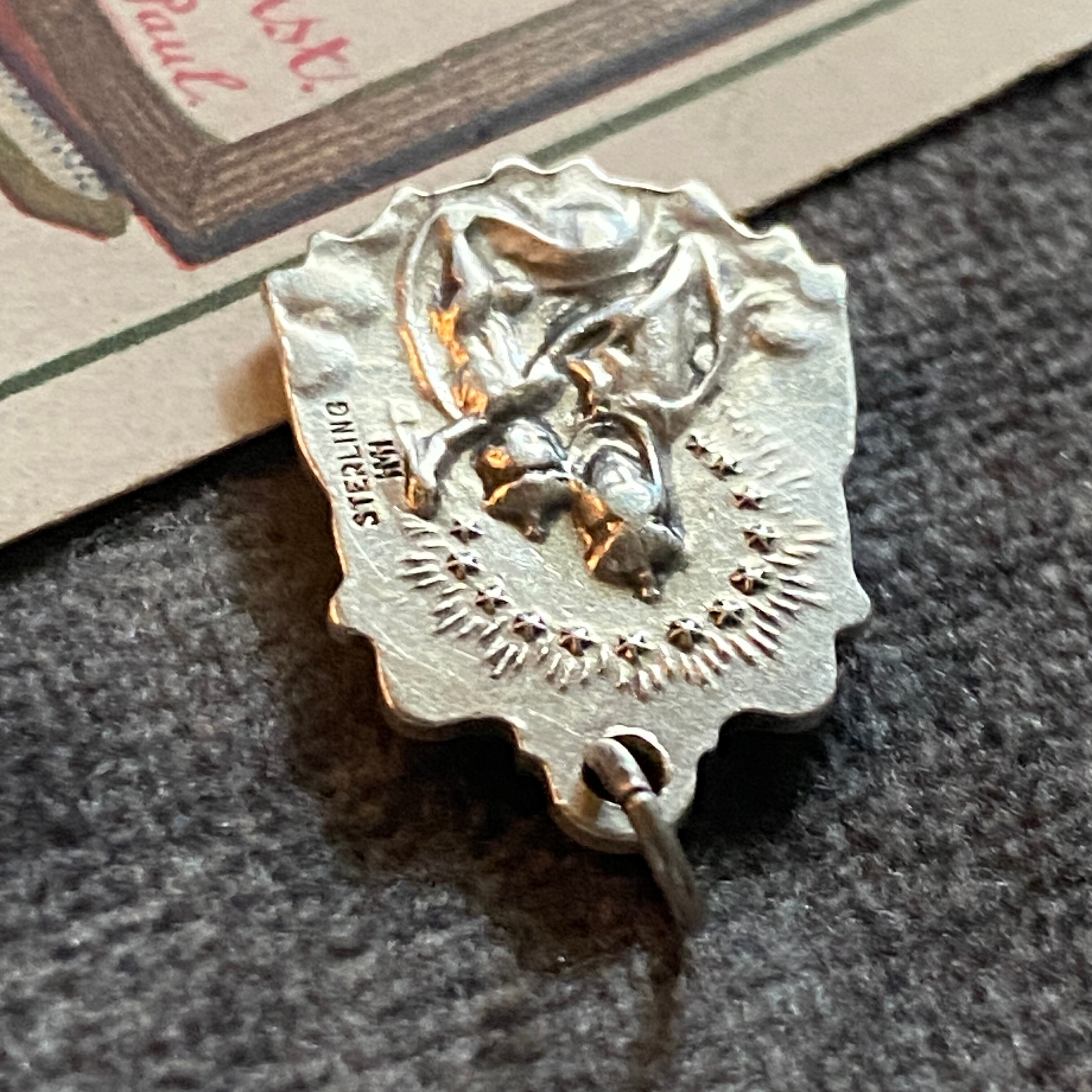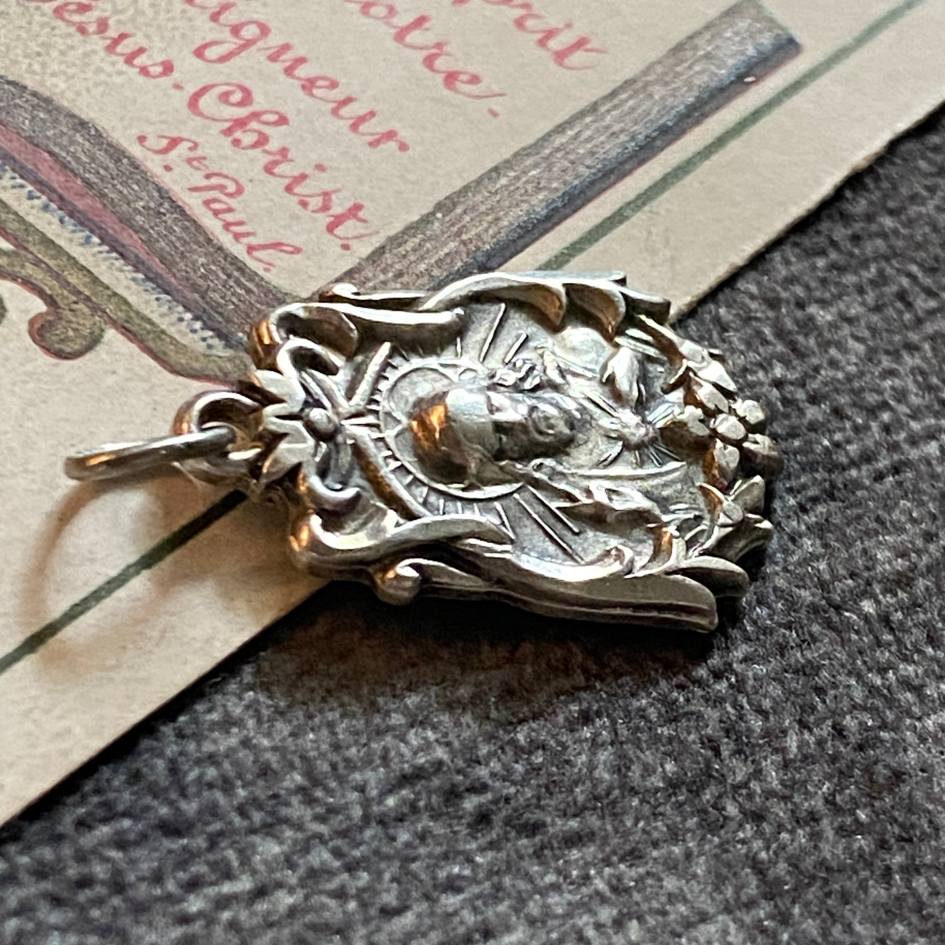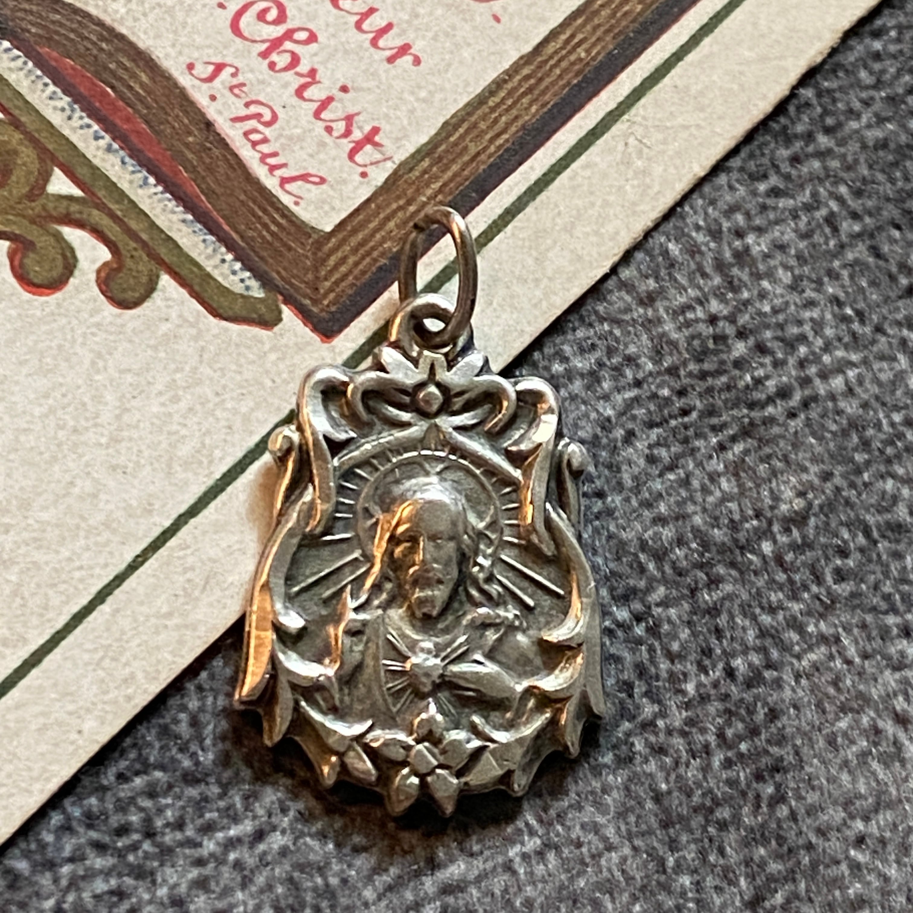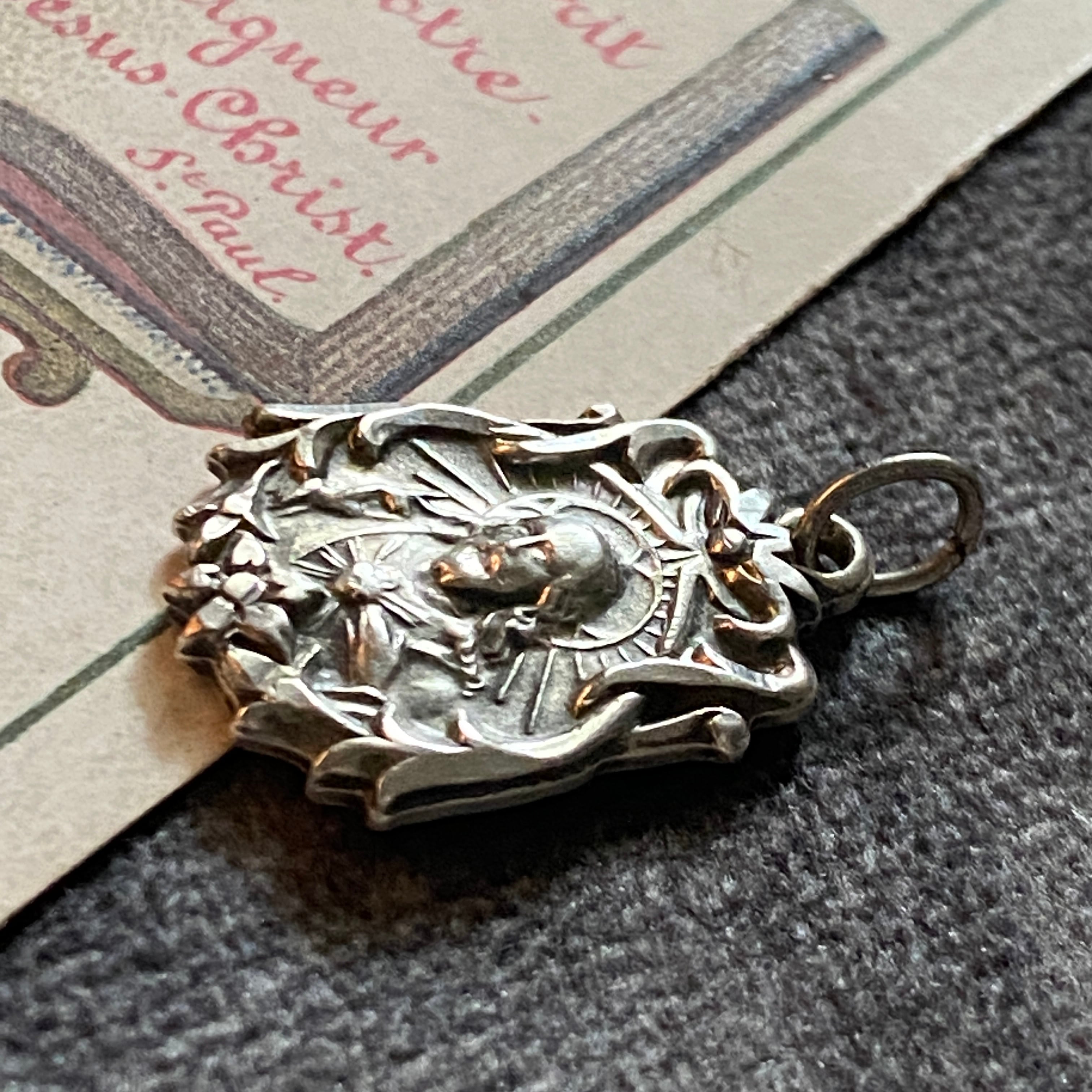花と蔓に囲まれたアールヌーボーなフレームの内側には、聖心を指し示す眩い光線を放つキリストの御姿が、背面には戴冠した聖母子の様子が描かれた大変珍しいデザインの作品。