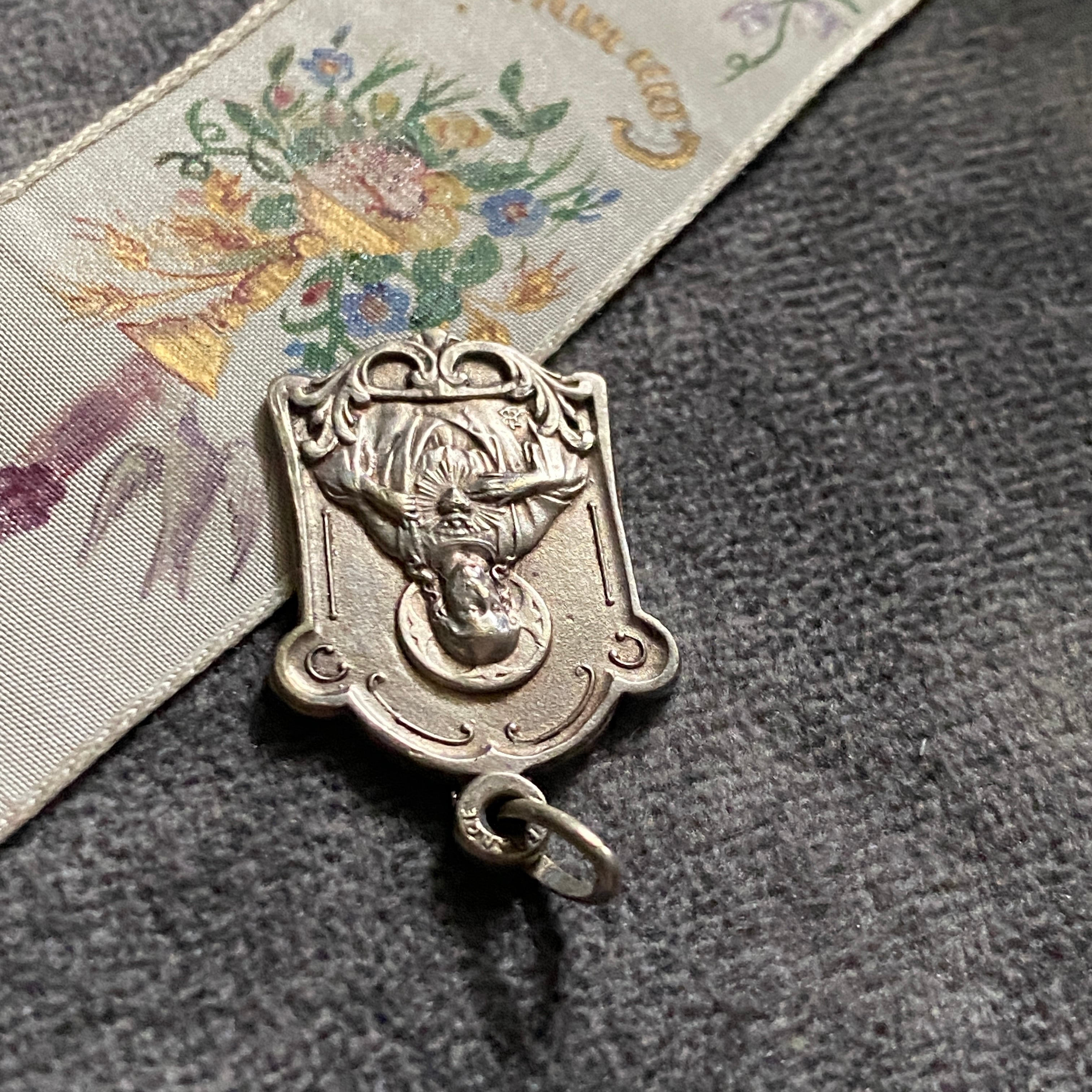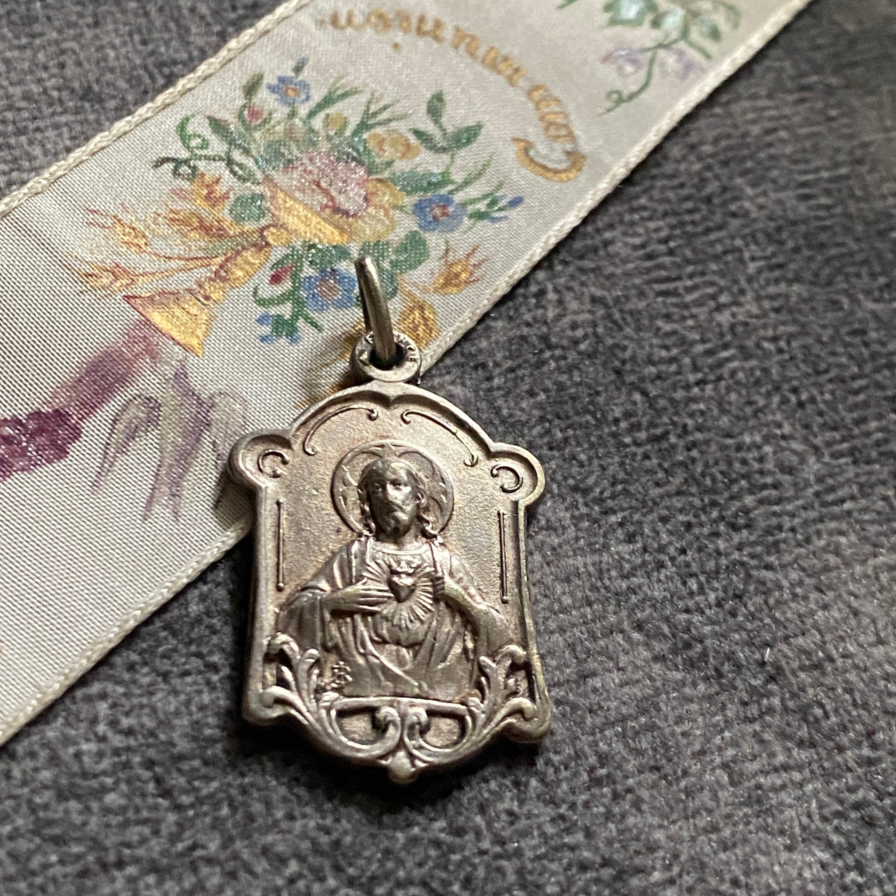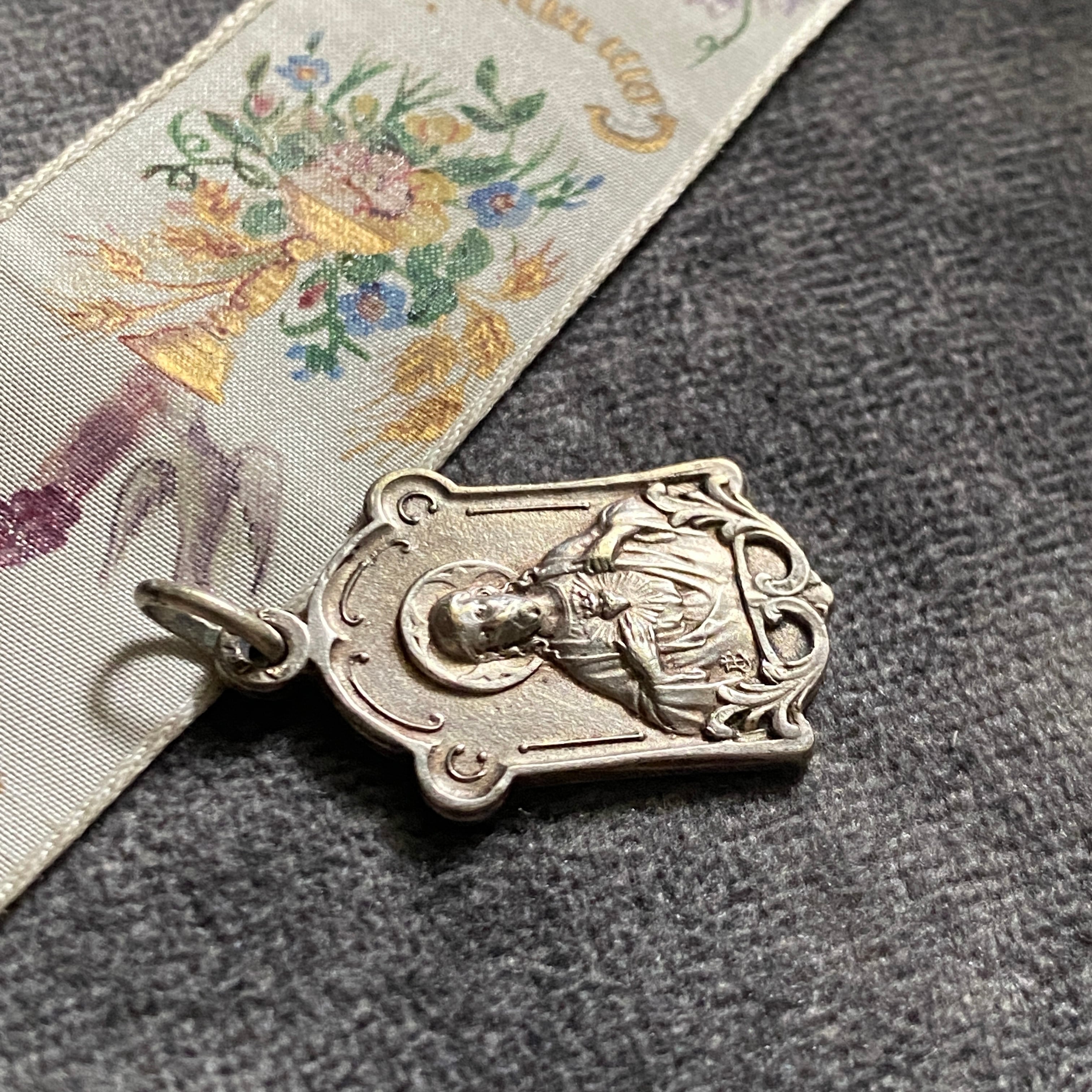 繊細な植物装飾に縁取られた、小さなフレームメダイ。