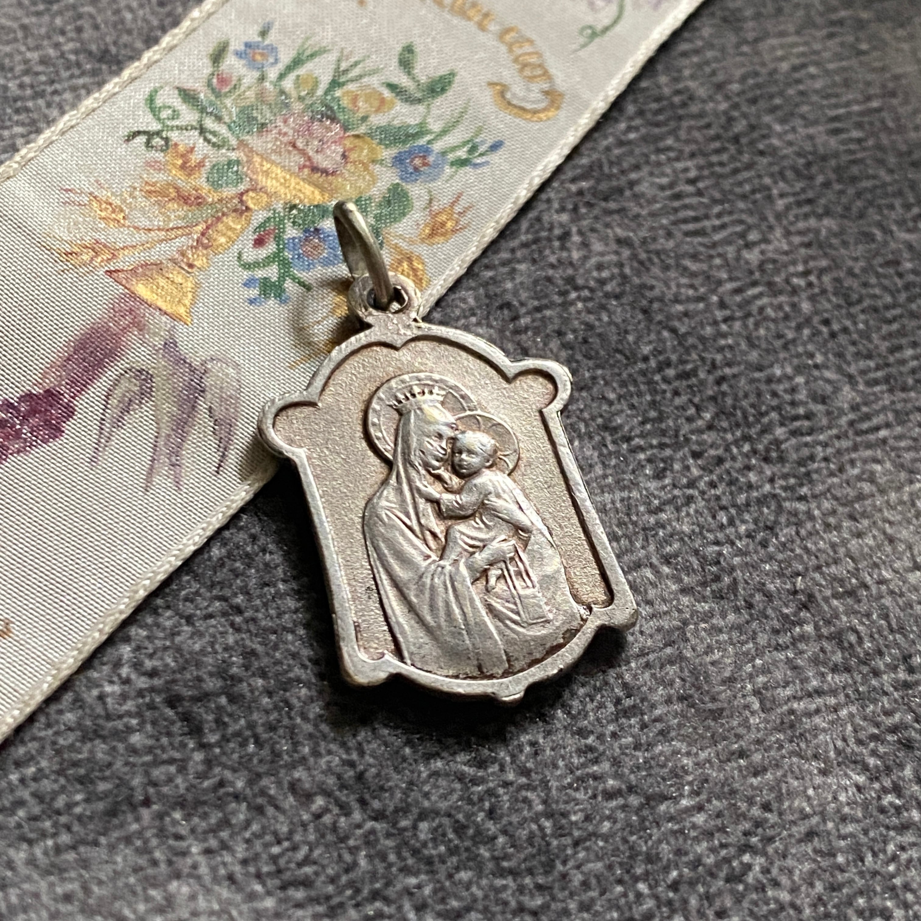 背面には、幼子イエスを優しく抱く聖母子の姿。