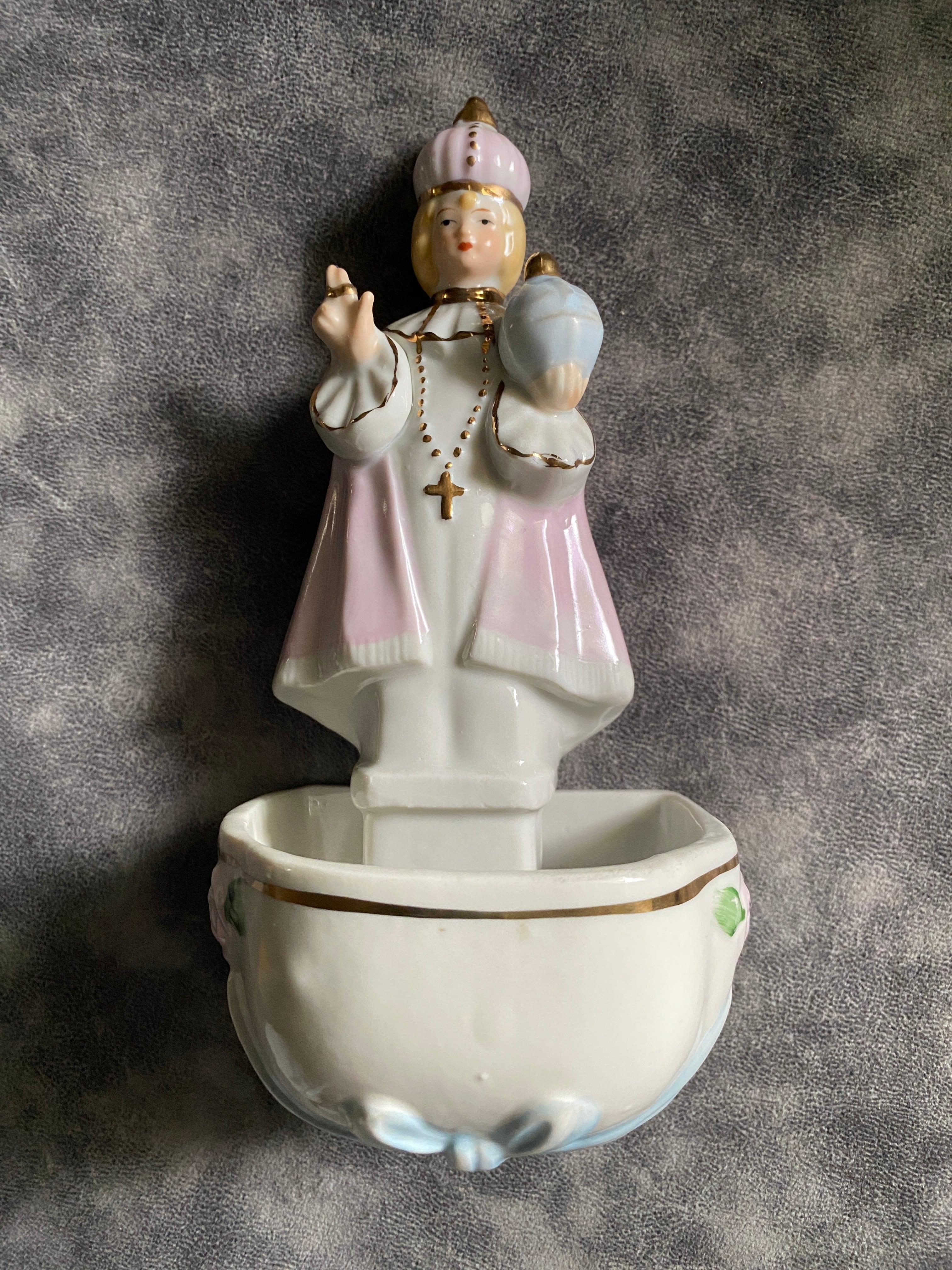 プラハの幼子イエスの愛らしいデザインの希少な磁器製の聖水盤。