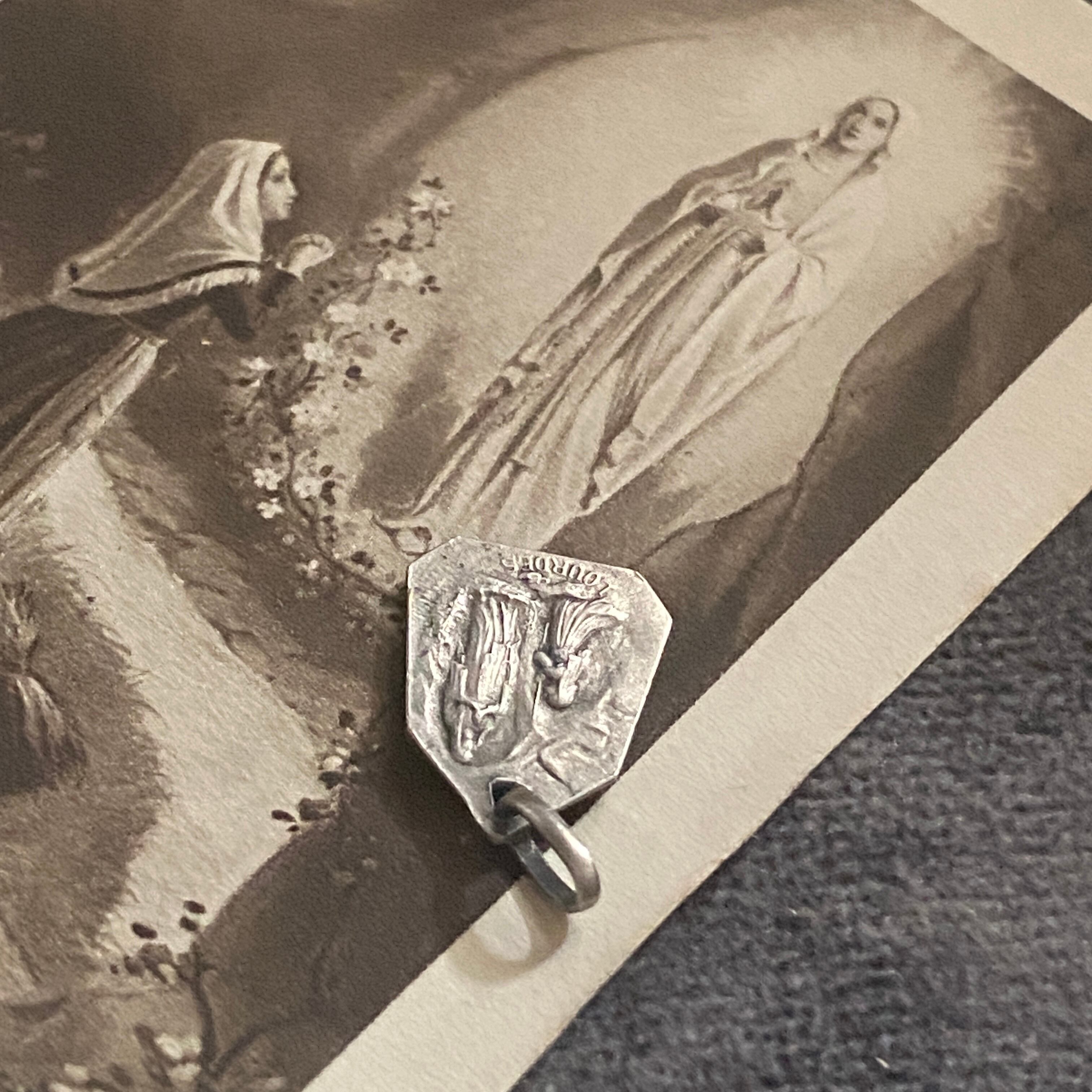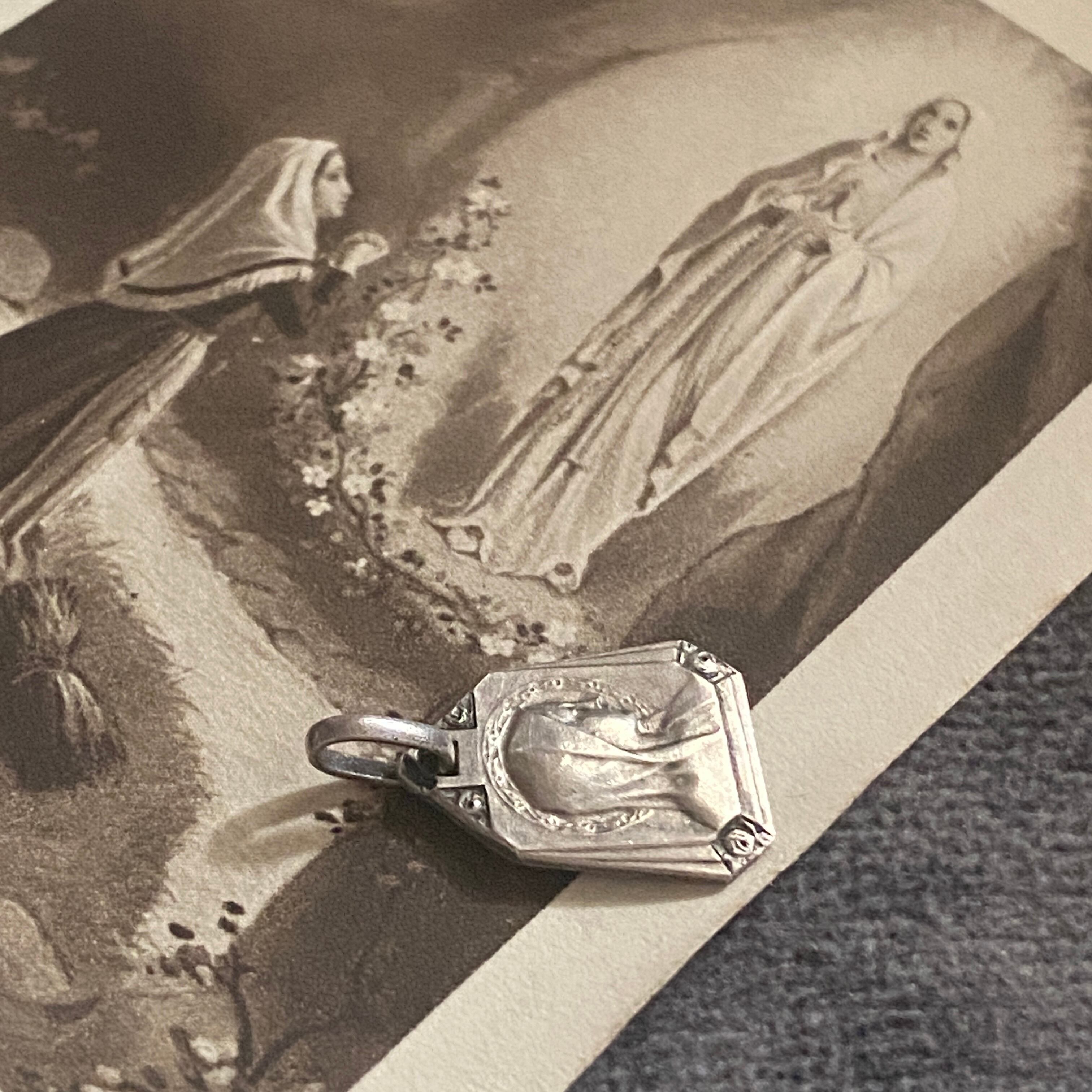 とても小さなルルドのメダイは、アールデコなフレームの四角に薔薇があしらわれた美しいデザイン。
