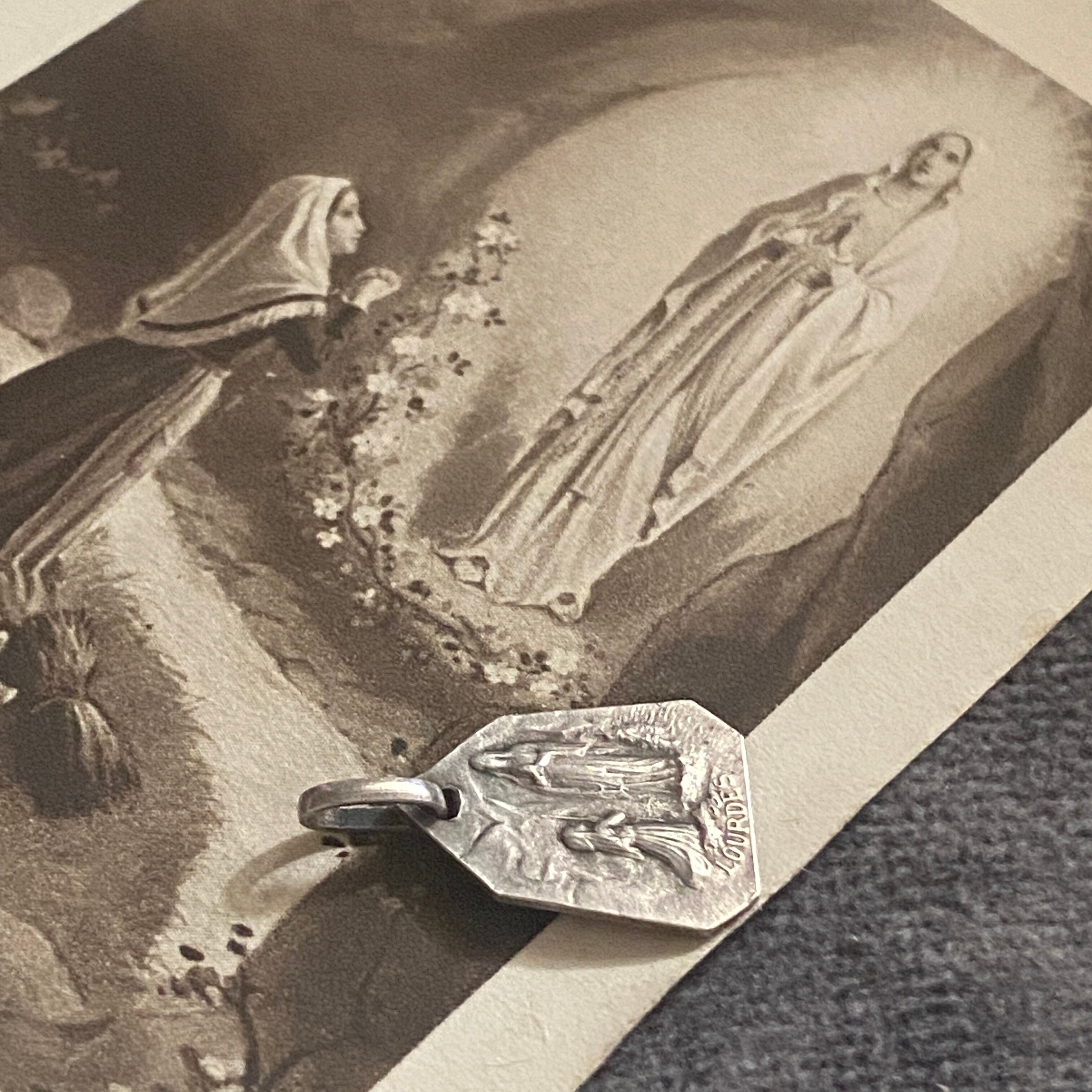 表には横顔の聖母マリアの気高く静かな姿が、背面には聖ベルナデッタがひざまずき祈りを捧げるルルドの出現シーンが繊細に刻まれています。