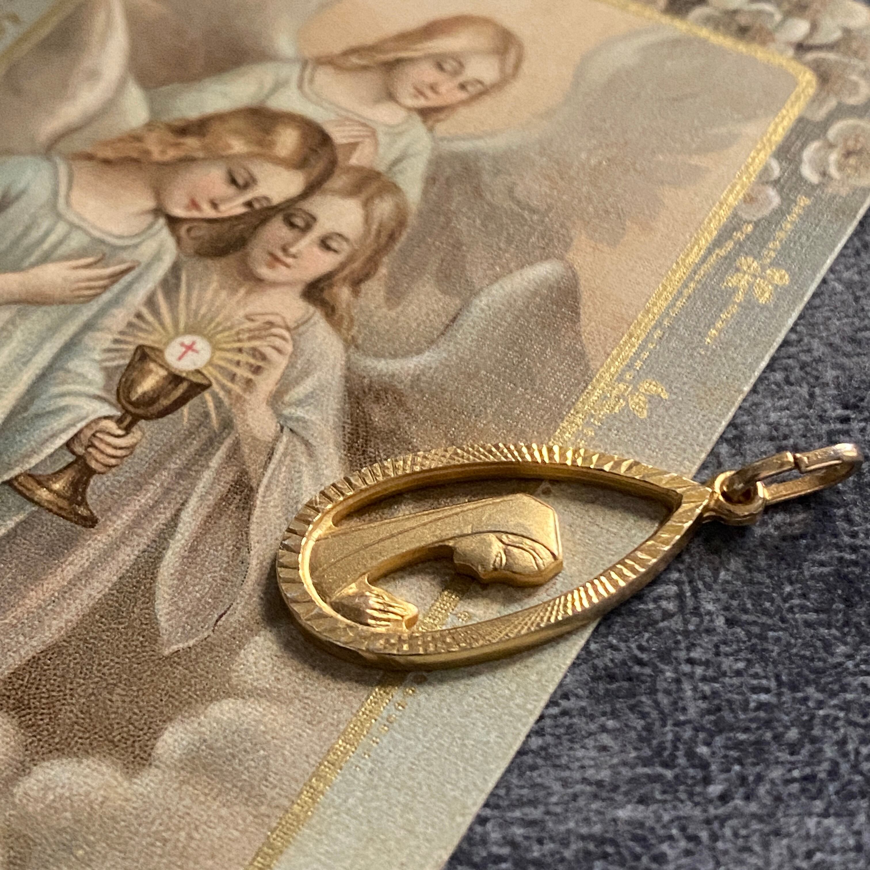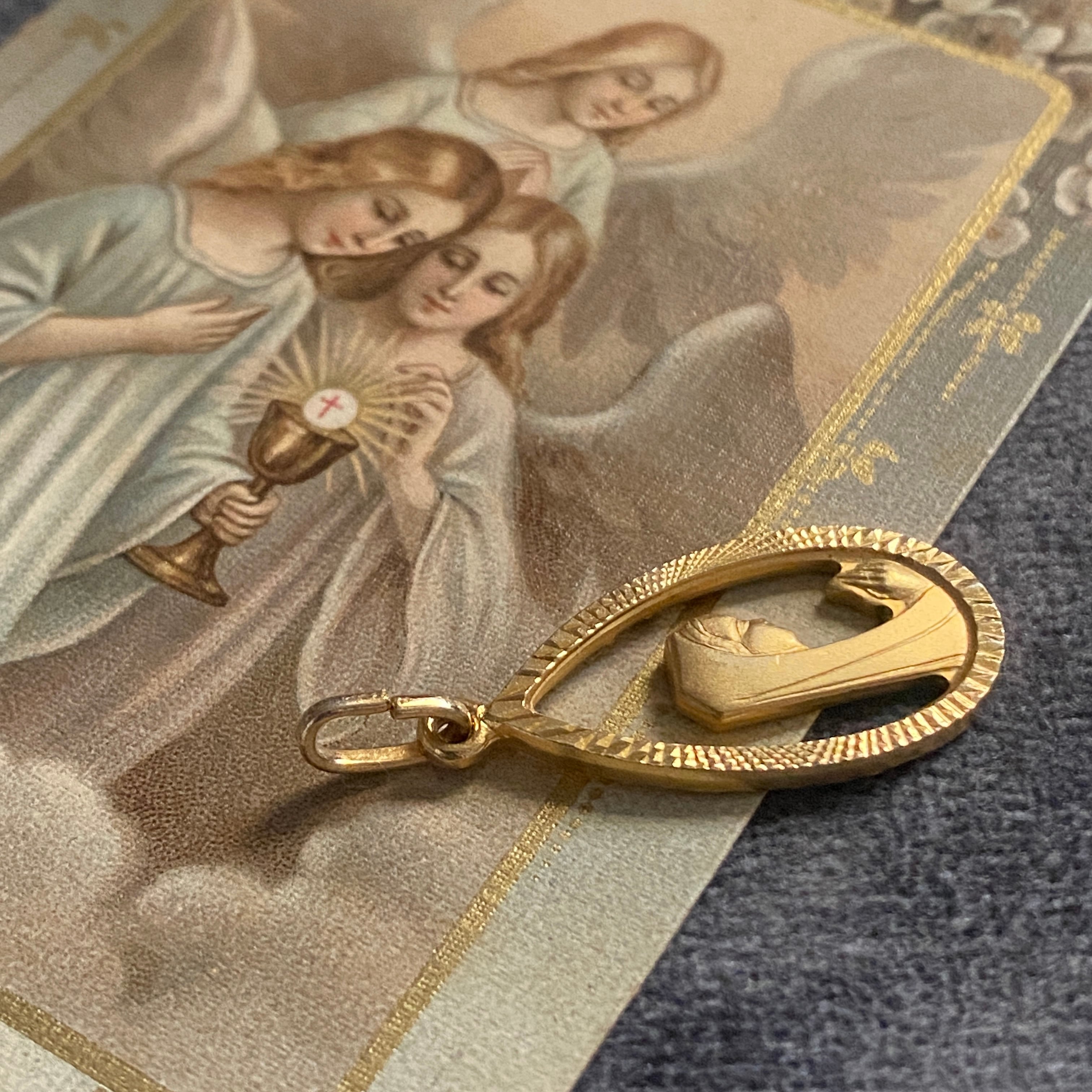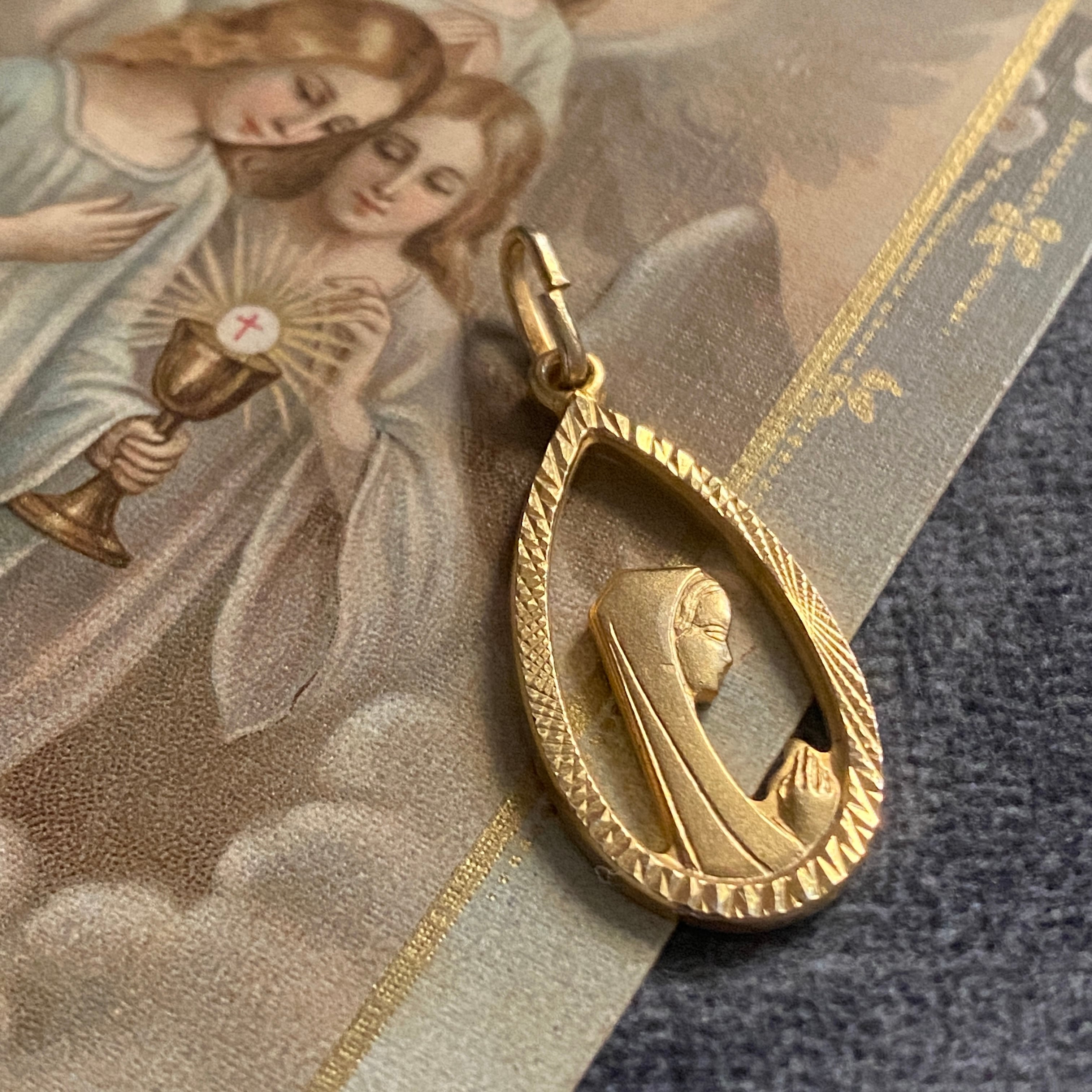 お祈りの手元まで繊細に浮き彫りされた、美しい造形のメダイです。