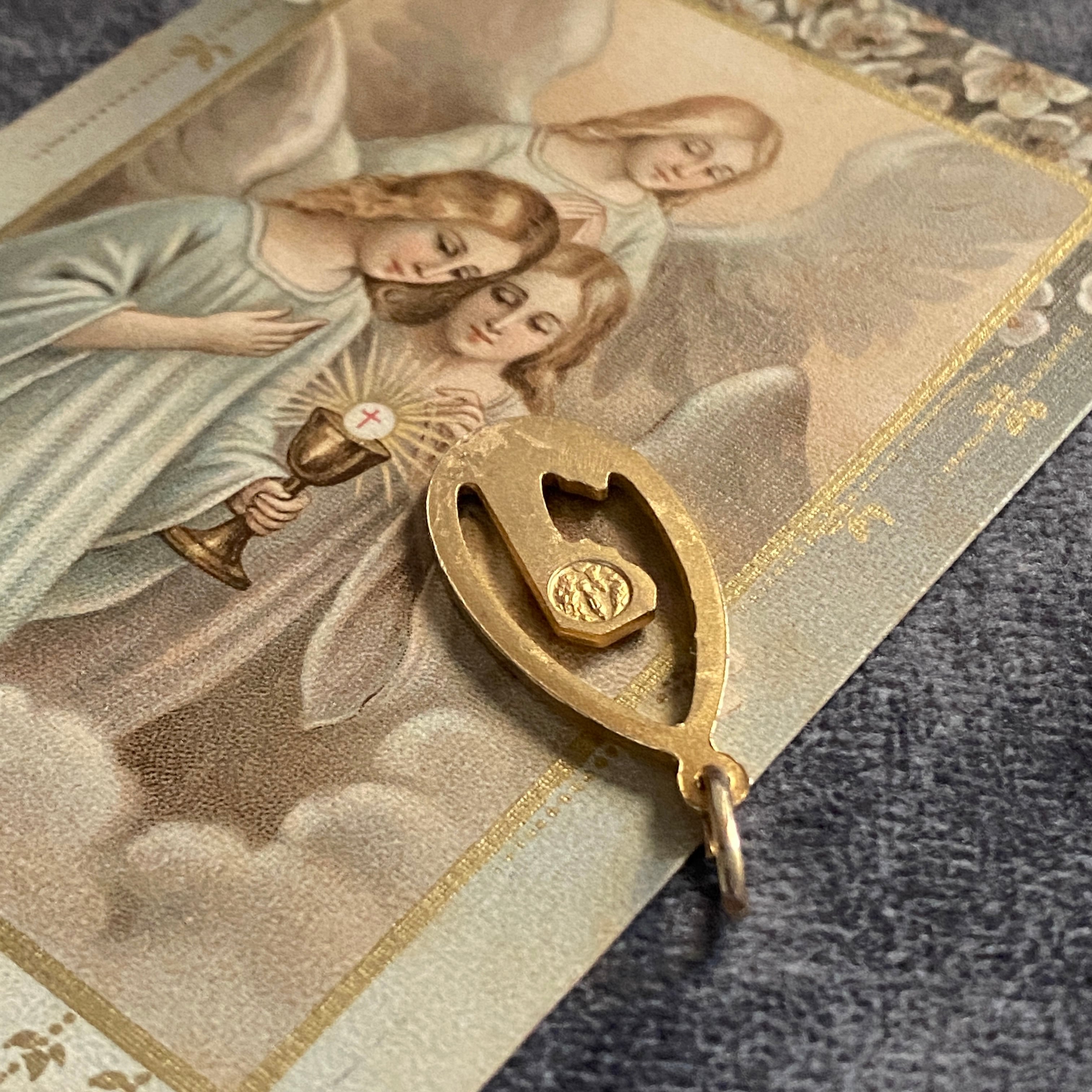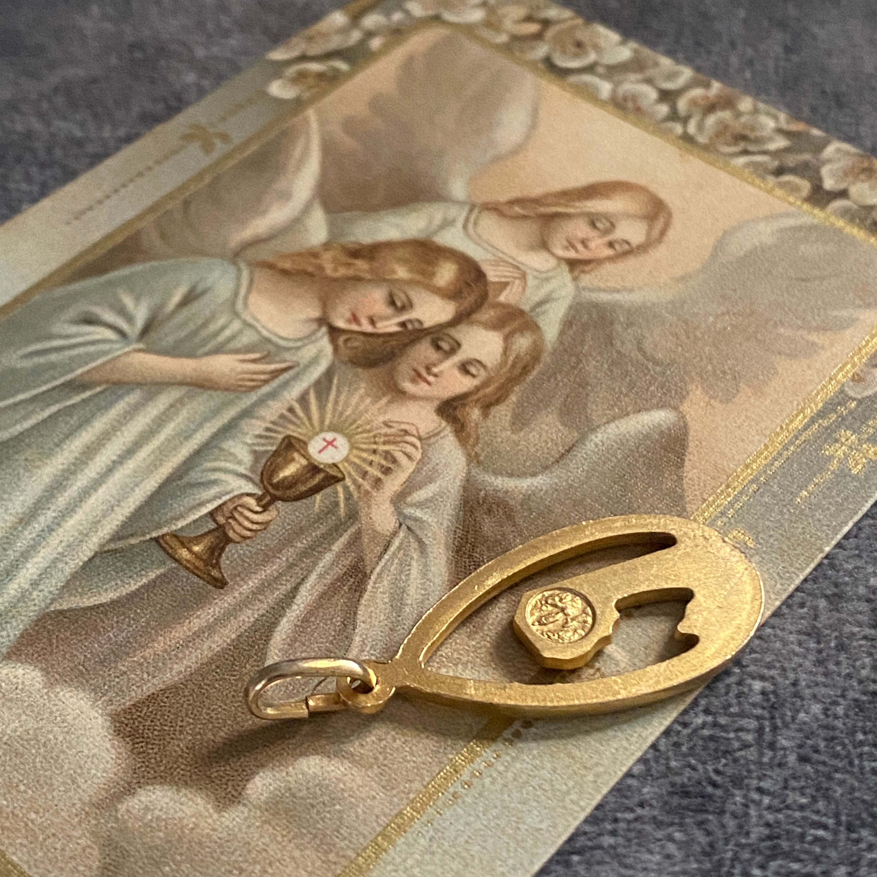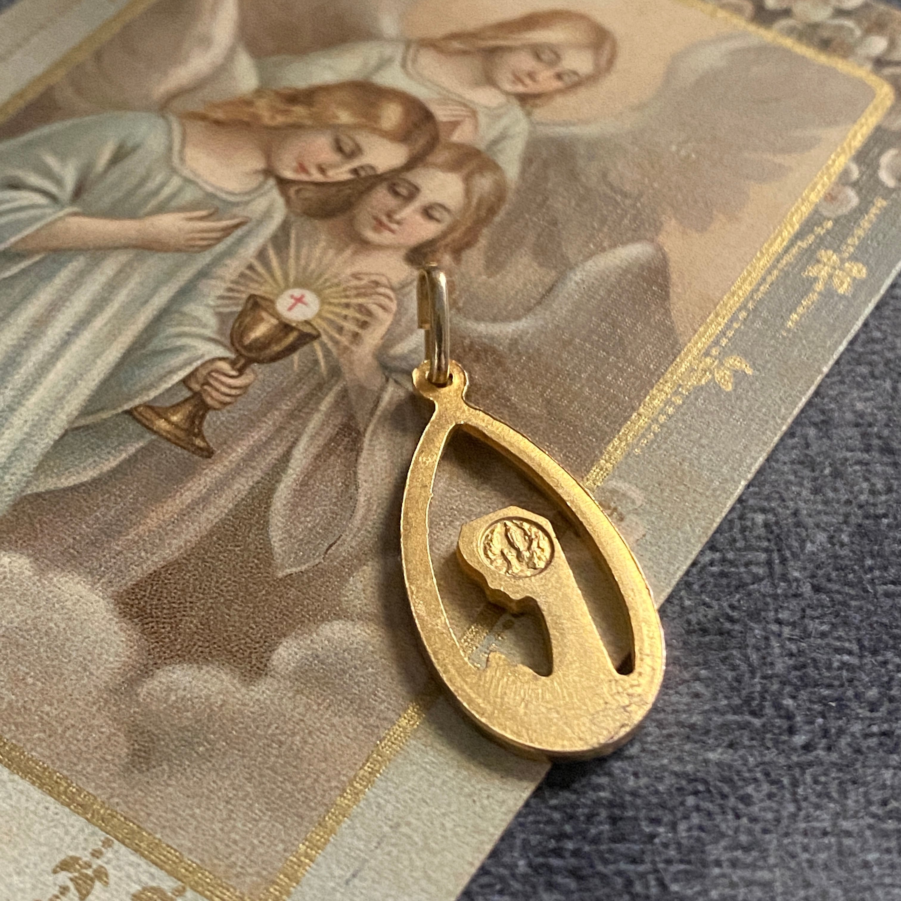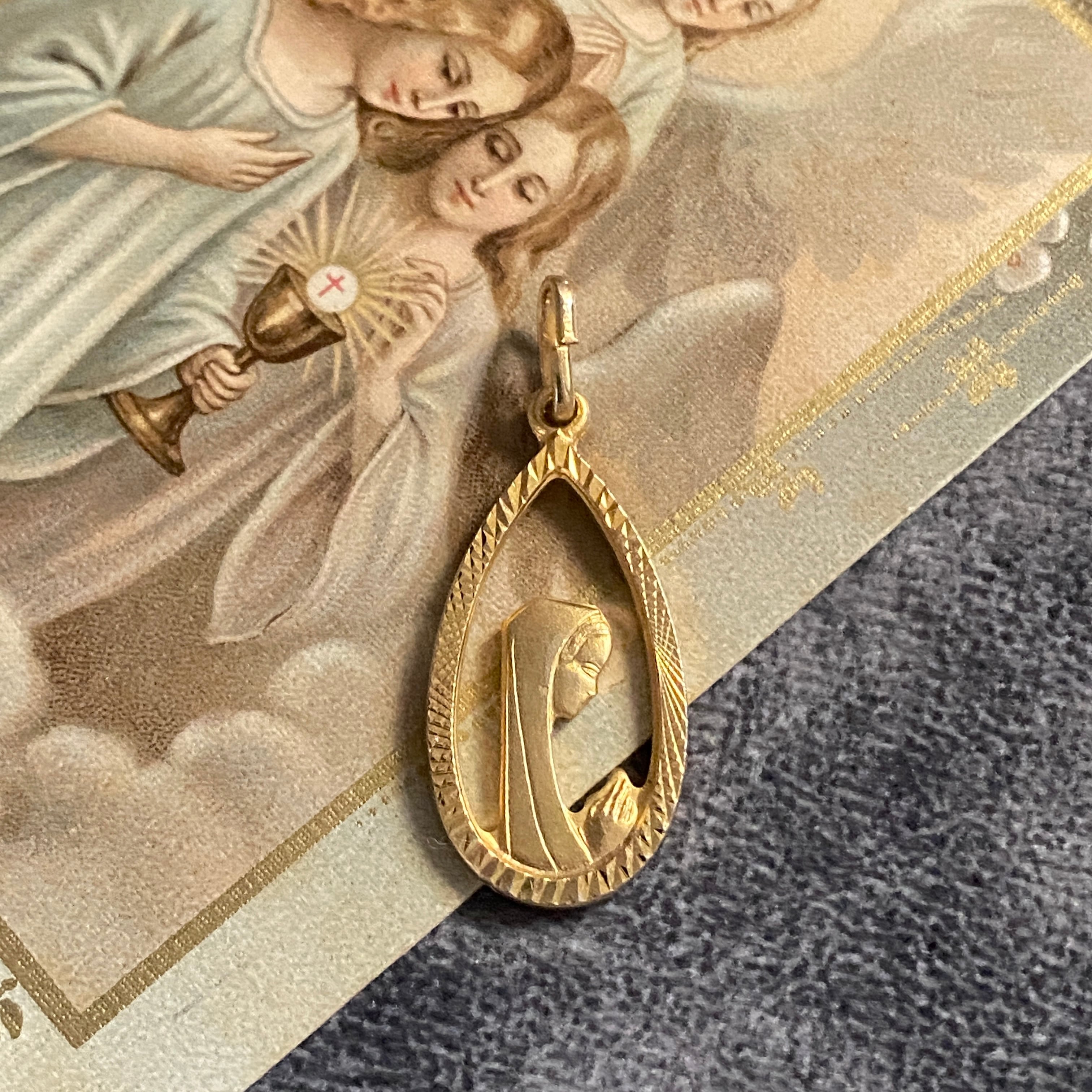 お祈りの手元まで繊細に浮き彫りされた、美しい造形のメダイです。
