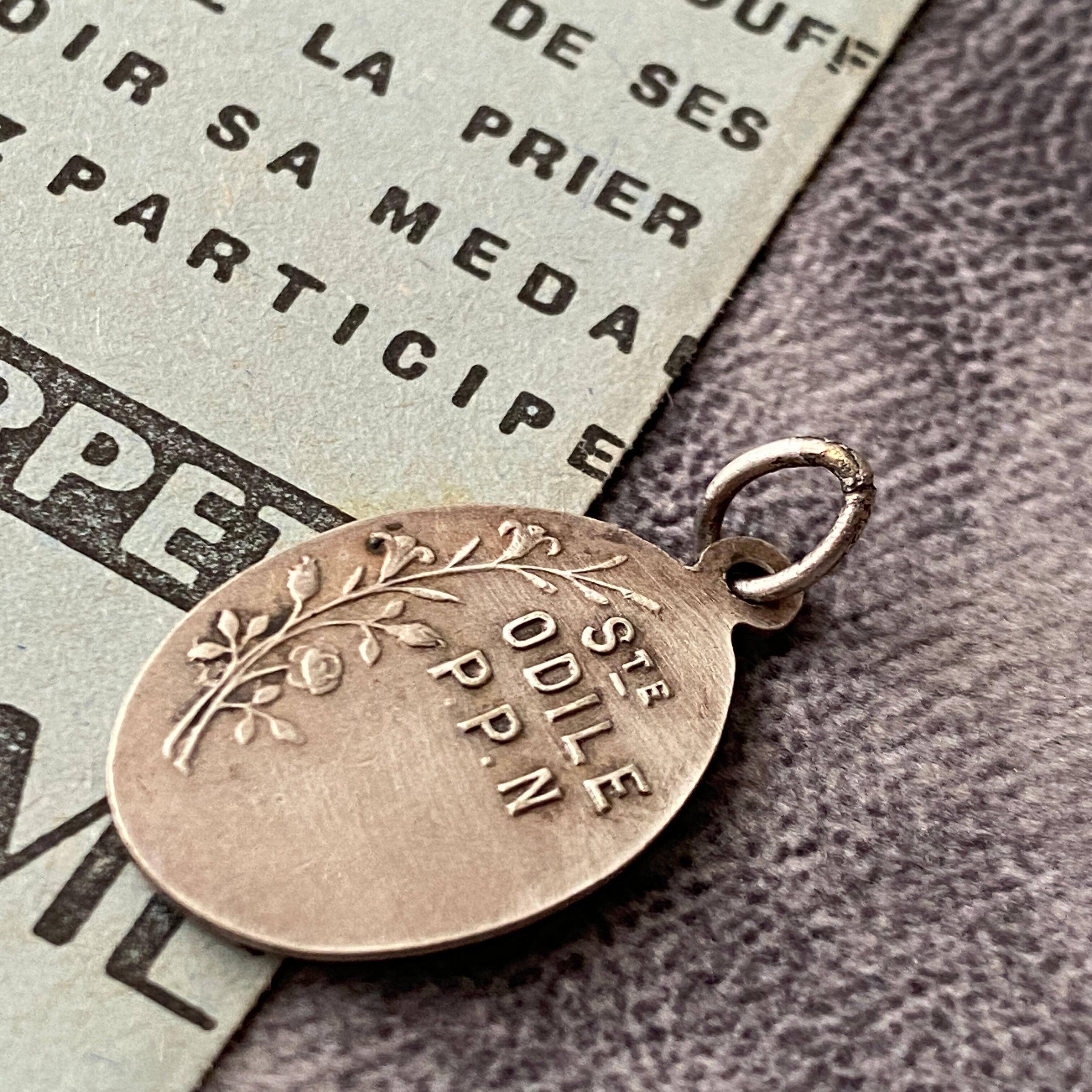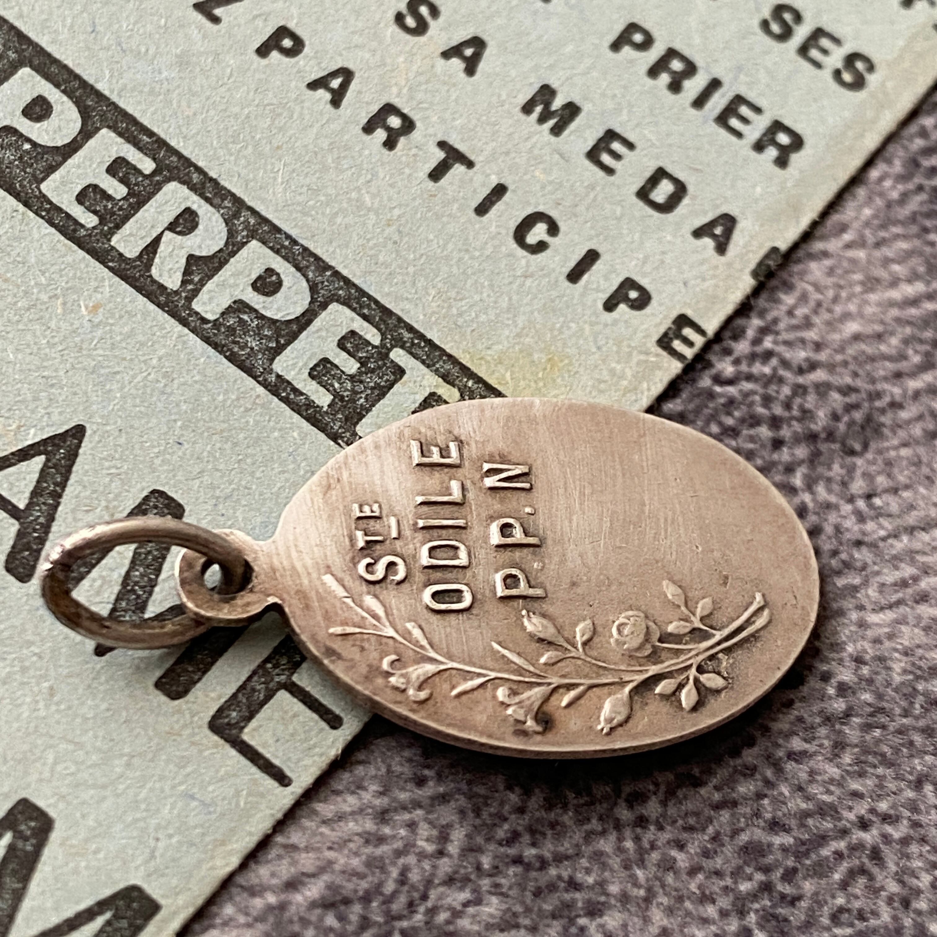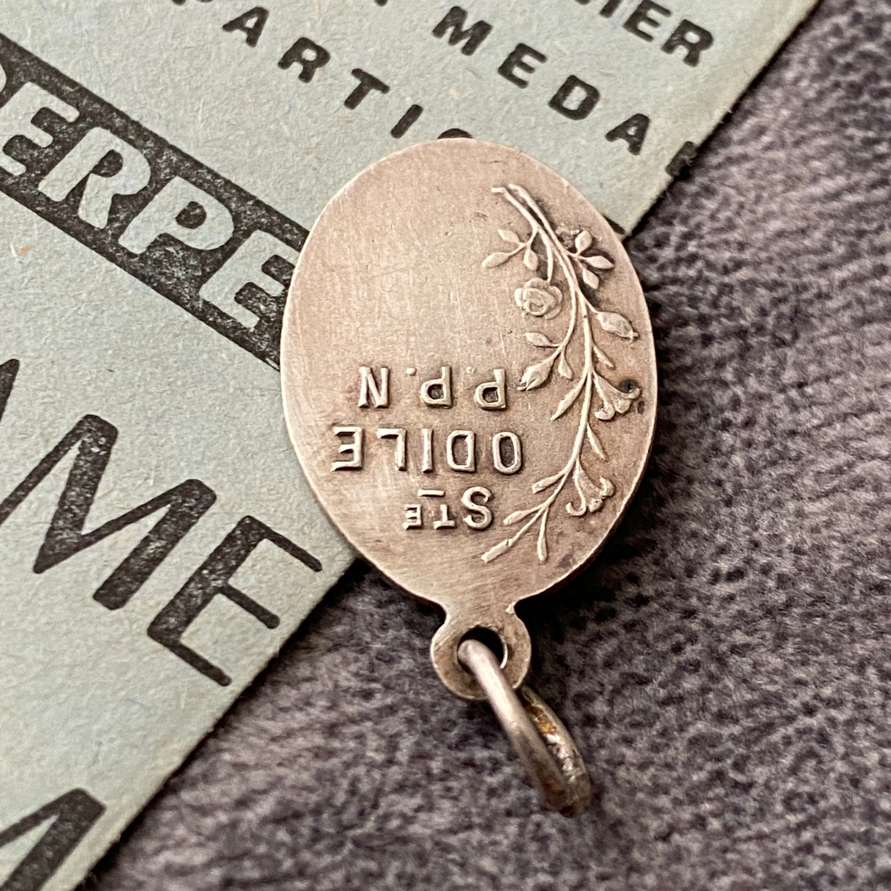 背面には「Ste Odile P.P.N(聖オディール、我らのために祈り給え)」の祈りの言葉と小花のレリーフ。