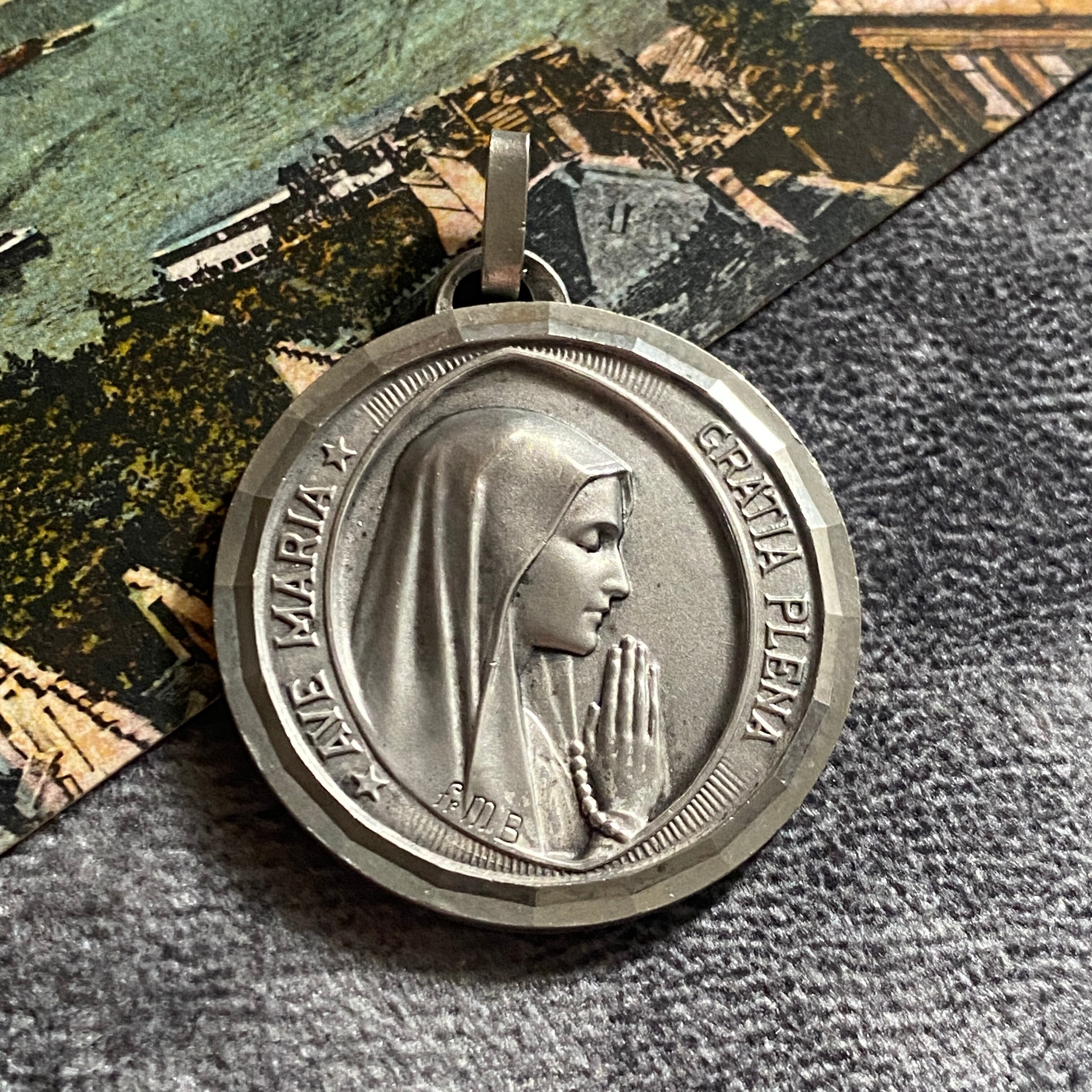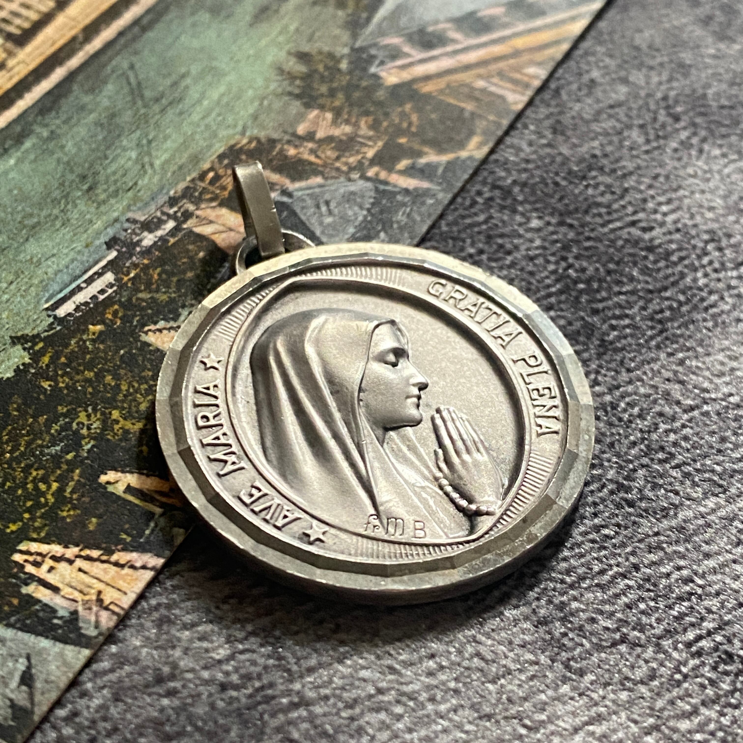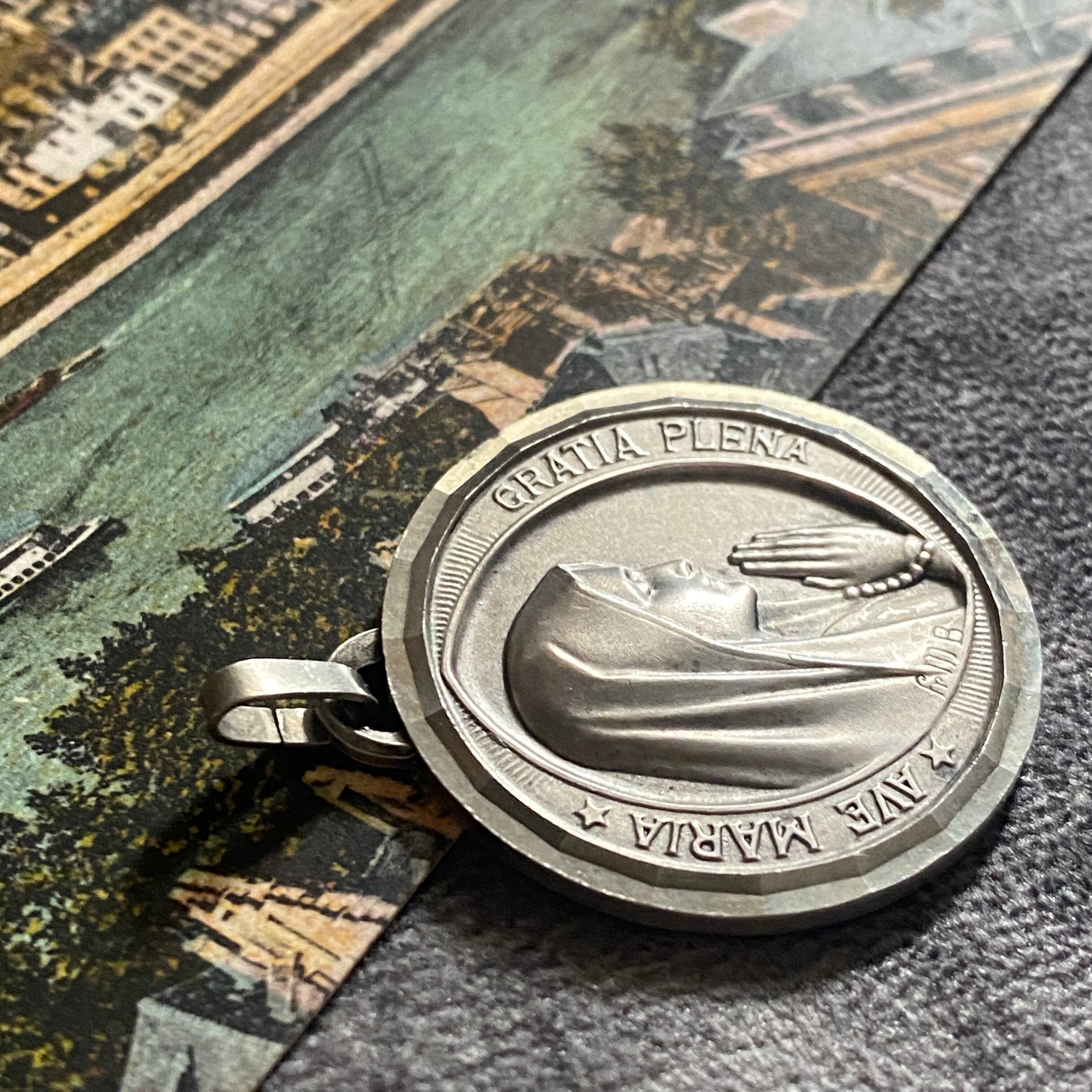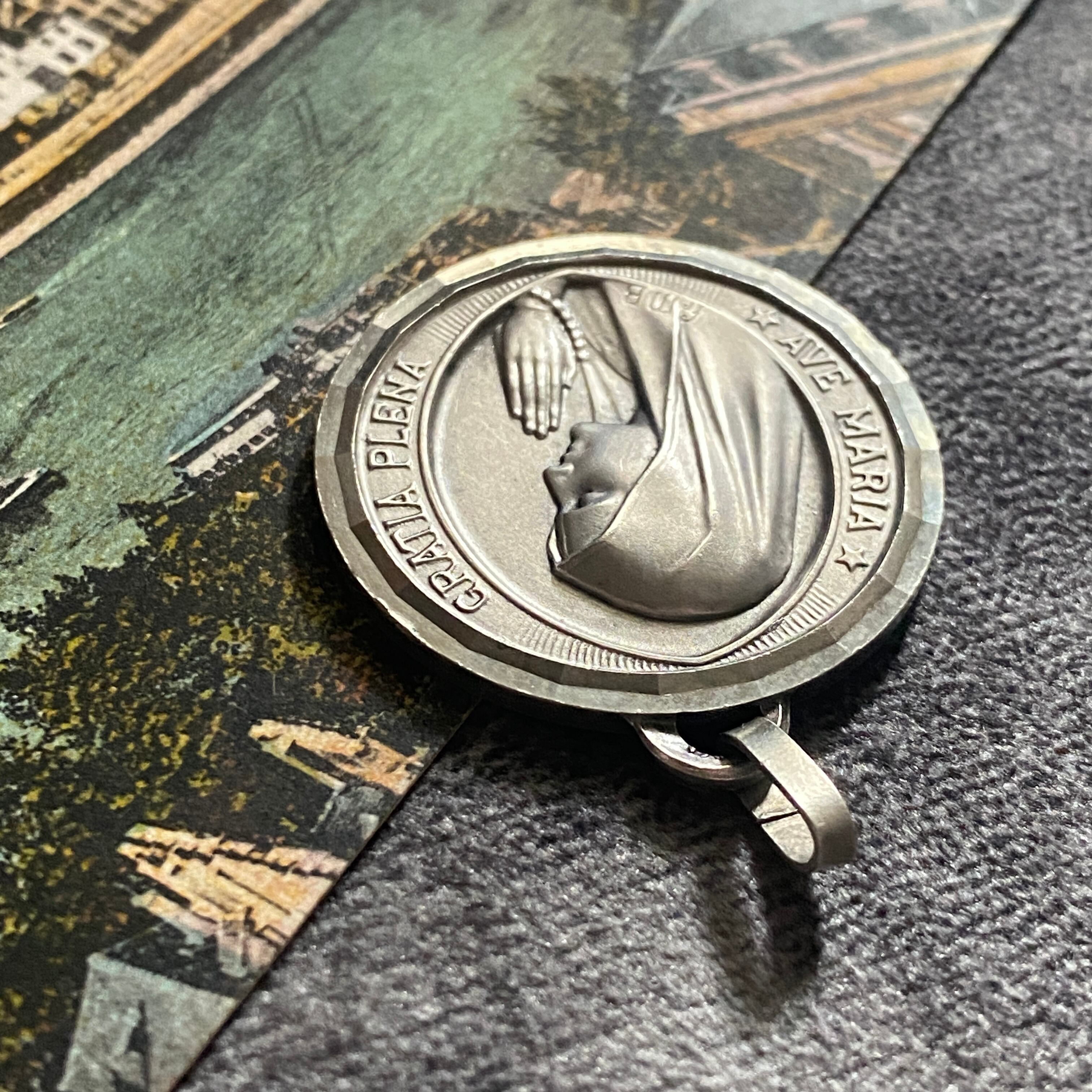祈りを捧げる聖母マリアの横顔が美しく刻まれた、大きめサイズのルルドのメダイ。