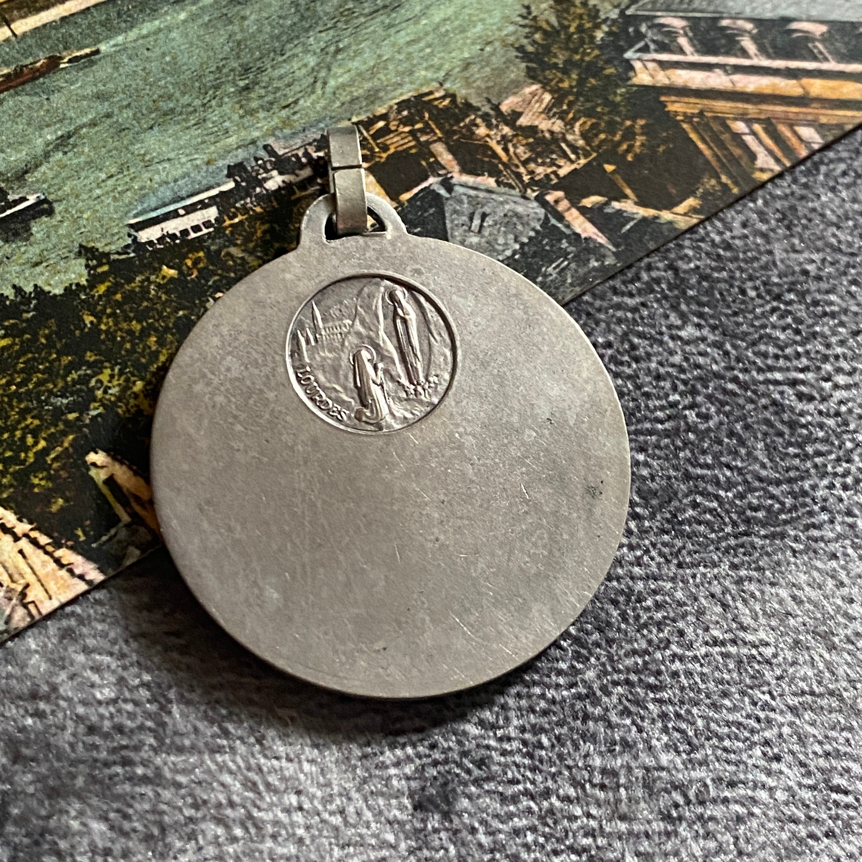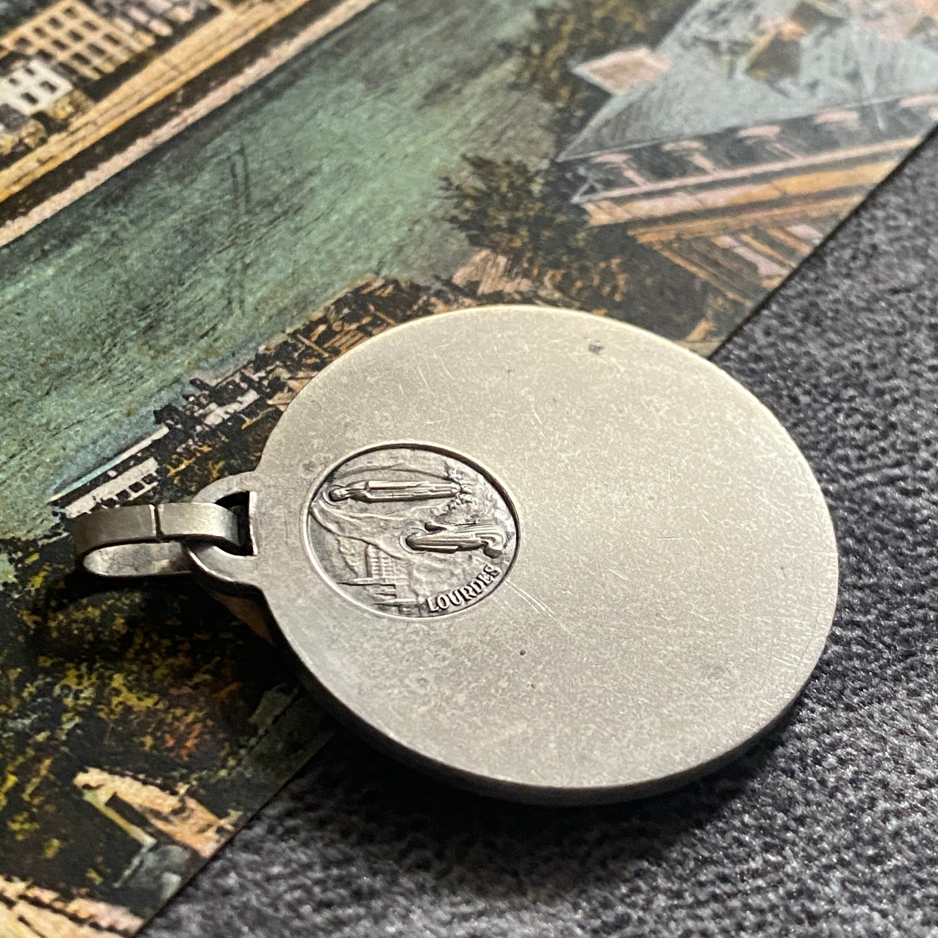 背面にはルルドの出現シーンが小さく描かれ、シンプルでありながら力強い信仰の証が込められています。