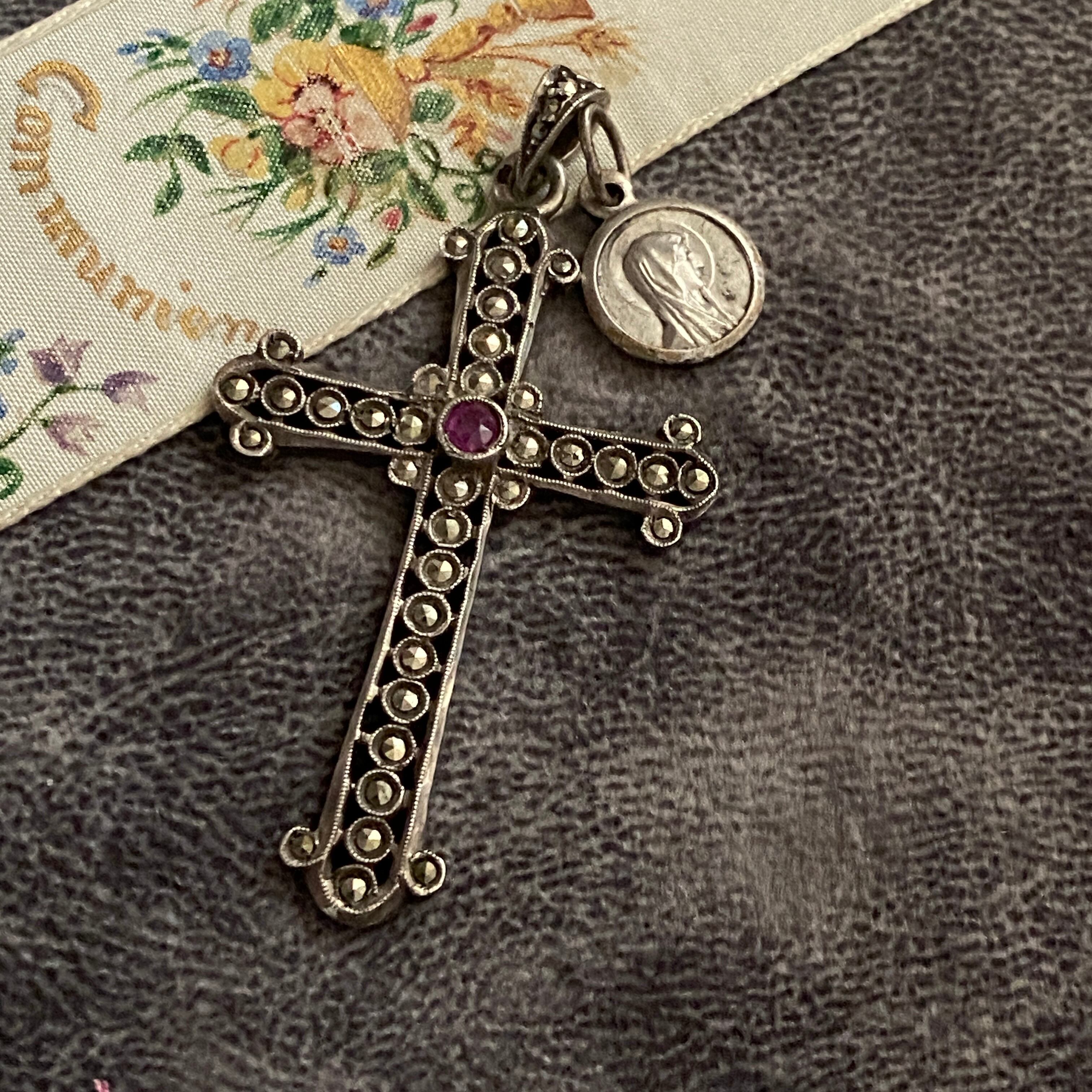 『ルルドの祈りのマリア』として有名なデザインのこちらは、ルルドの泉に現れたマリアの奇跡と泉の聖水の奇跡をメダイという御守りとして当時のフランス国民が身につけたことから、様々なデザインで製造されていました。