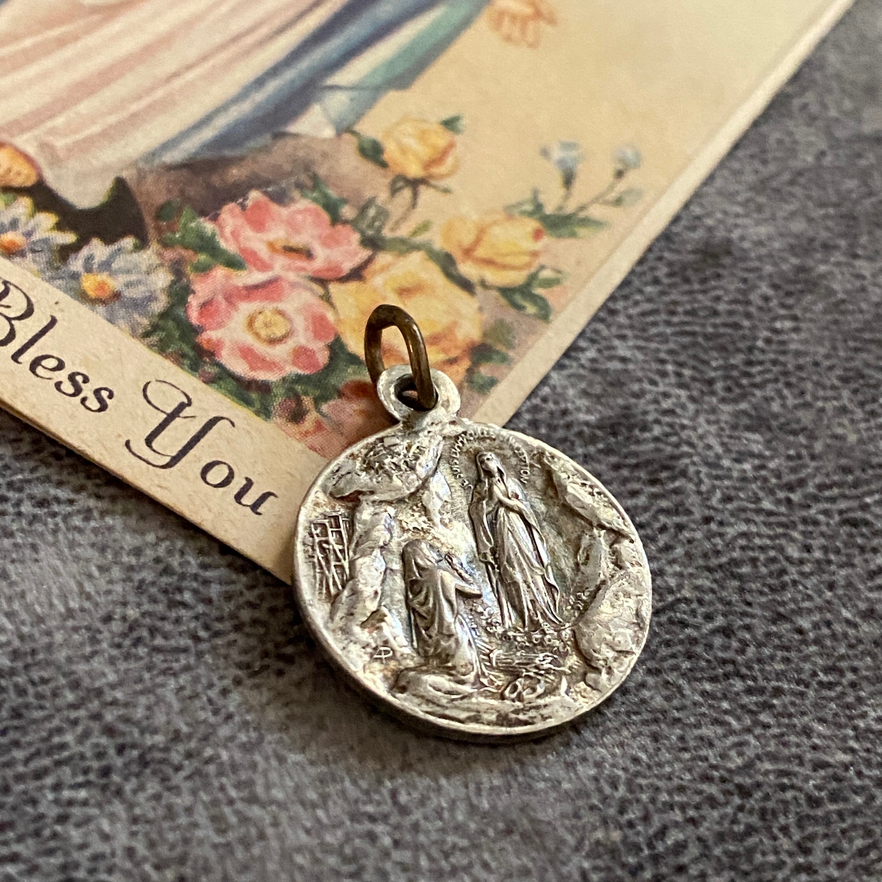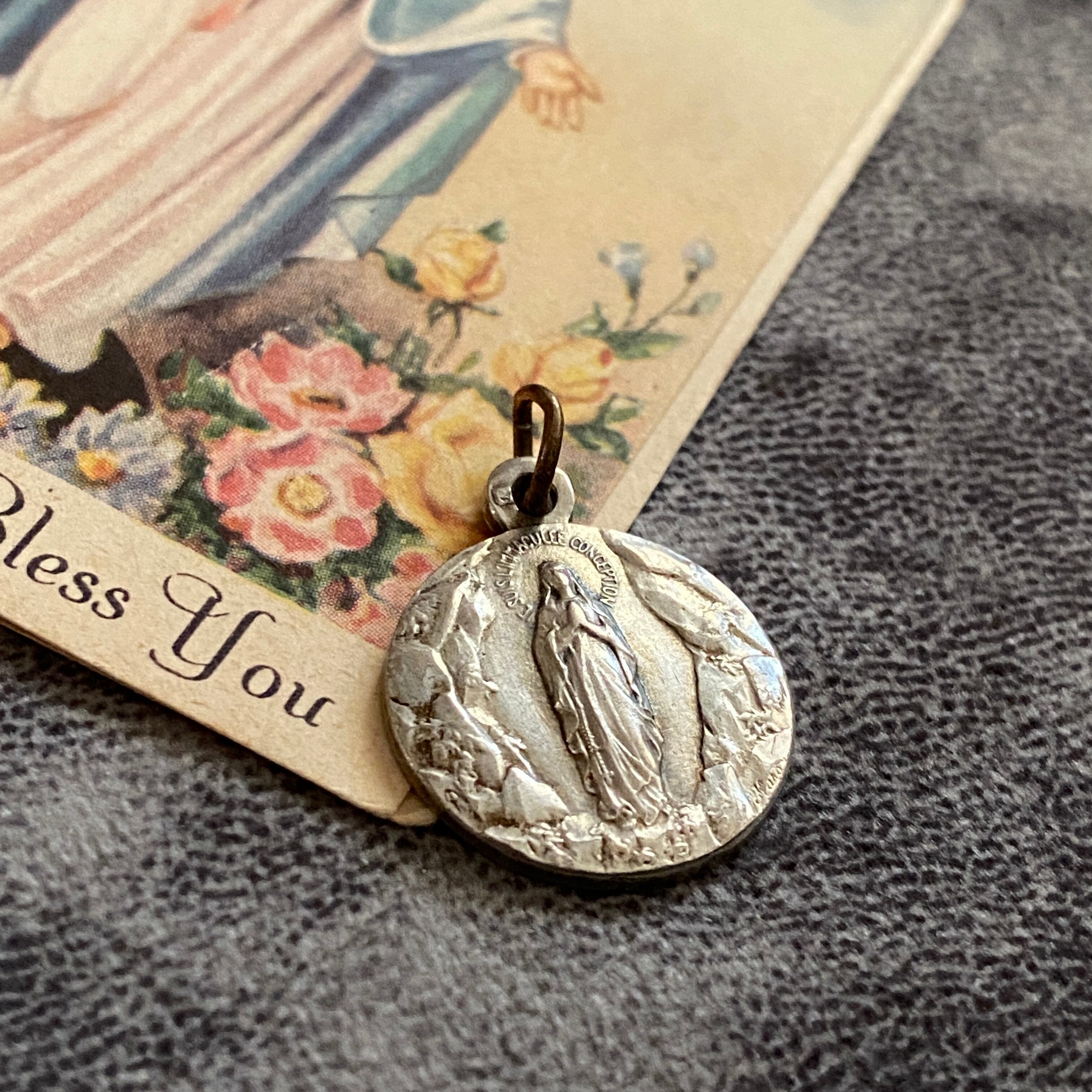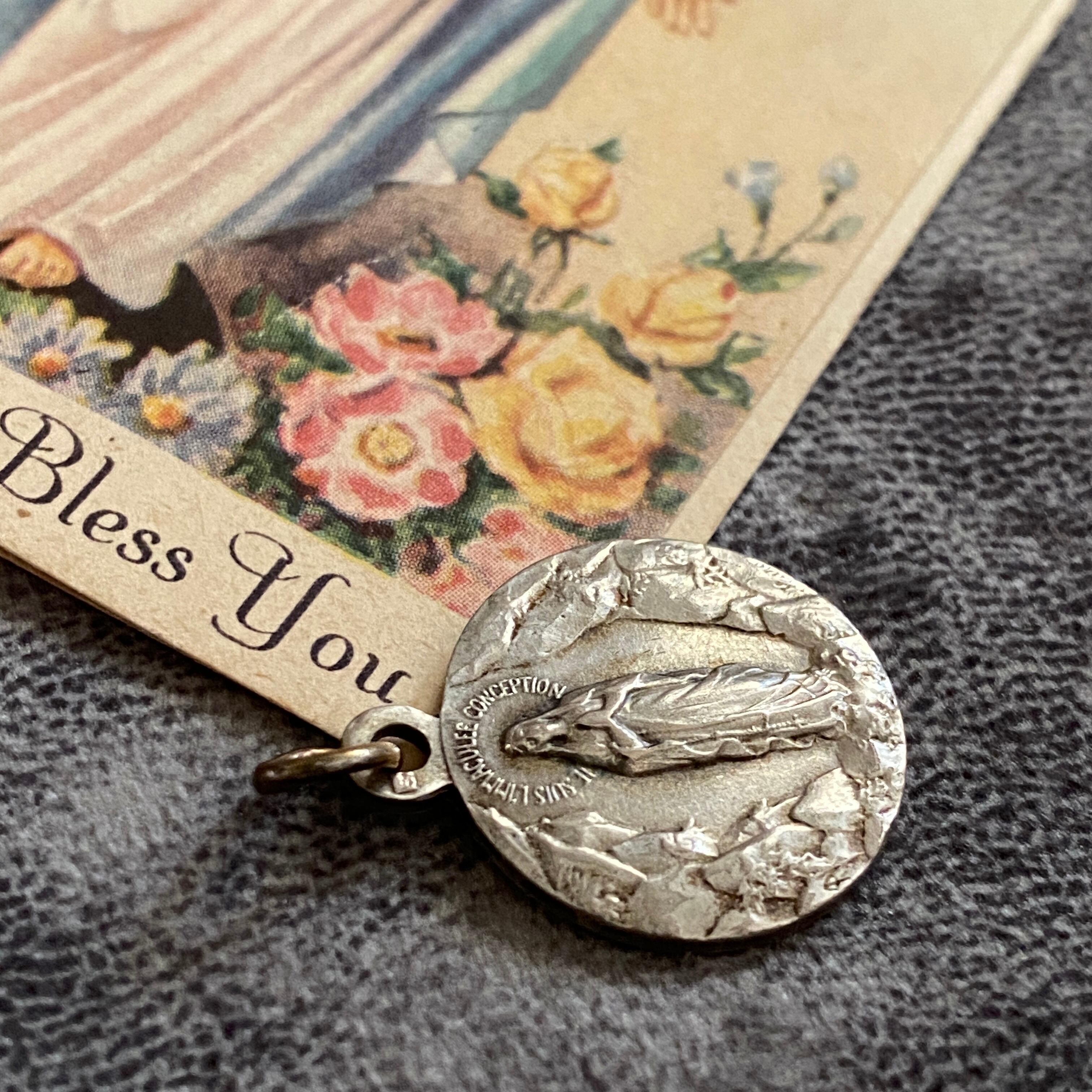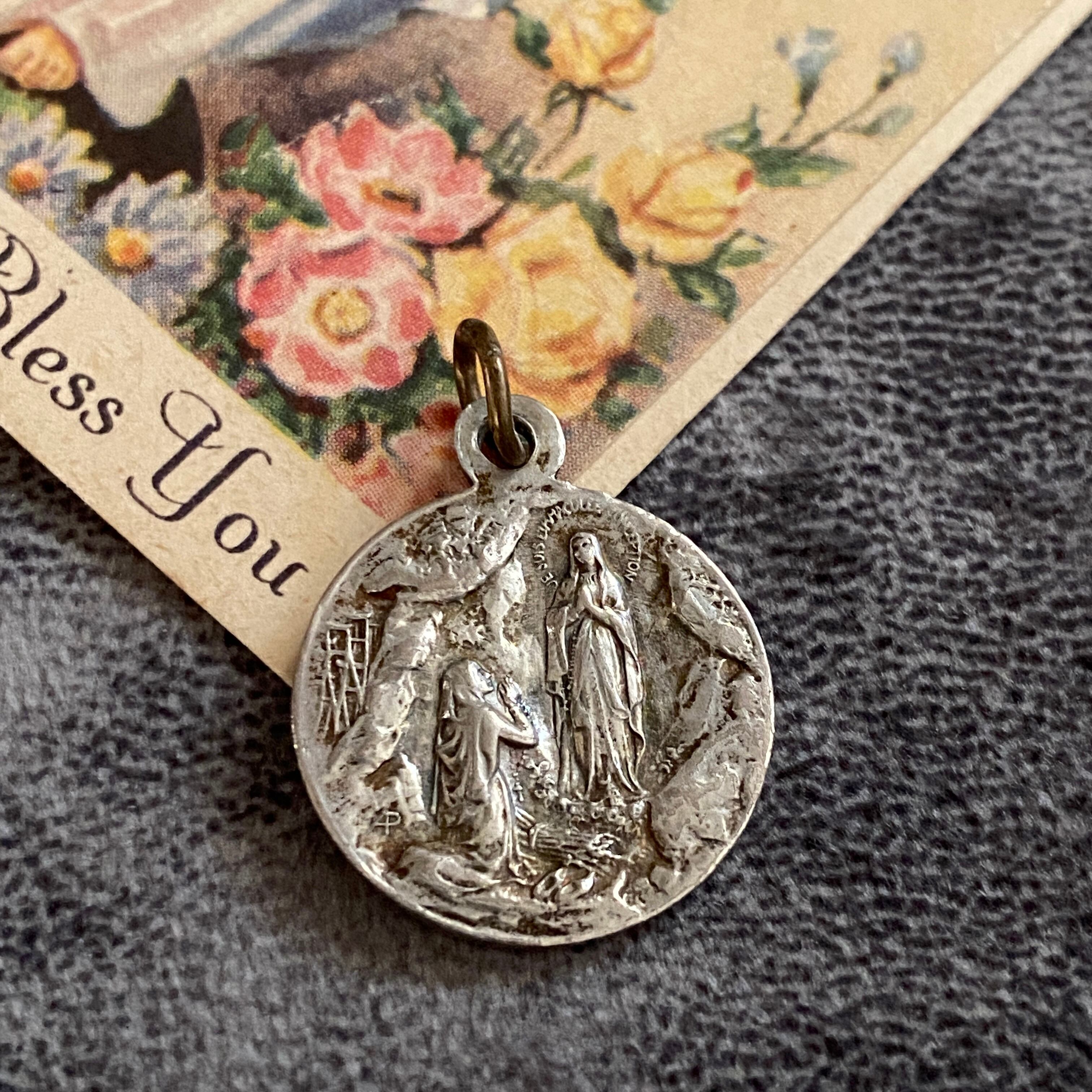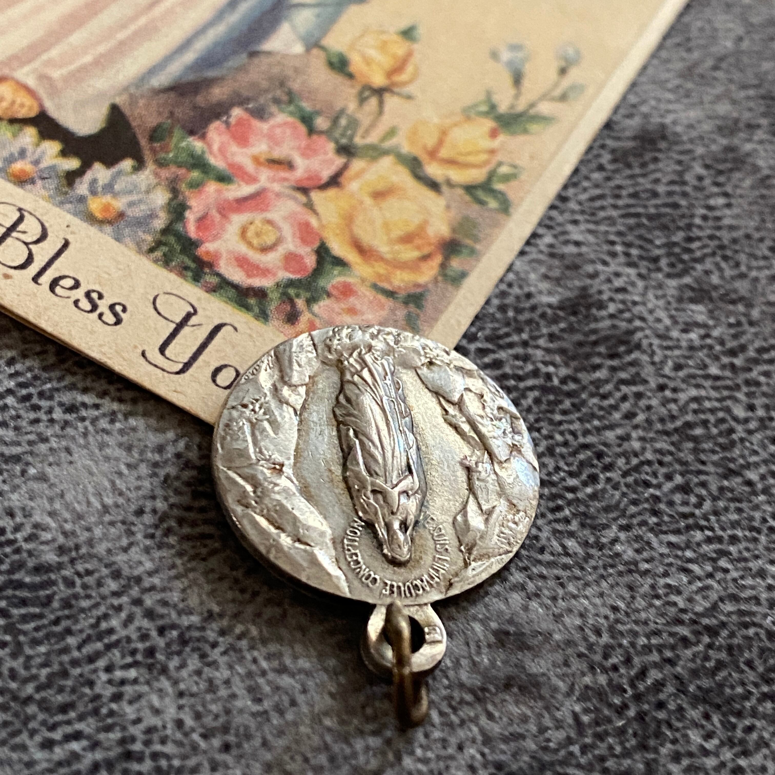 正面には「無原罪の御宿り」の聖母マリア、背面にはベルナデッタの前に現れたルルドの出現の場面を刻んだシルバーメダイ。