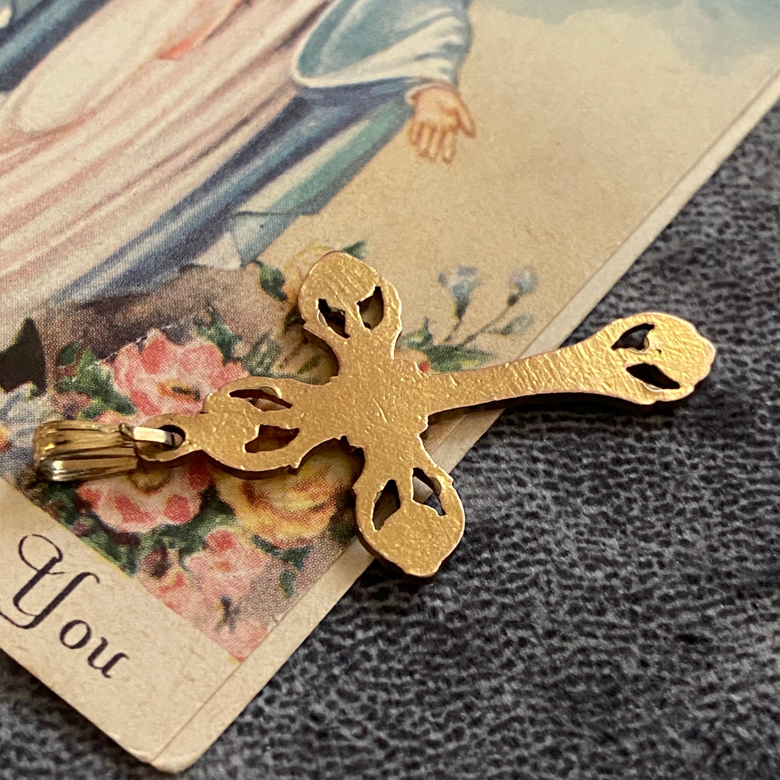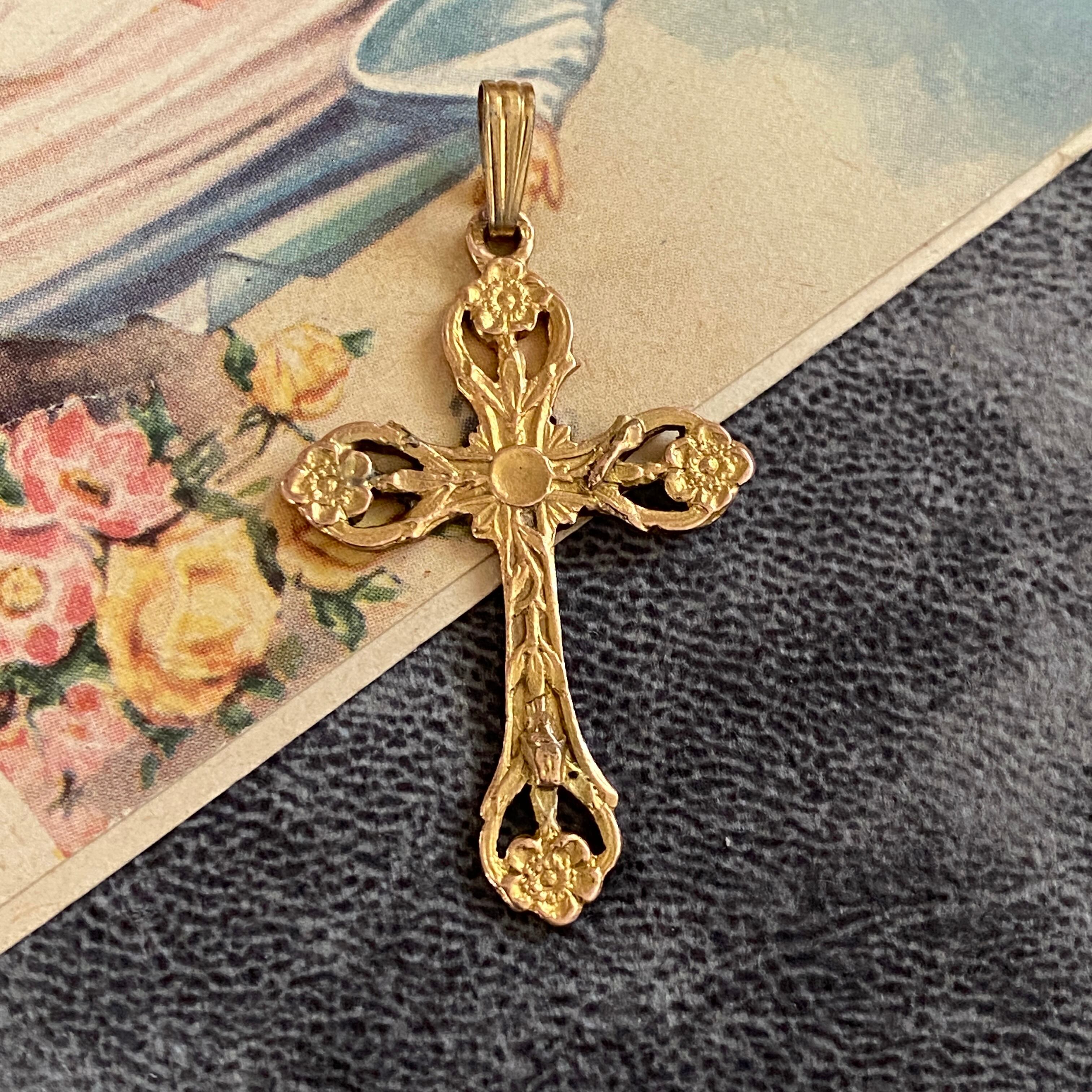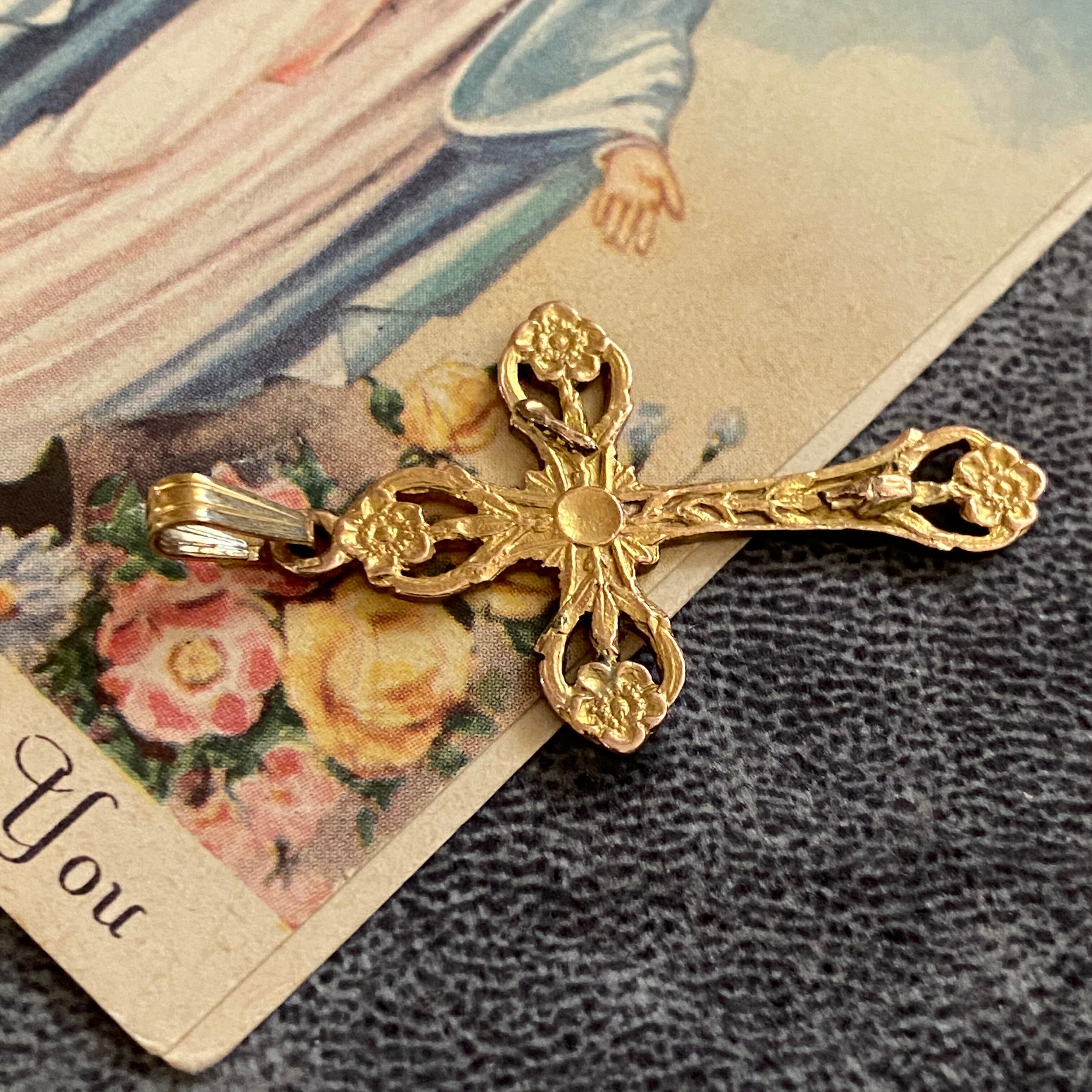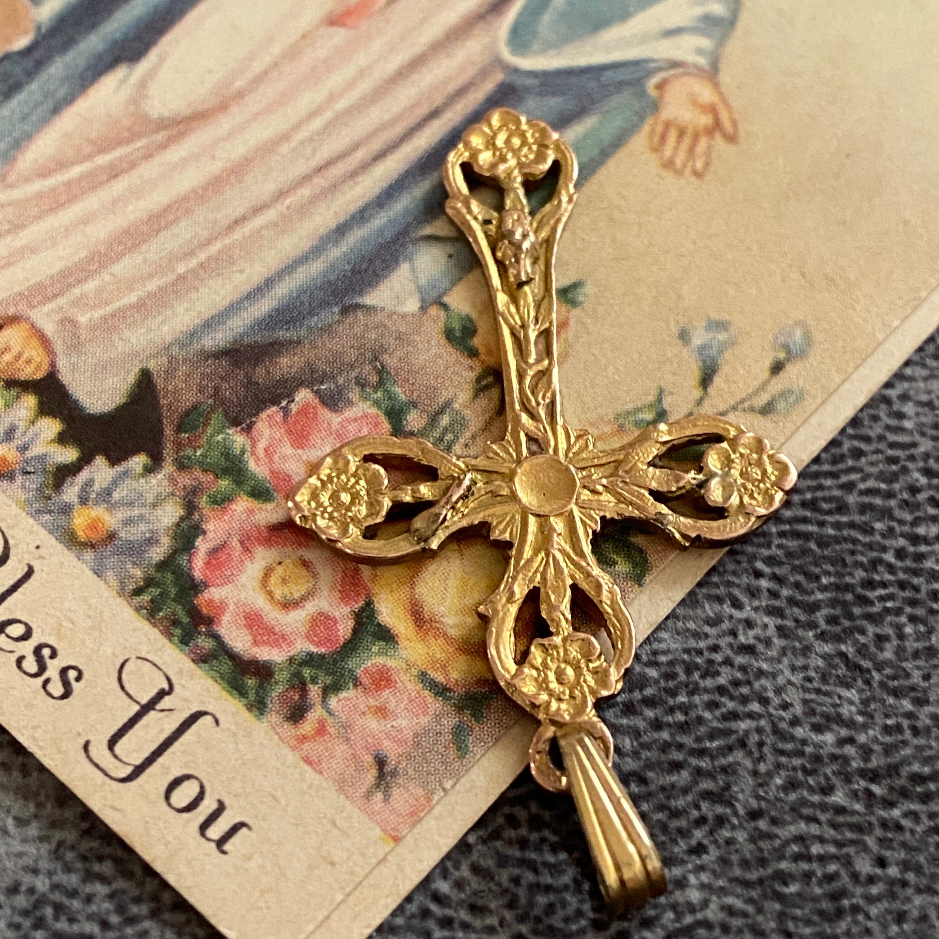 花々と光の意匠を組み合わせた、繊細な透かし装飾のゴールドクロス。
