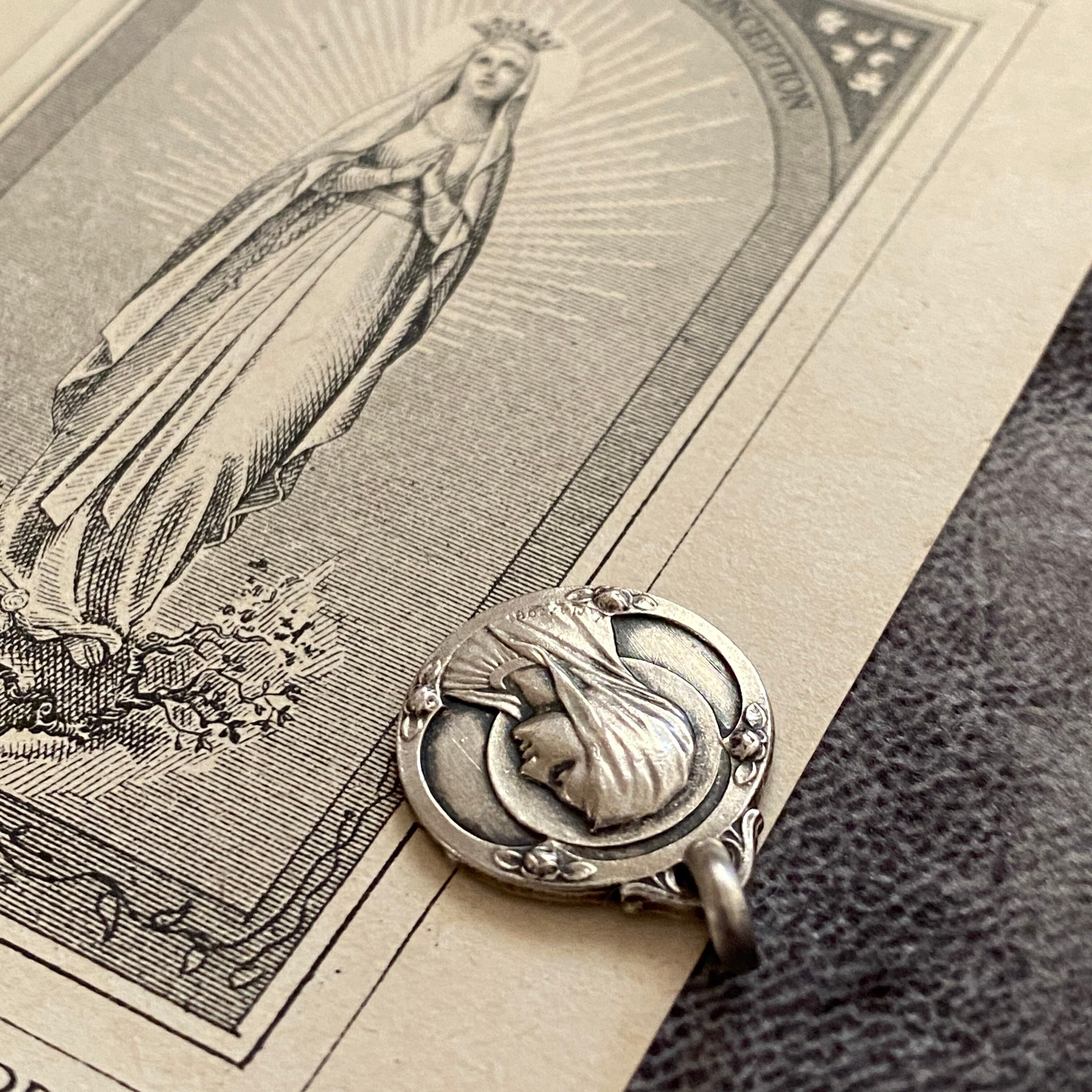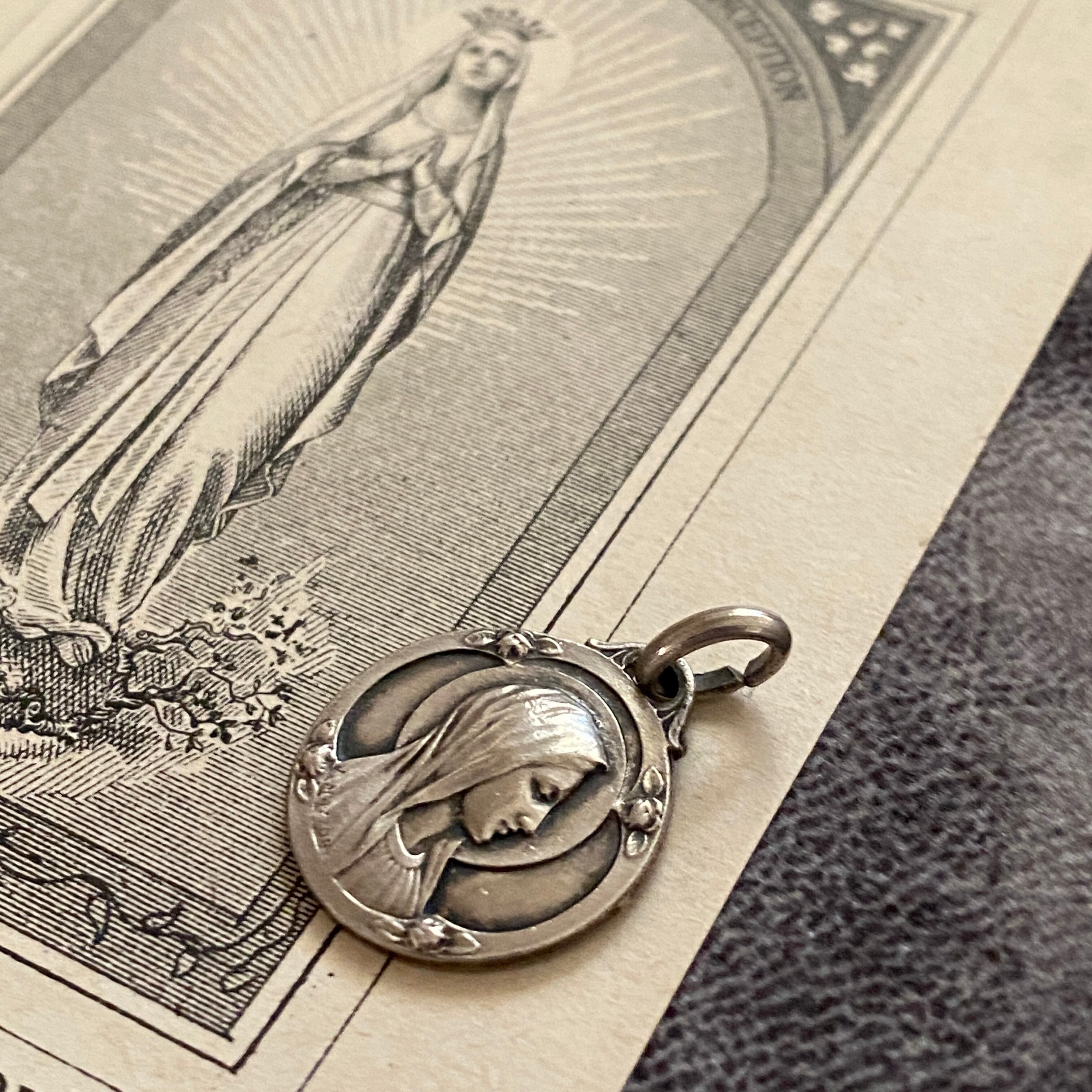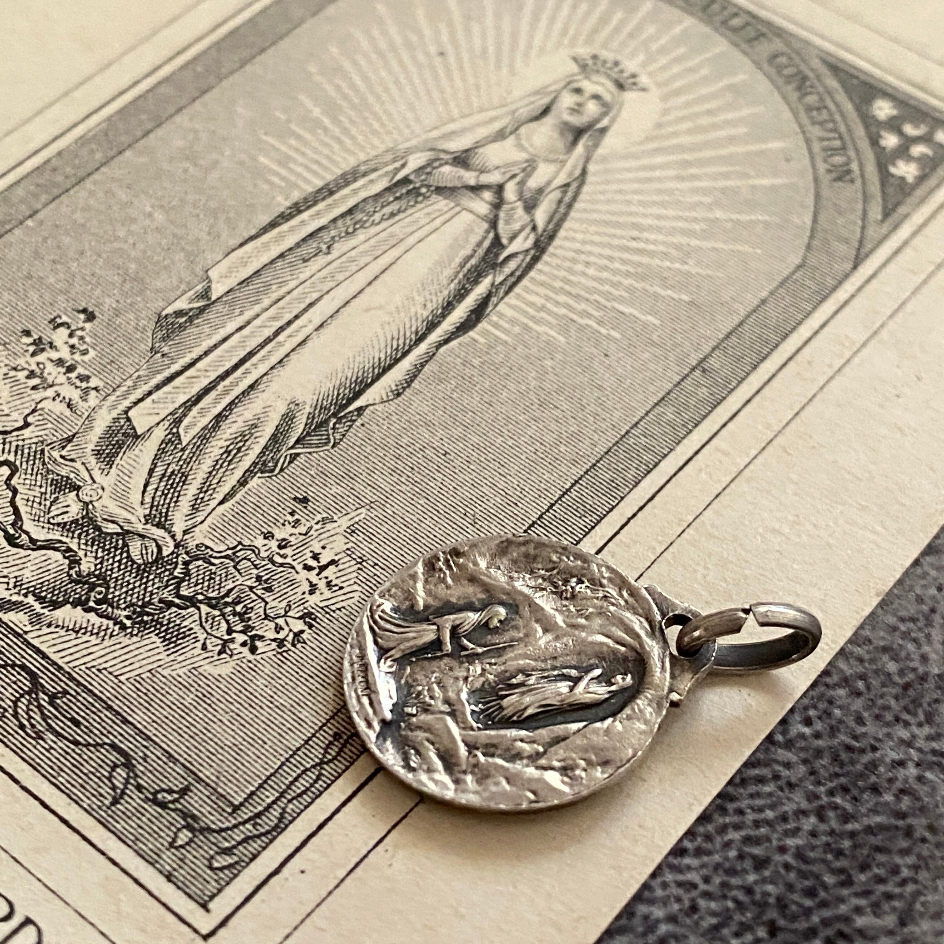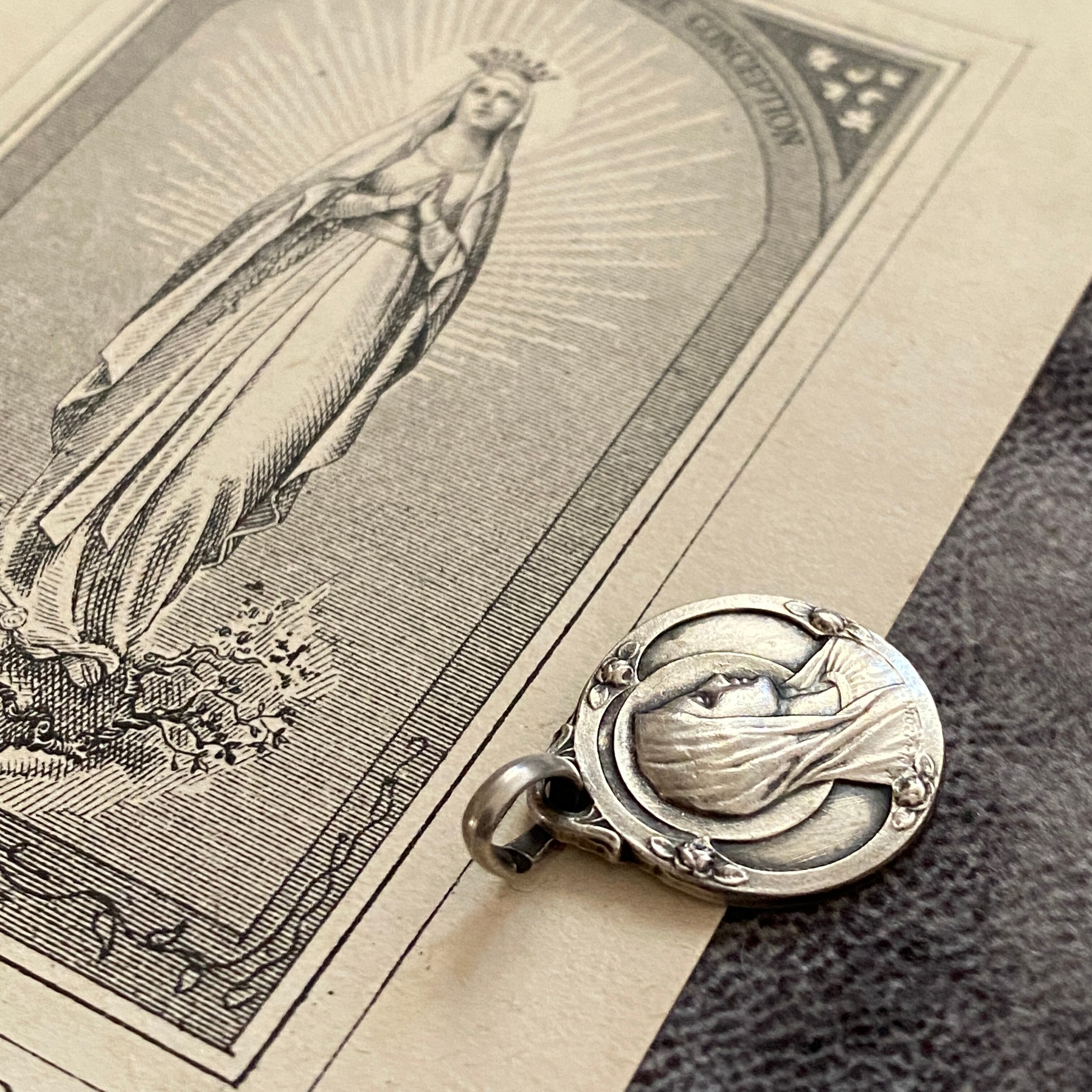 横顔の聖母を端正に描いた表面と、背面にルルドの出現の情景を刻んだシルバーメダイ。