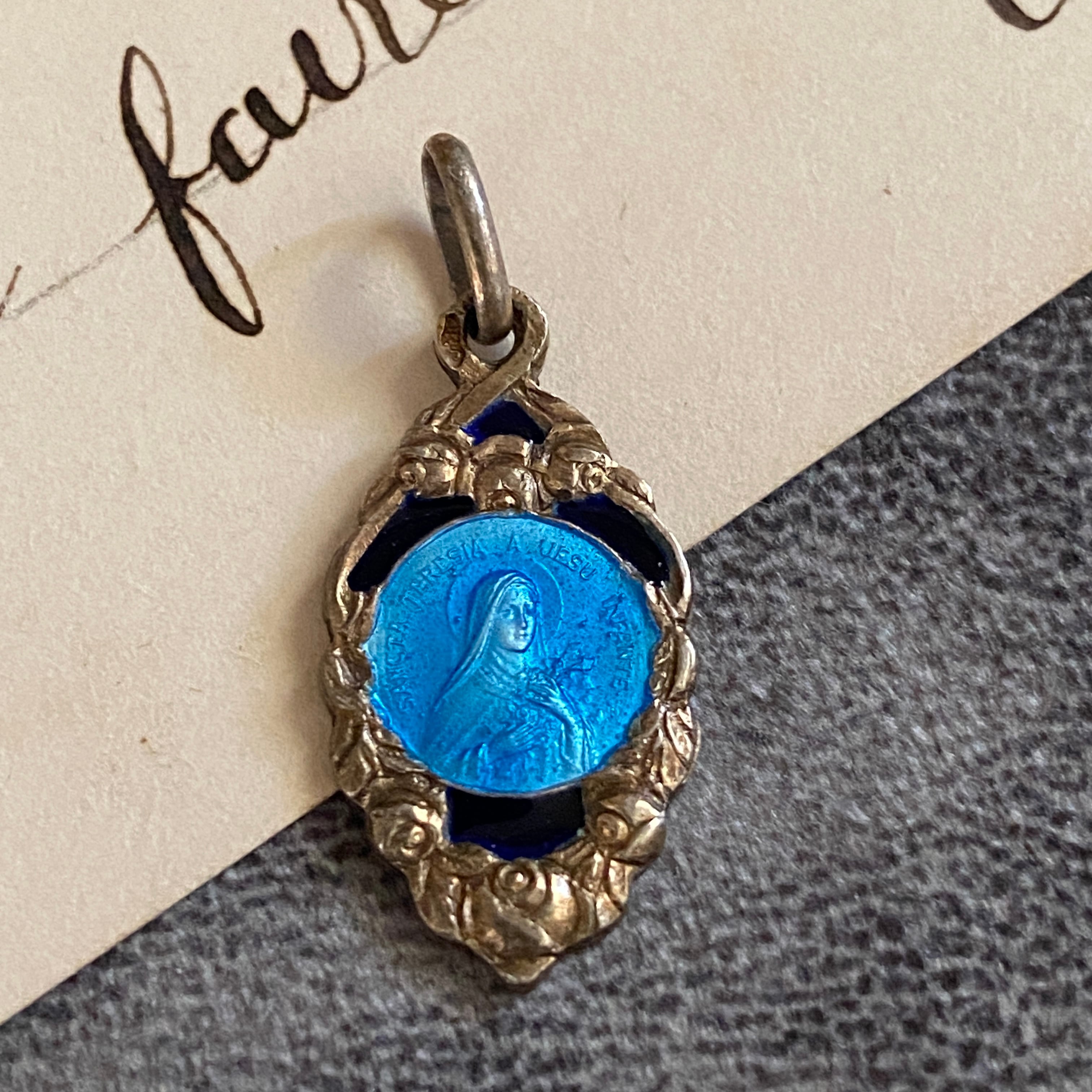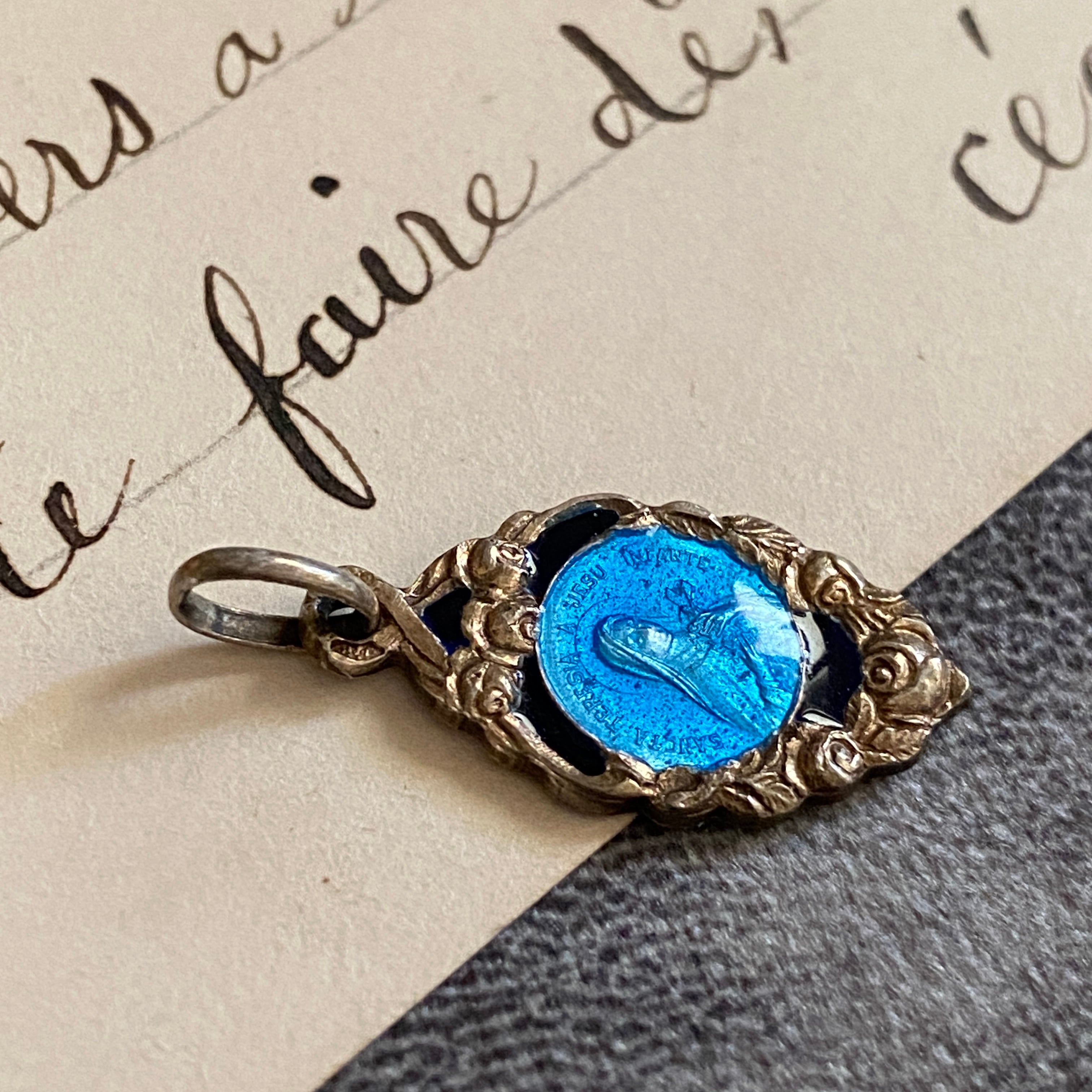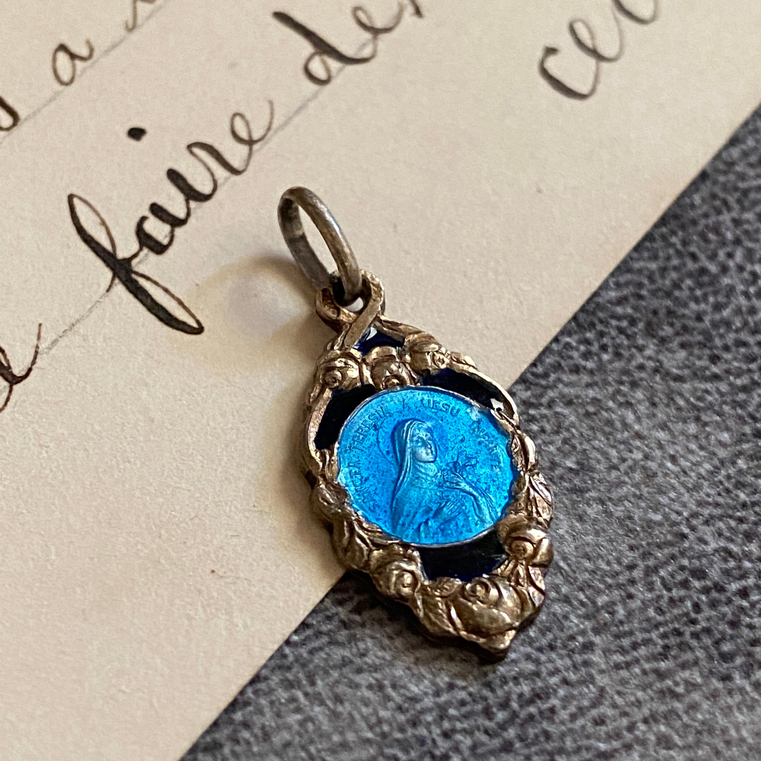 薔薇を象徴するフレームに包まれた、聖テレジアの小さな青の祈り。