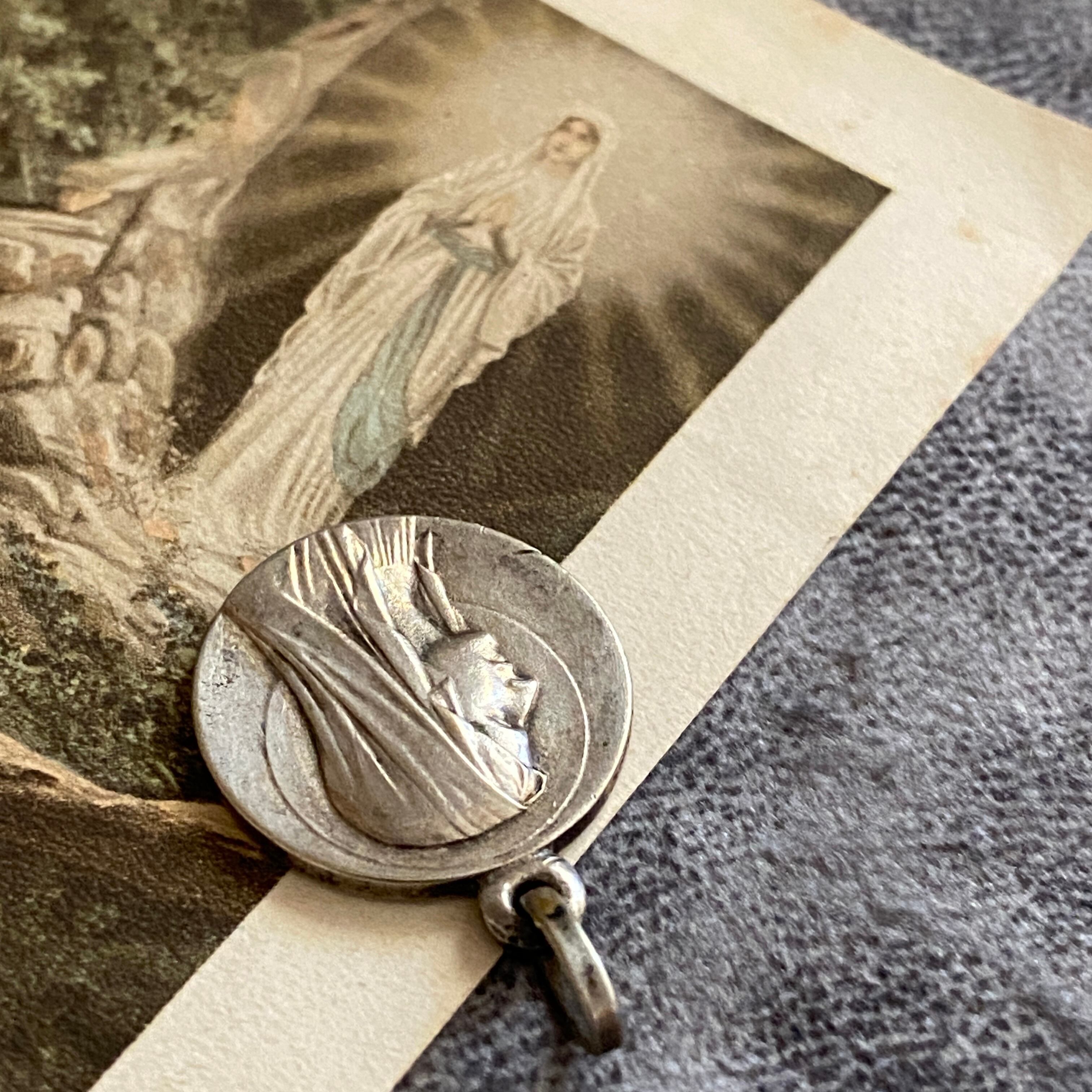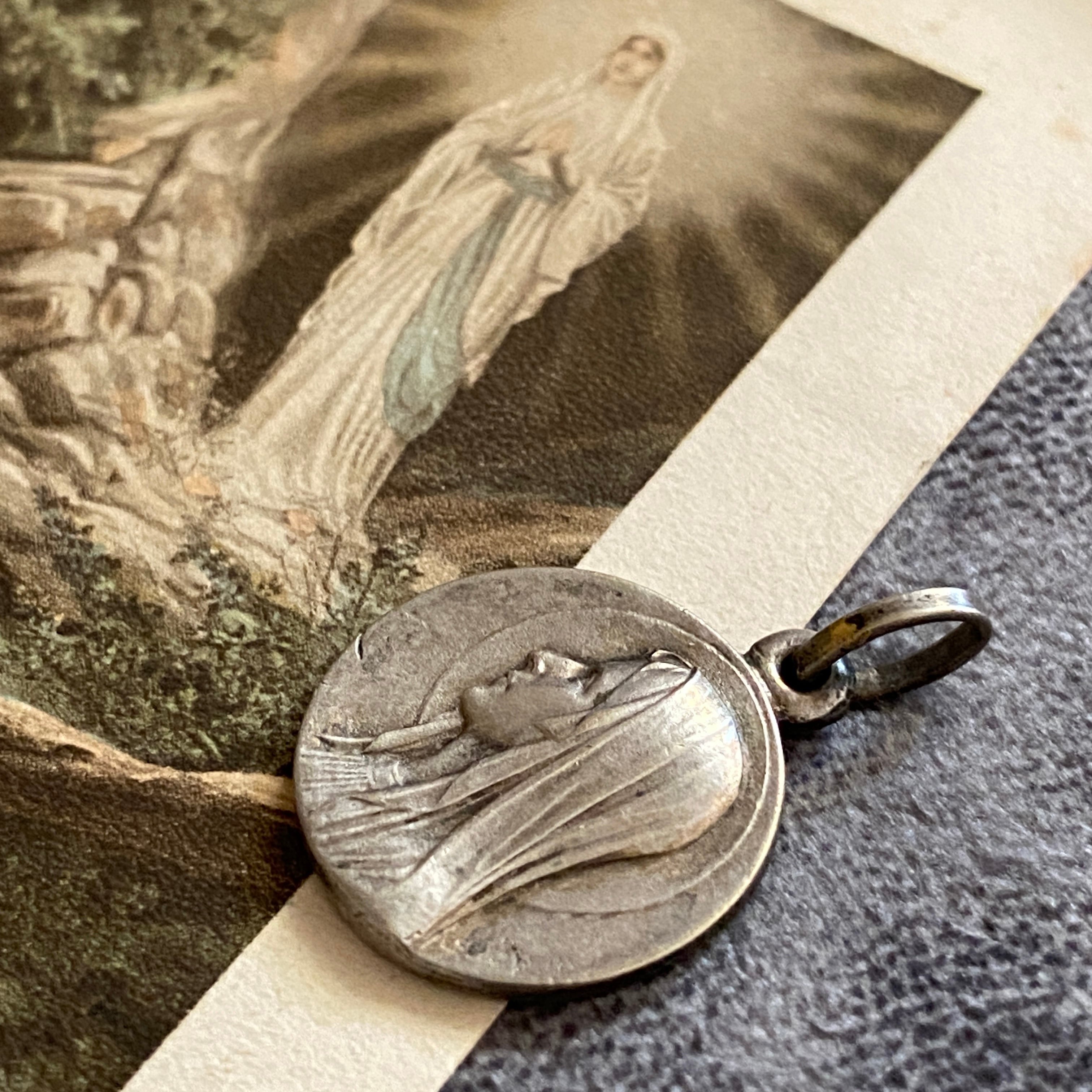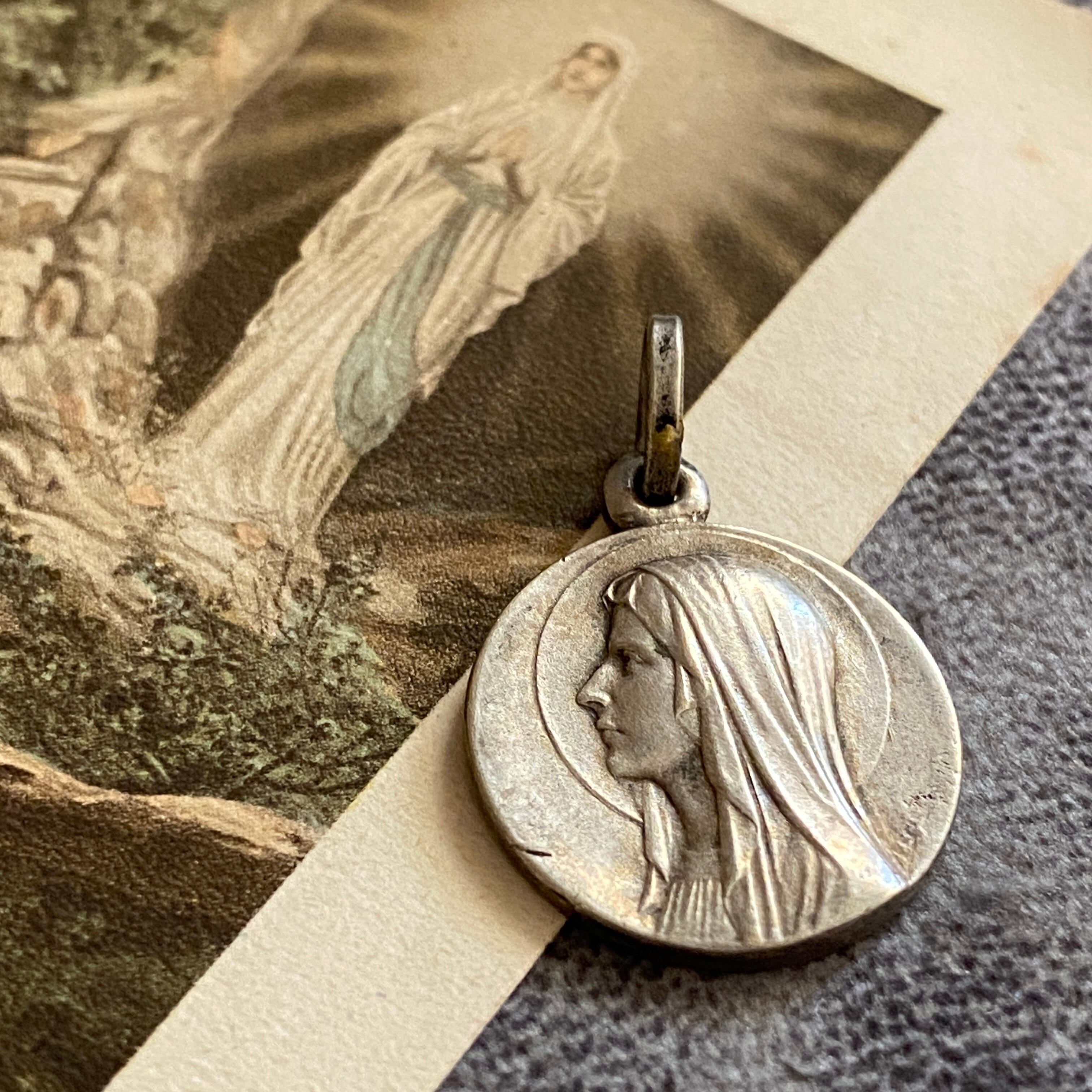 聖母の横顔が静かに浮かぶ、美しいルルドのメダイ。