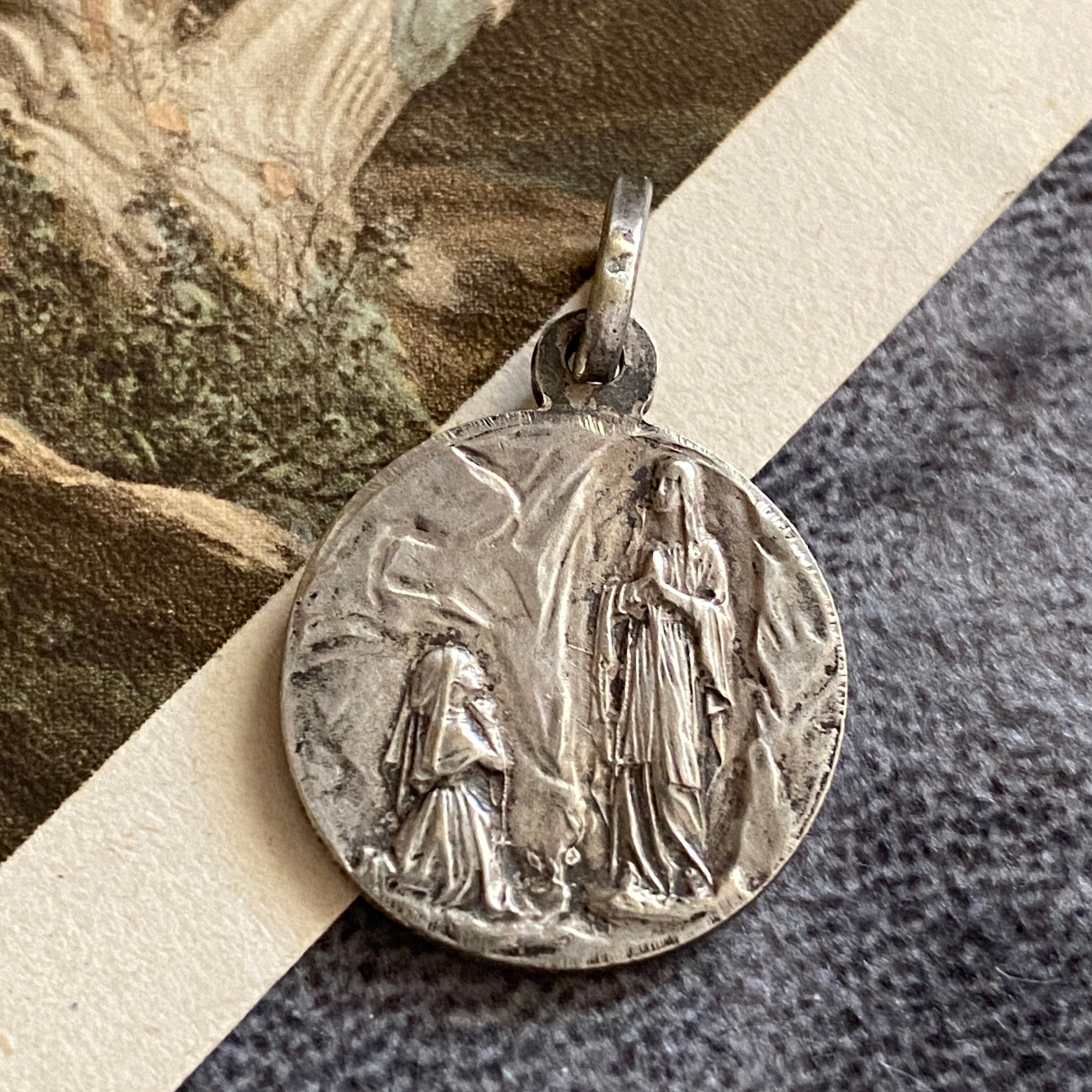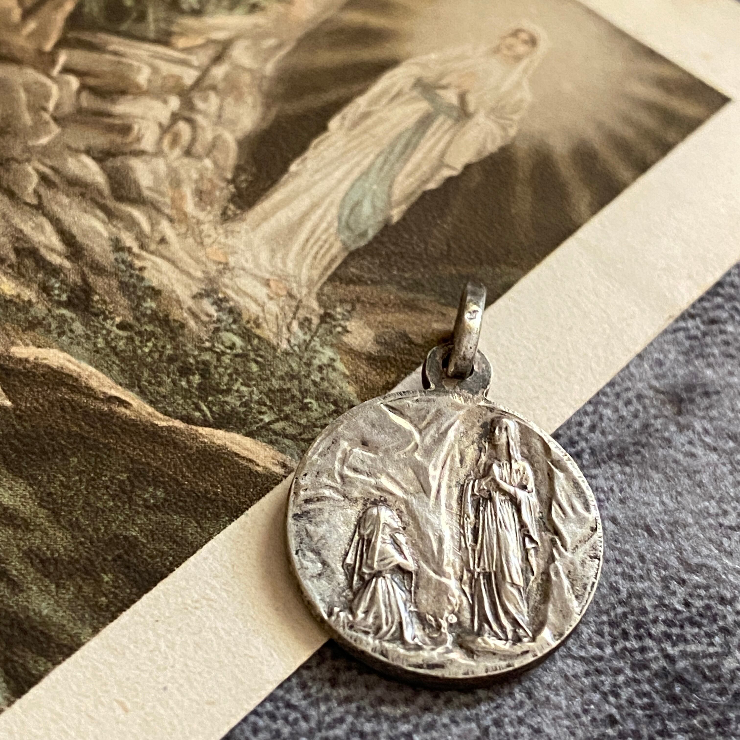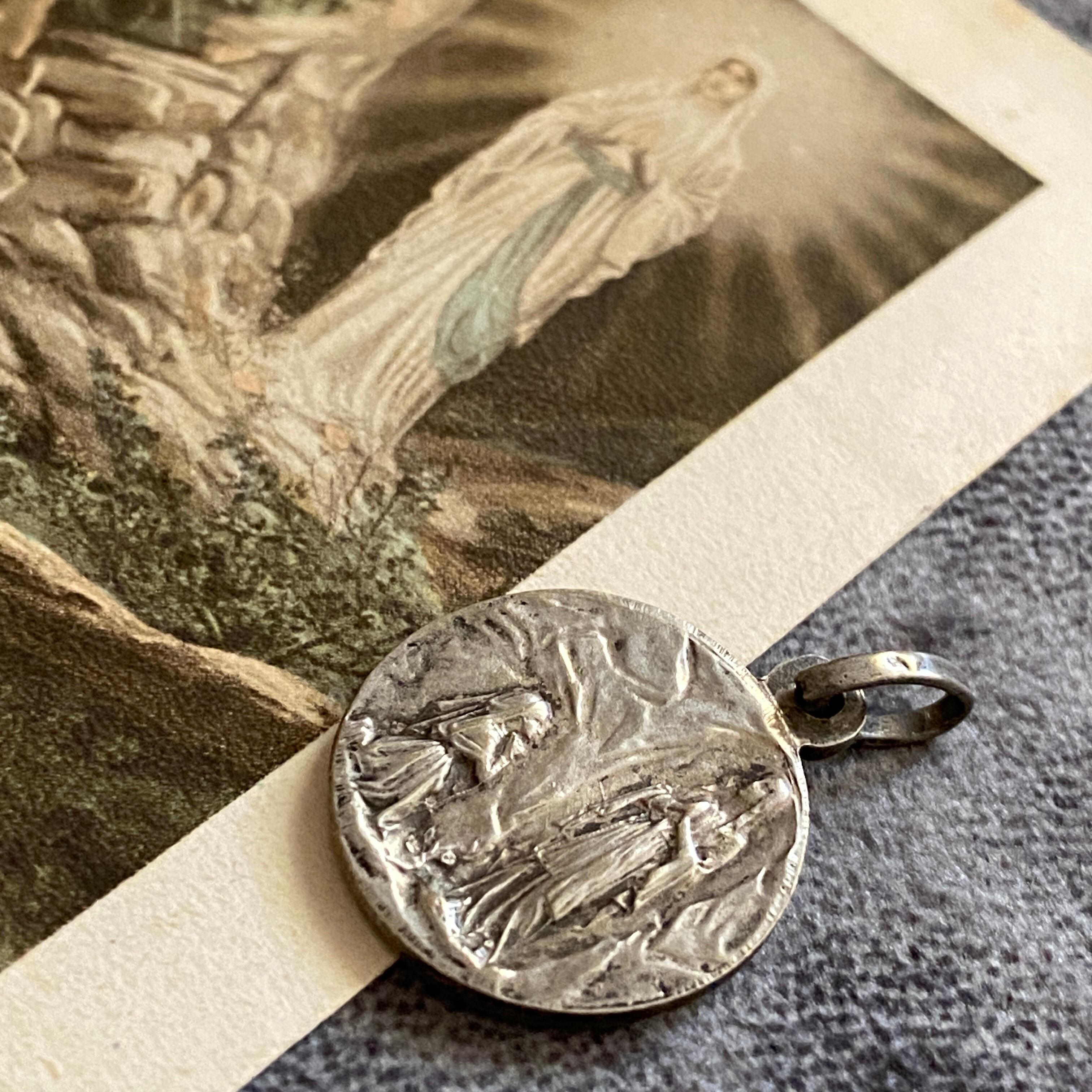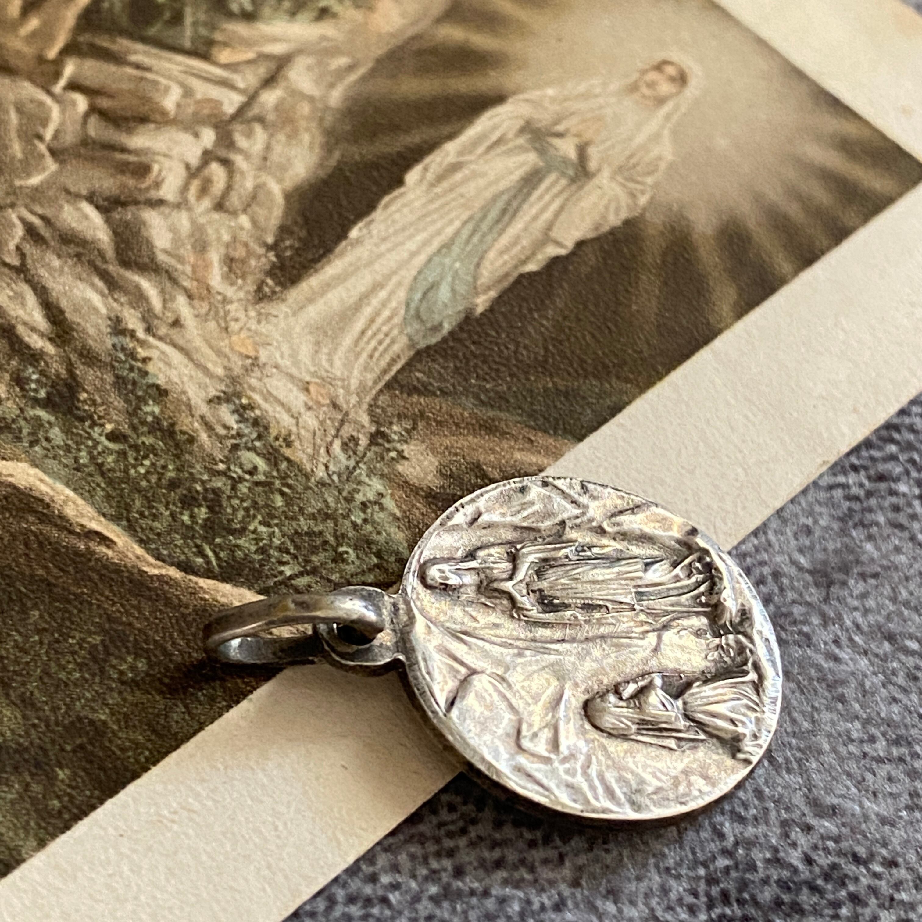 聖母の横顔が静かに浮かぶ、美しいルルドのメダイ。