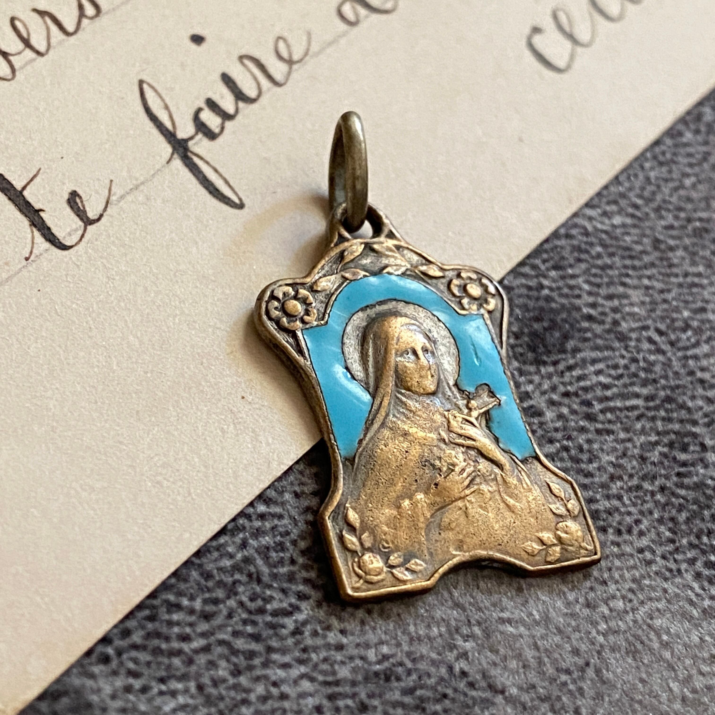 淡い水色エナメルが美しい、聖テレジアの列聖式記念メダイ。