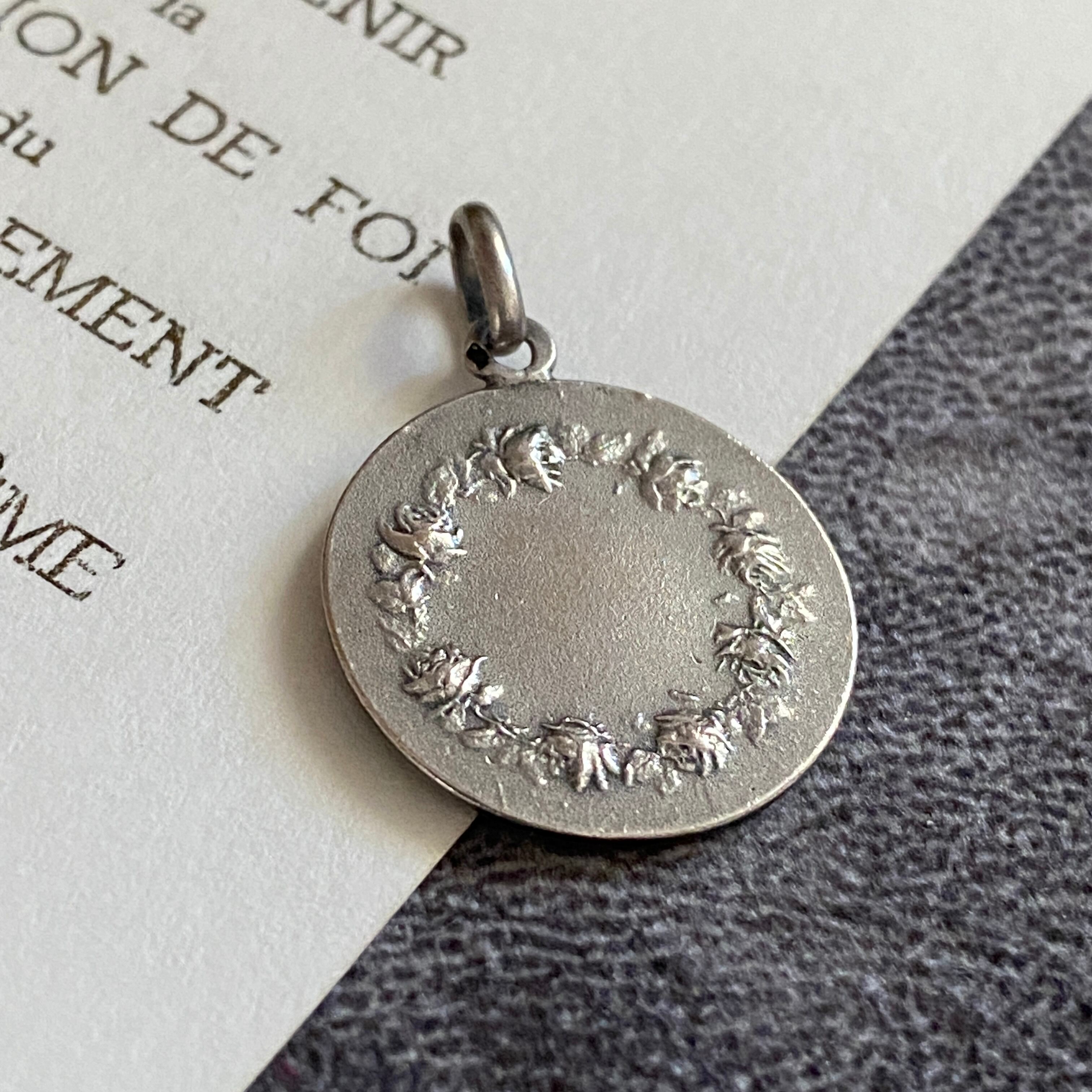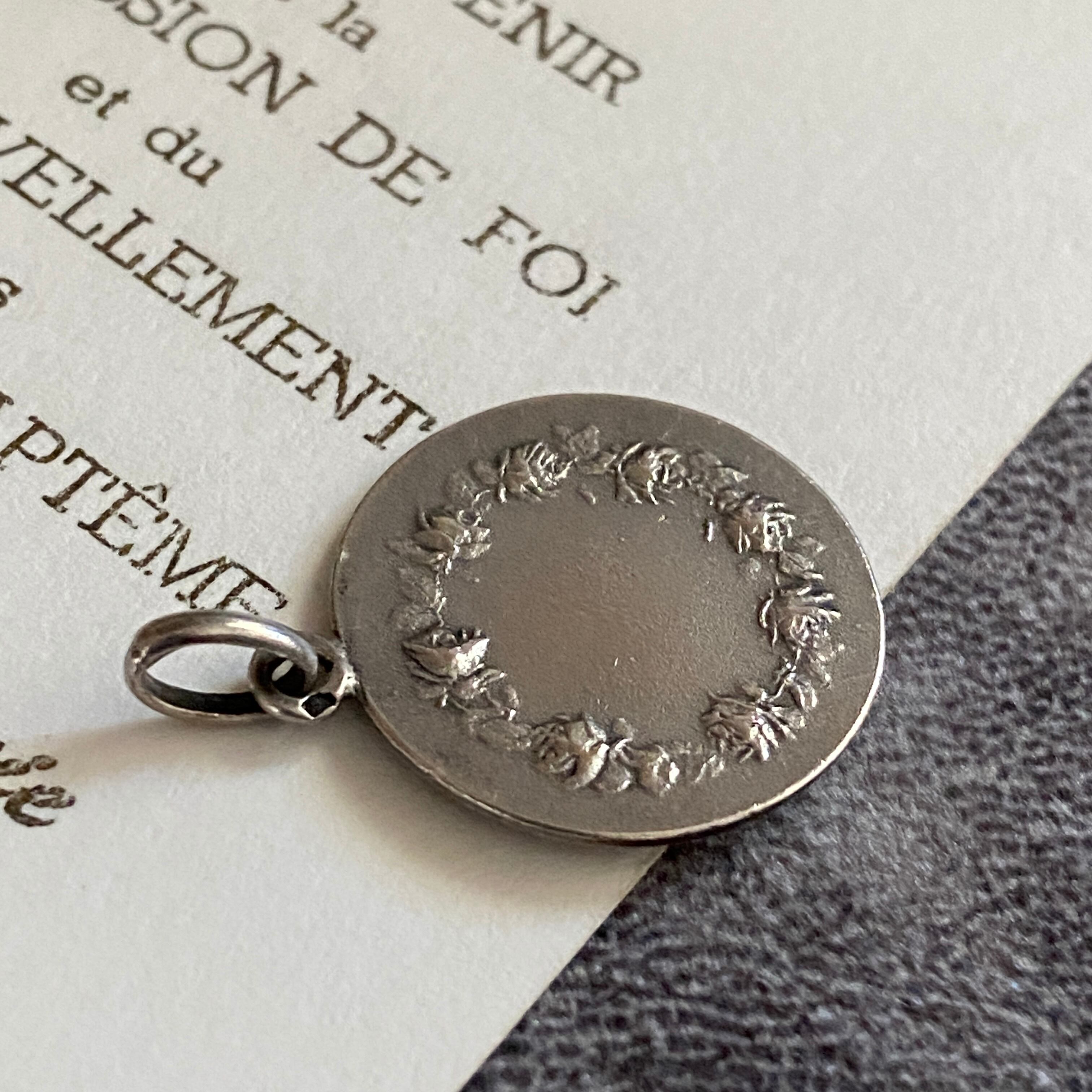 表面には薔薇と十字架を抱くテレジアが凛として刻まれ、背面には薔薇の花冠が繊細に浮かび上がるデザイン。