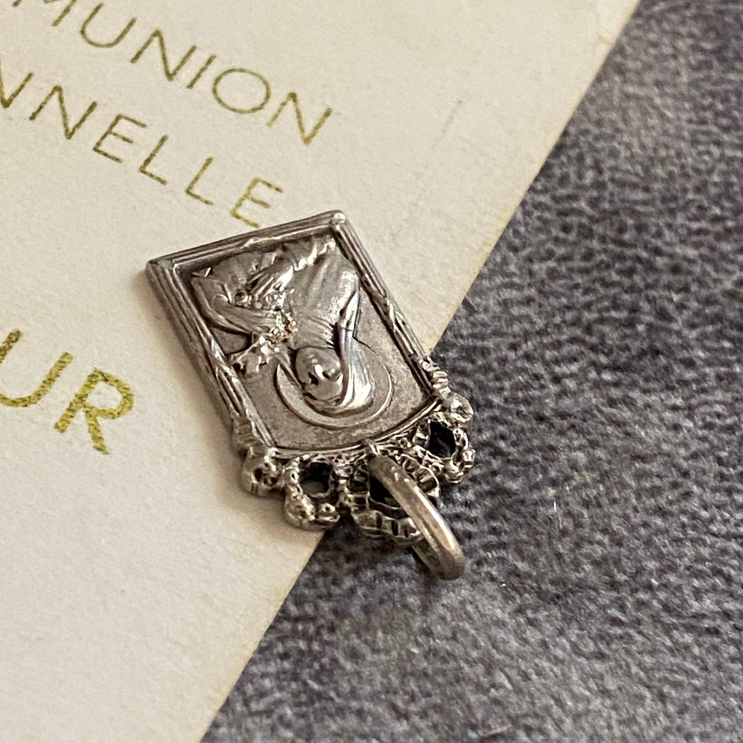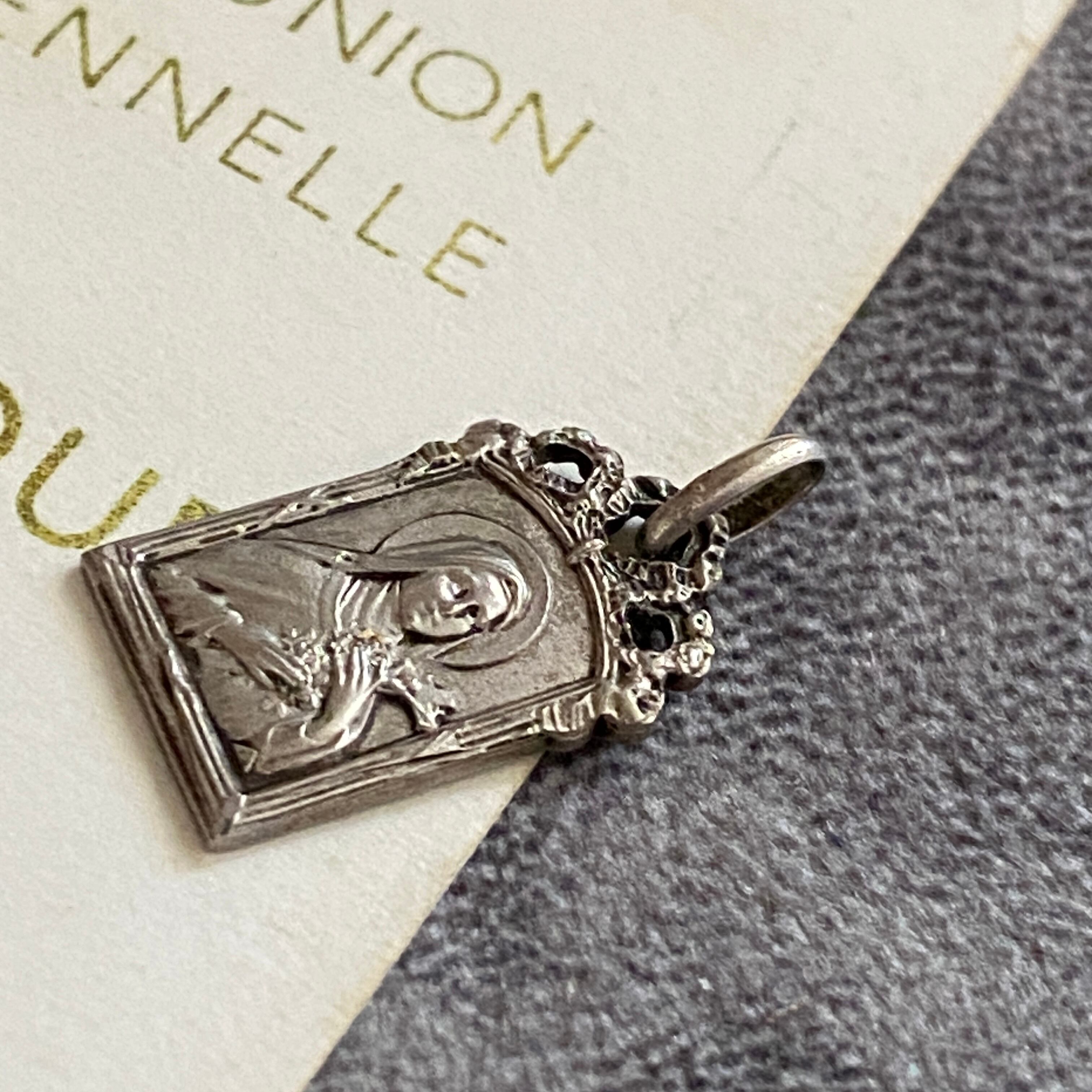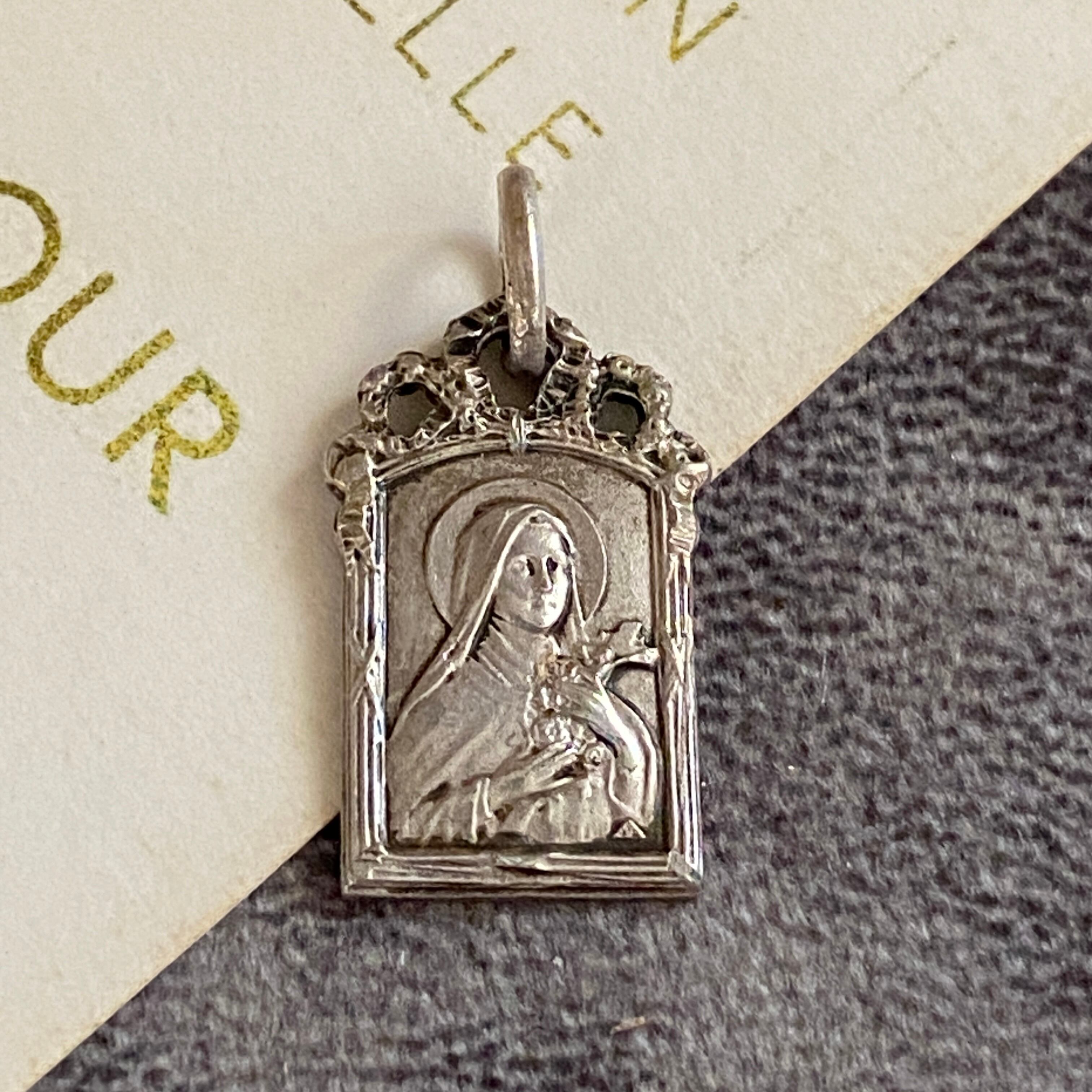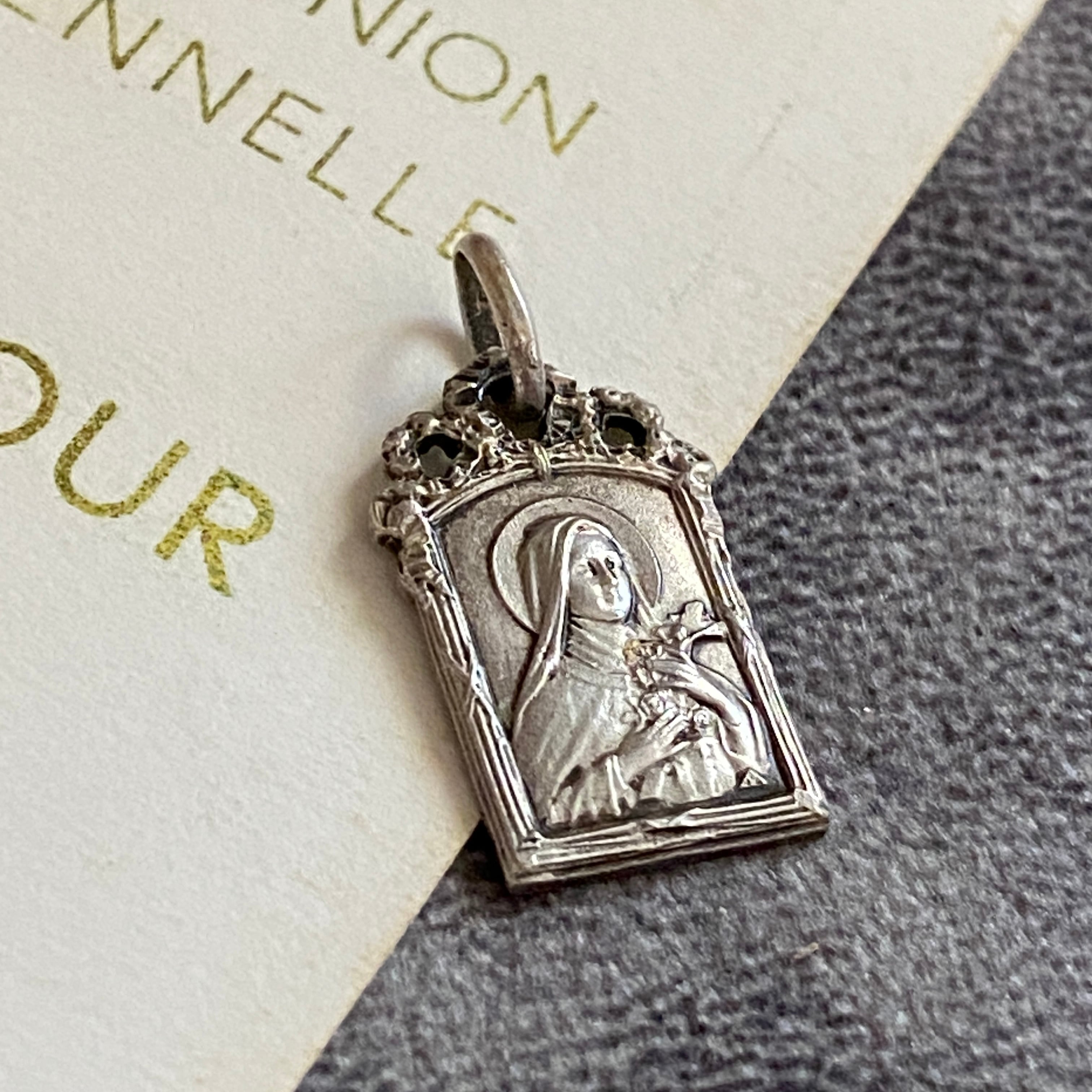 柔らかな面差しのテレジアが、十字架と薔薇を胸に抱く姿で刻まれたアンティークメダイ。