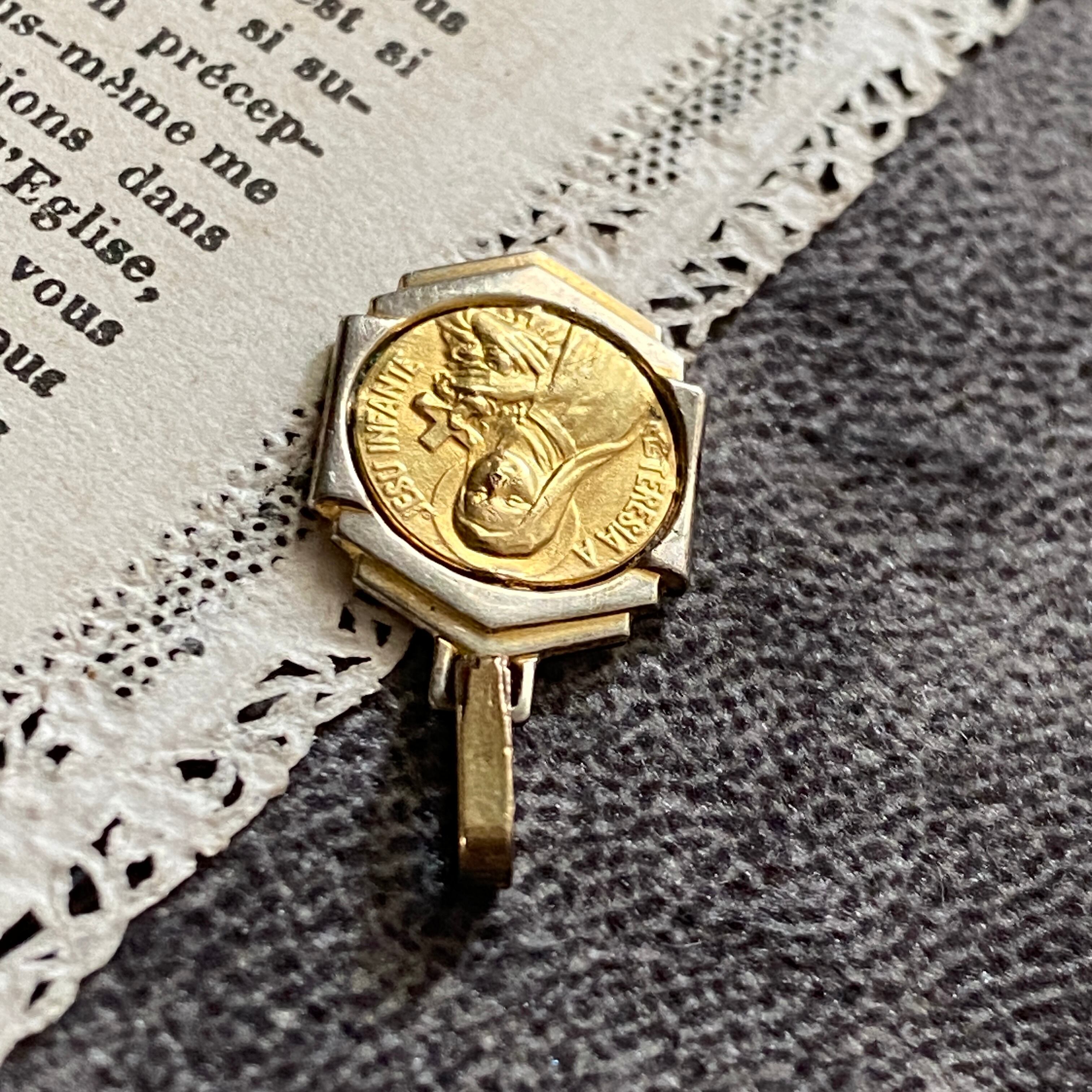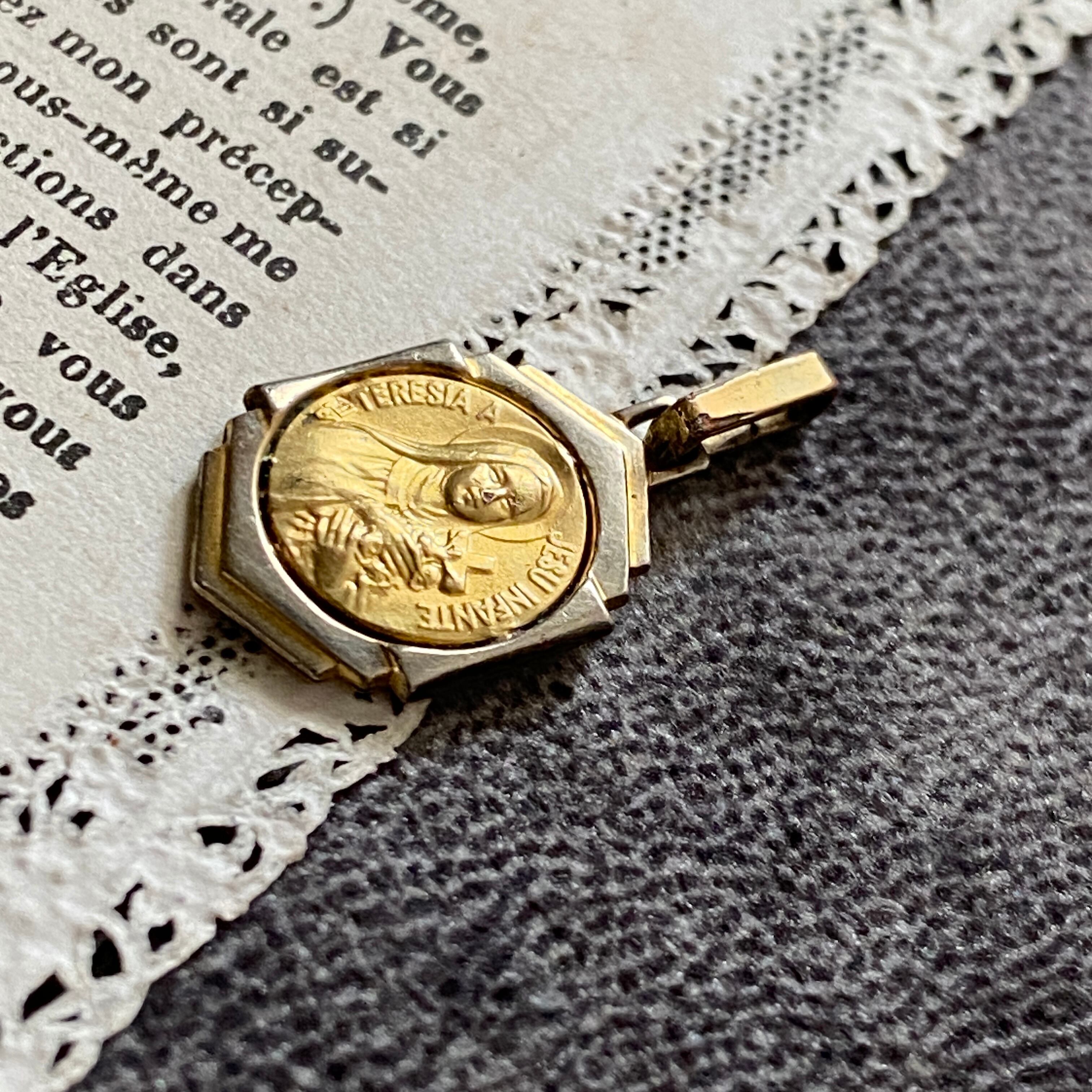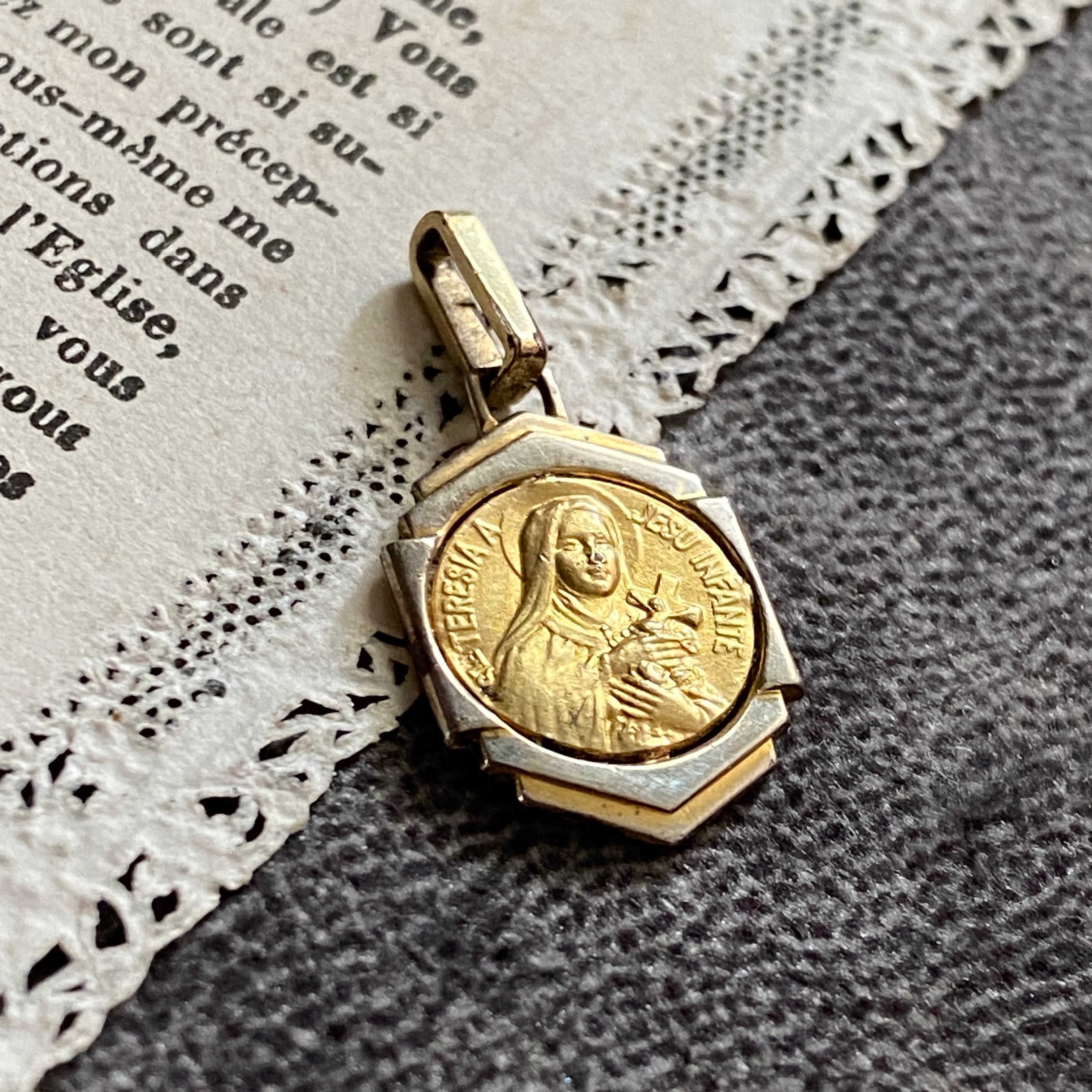立体的な造形と、二重のフレームデザインが印象的な聖テレジアのメダイ。