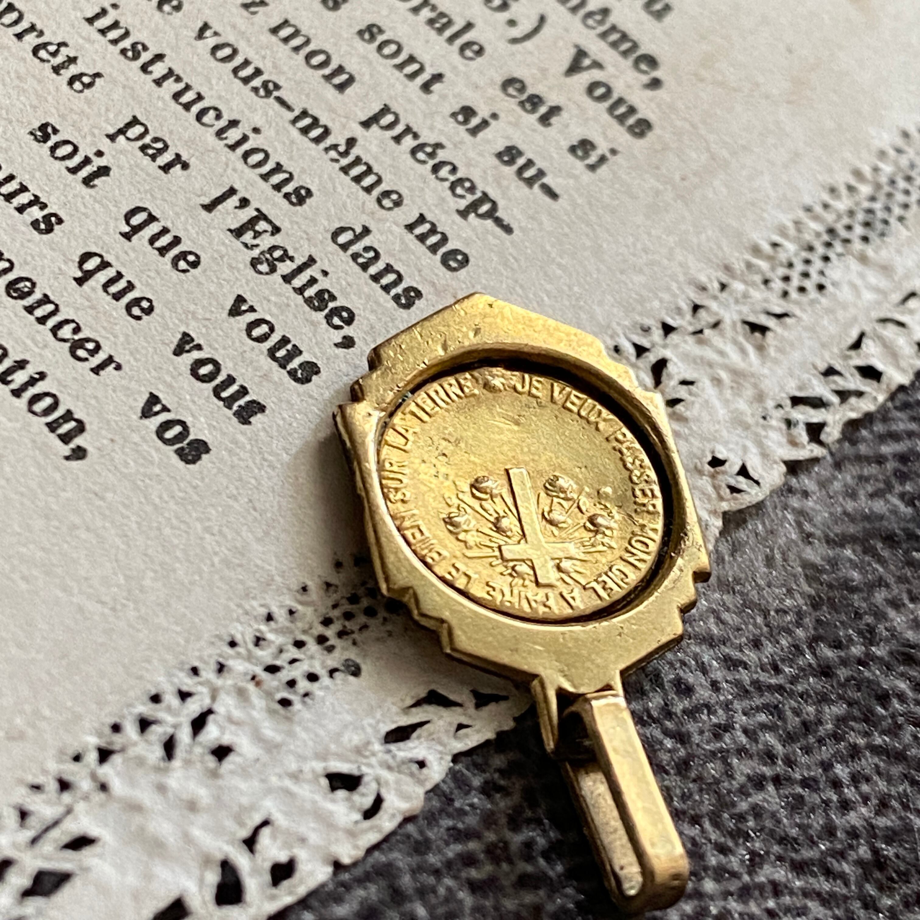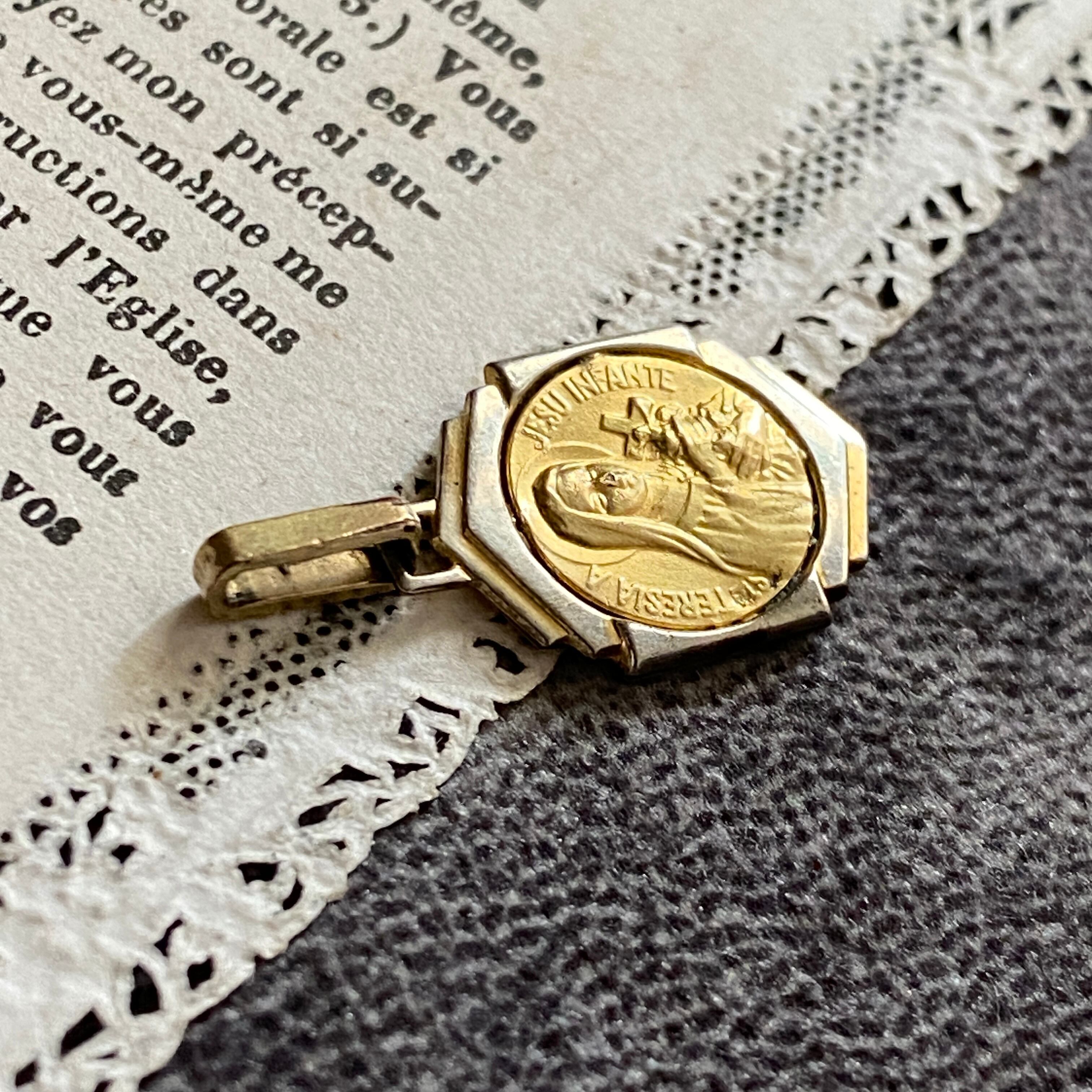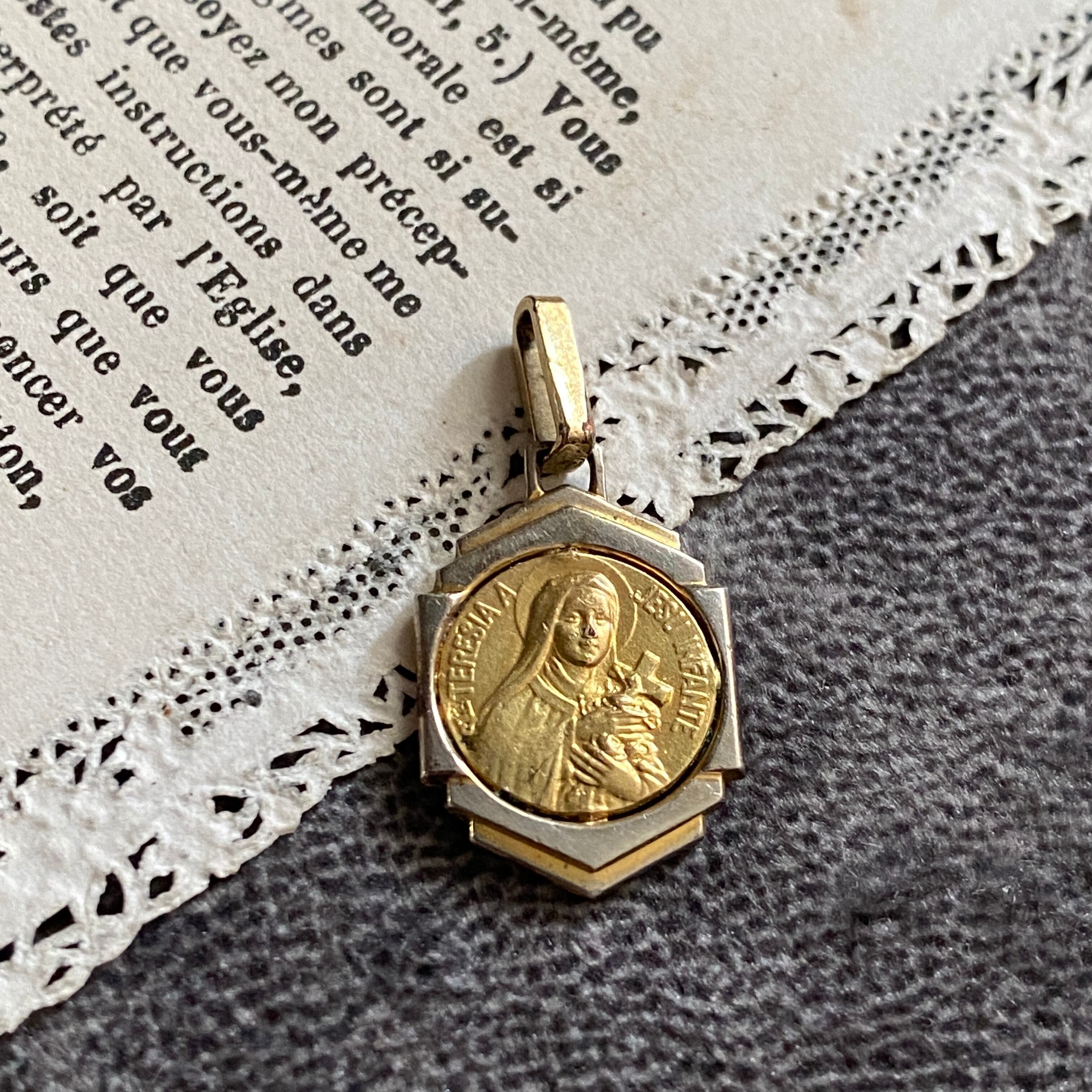 立体的な造形と、二重のフレームデザインが印象的な聖テレジアのメダイ。