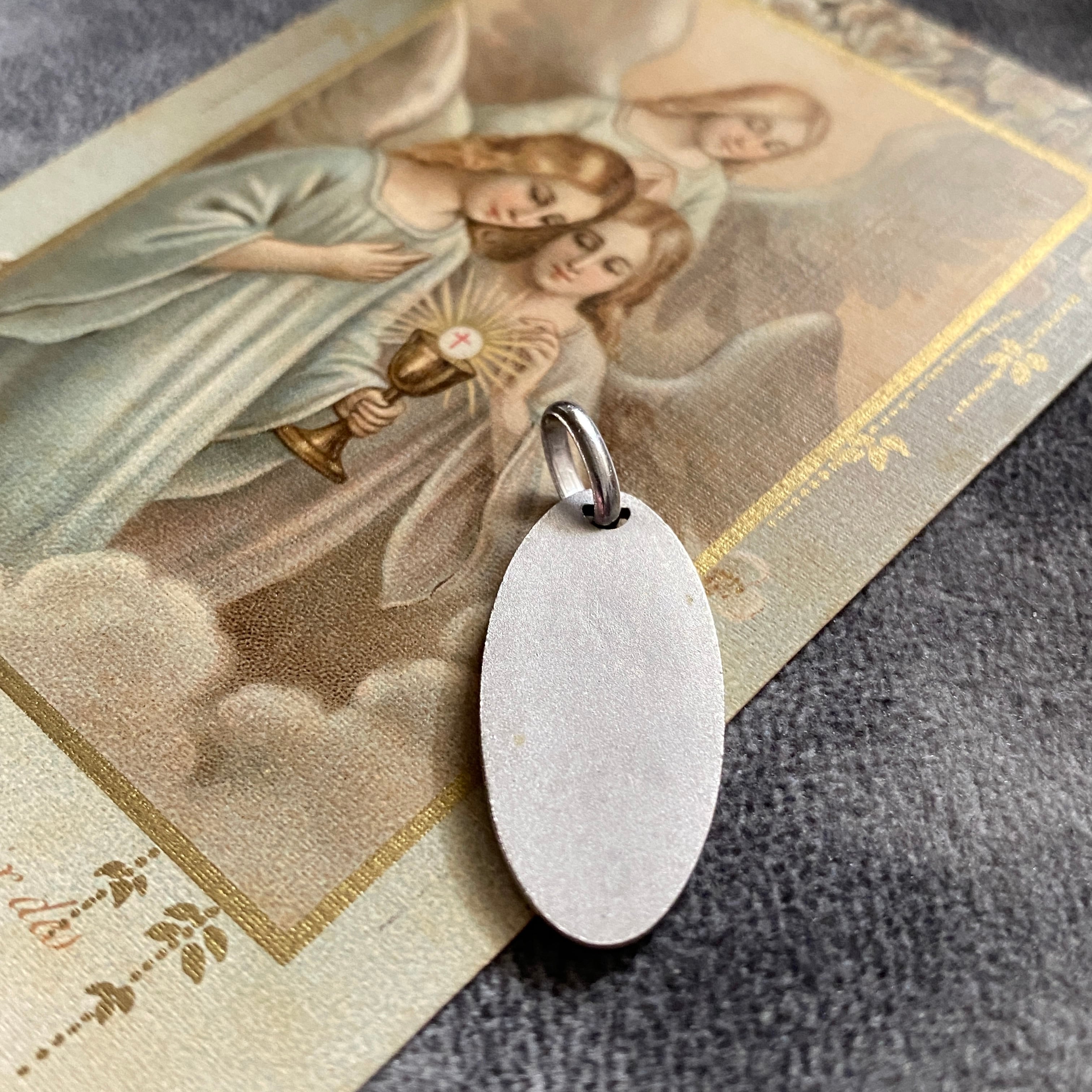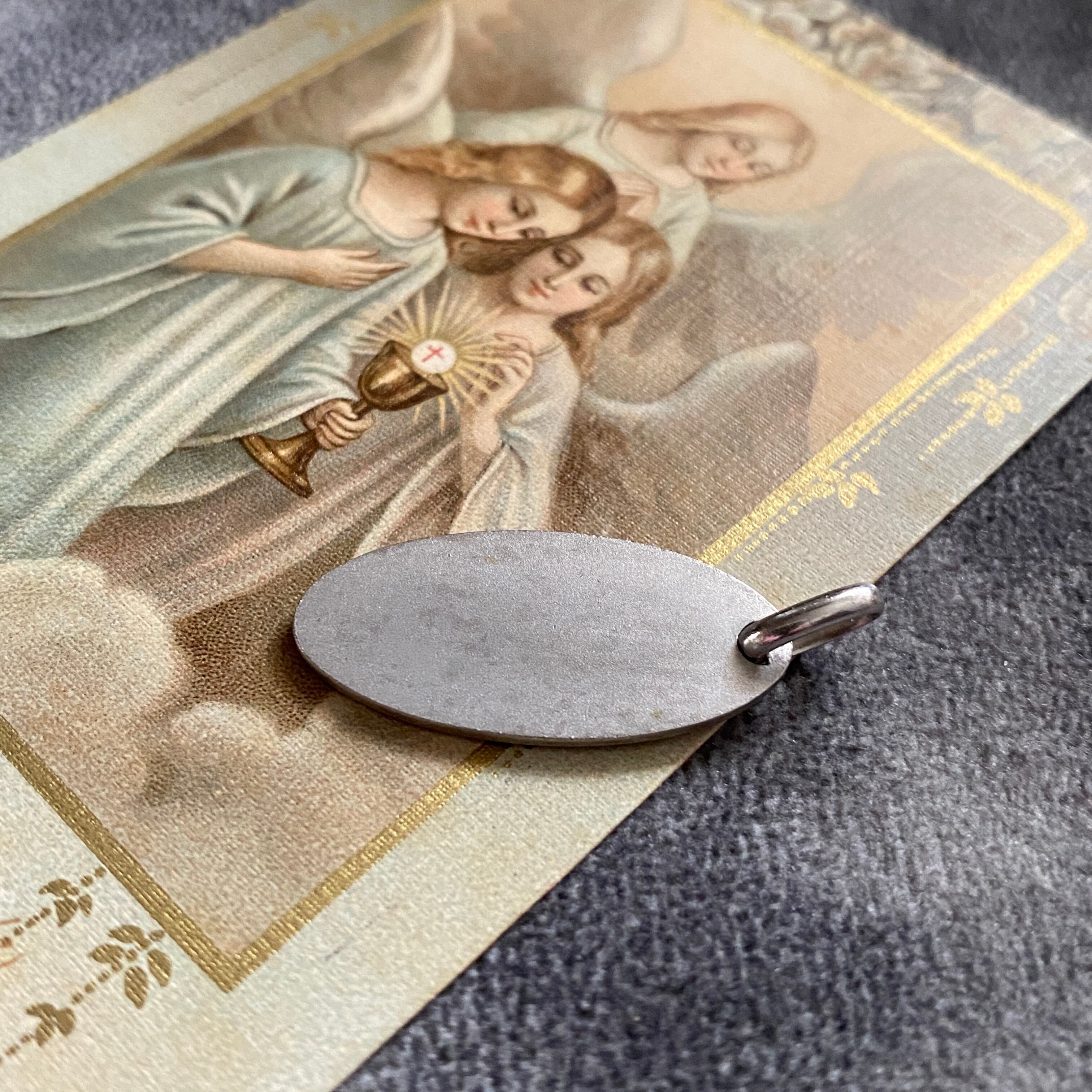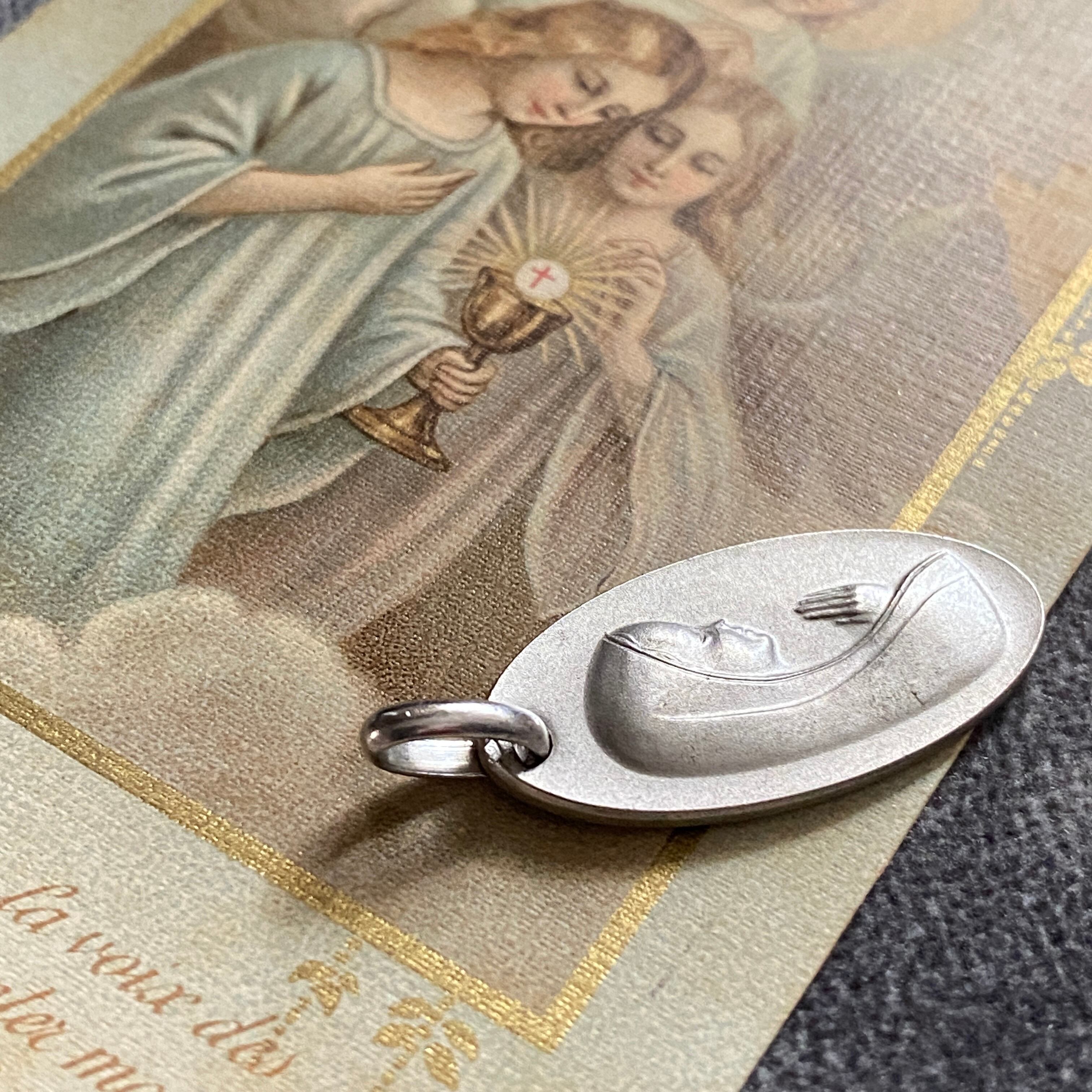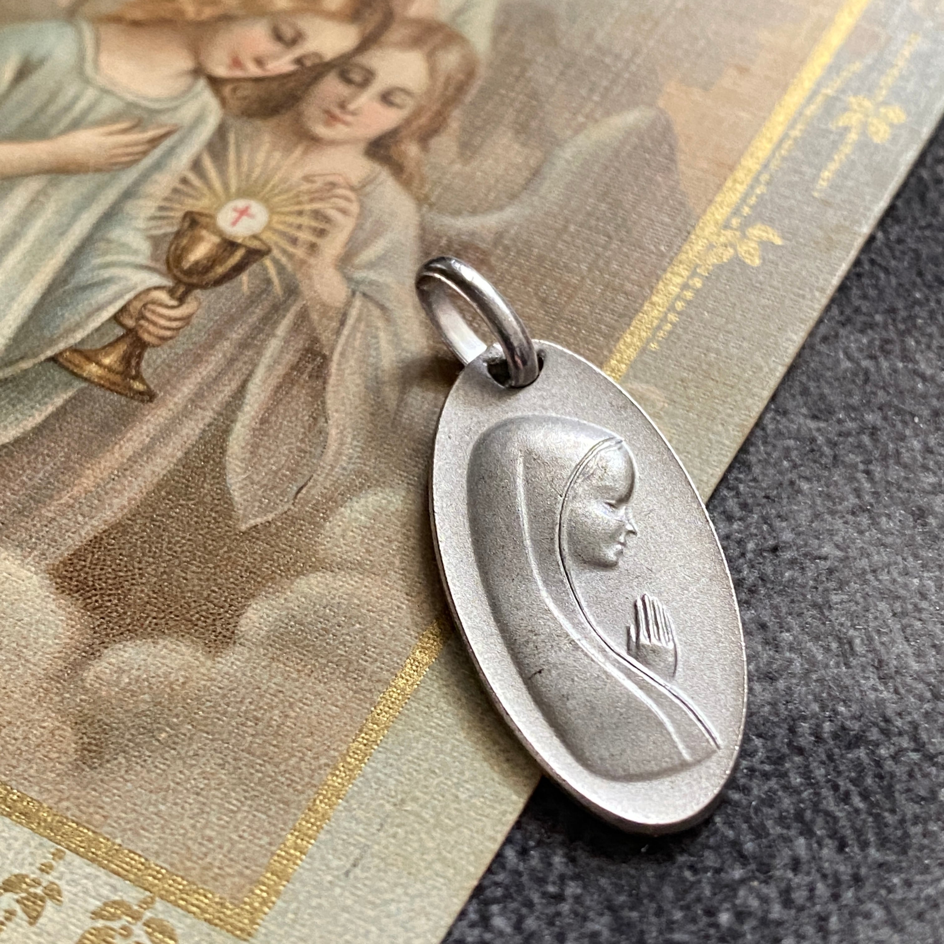 穏やかな微笑みをたたえ、祈るように手を合わせた横顔のマリアが描かれた、1970年代頃のヴィンテージメダイ。