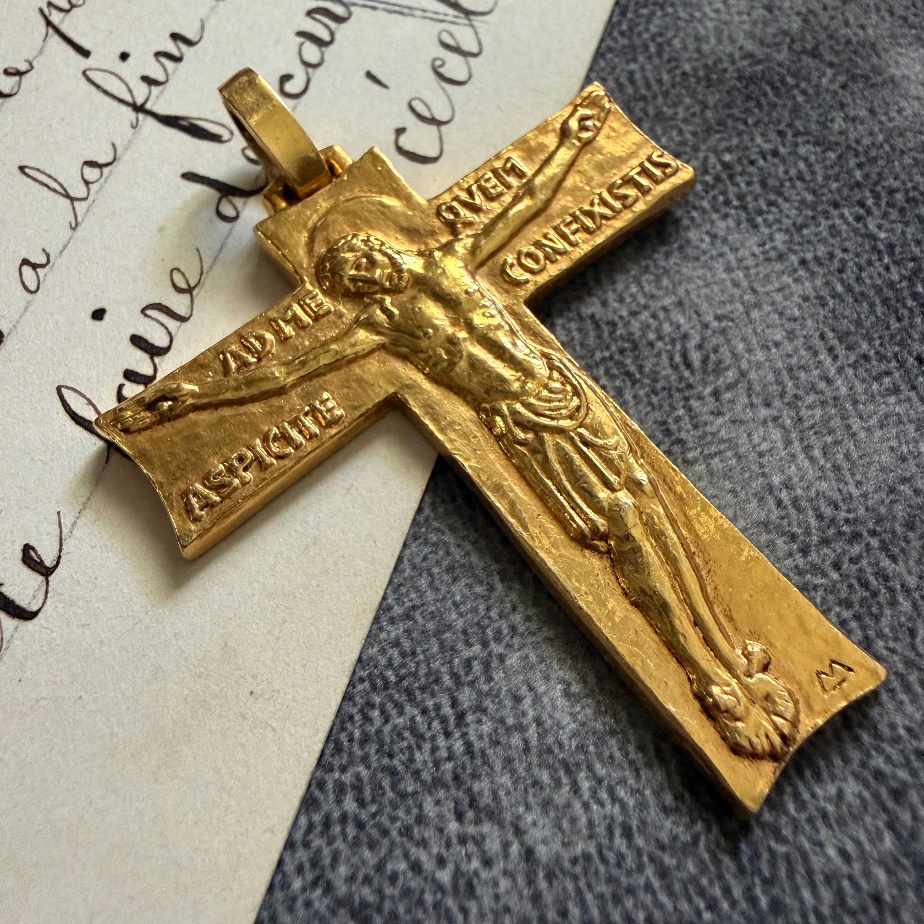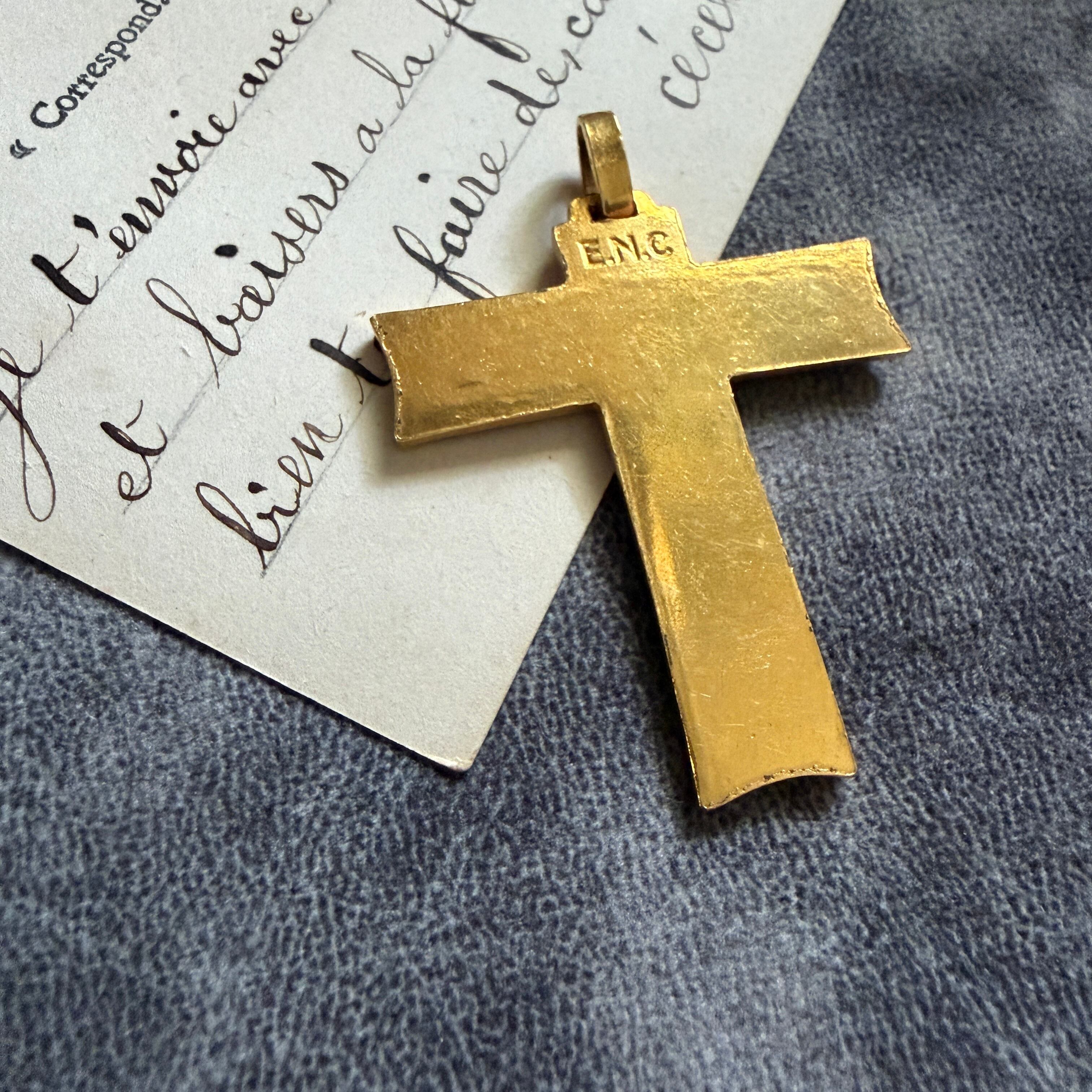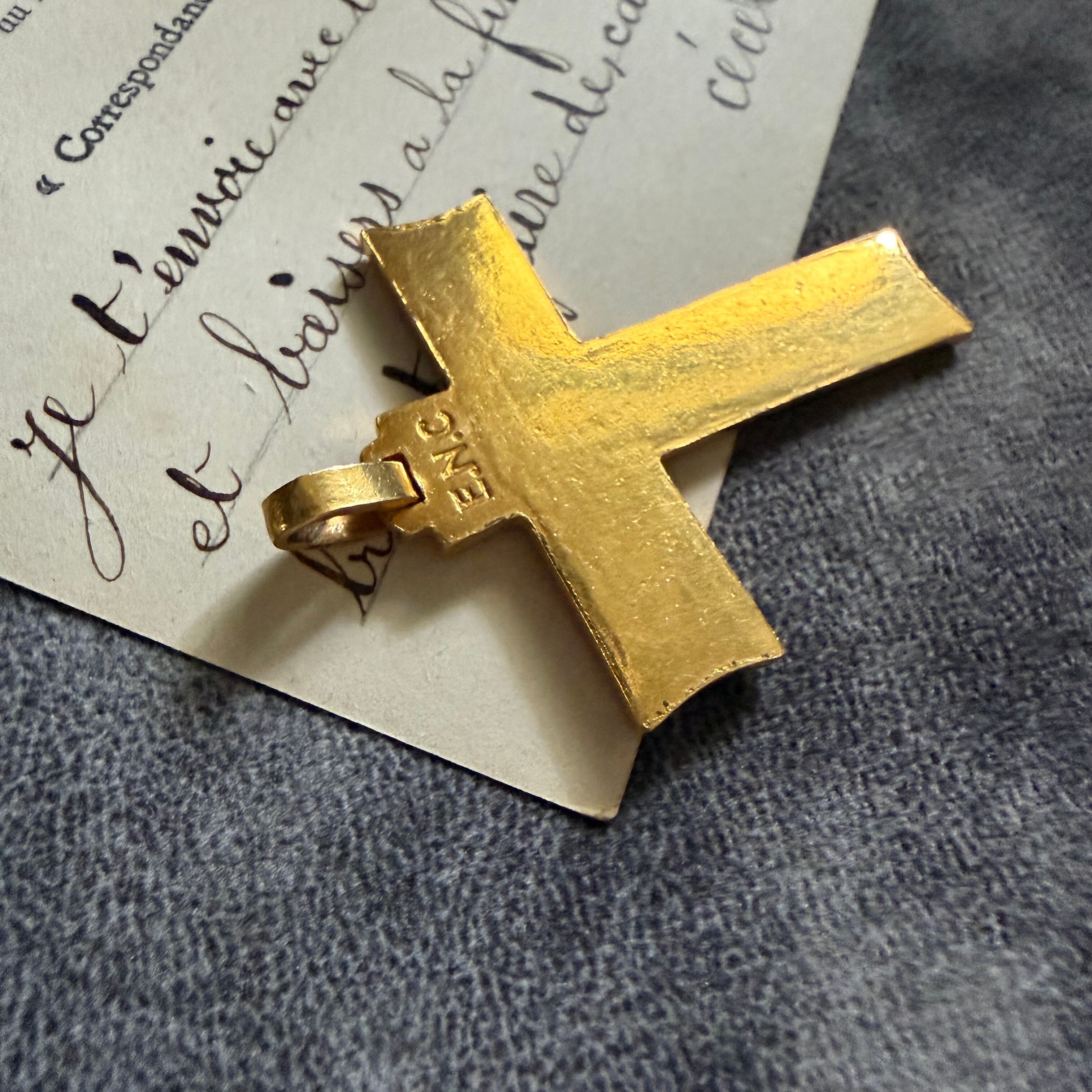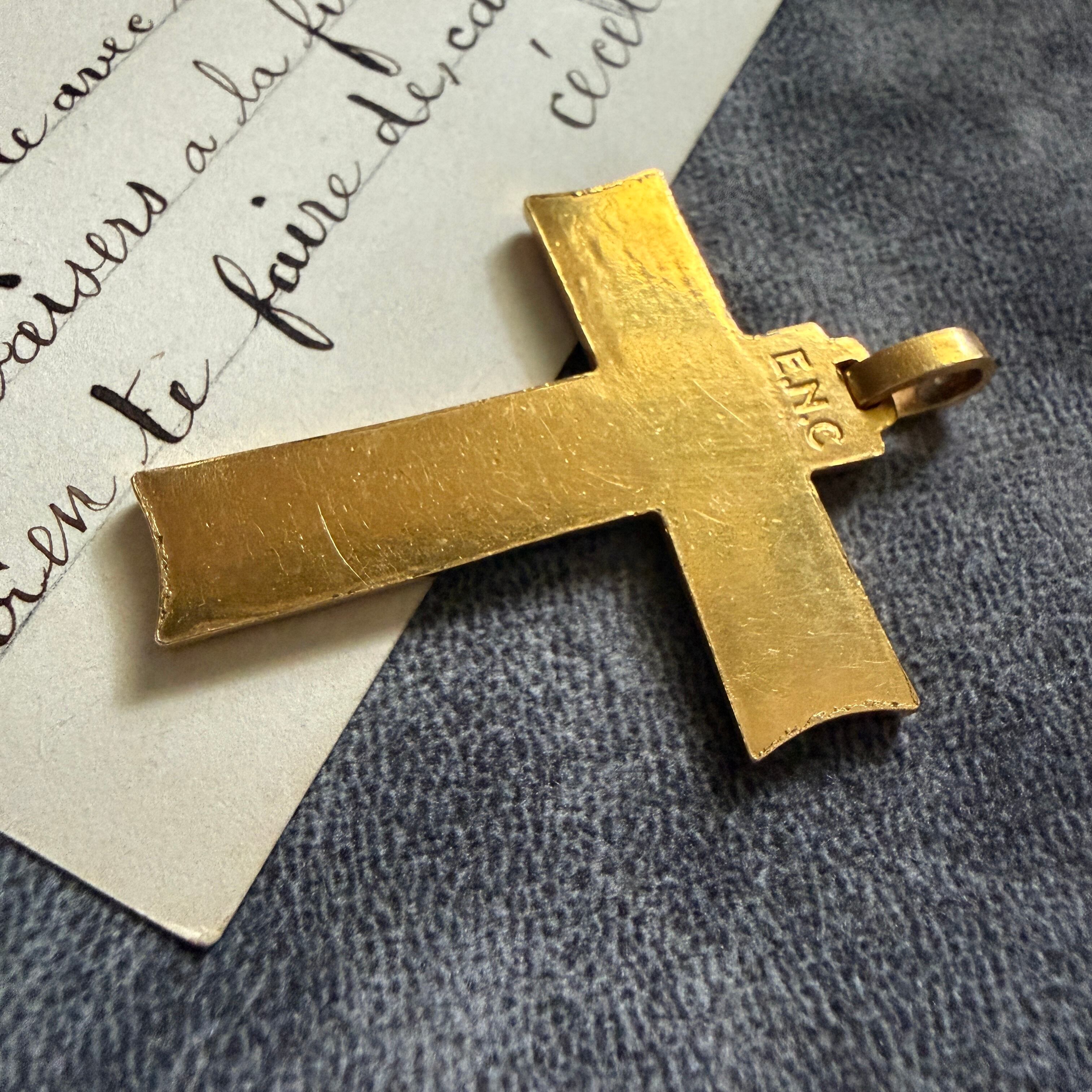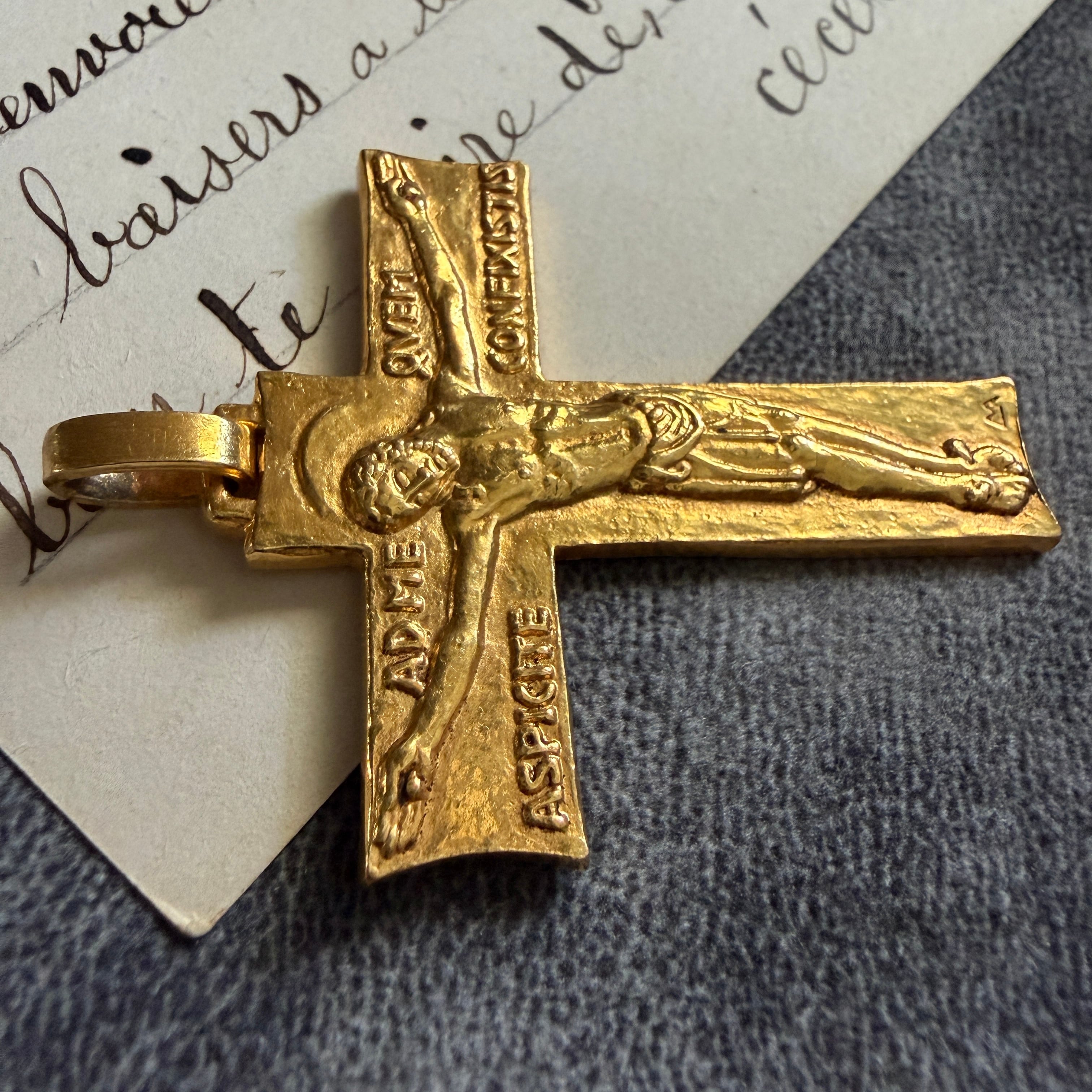 深く刻まれた磔刑のキリストが存在感を持つクロス。