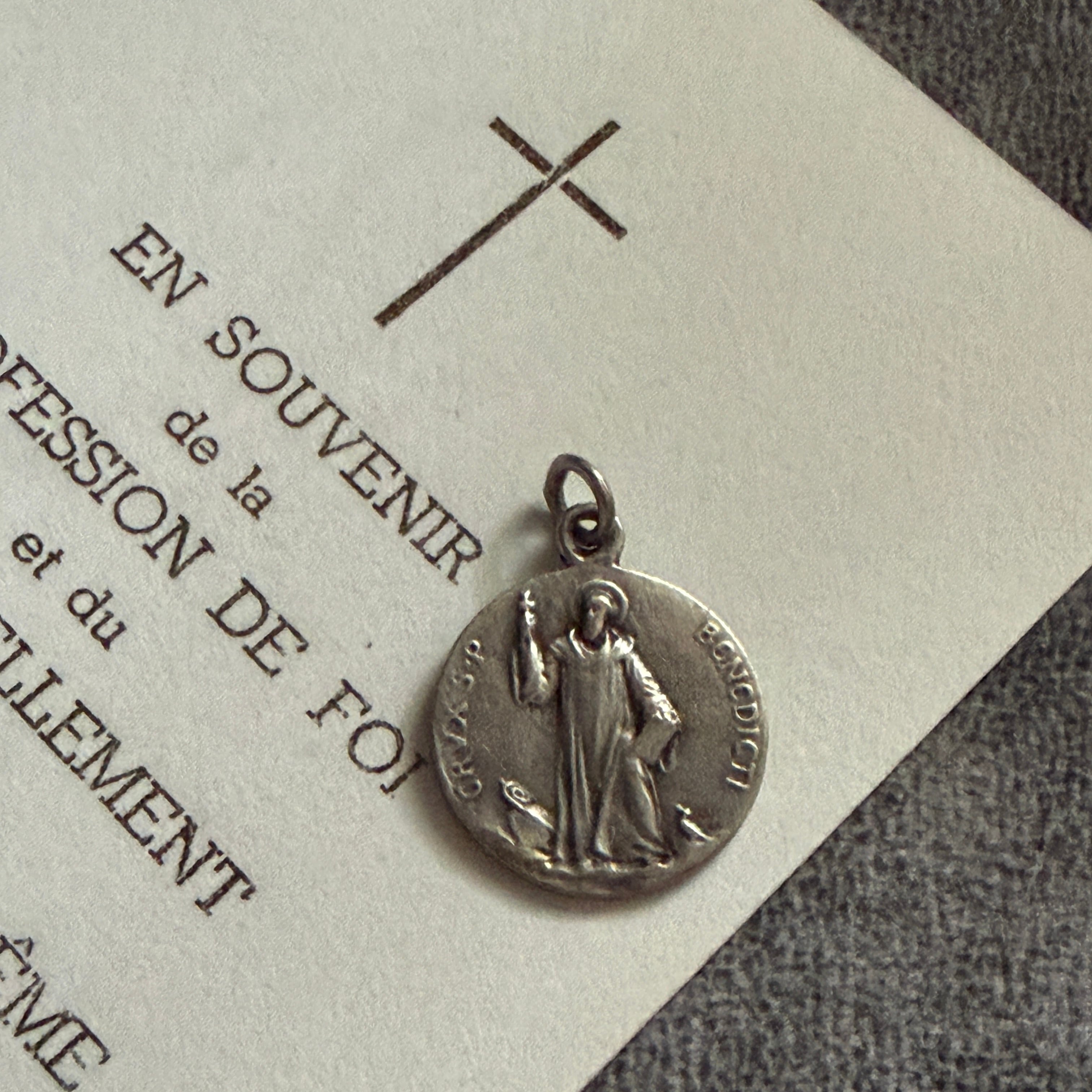 一般的なベネディクトのメダイに見られるデザインとは違い、こちらは聖人そのものの姿が丁寧に表現された、やや珍しい意匠。