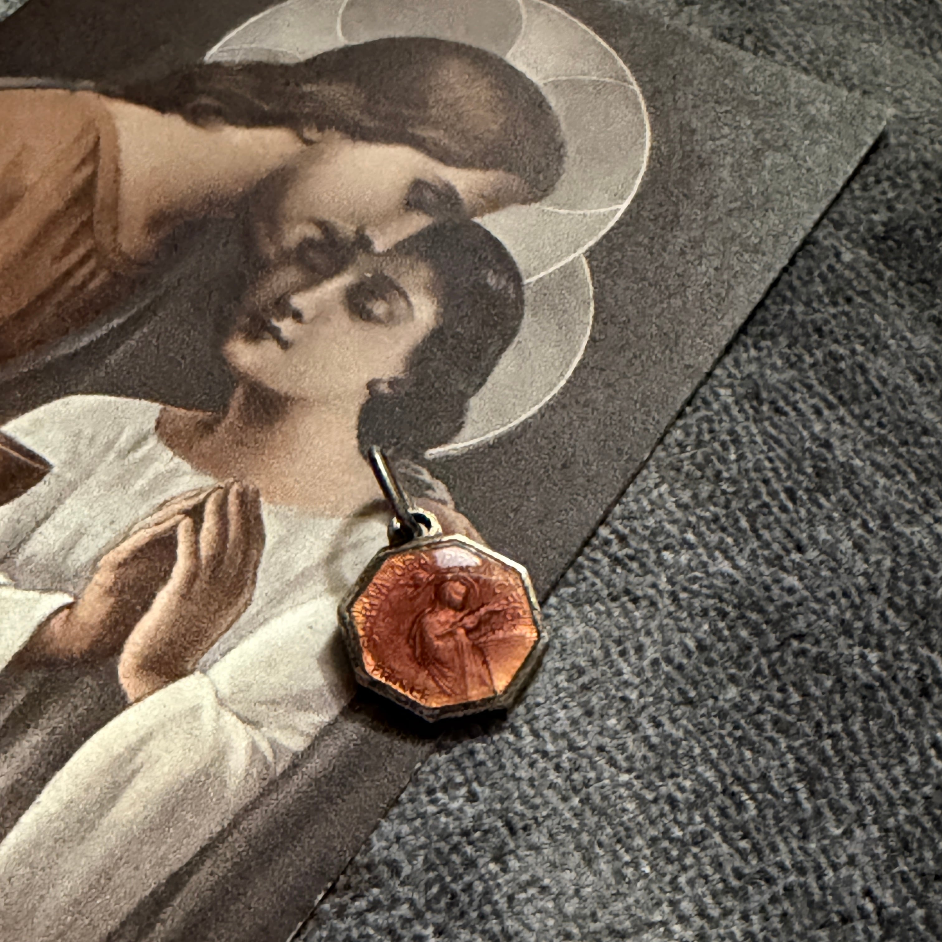 赤みのあるピンク色のエナメルがやわらかく光を受け、静かに存在を主張するメダイです。