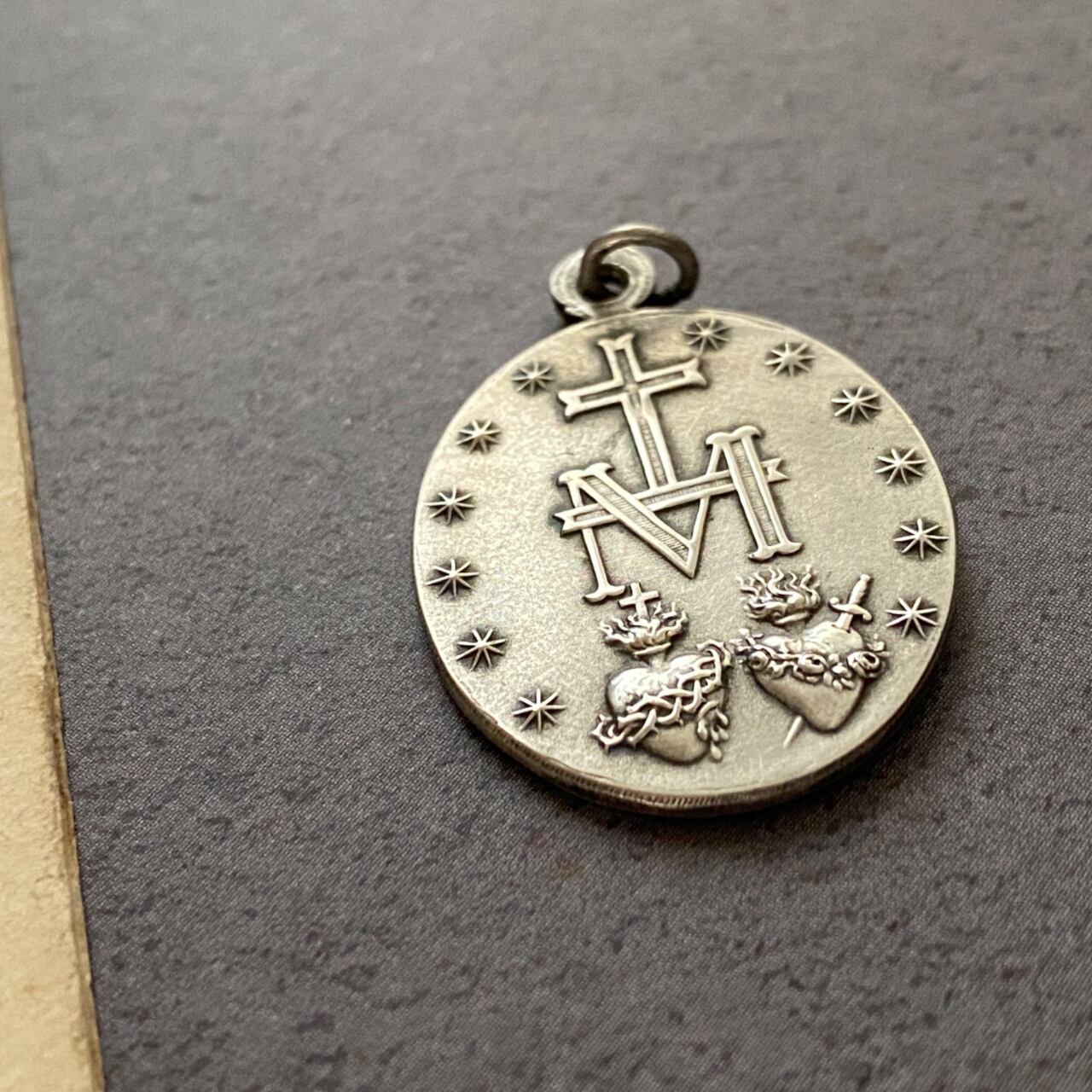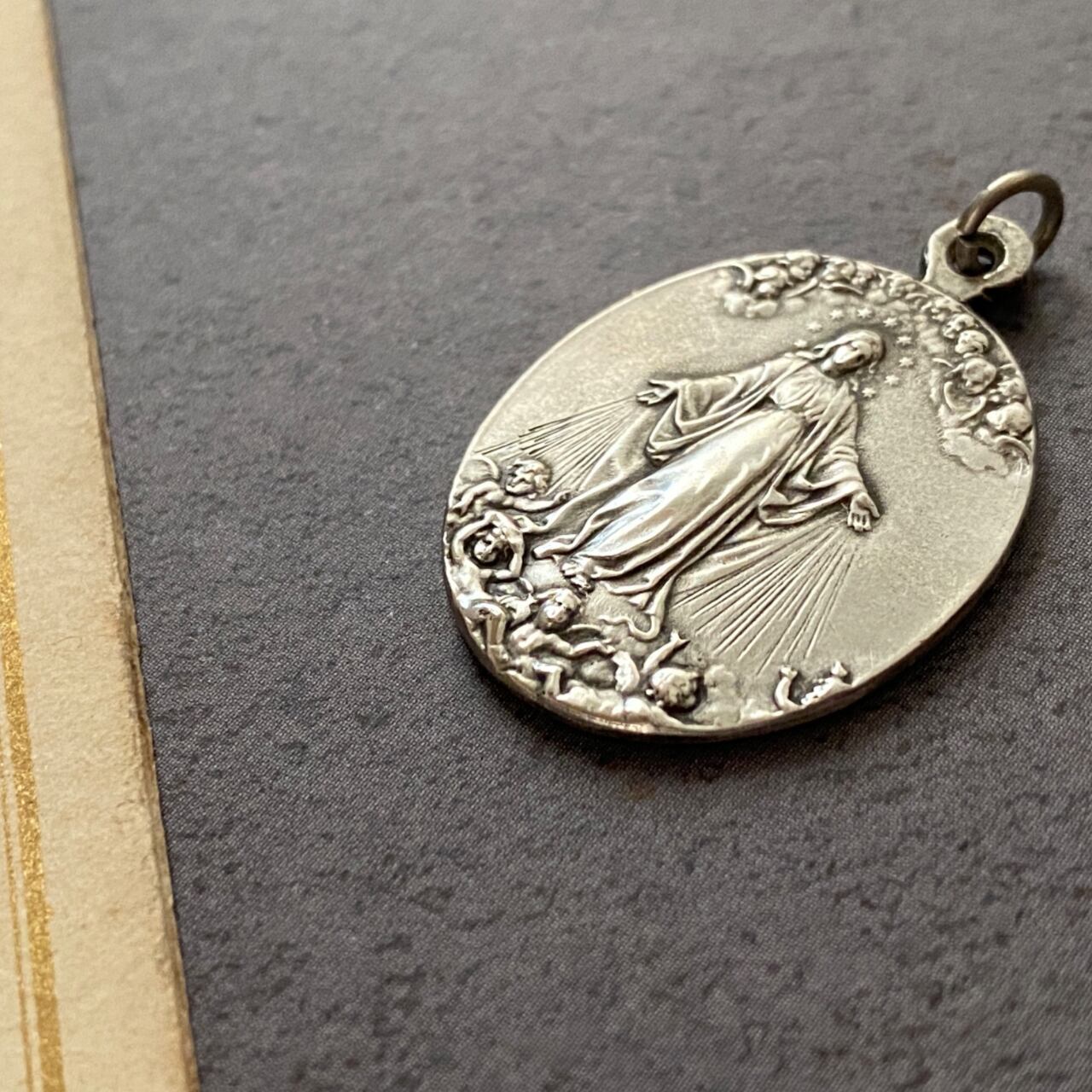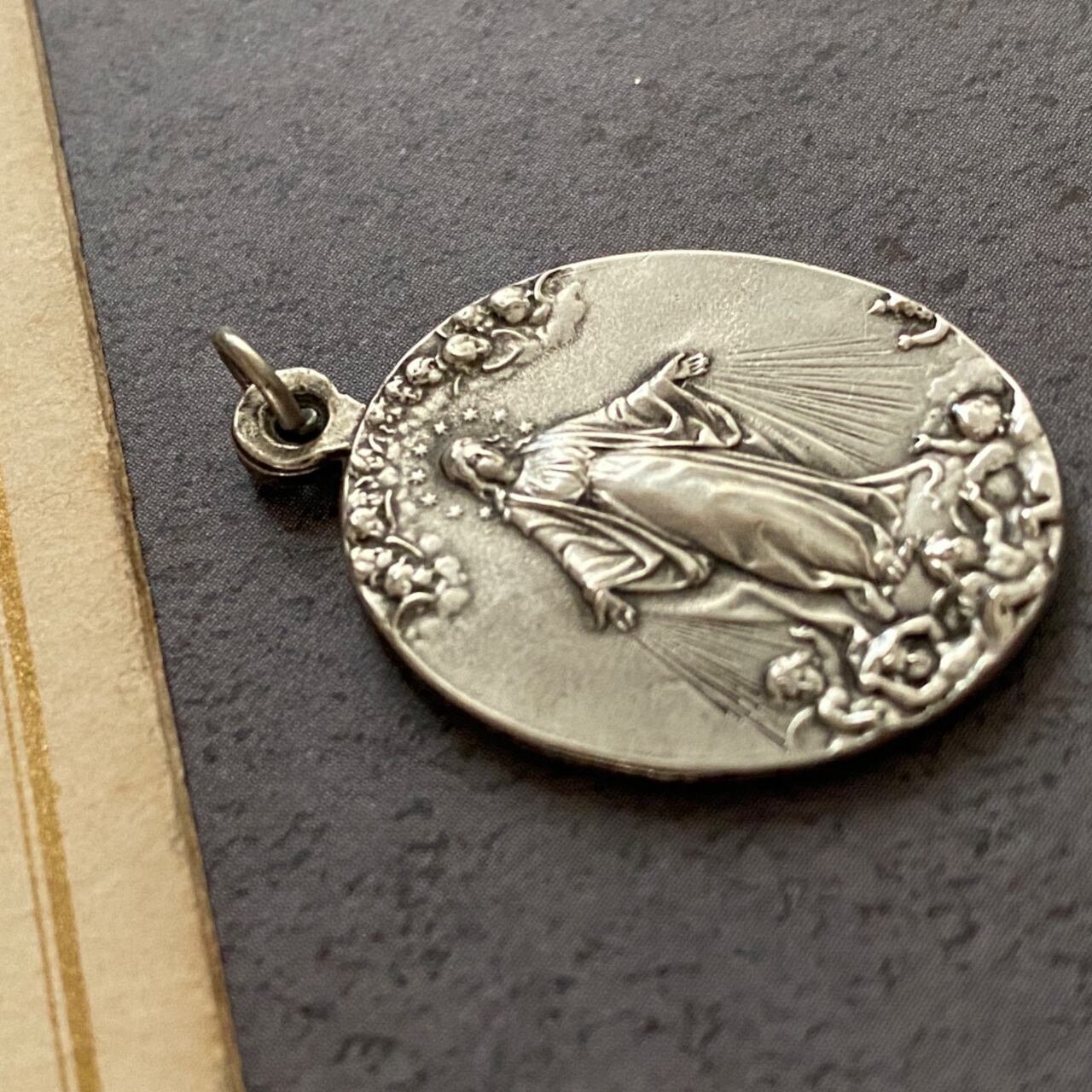 無数の天使たちに見守られて聖母マリアが祝福を降り注ぐ様子が大変美しいメダイです。