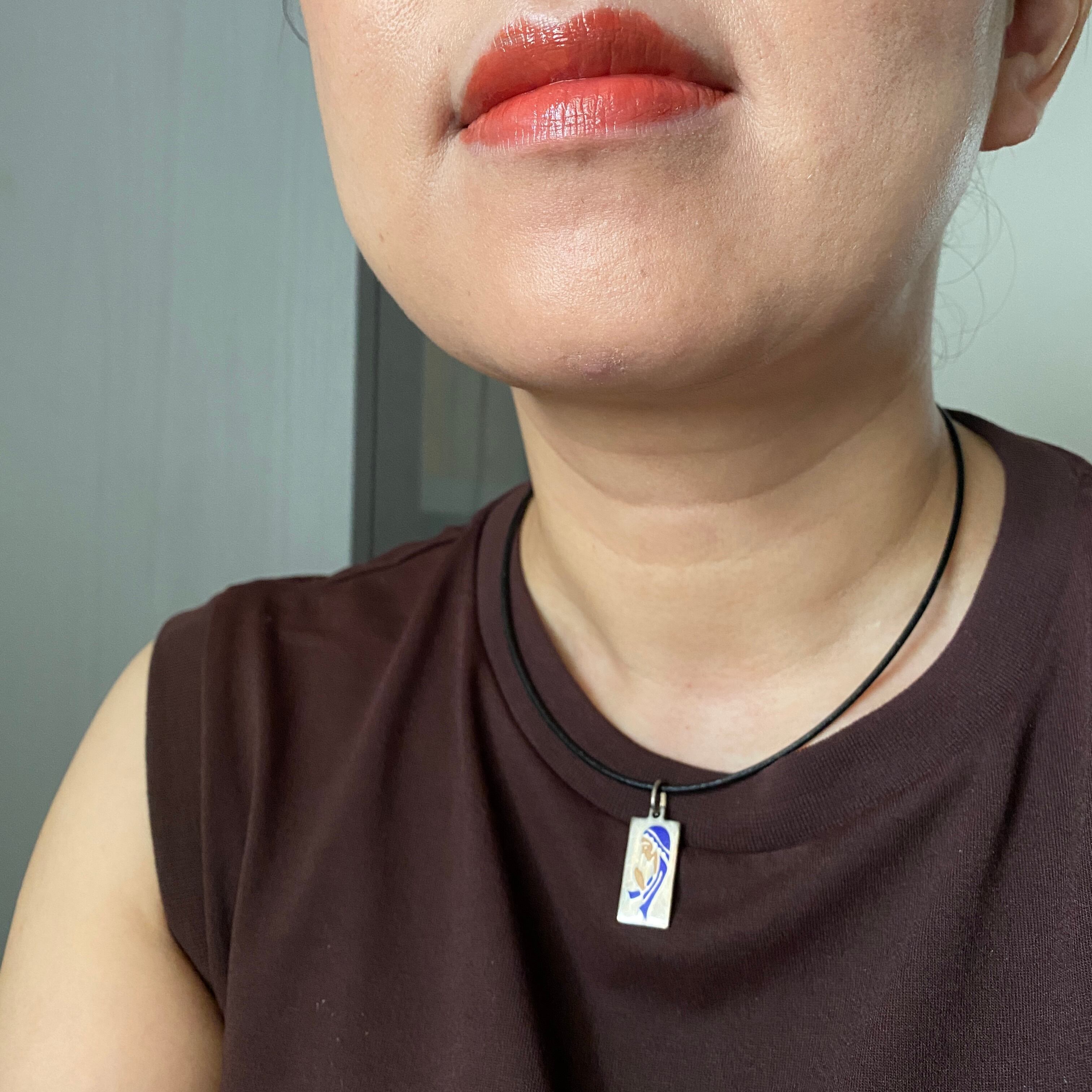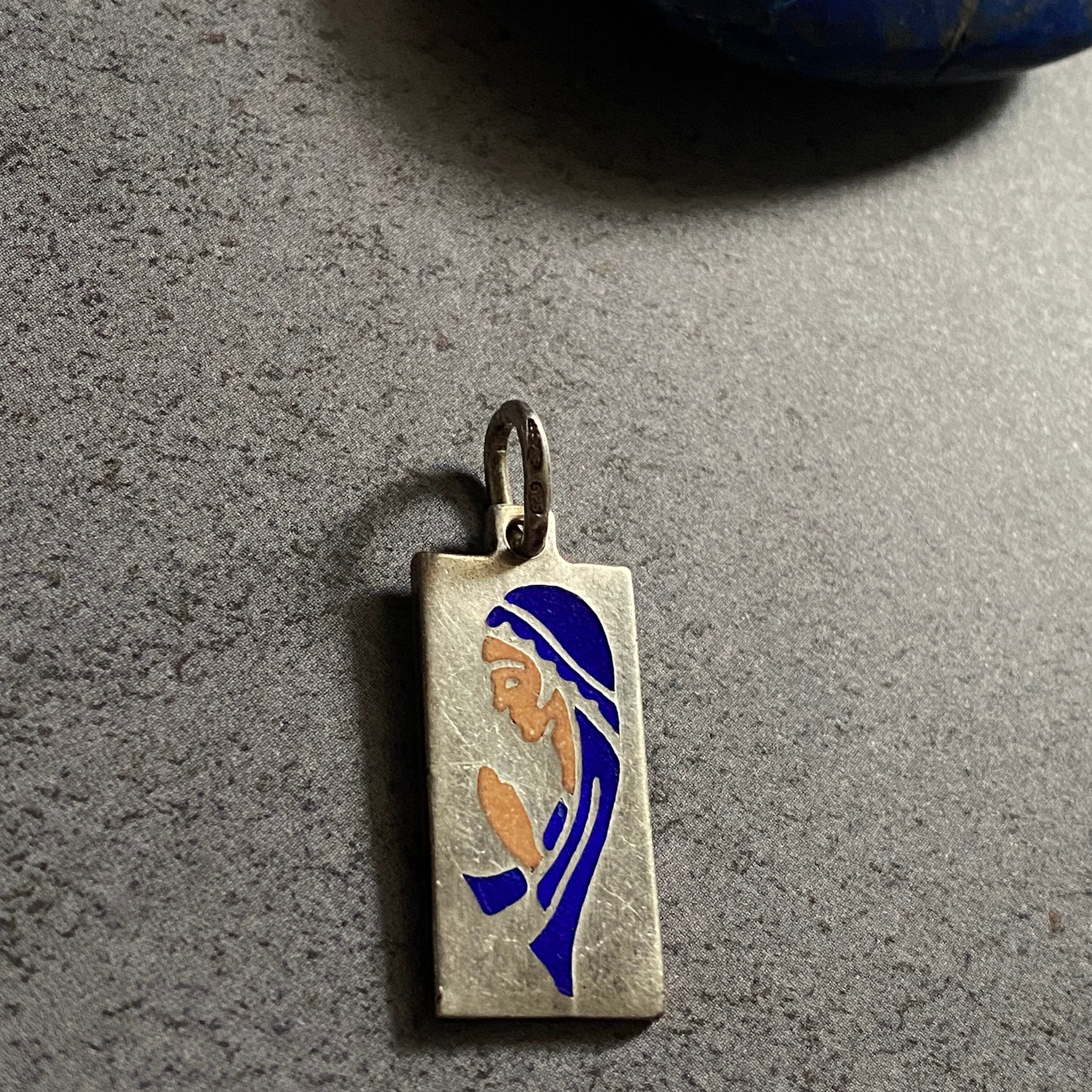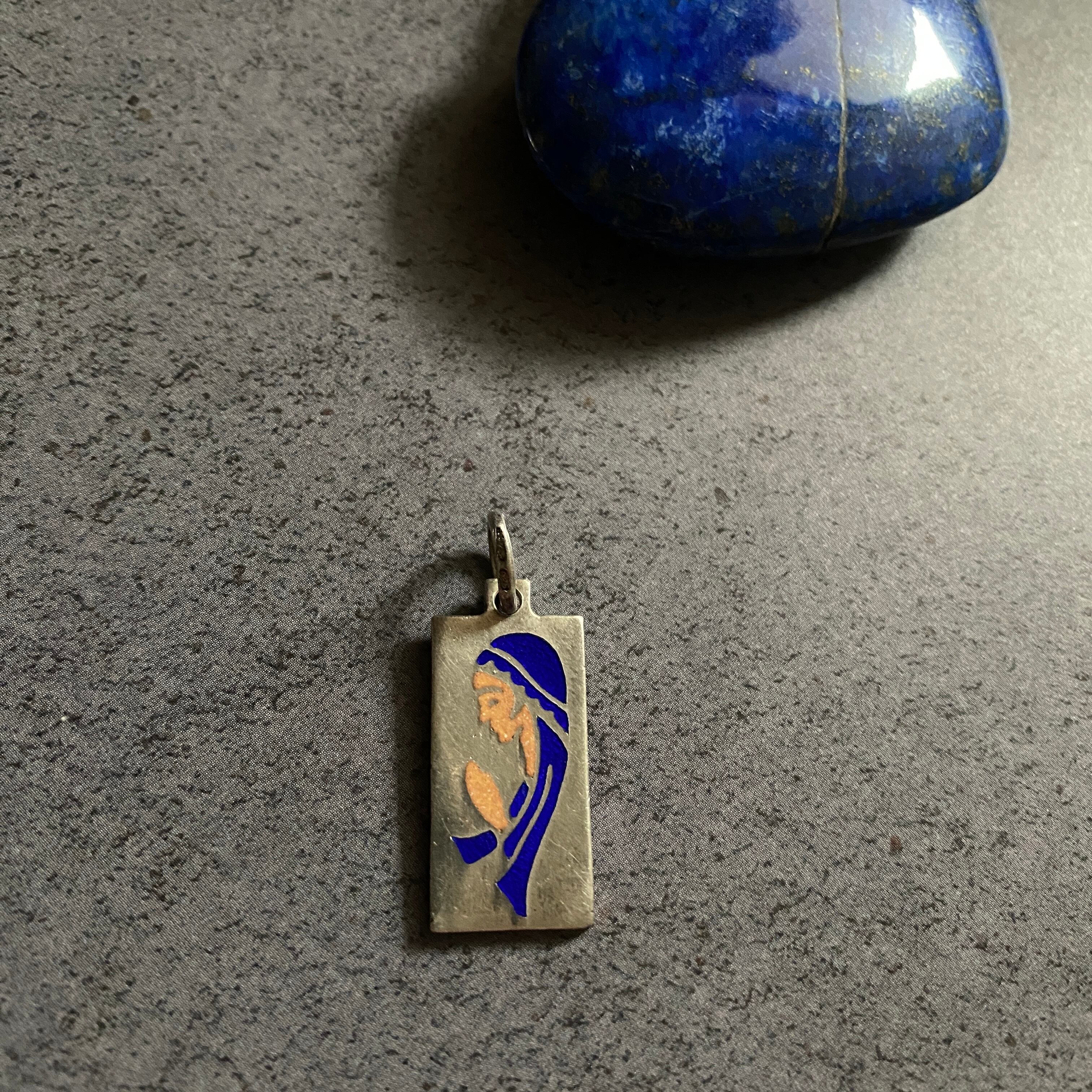 まるでペイントされているかのような手法で、エナメルの色味だけで聖母マリアの御姿が表現されている珍しいデザインのメダイ。