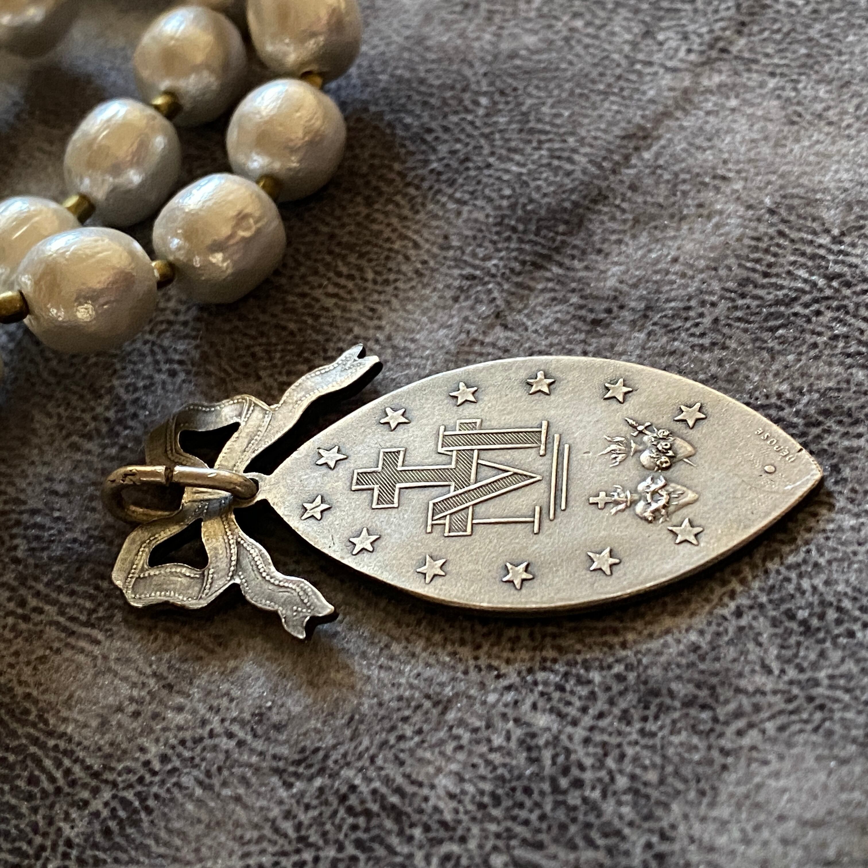 甘めのデザインながらも、アーモンド型のスタイリッシュさ、アンティーク感とマットなシルバーが上手くバランスを取り、絶妙に可愛らしく美しいメダイです。