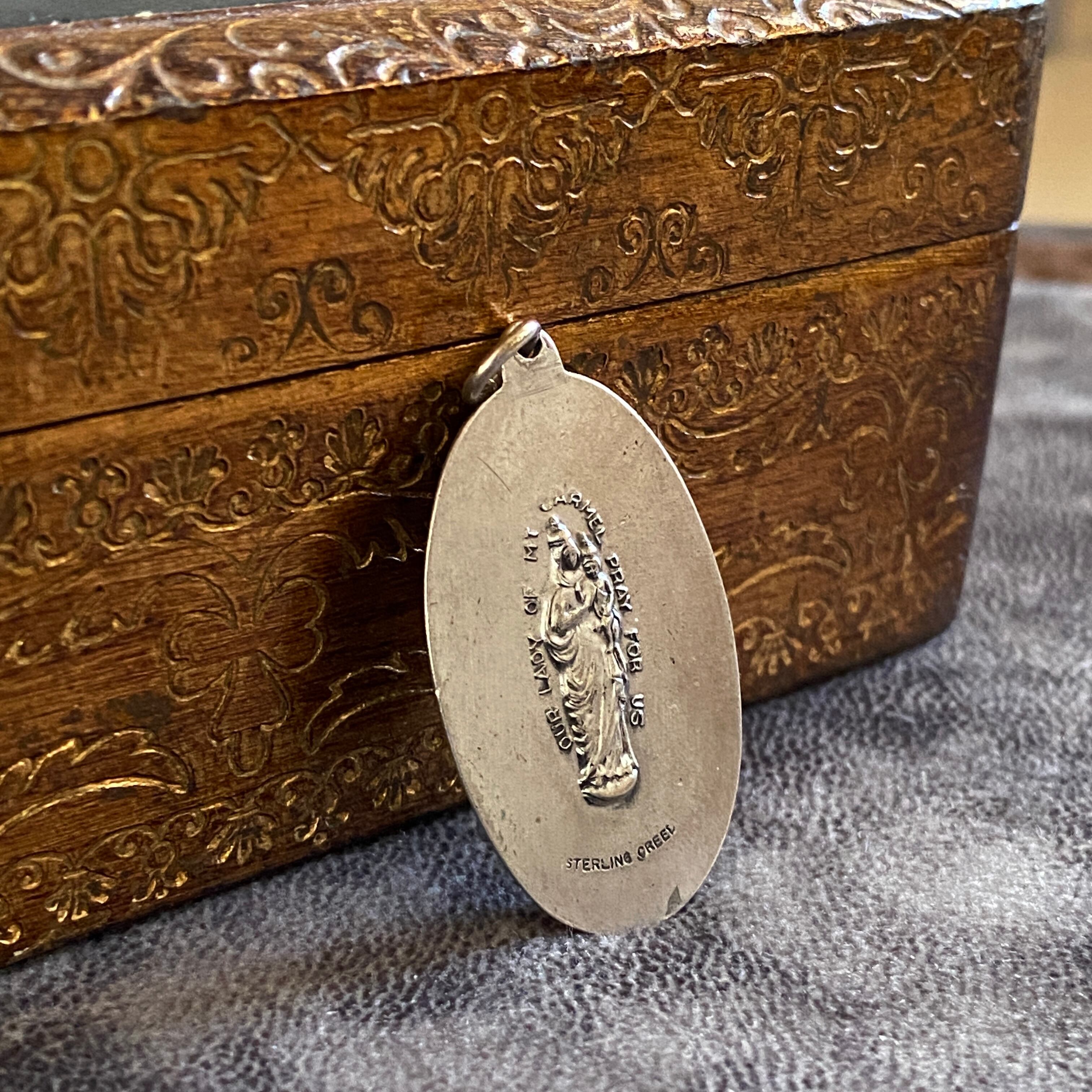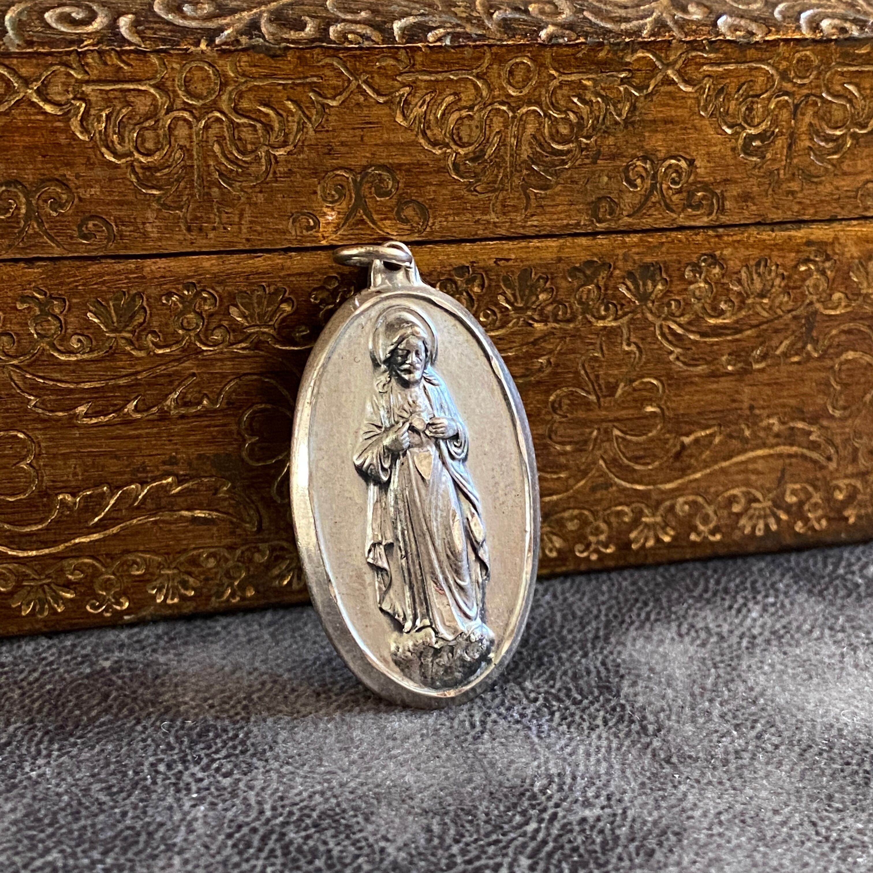 表面には、聖心を指し示すキリスト、裏面にはカルメル山の聖母を浮き彫りにしたスカプラリオのメダイ。