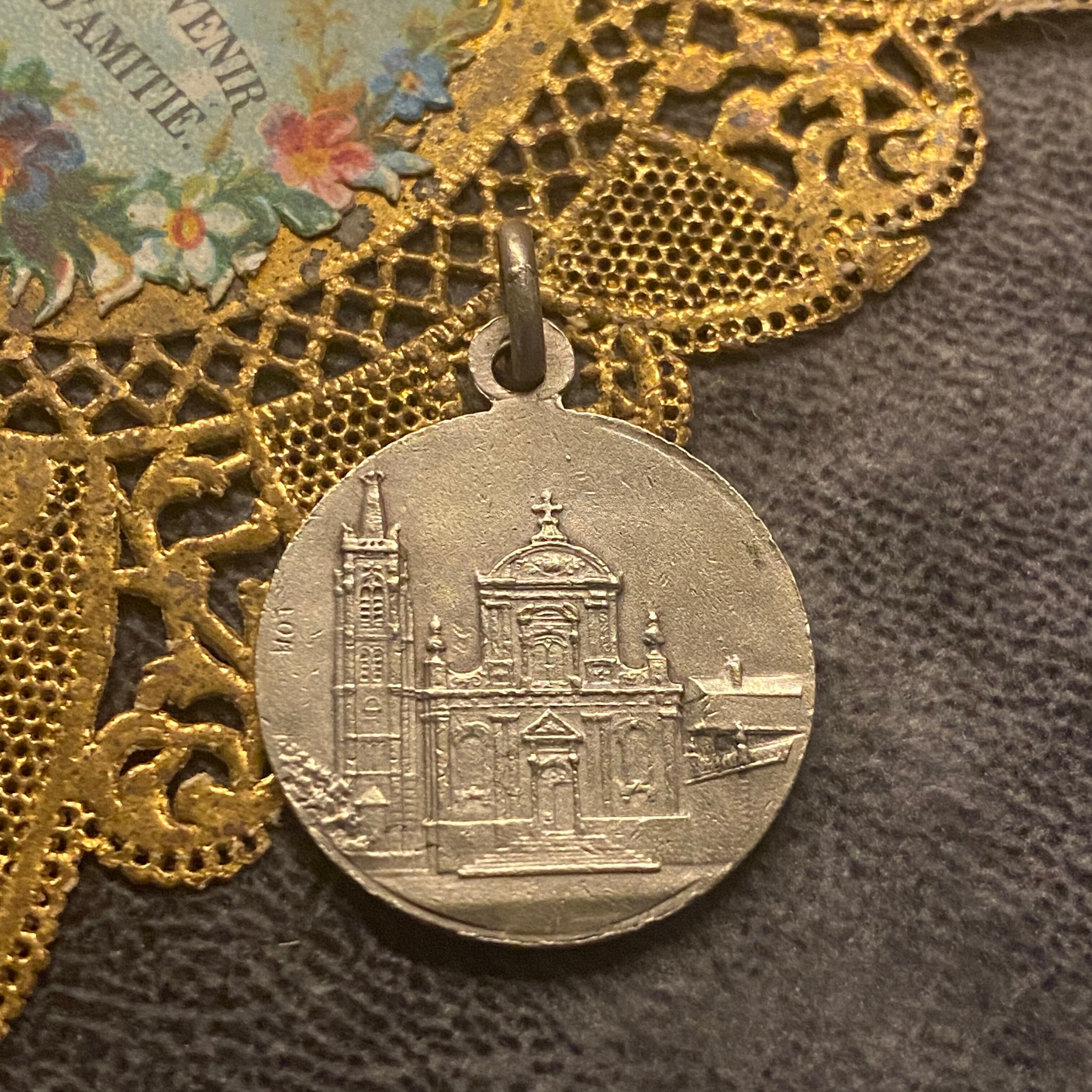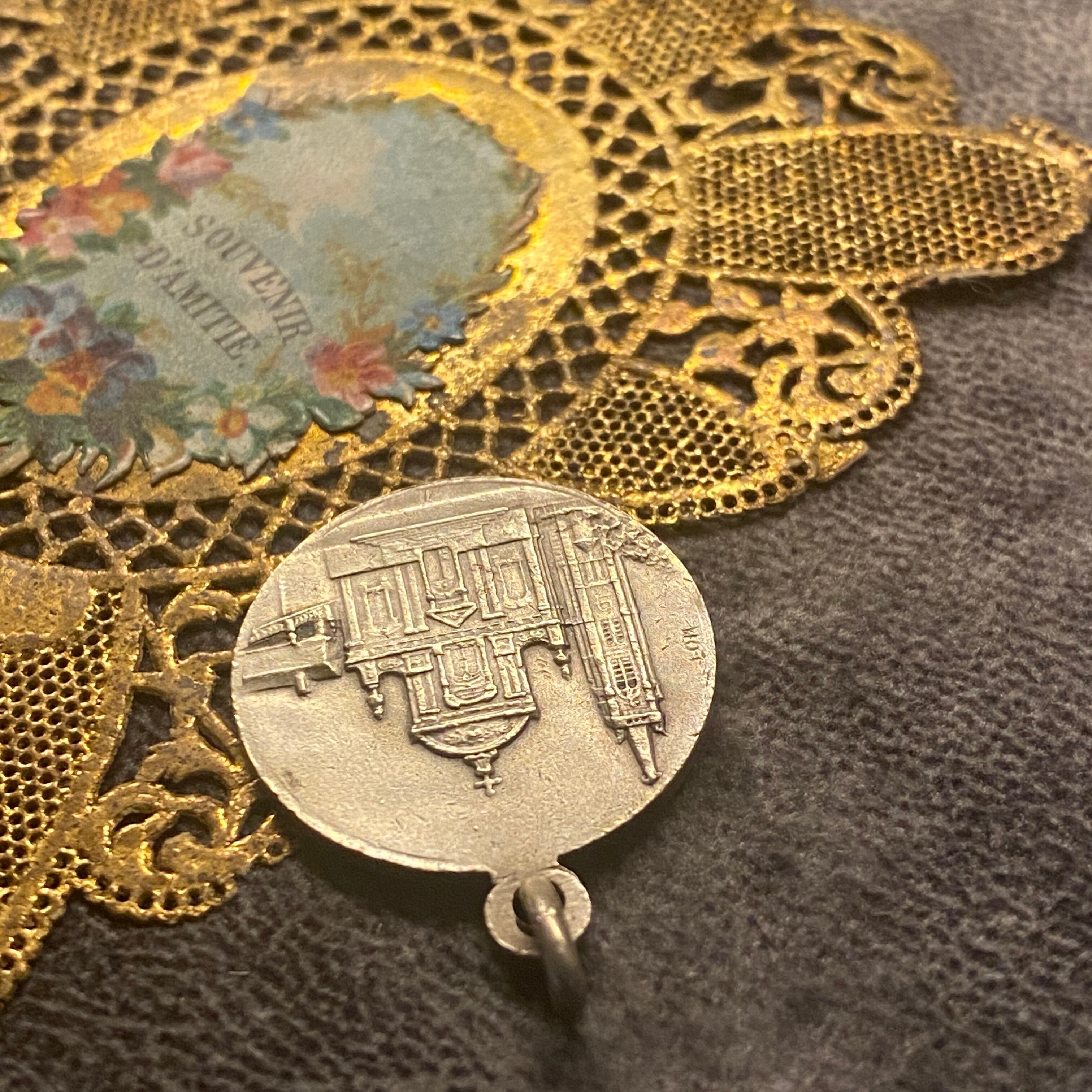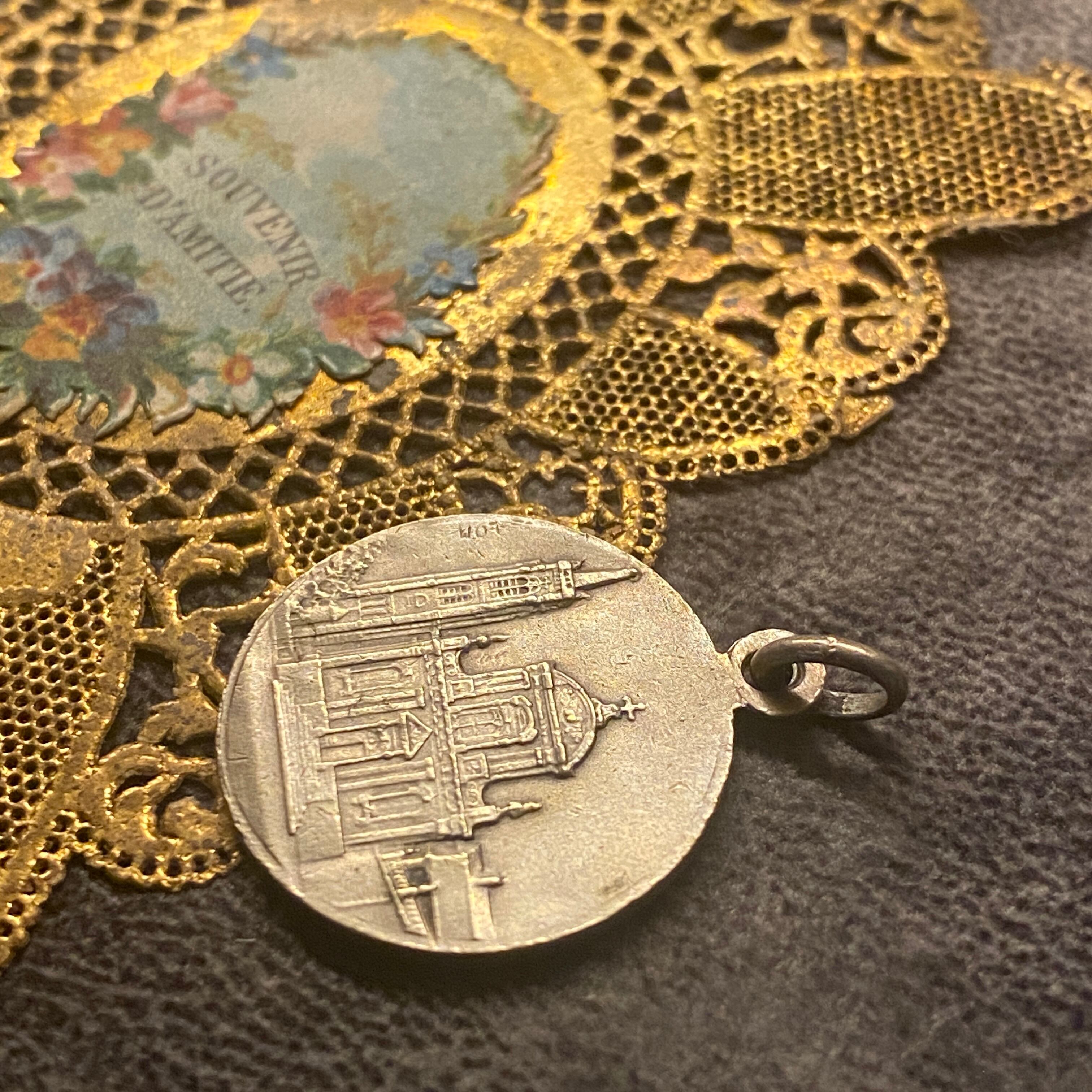 背面の教会も大変繊細に描かれていて、スカプラリオ(表裏一体の御守り)としてお付けいただけます。