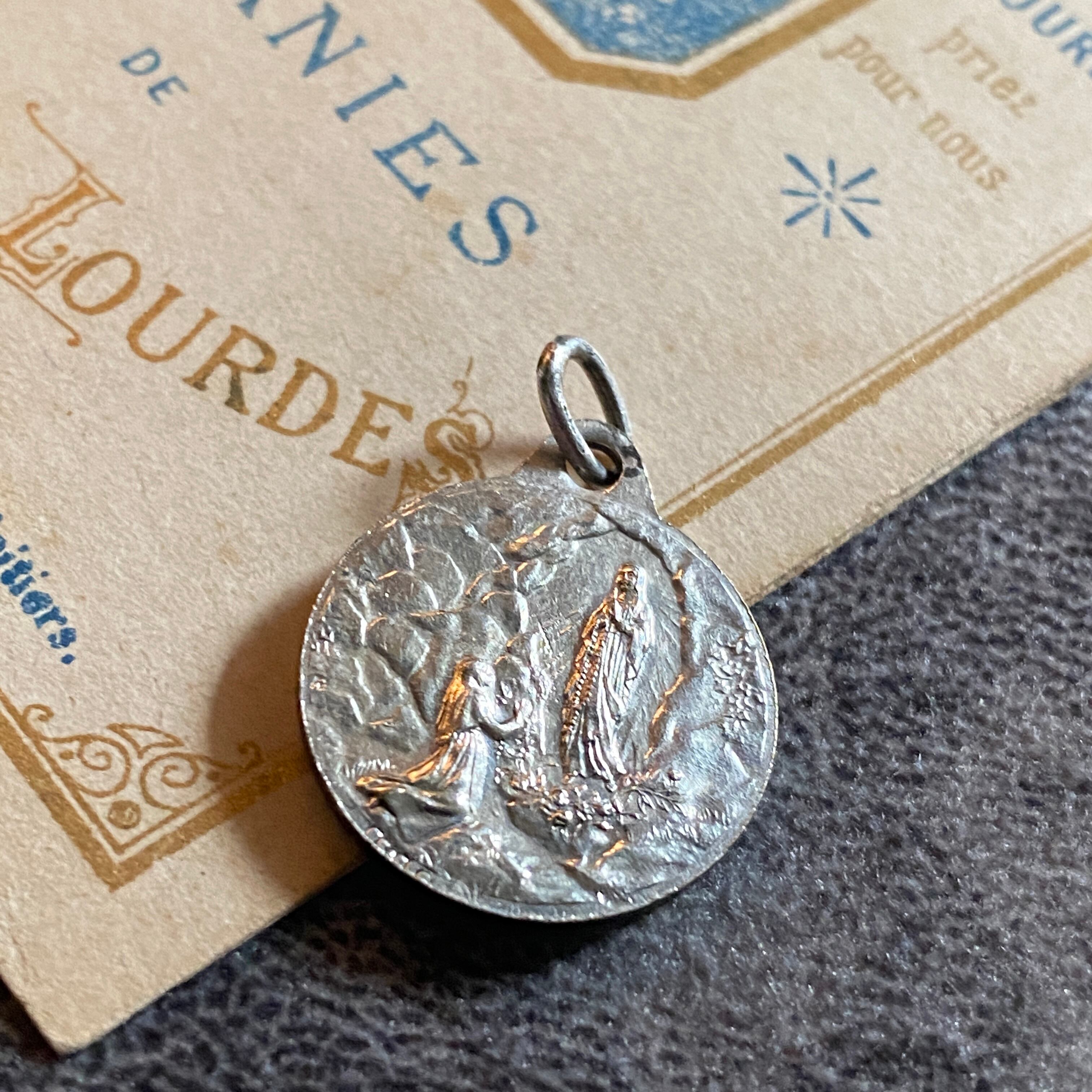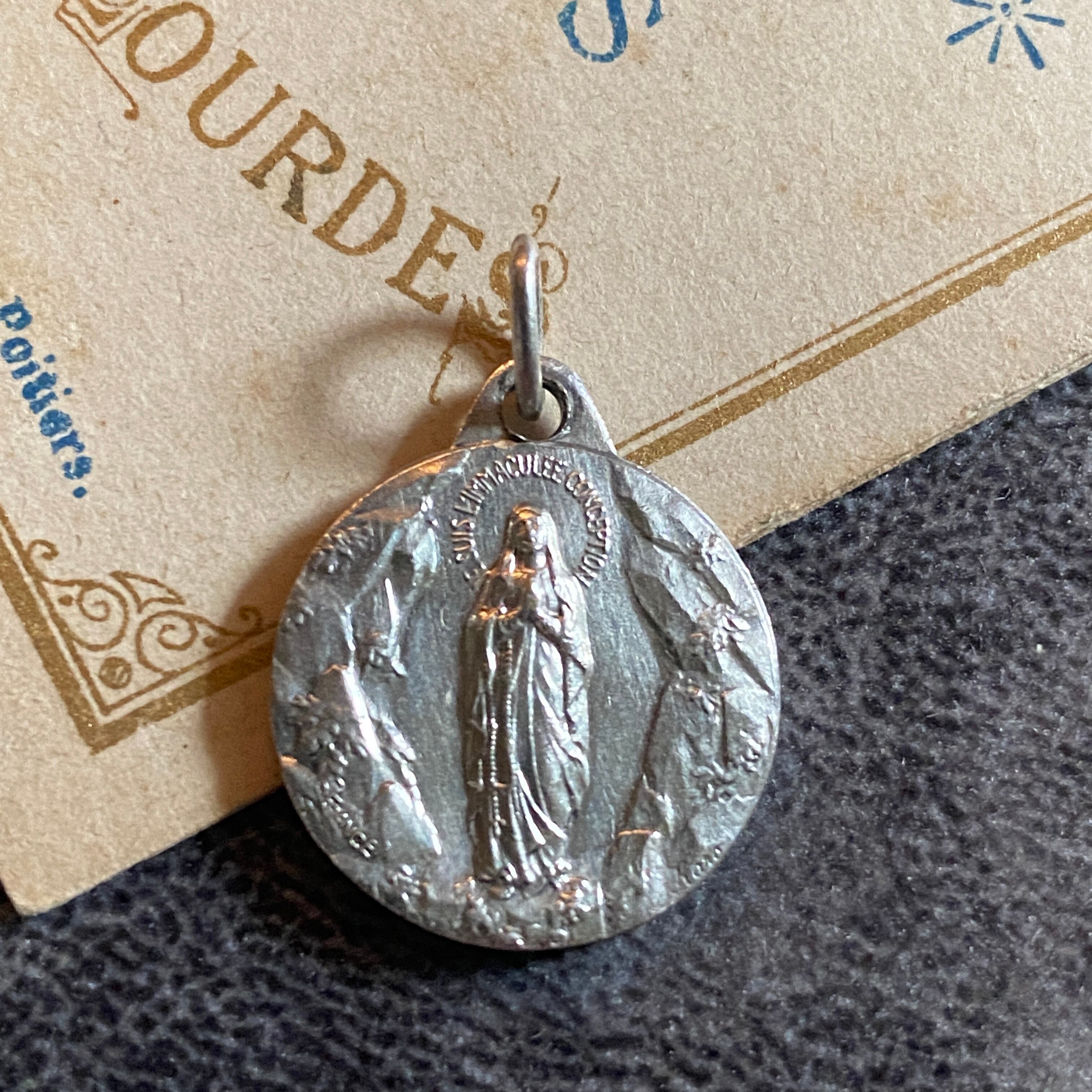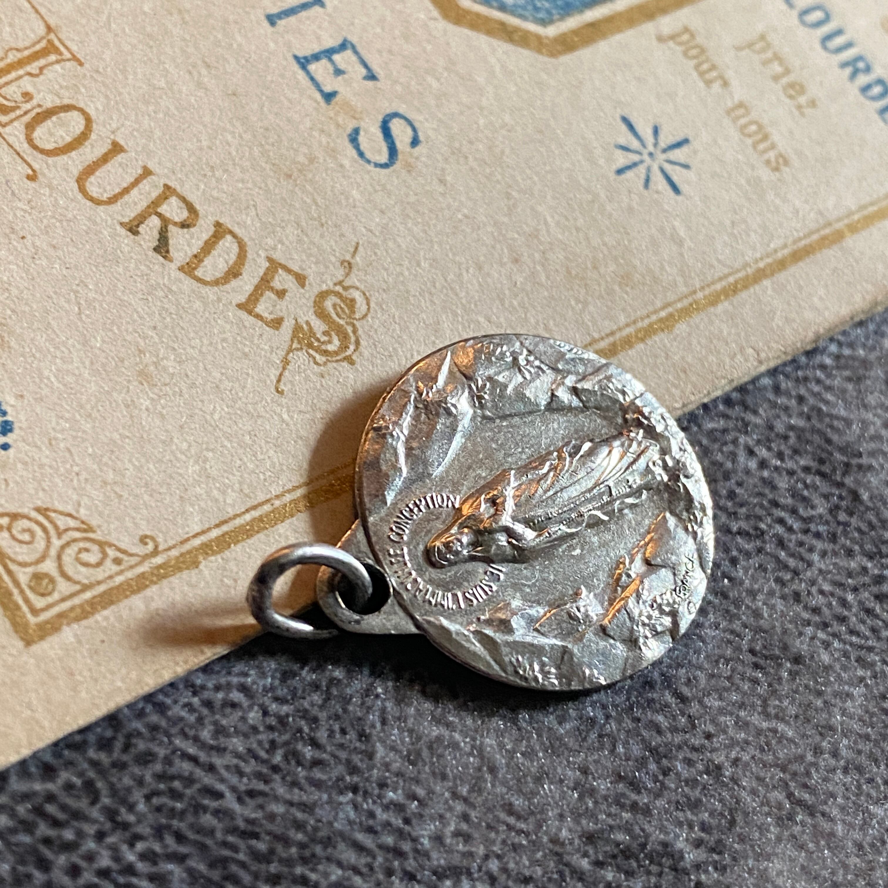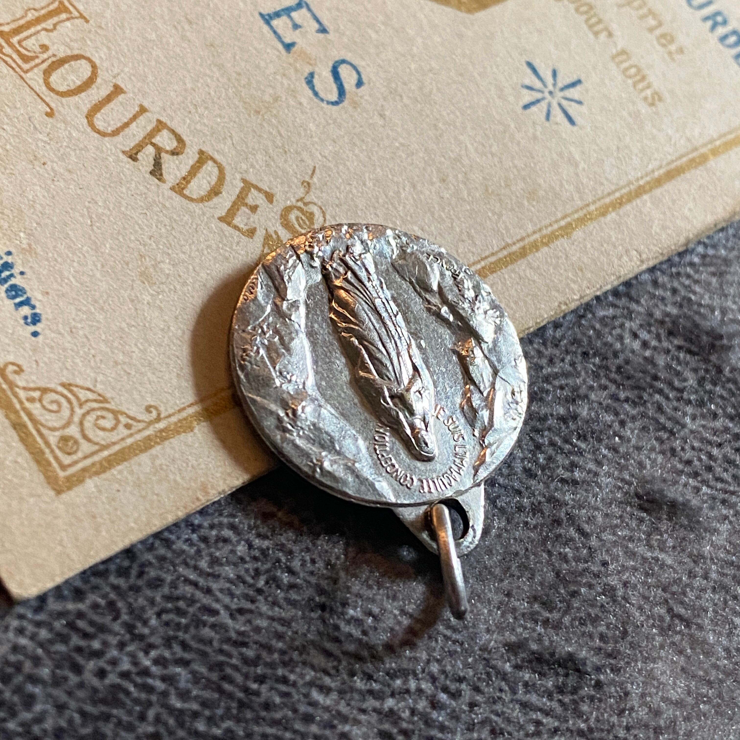 一般的にルルドのメダイには、ひざまずく少女ベルナデッタと目の前にご出現される聖母マリアの全体が描写されたものが多い中で、こちらの作品は聖母マリアの御姿にフォーカスされています。