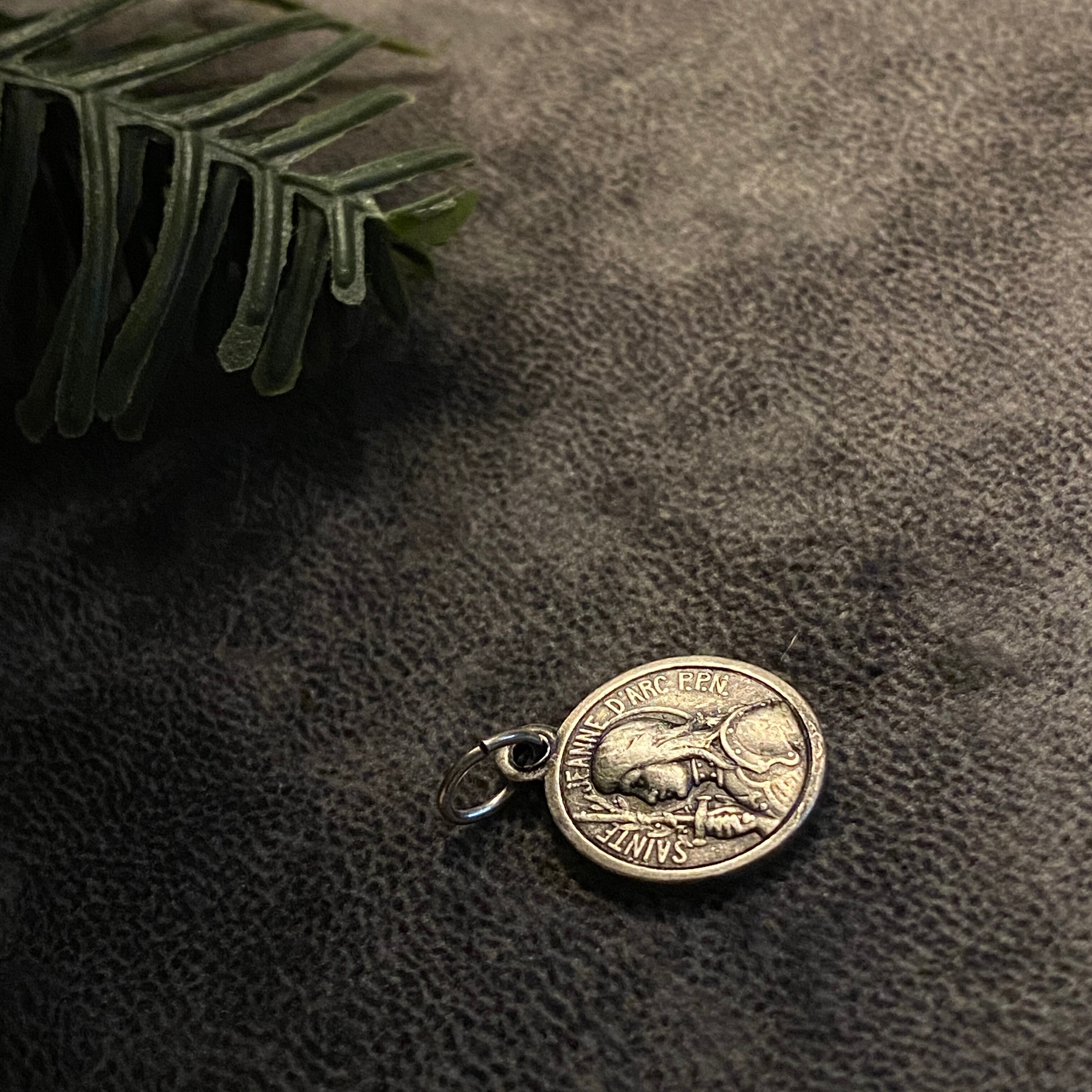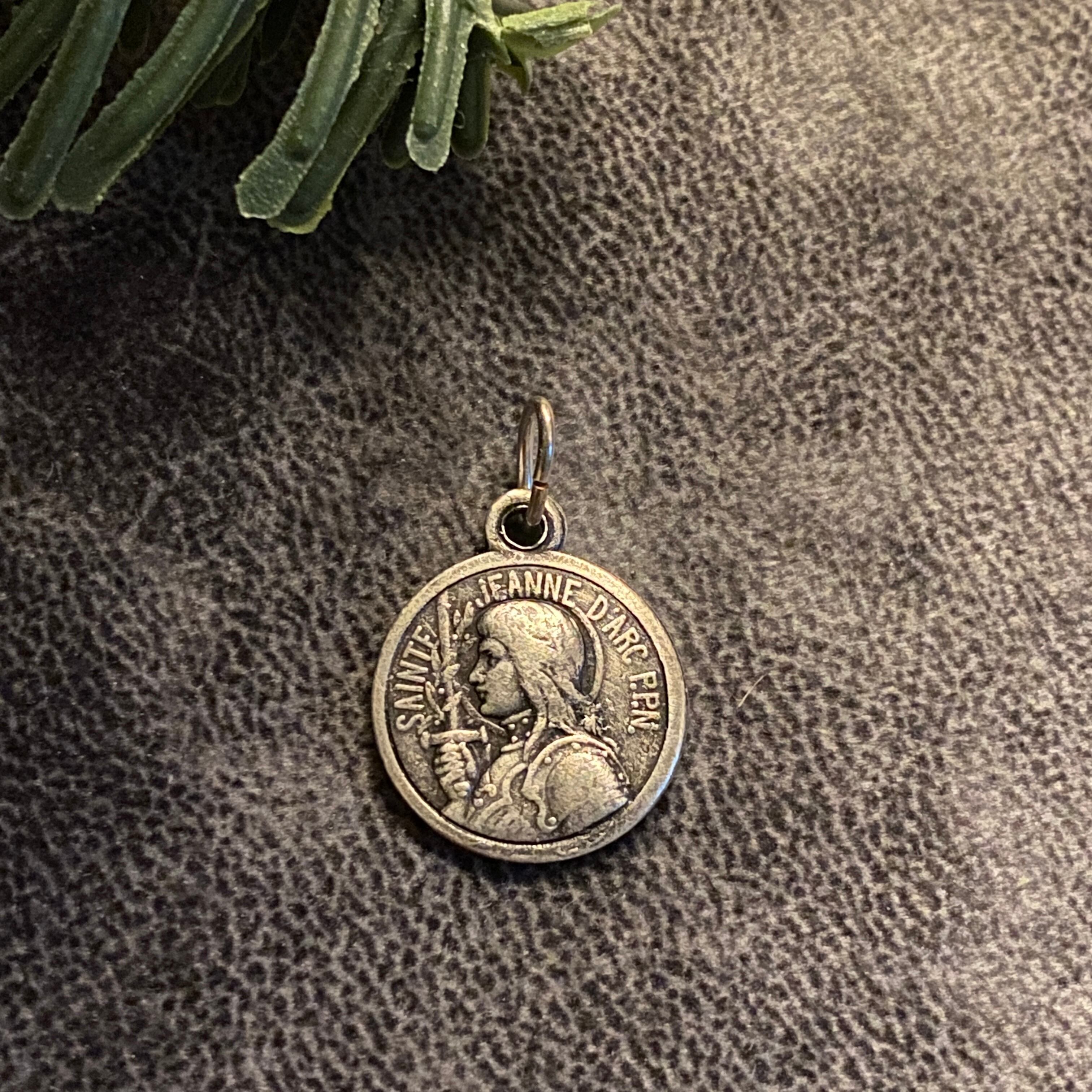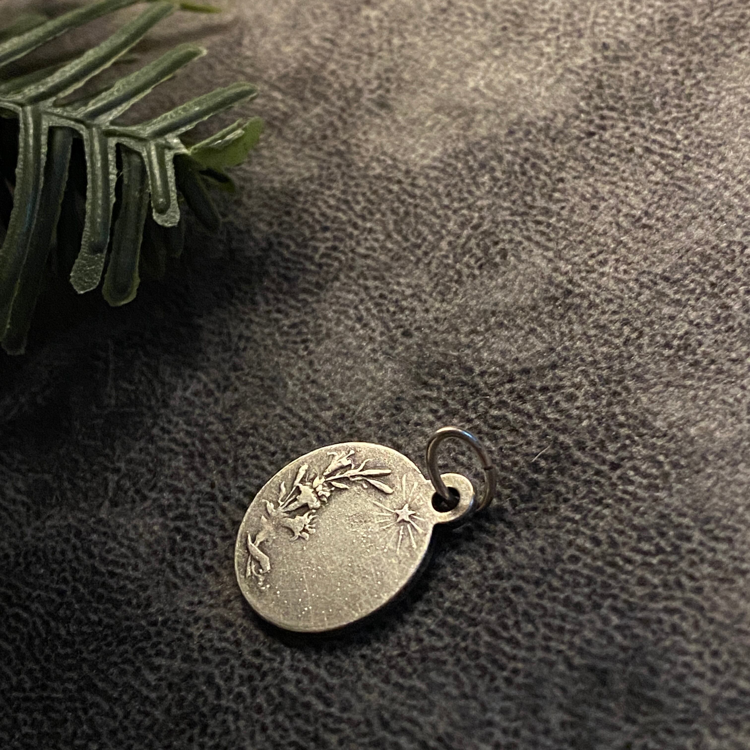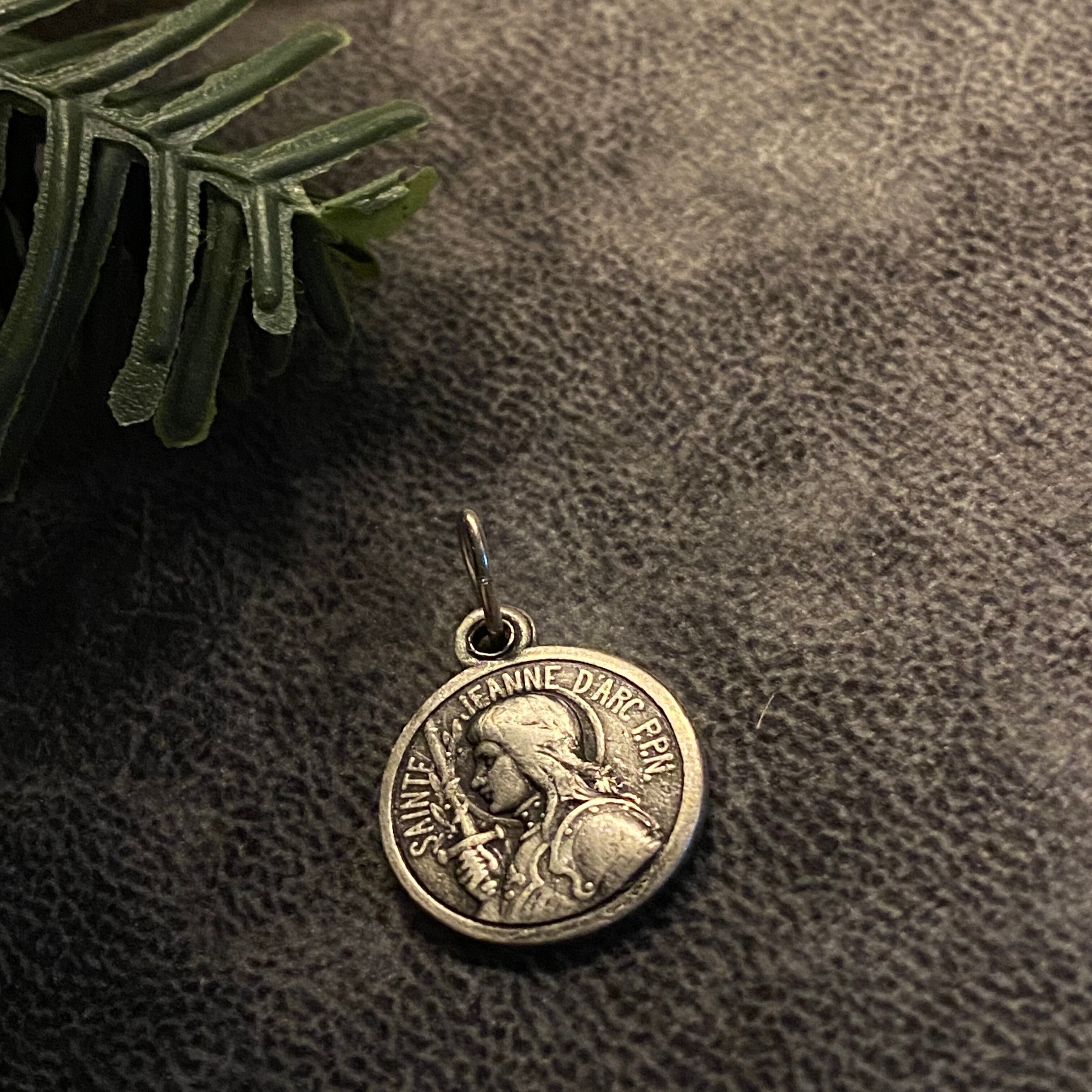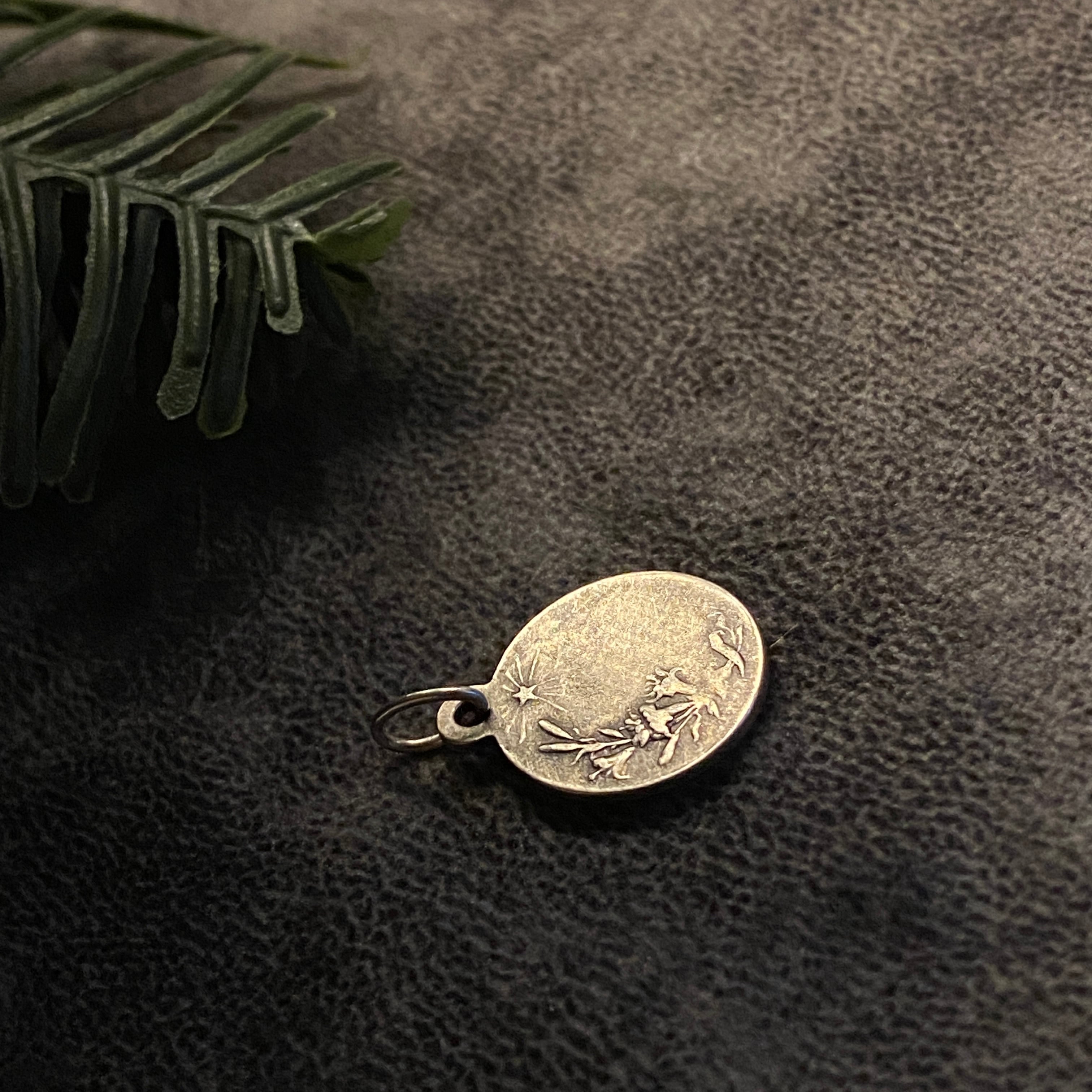奥には、殉教者を象徴するナツメヤシの葉が描かれ、メダイの淵に沿って祈りが刻まれています。