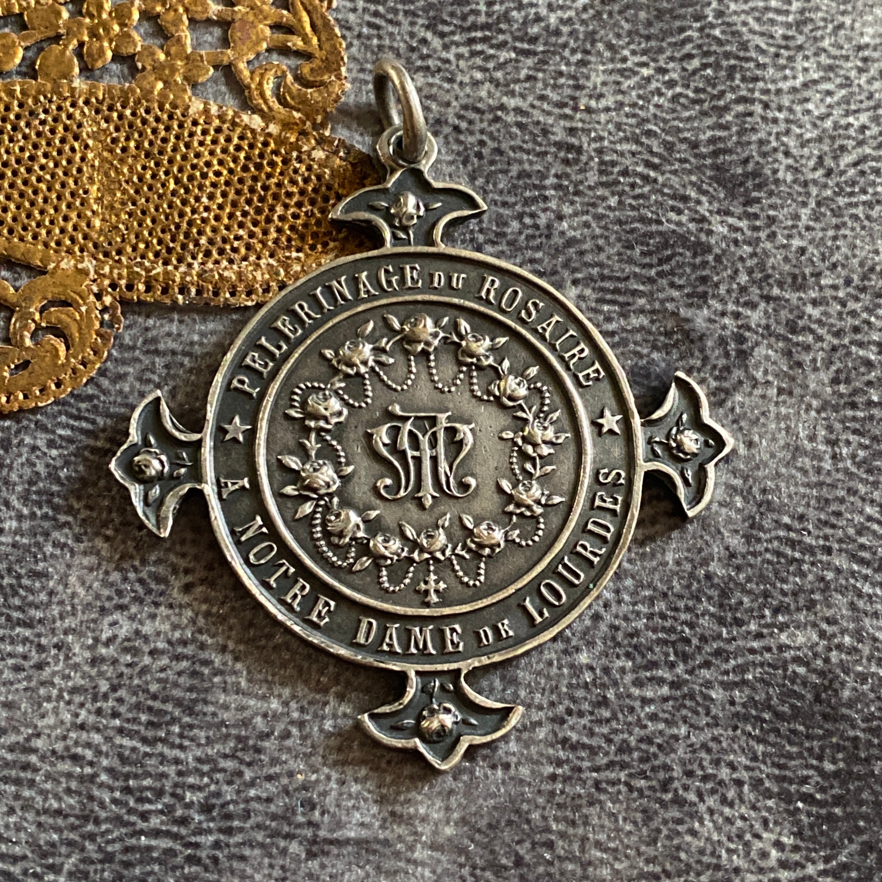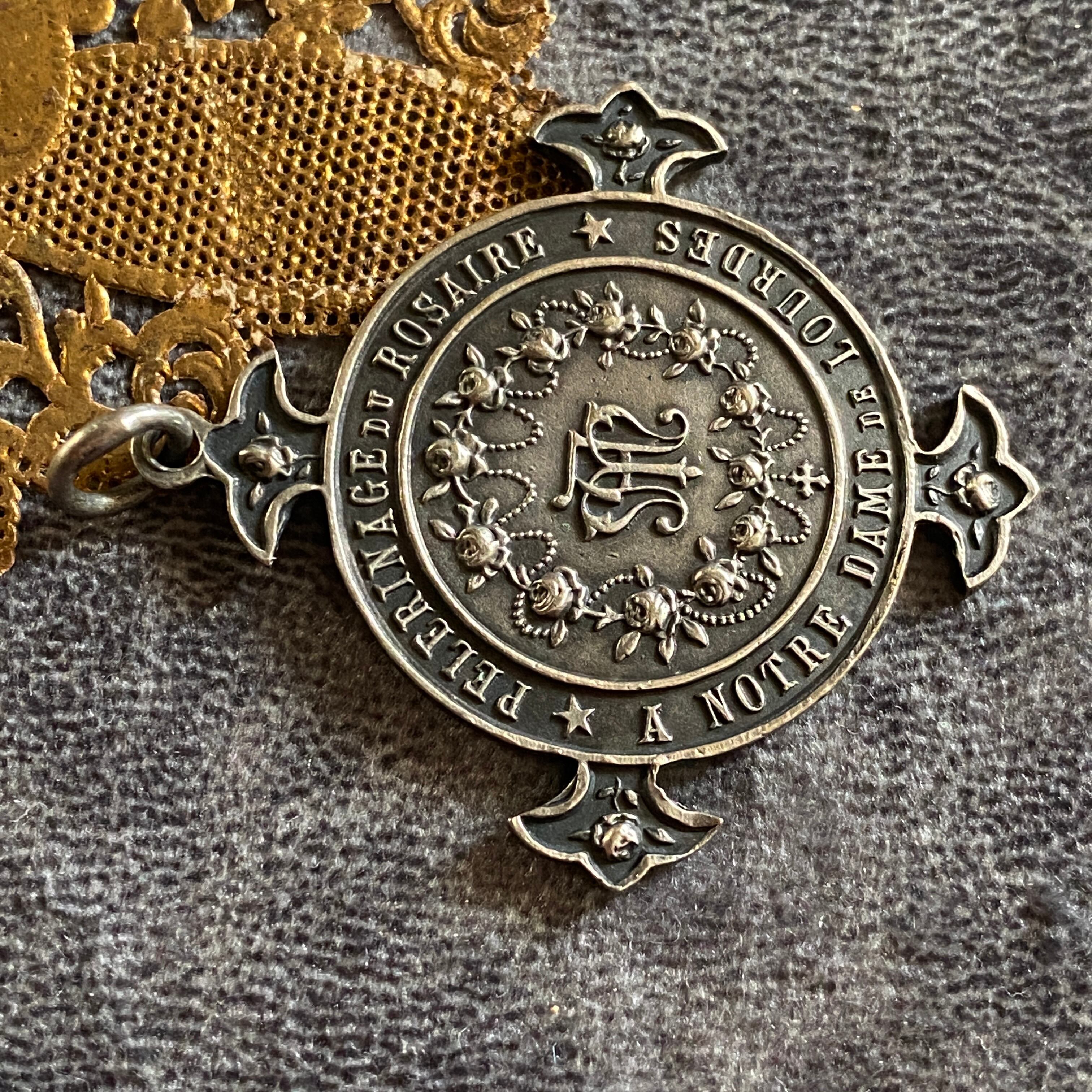 周囲には「ルルドの聖母へのロザリオの巡礼」(Pèlerinage du Rosaire à Notre-Dame de Lourdes) と彫られており、素晴らしい芸術作品、スカプラリオとしてご紹介できるメダイです。