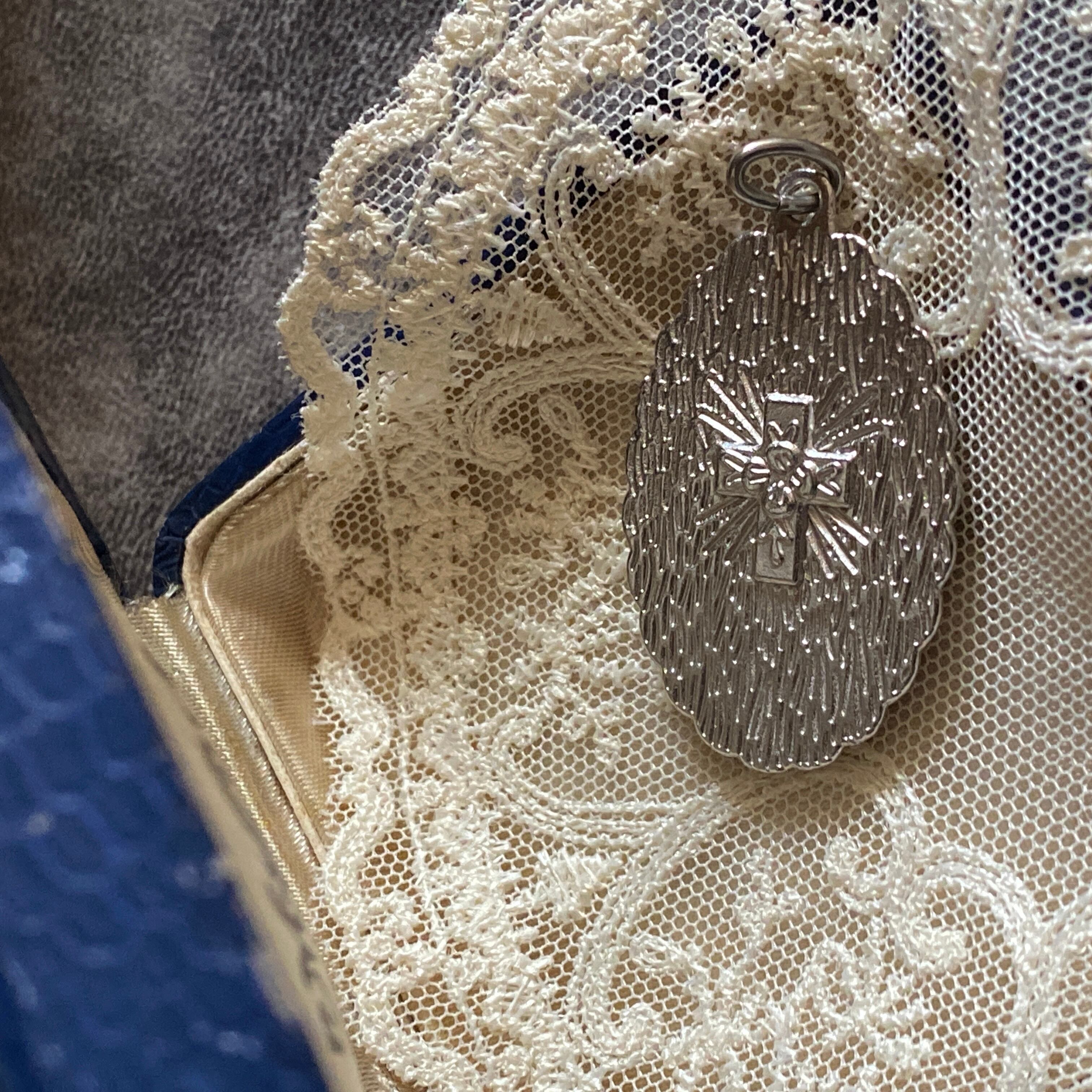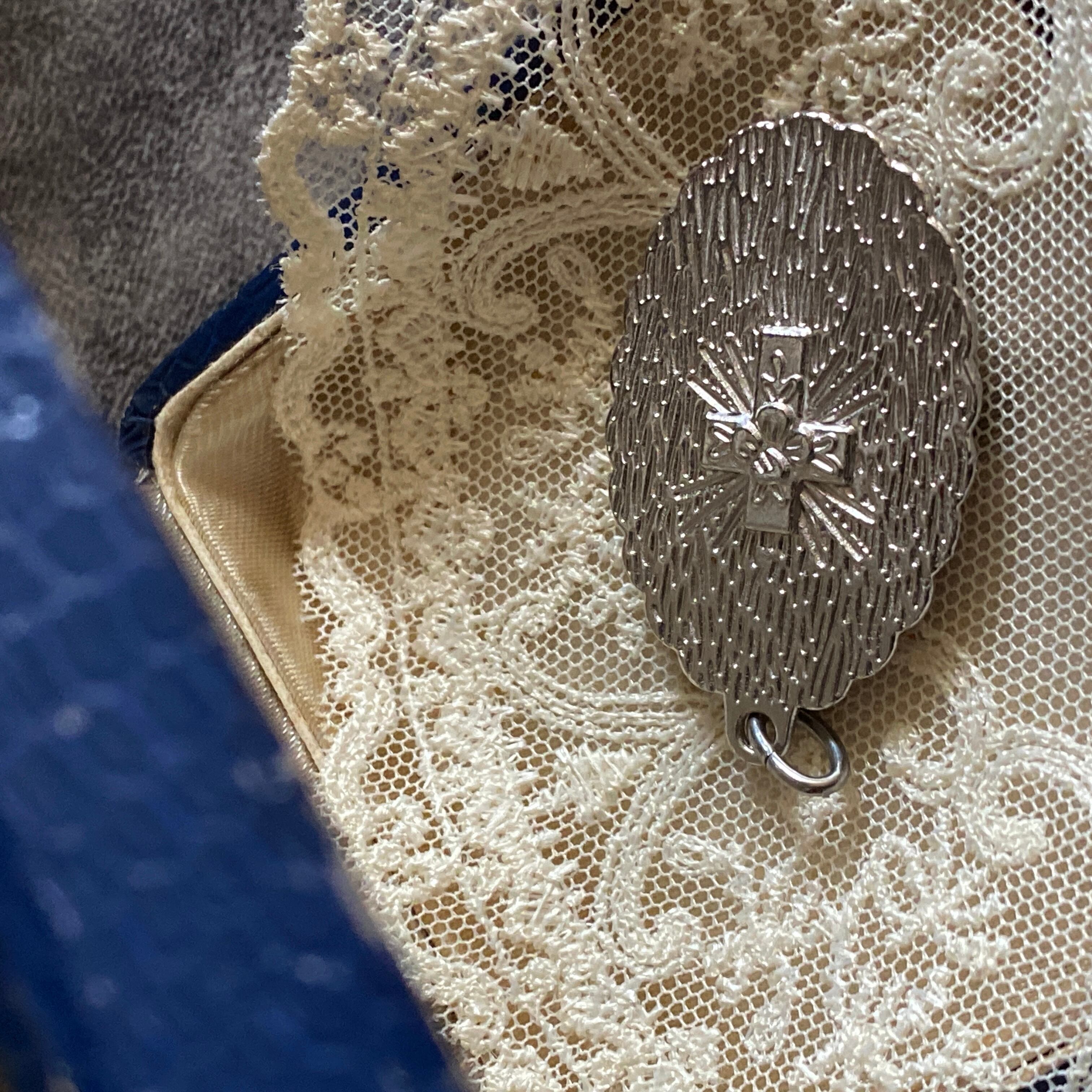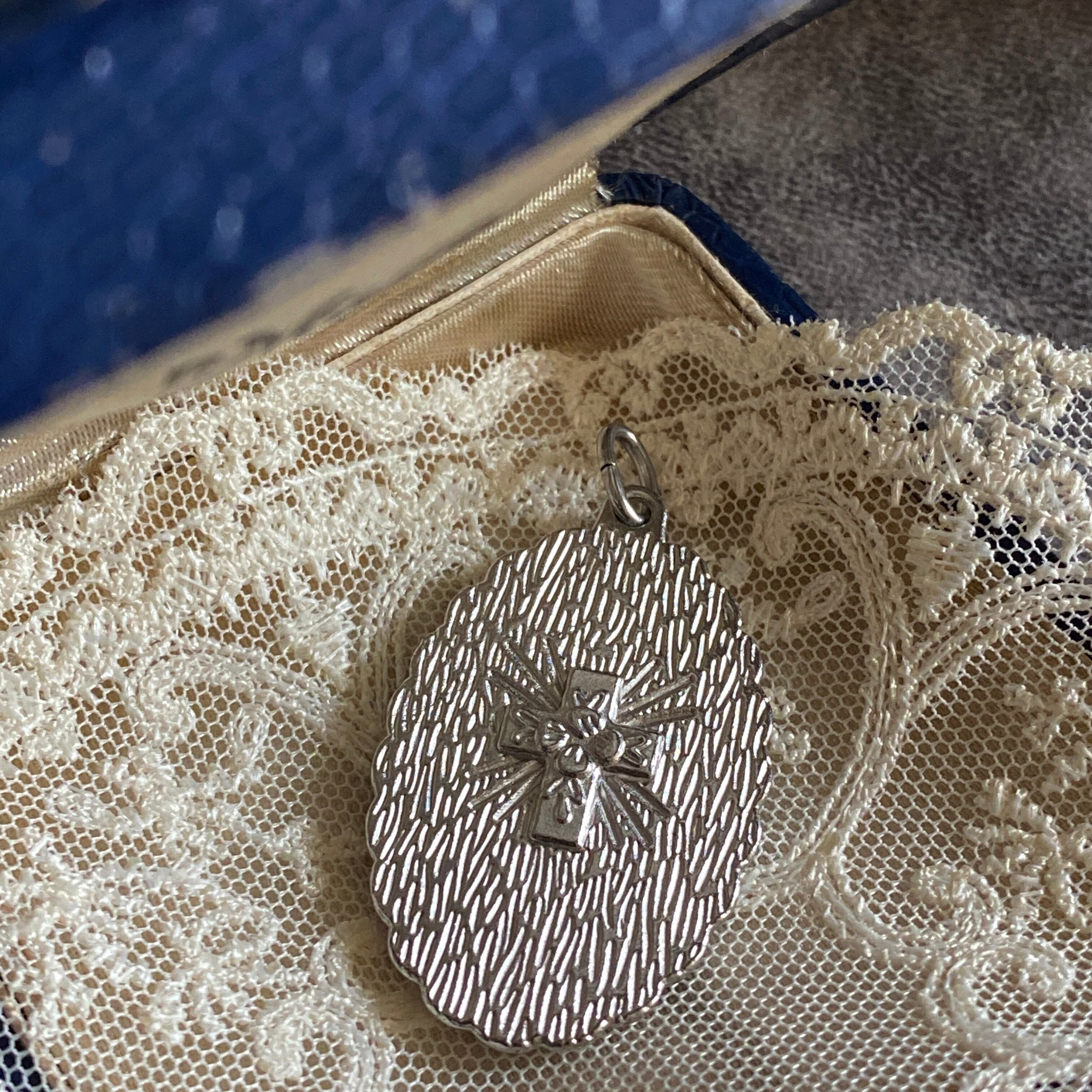 背面には、模様にクロスのモチーフが輝くデザインがあり、美しい御守りとしてでなく、パールなどと合わせても素敵に身につけていただけます。