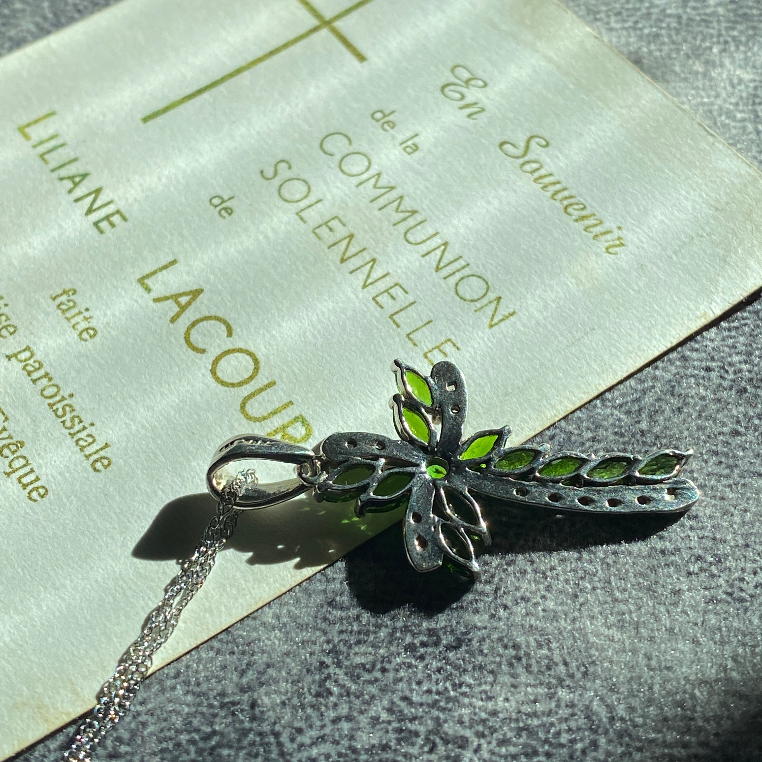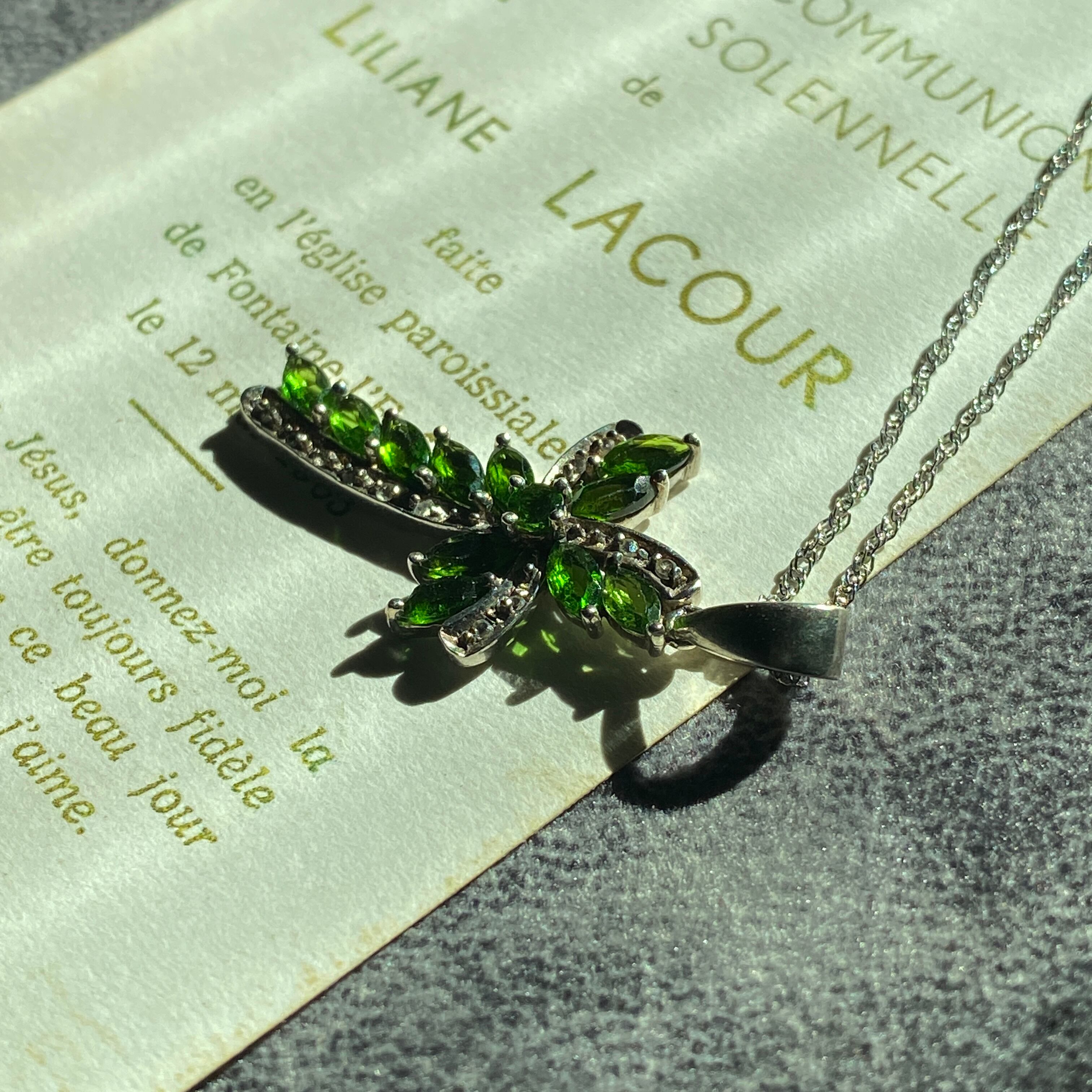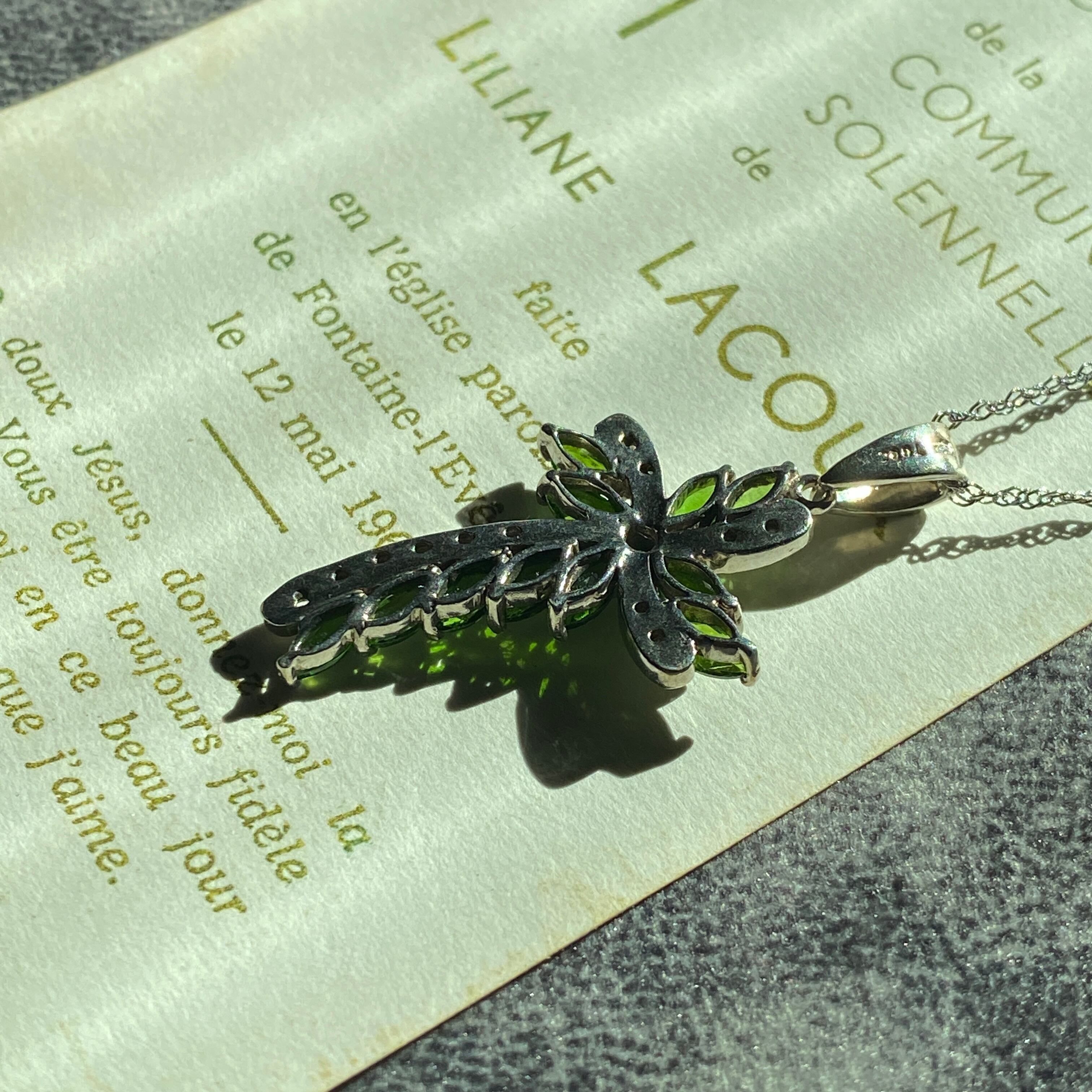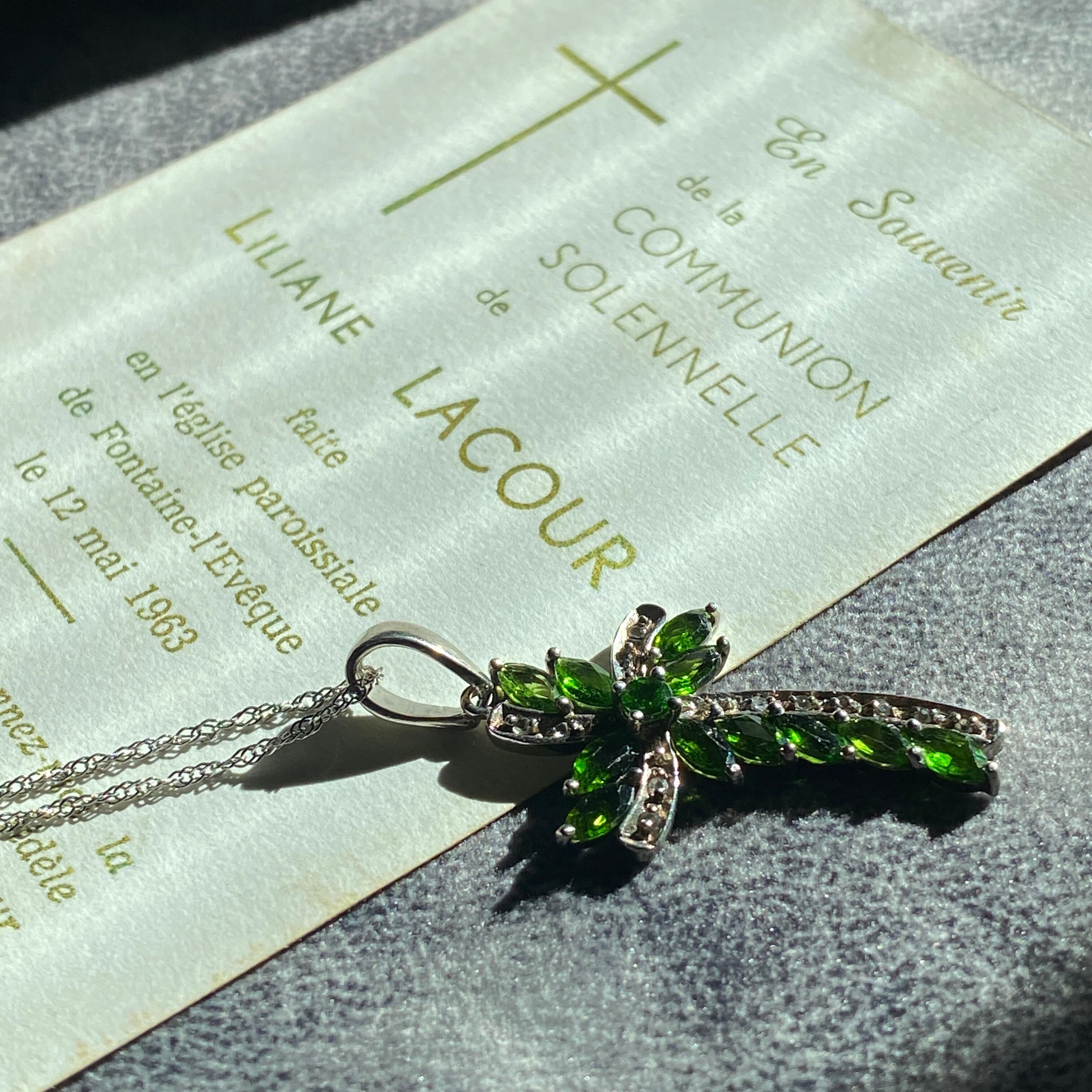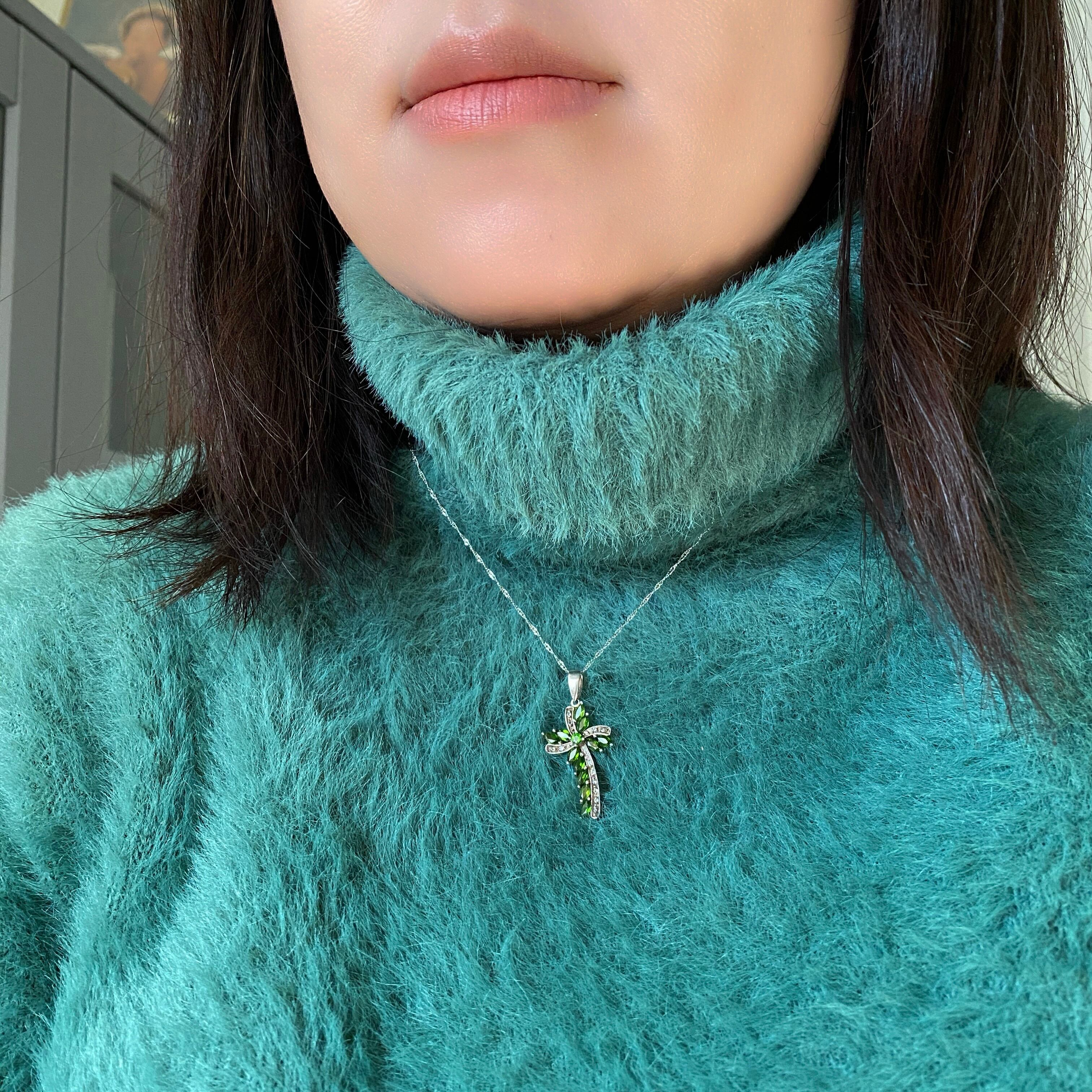 ウェーブが美しいこちらのクロスは、グリーンのダイオプサイドとホワイトスピネルで形成されています。