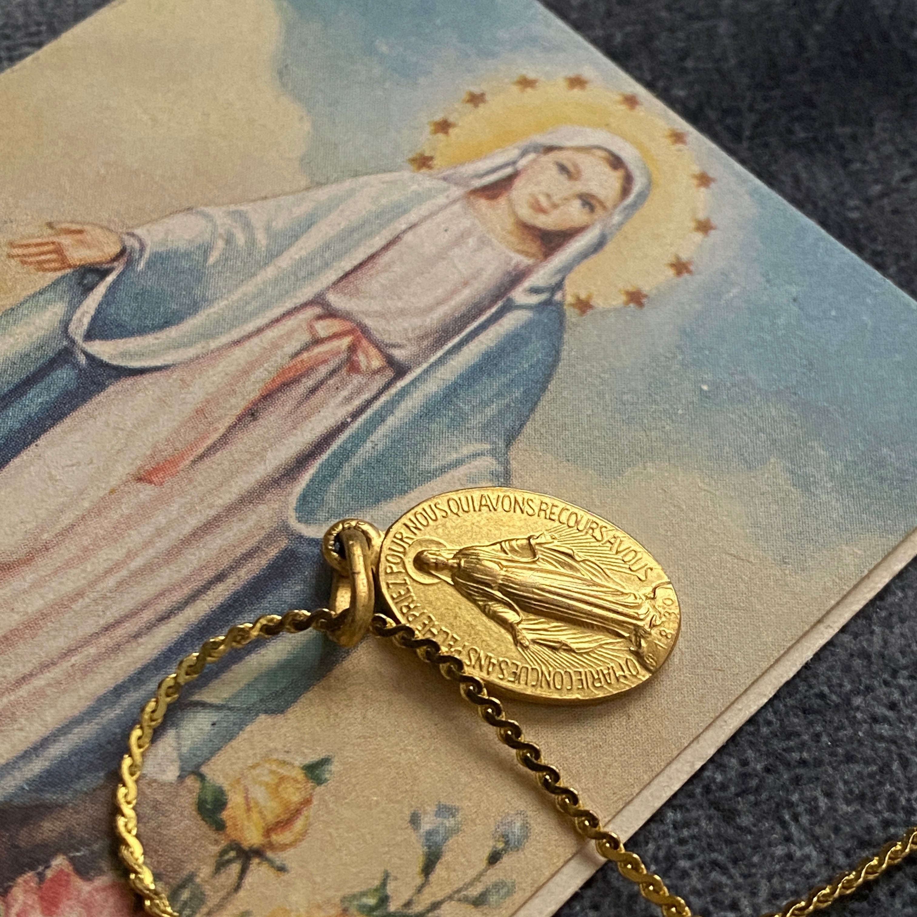 18Kゴールドフィルド加工なので、こっくりと華やかで美しいお色味と、状態の良いメダイ。