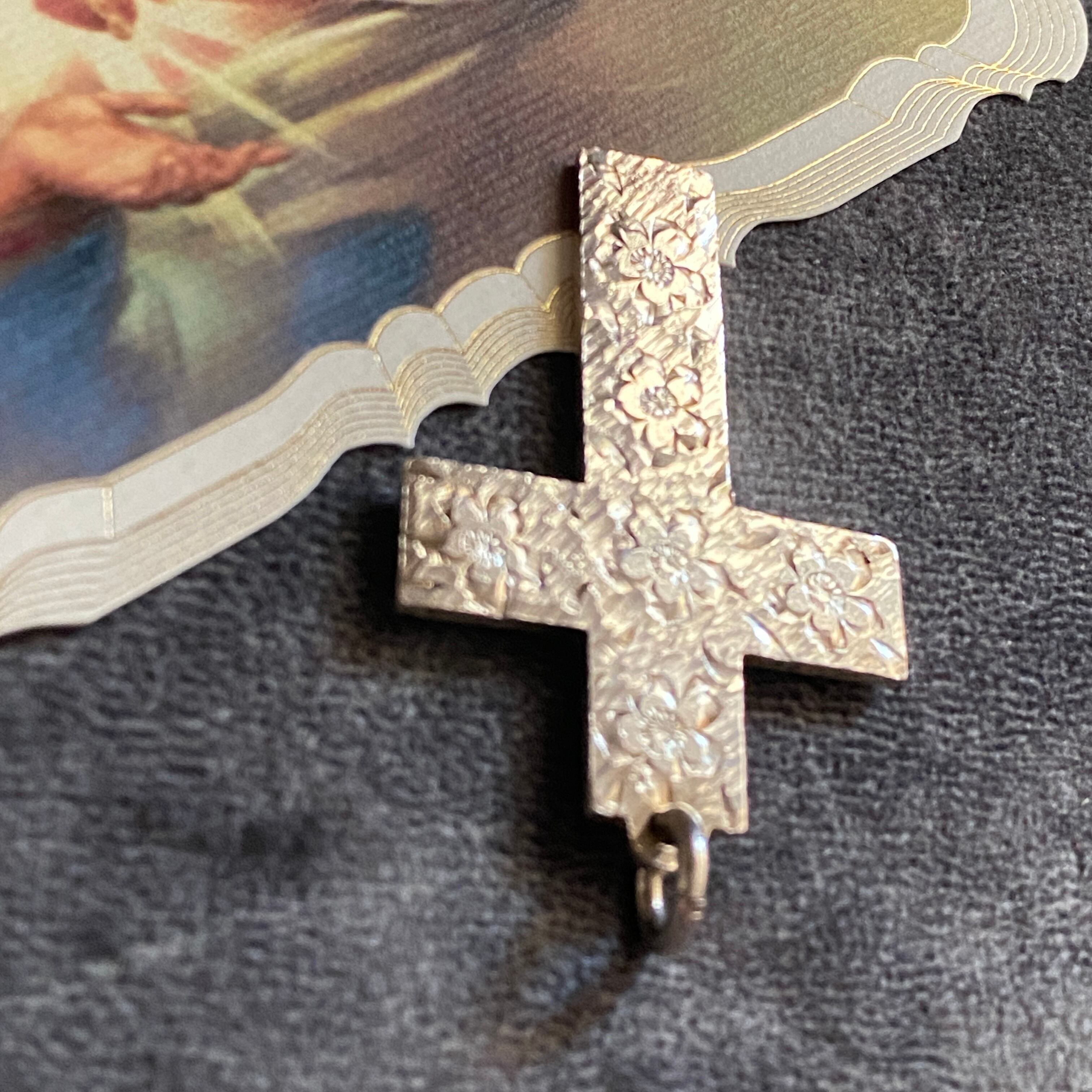 桜の花に似た満開の花が、十字架に沿って6つ配されており、質実剛健な形とシルバーの美しさ、華やかな花のデザインのコントラストが見事です。