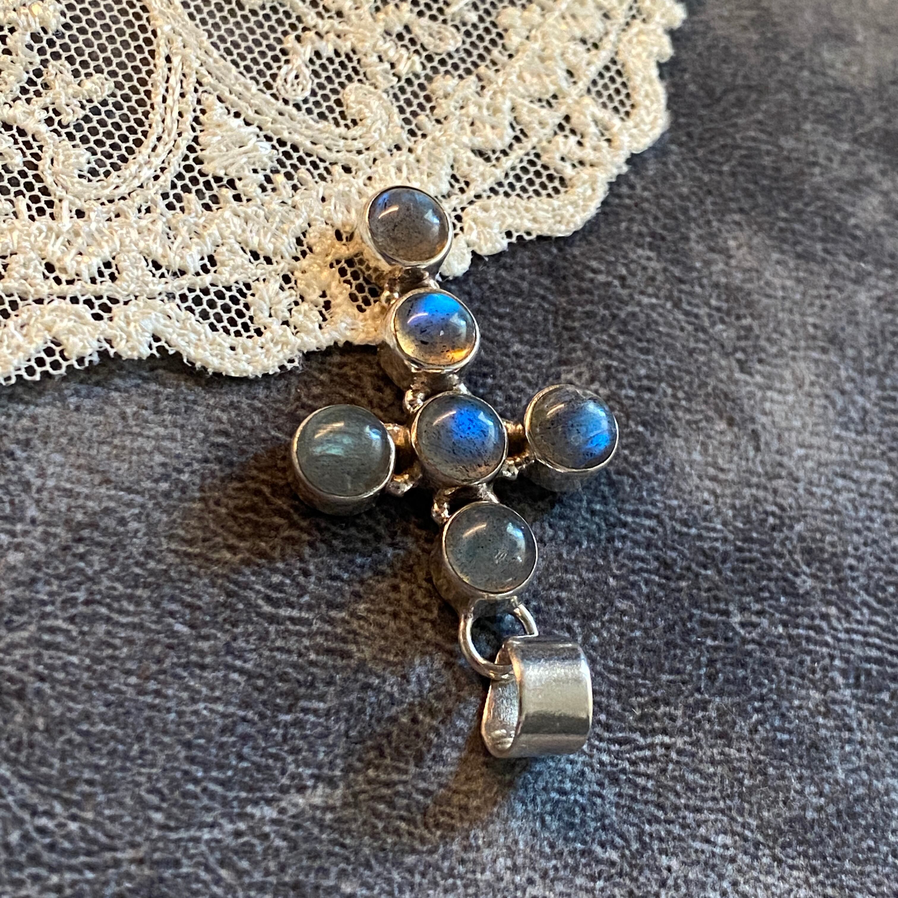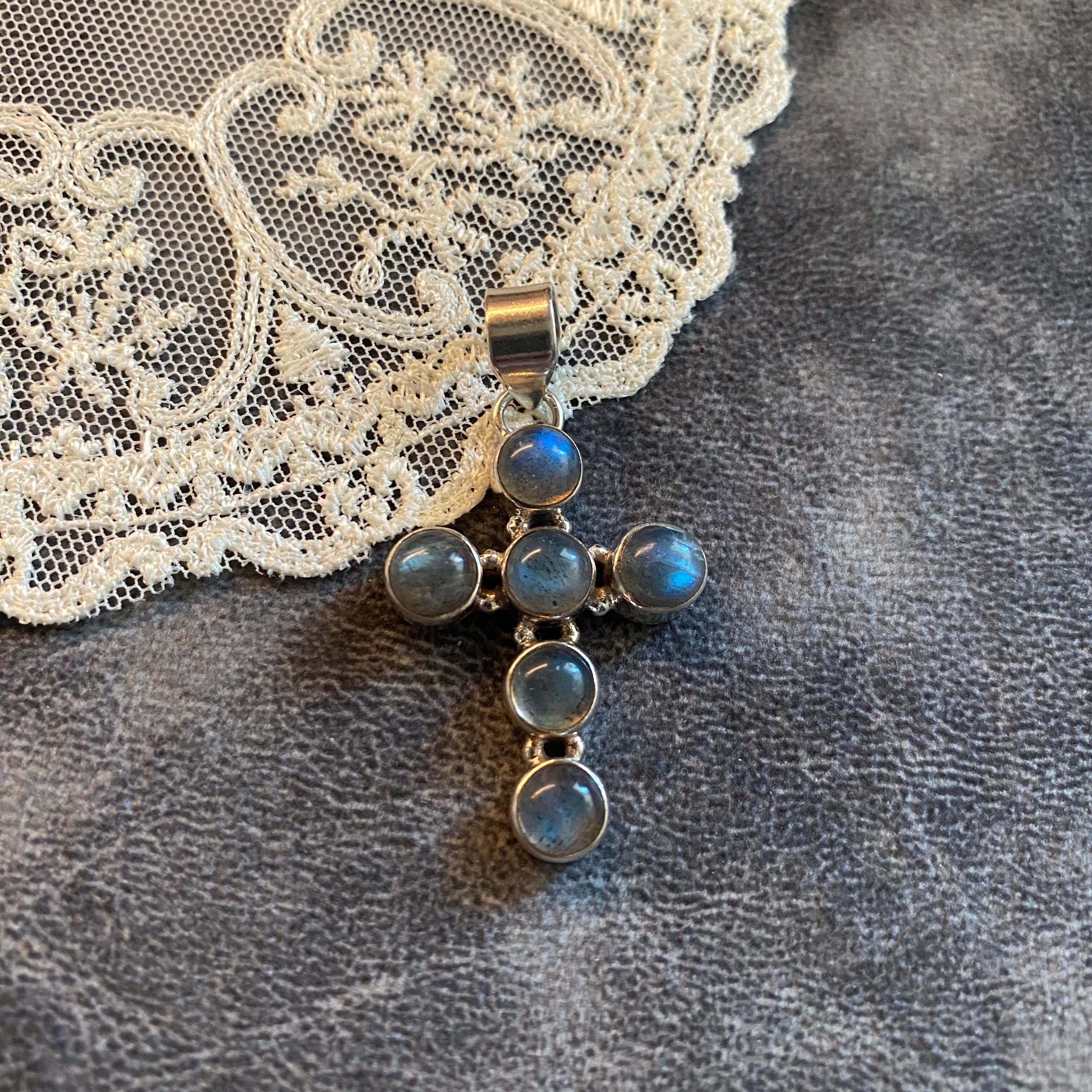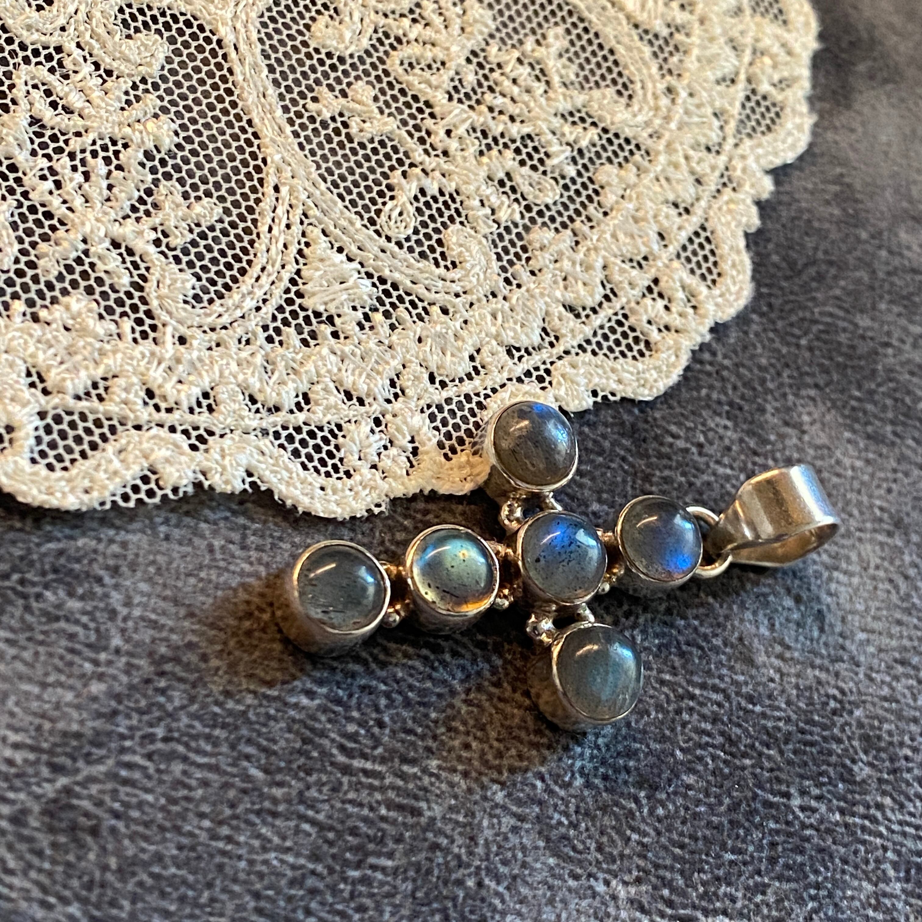 良質なラブラドライトに見られるラブラドレッセンス(レインボーシラー)が健在な宇宙的なエネルギーを持つラブラドライトのクロス。
