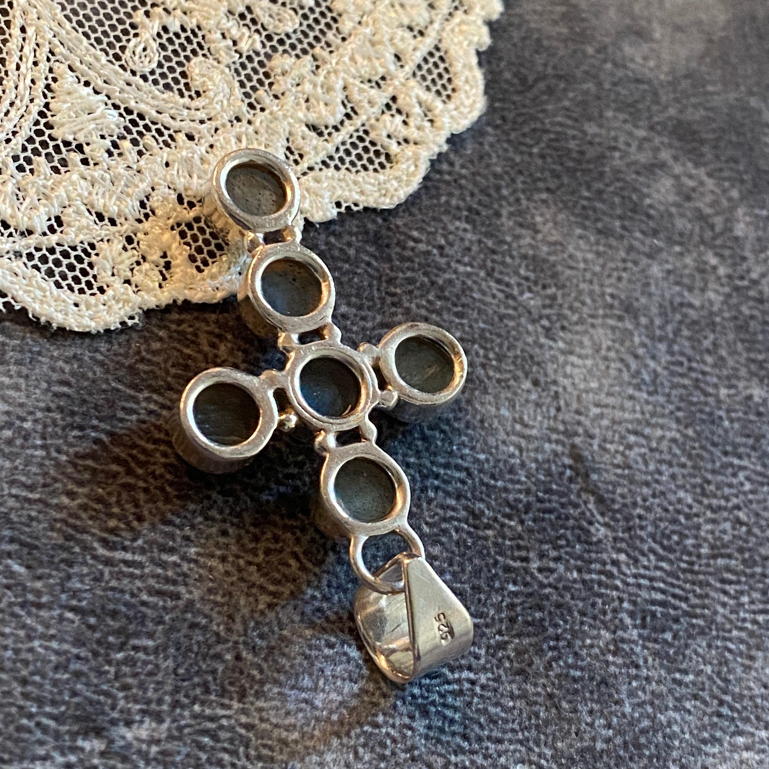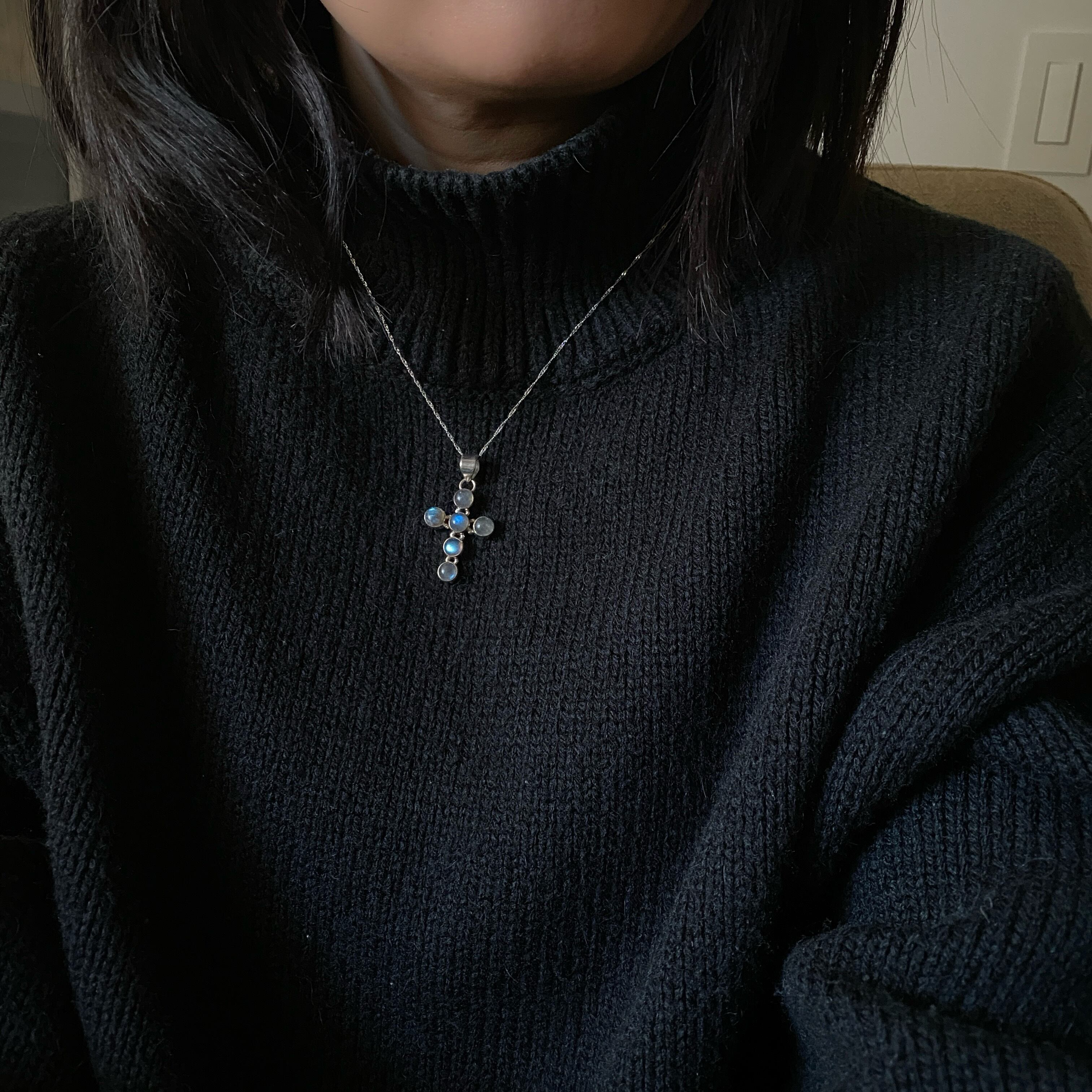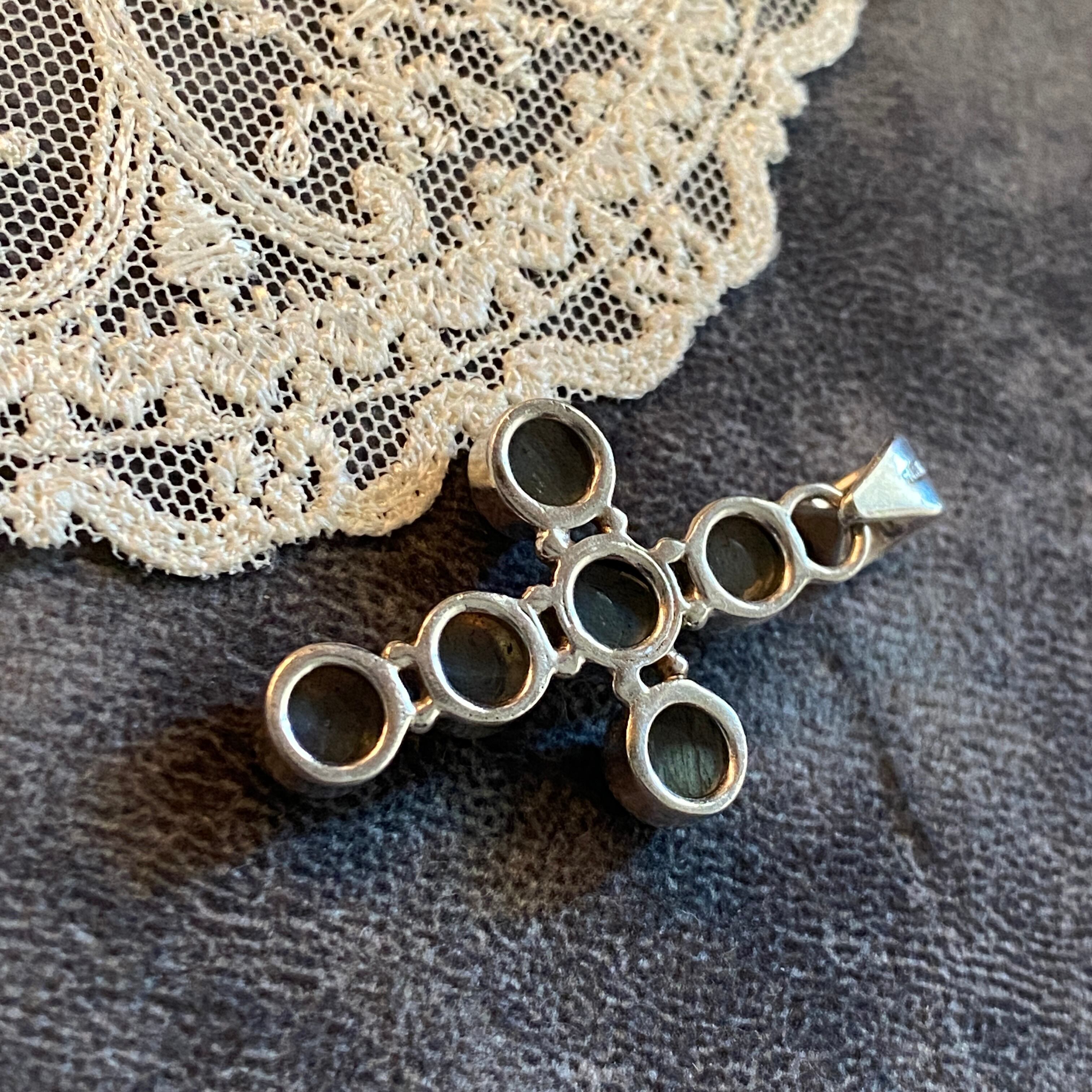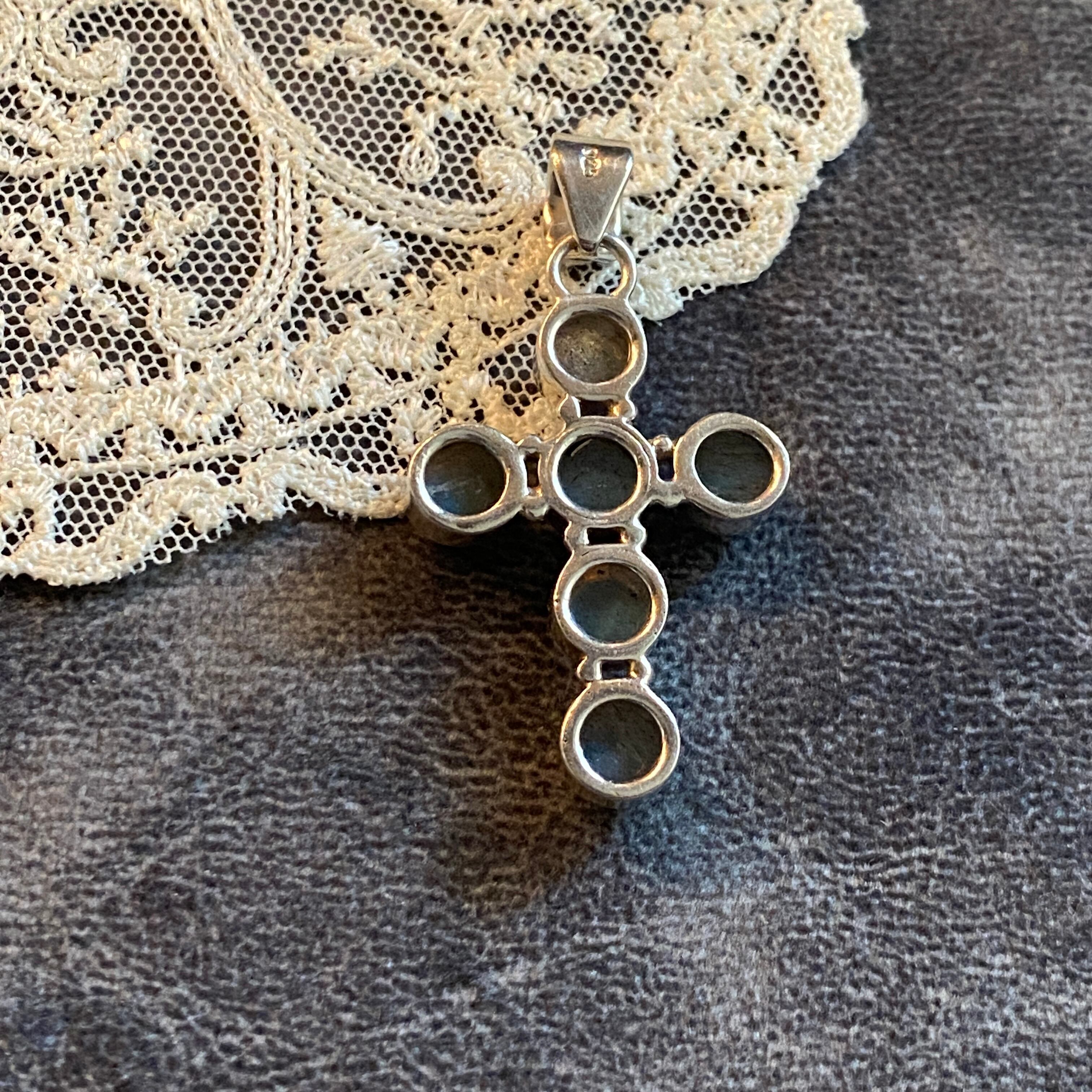 良質なラブラドライトに見られるラブラドレッセンス(レインボーシラー)が健在な宇宙的なエネルギーを持つラブラドライトのクロス。