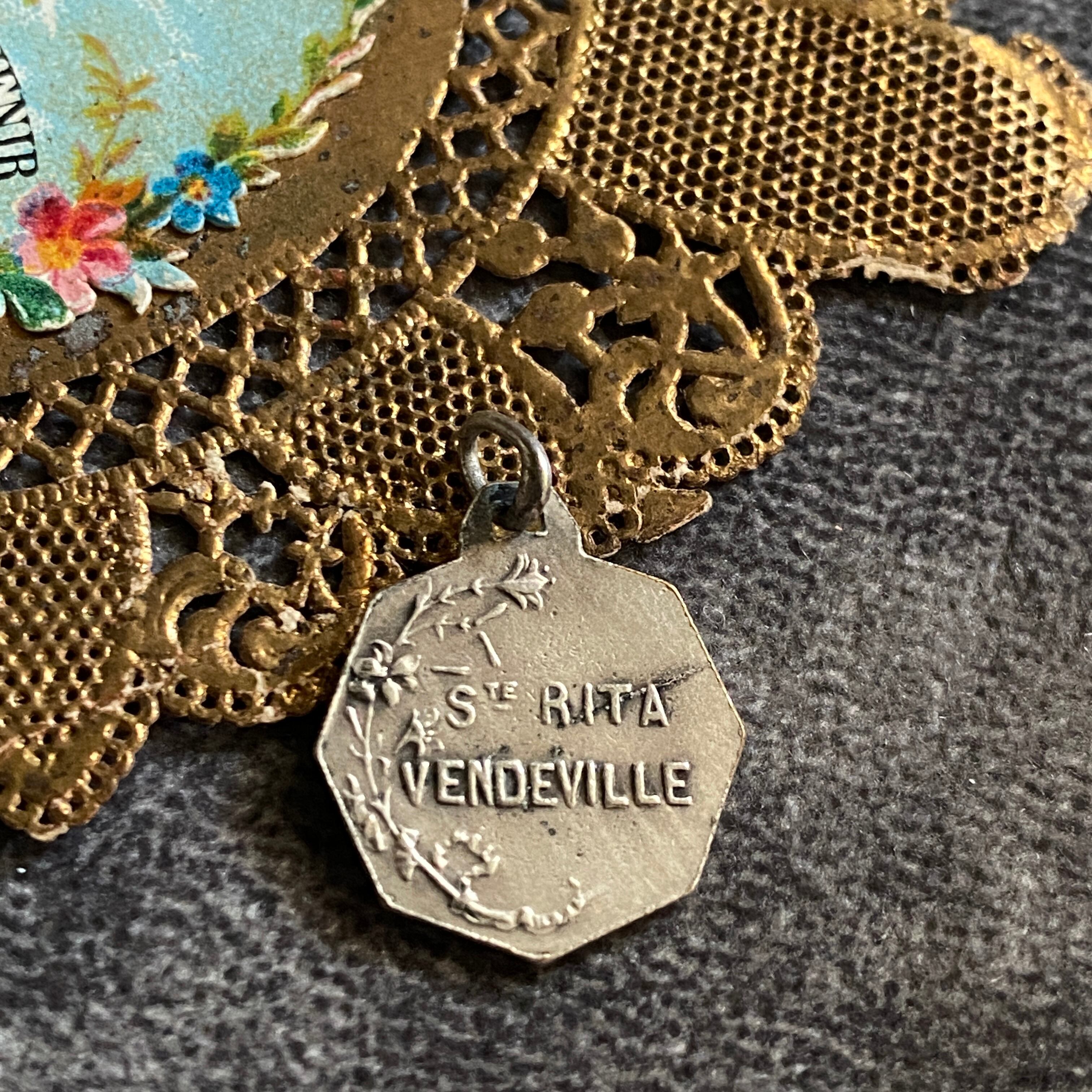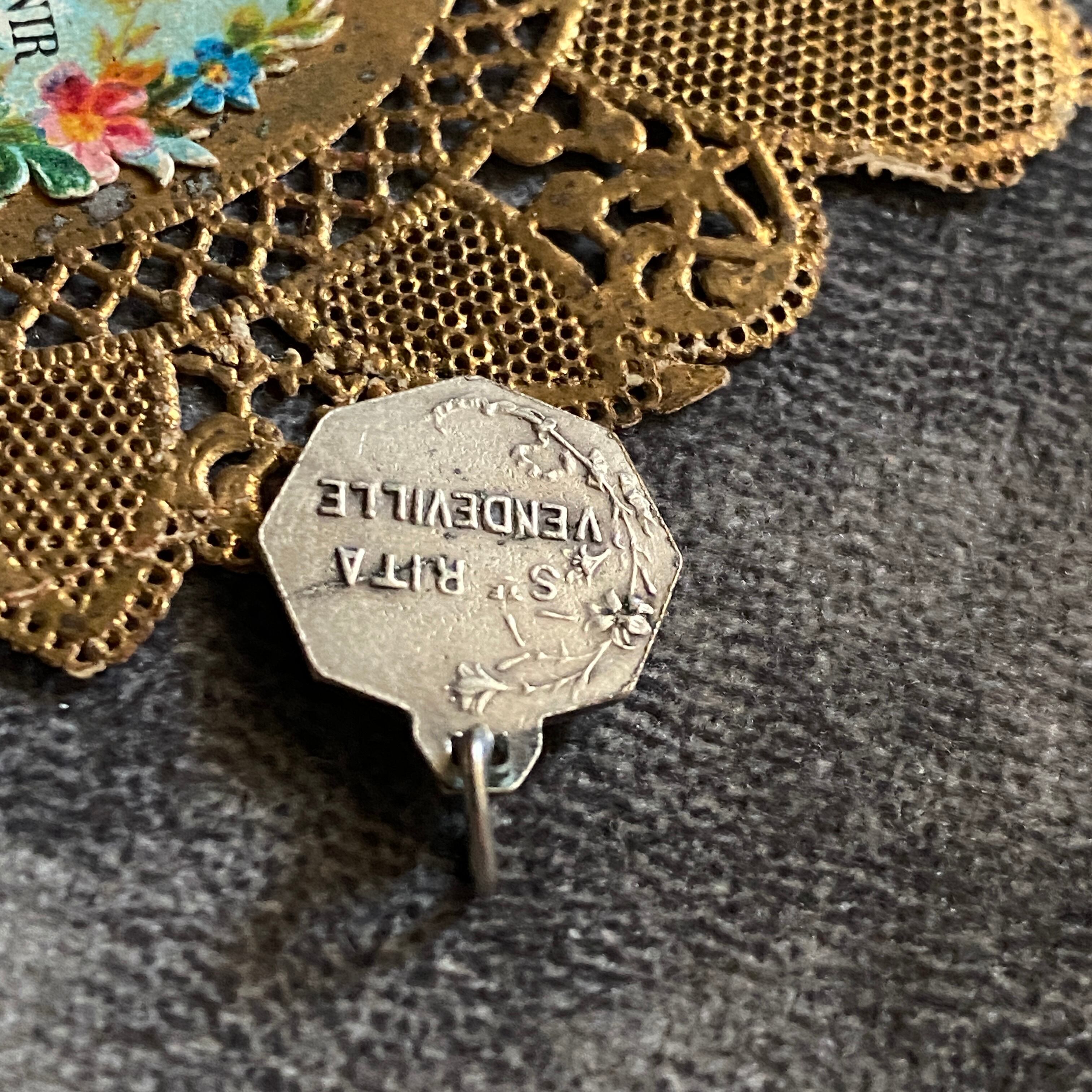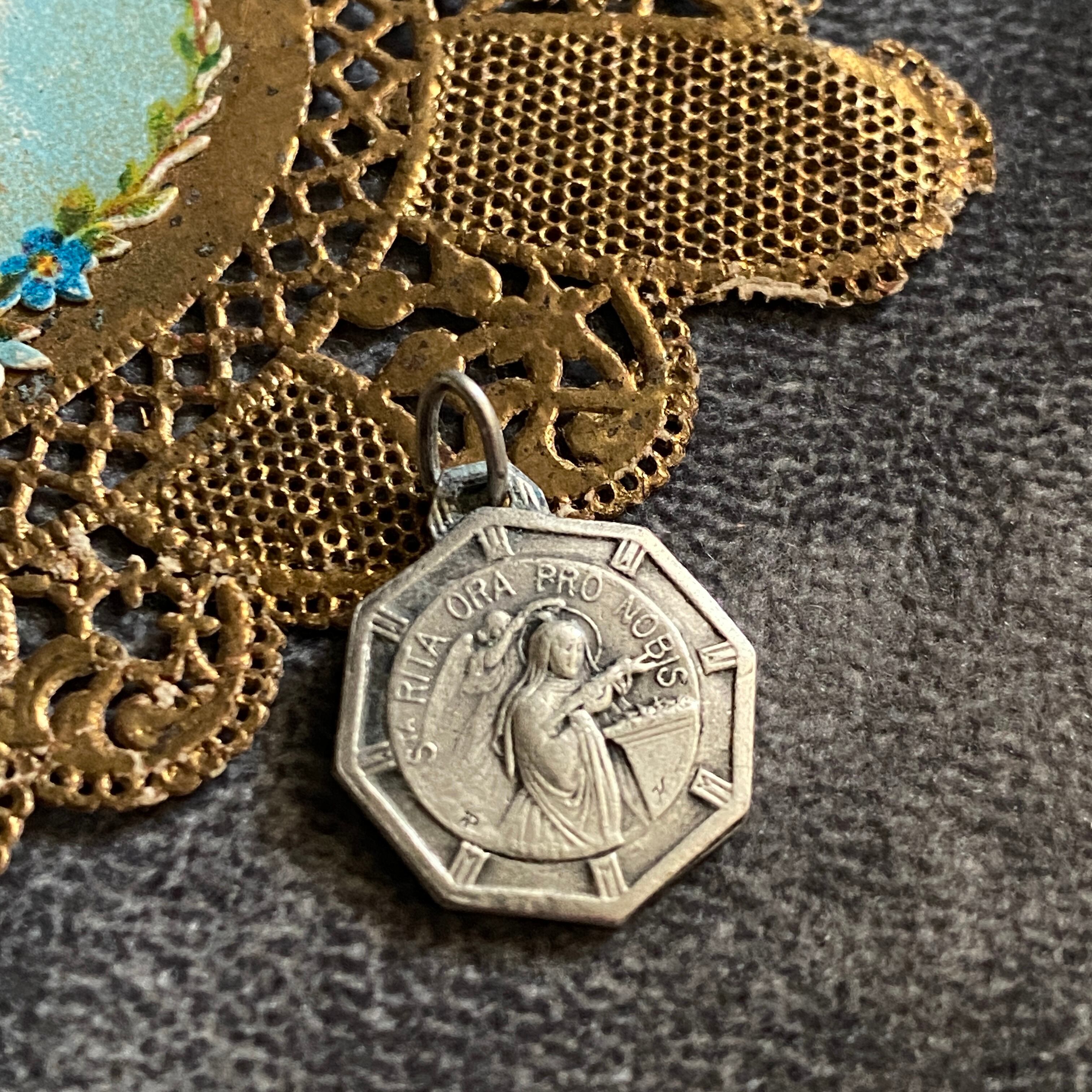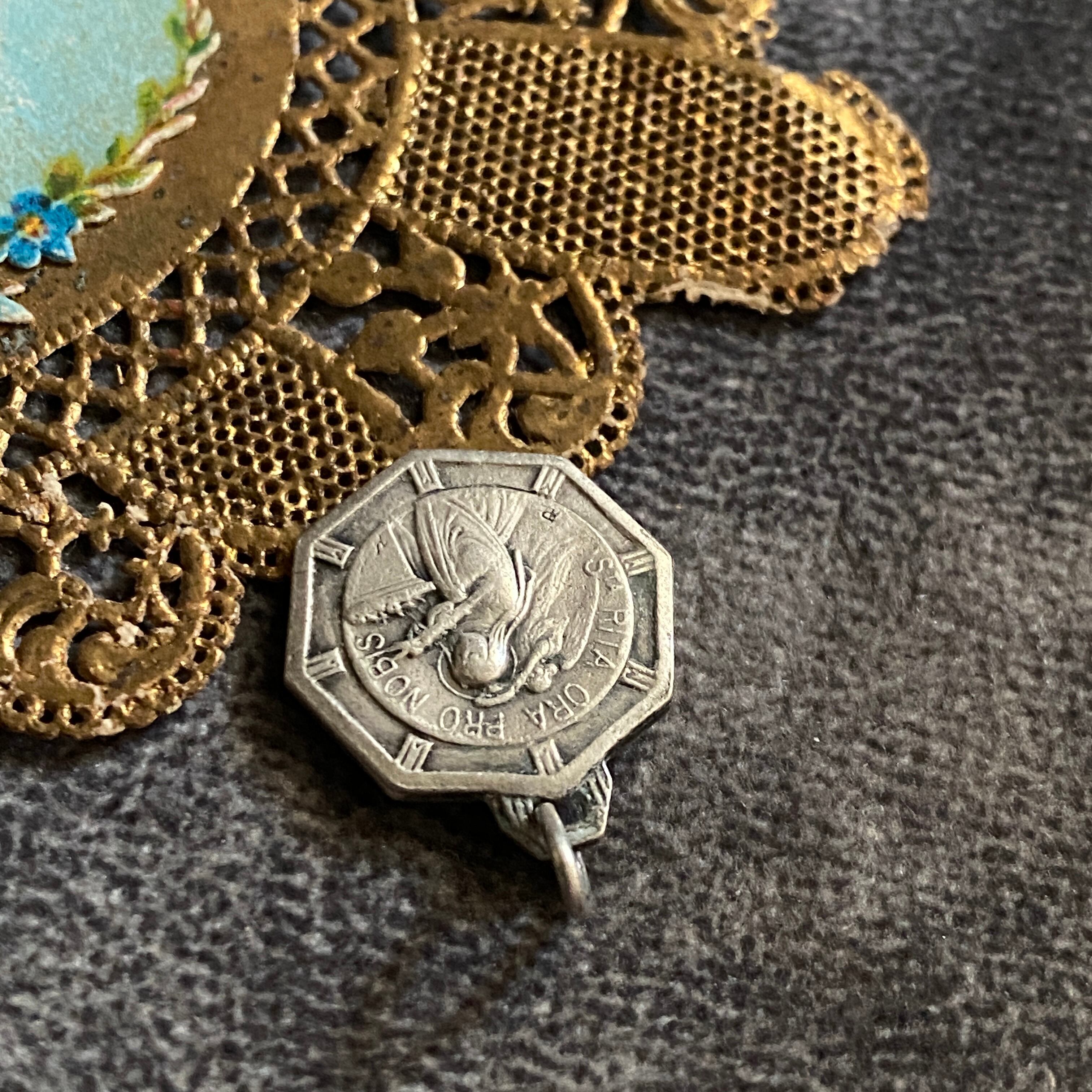 前面には、祈る聖リタに後ろから光輪(恩寵)を授ける天使がデザインされており、とてもコンディションの良い作品です。