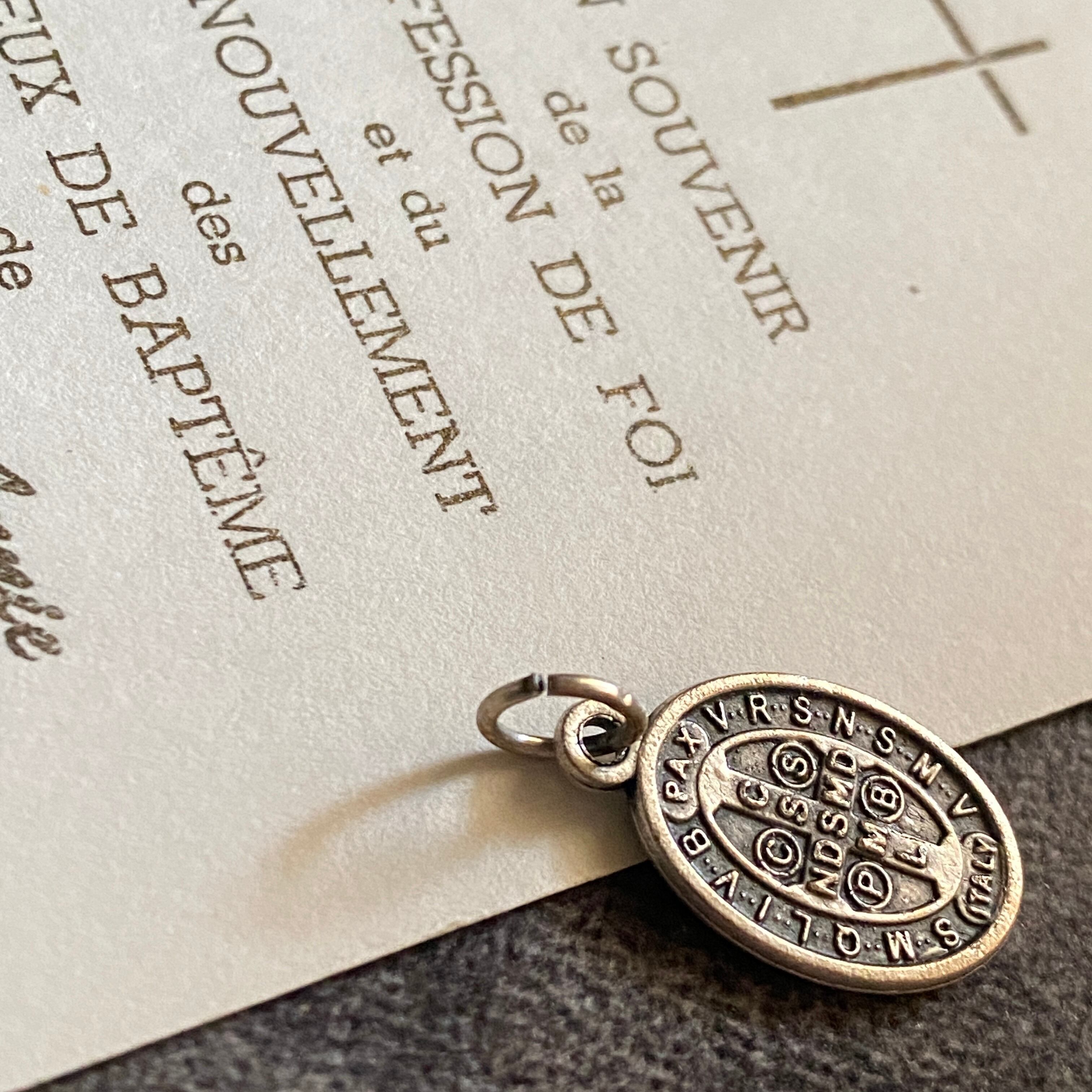 こちらの作品は前面はシンプルに聖ベネディクトの全身の御姿が描かれていて、さりげなく日々のお守りとして身につけていただきやすいデザインです。