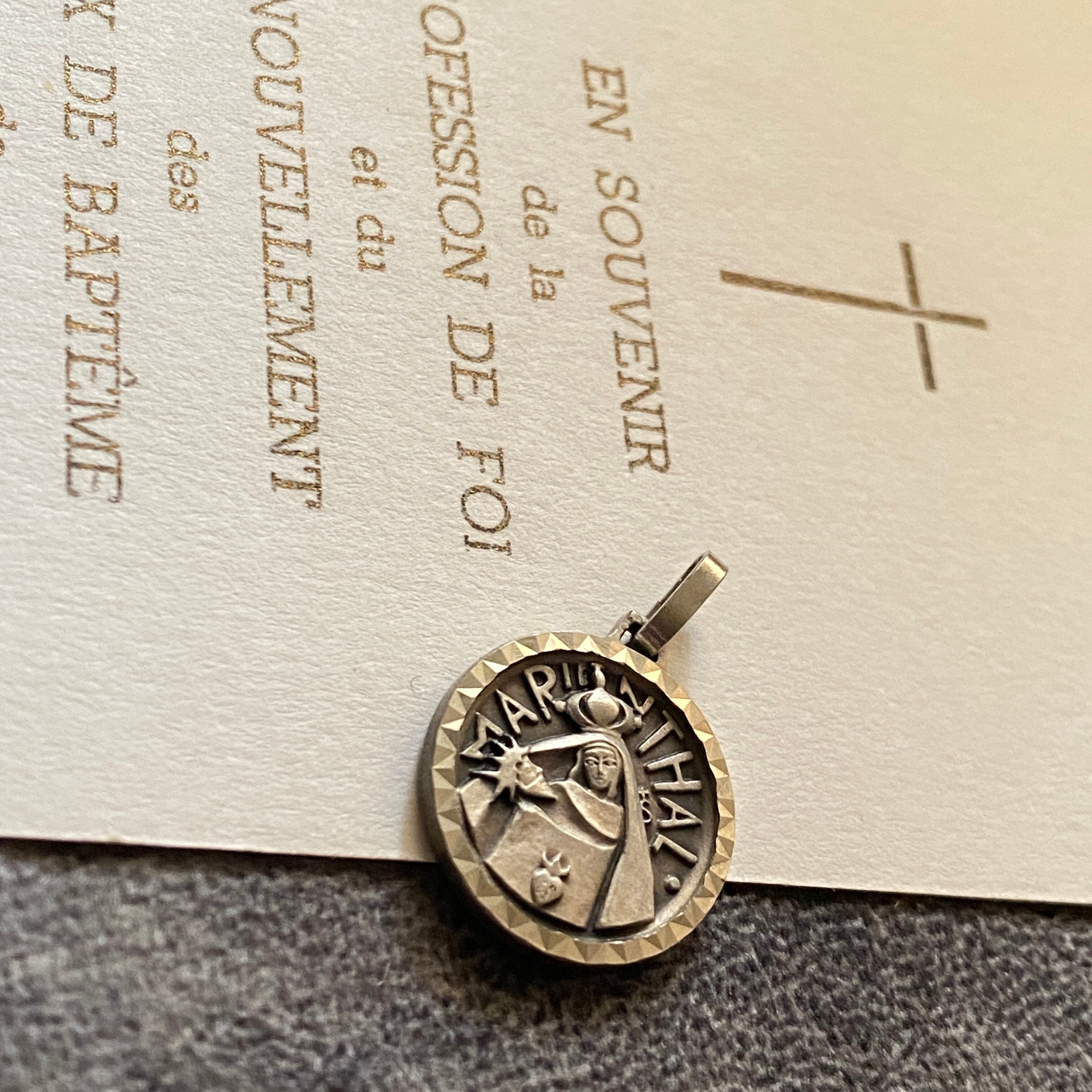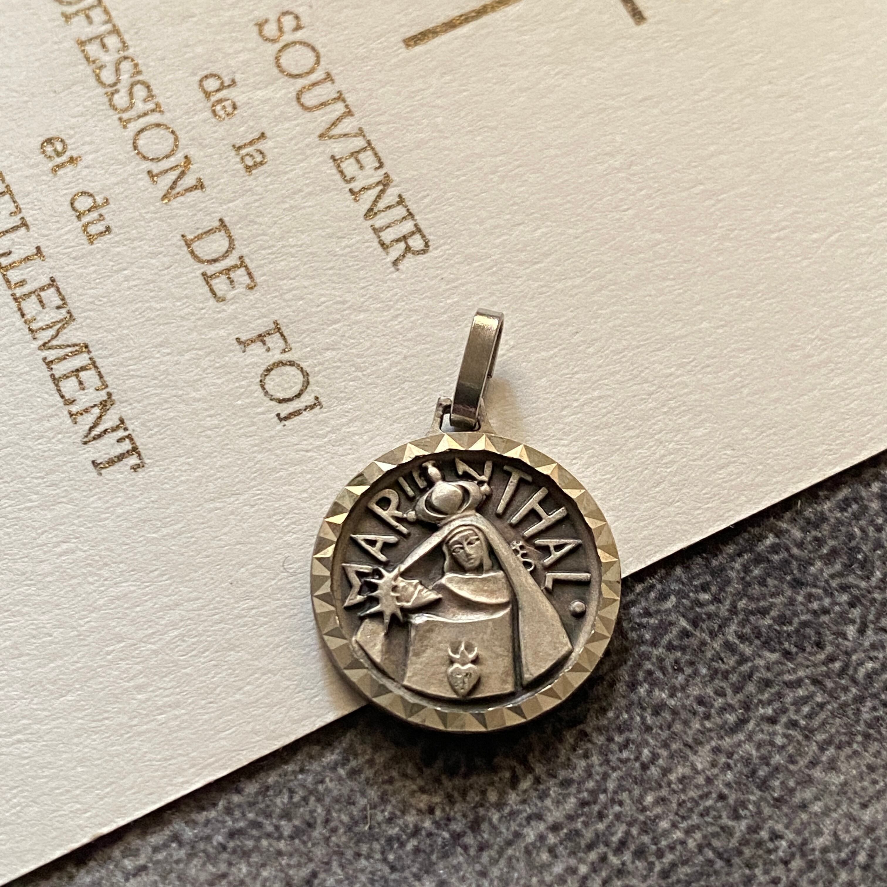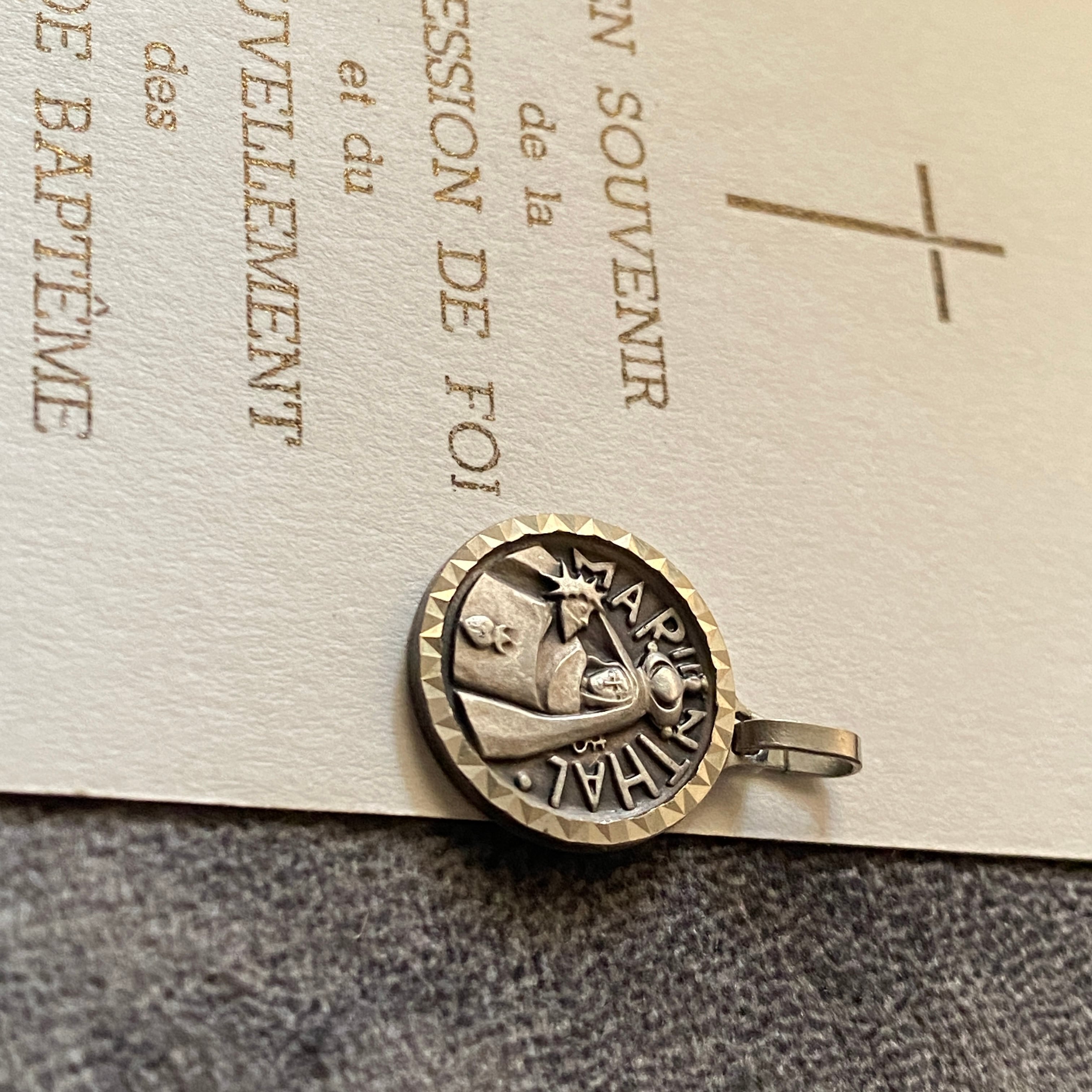 その教会には、喜びの聖母と呼ばれる有名な聖母像の他に、もう一つ作者不明のピエタ像があり、このメダイはそのピエタ(十字架上の死を遂げたキリストを抱く聖母マリアの像)からインスピレーションを得たと思われます。
