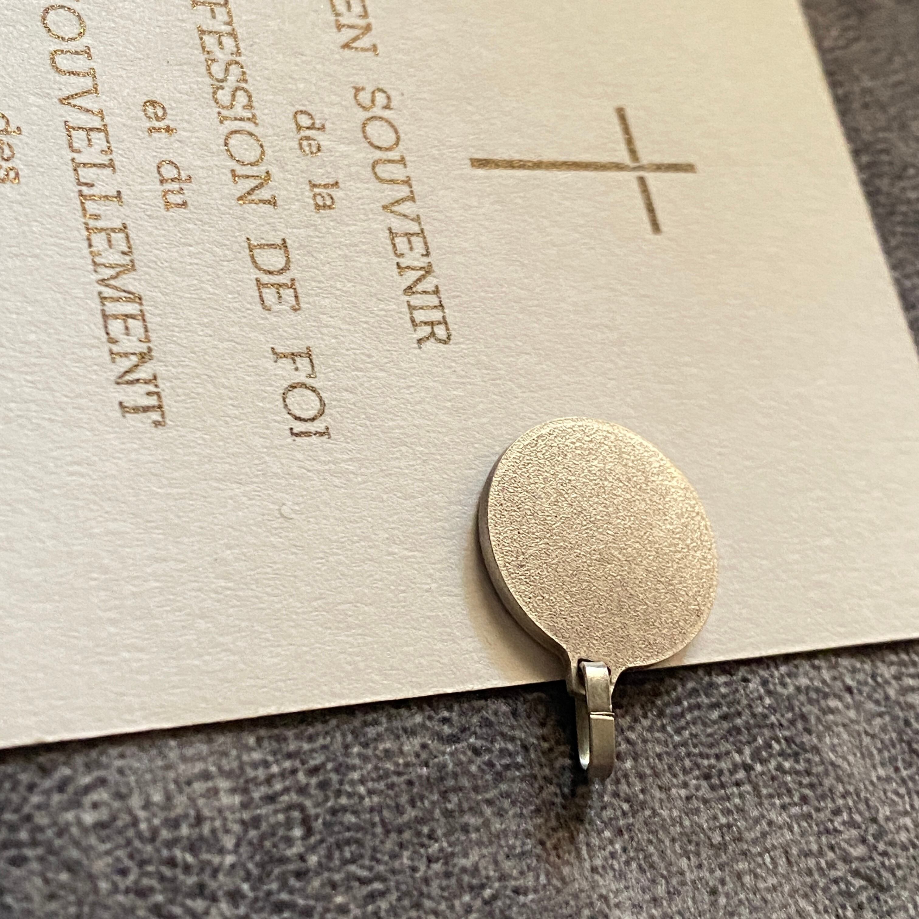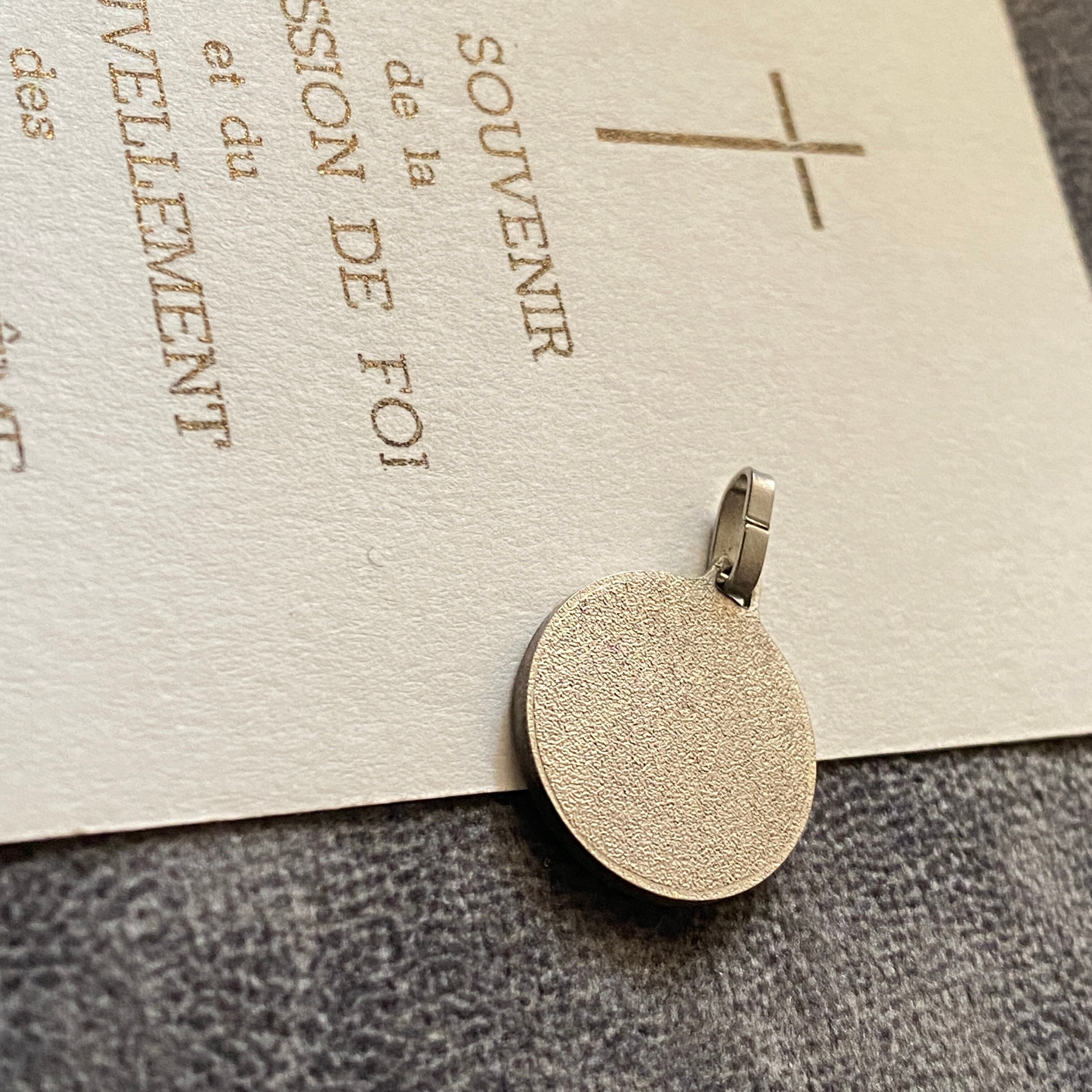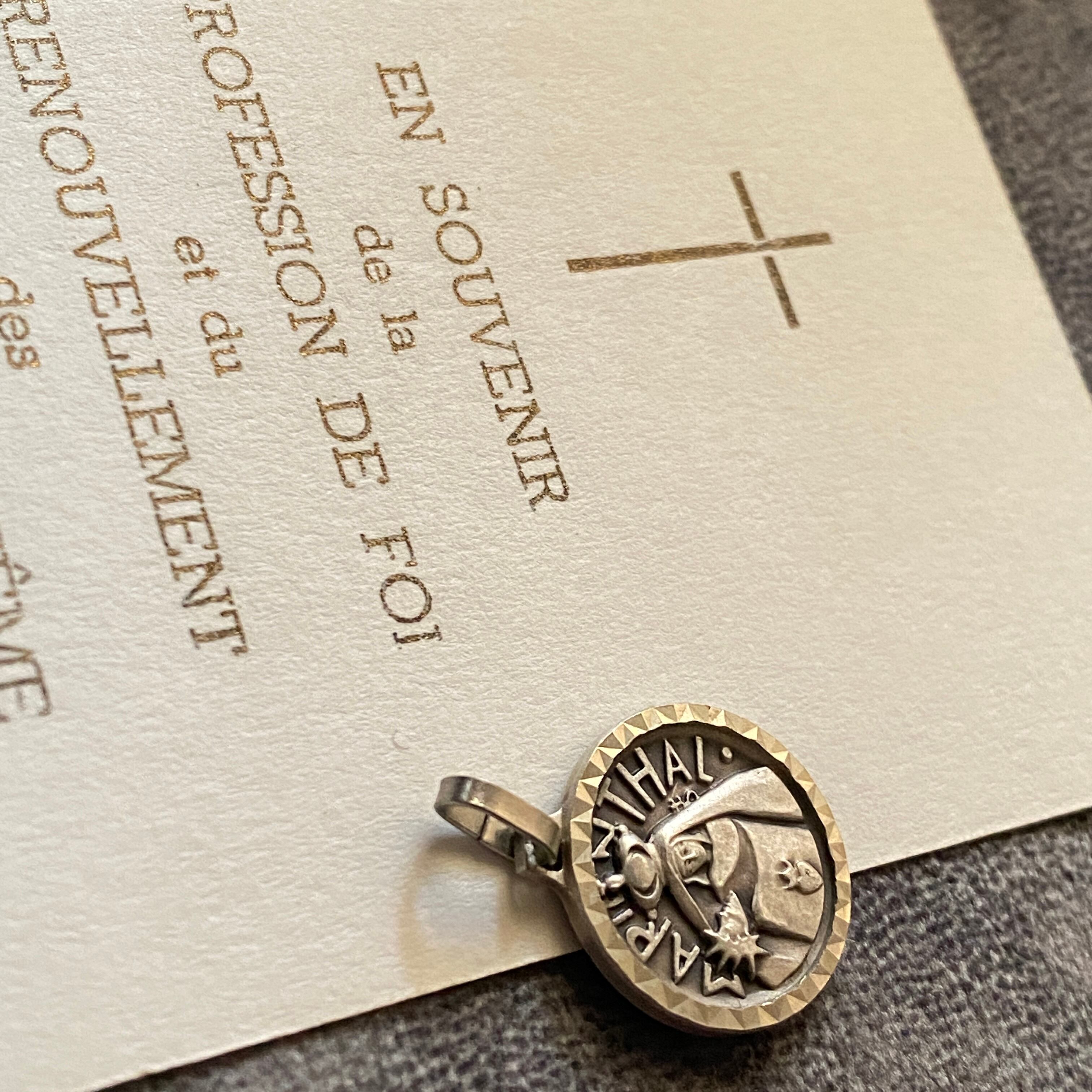 その教会には、喜びの聖母と呼ばれる有名な聖母像の他に、もう一つ作者不明のピエタ像があり、このメダイはそのピエタ(十字架上の死を遂げたキリストを抱く聖母マリアの像)からインスピレーションを得たと思われます。