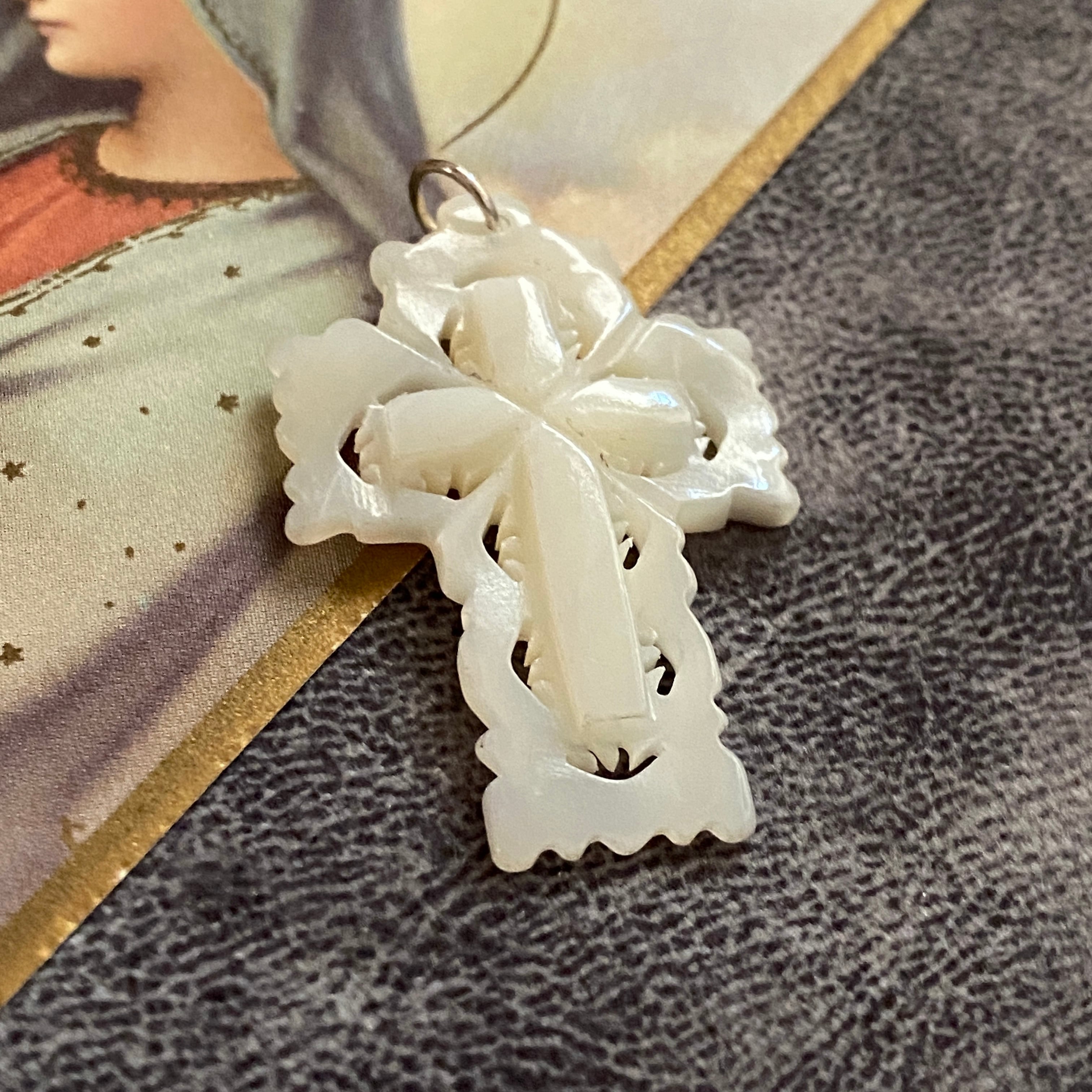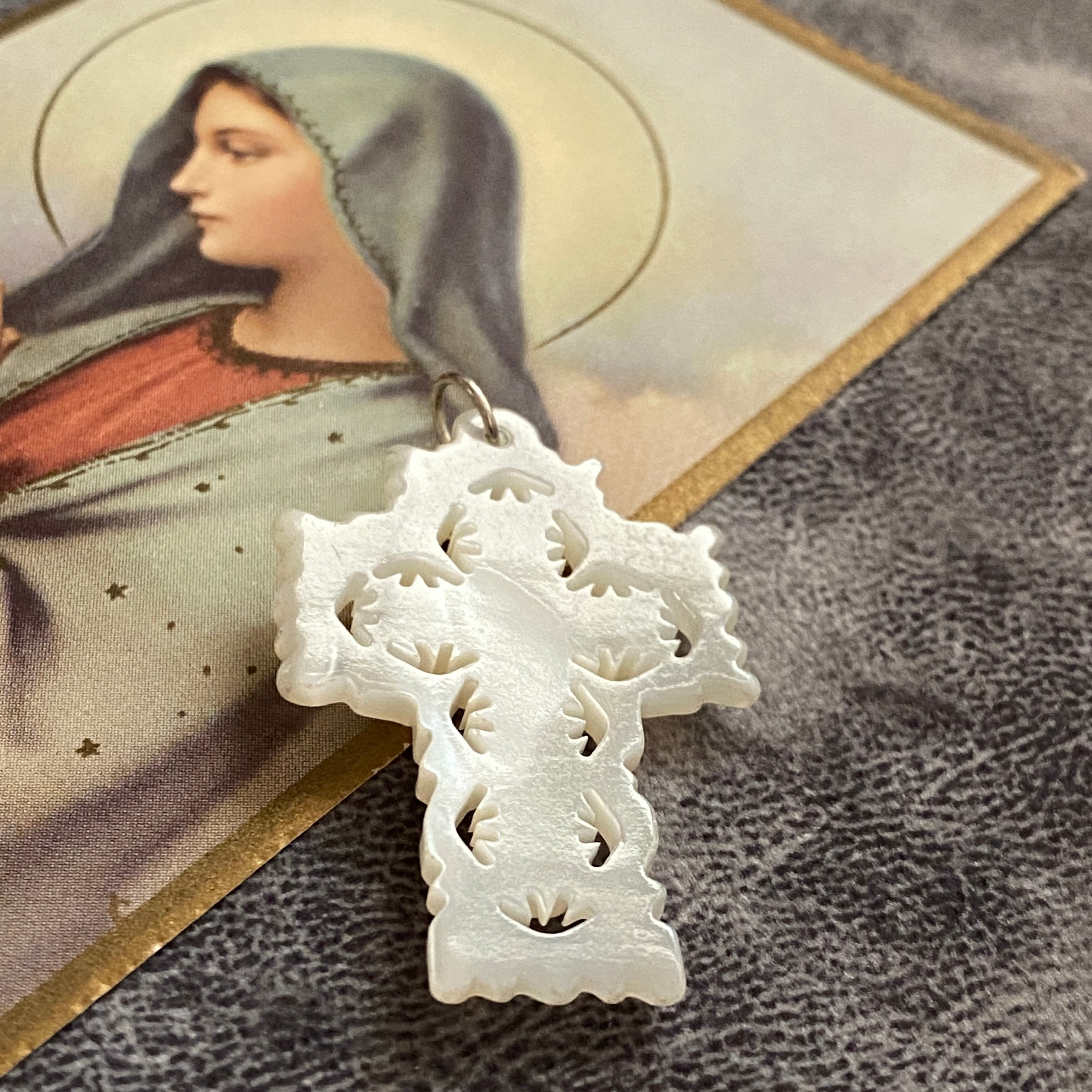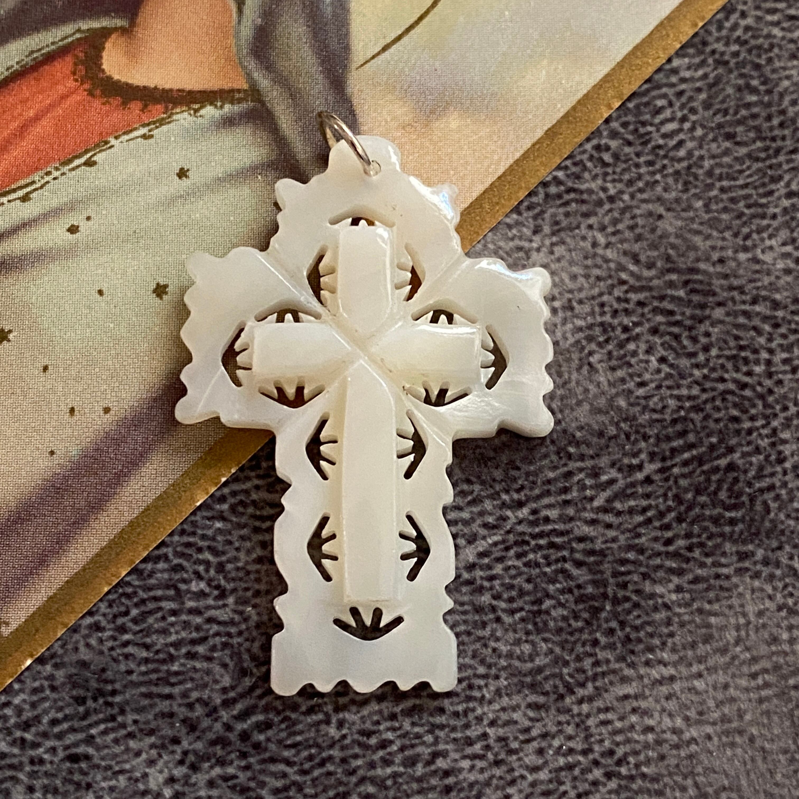 クロス型のマザーオプパールに透かしの彫刻の入った美しい作品。