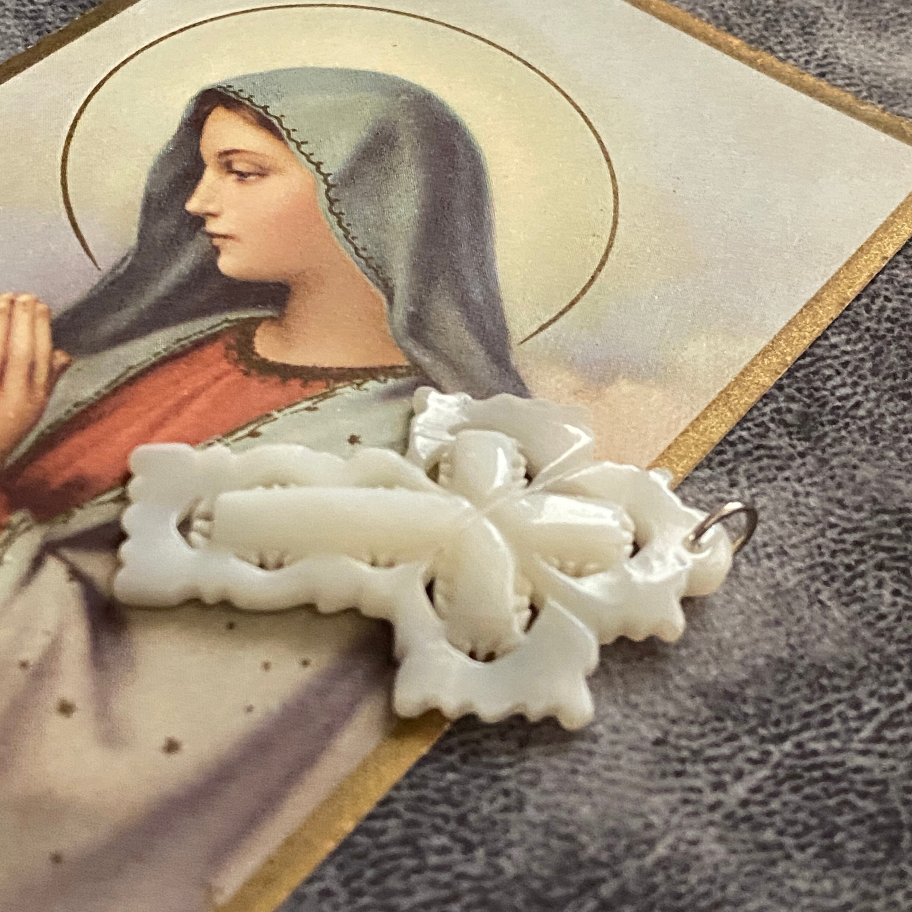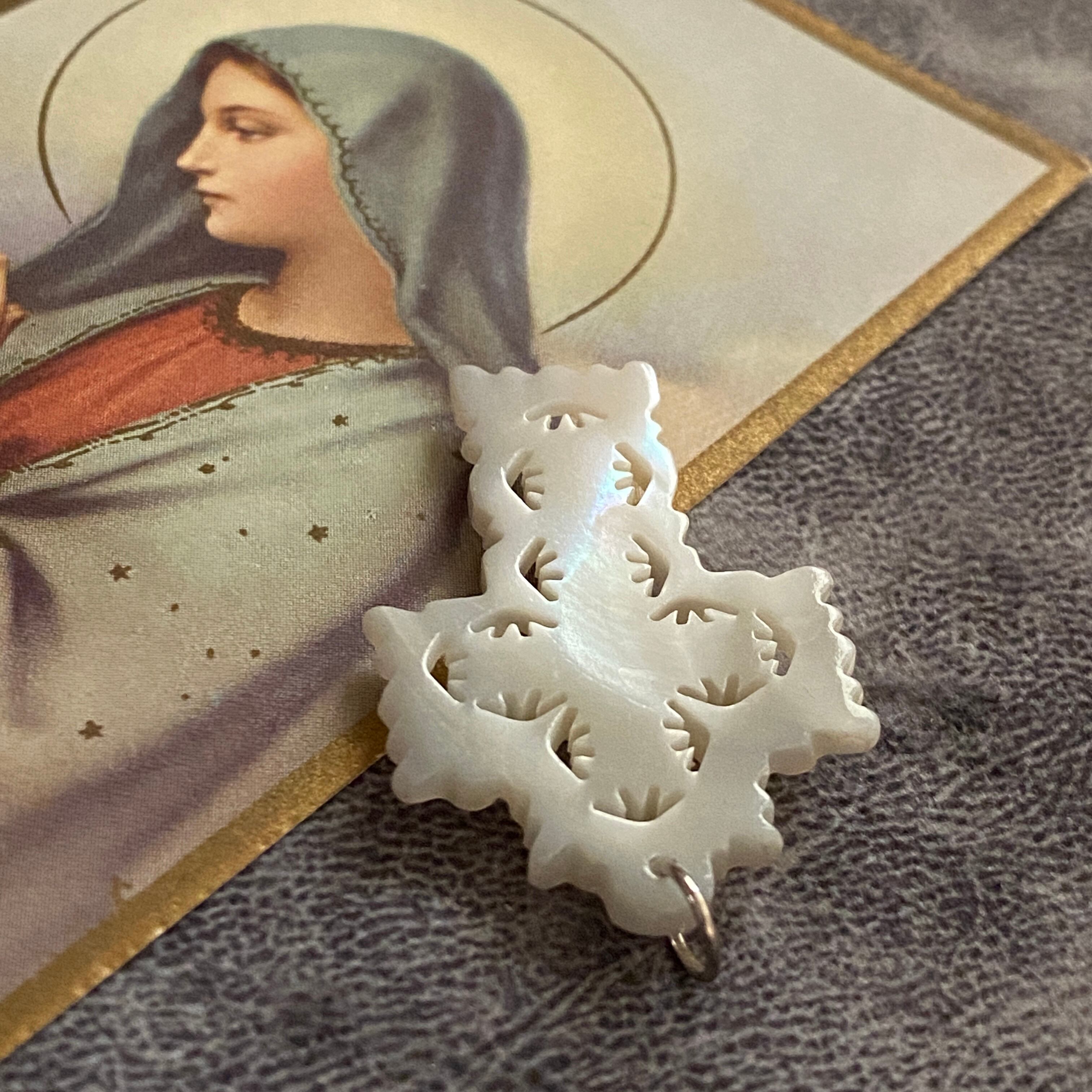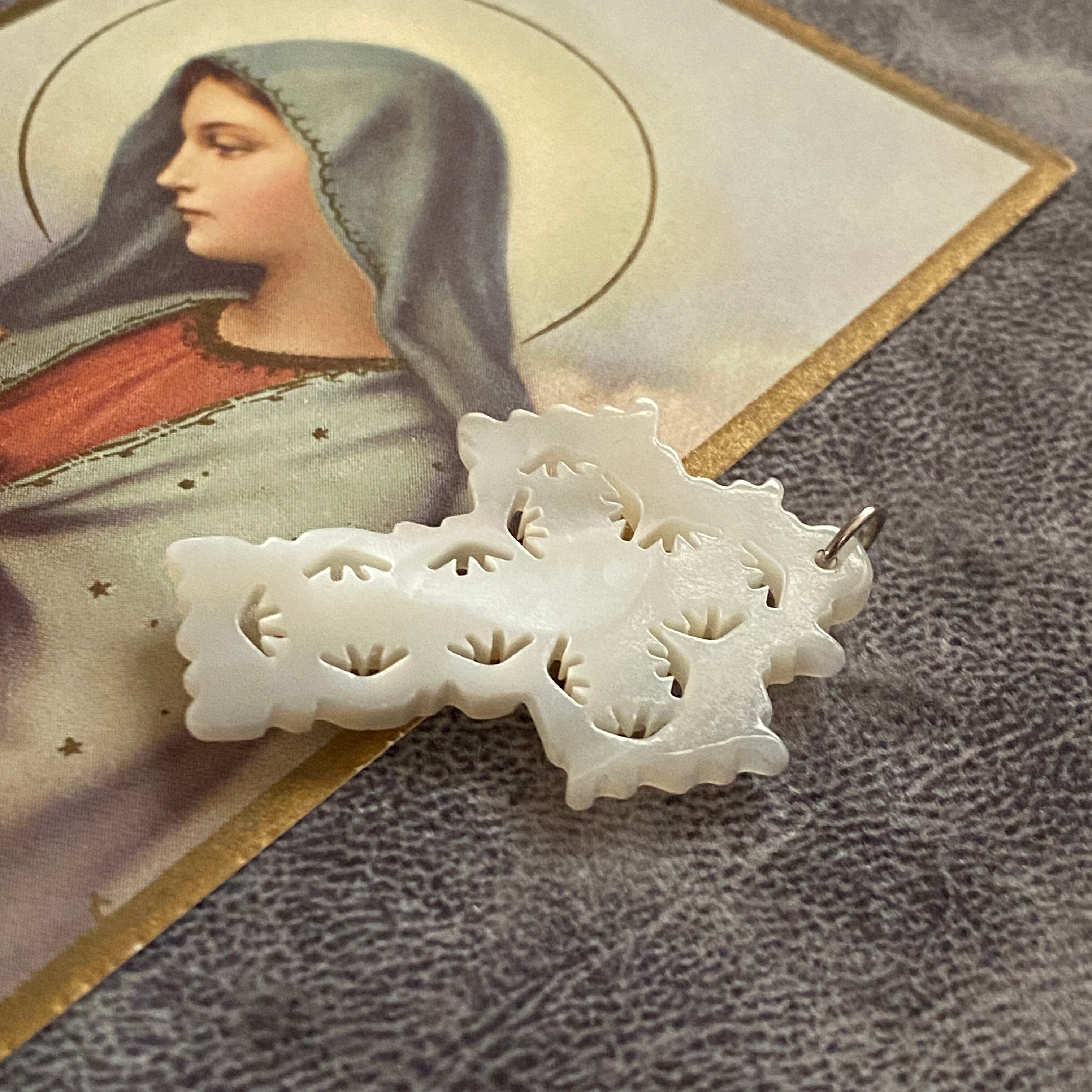 クロス型のマザーオプパールに透かしの彫刻の入った美しい作品。